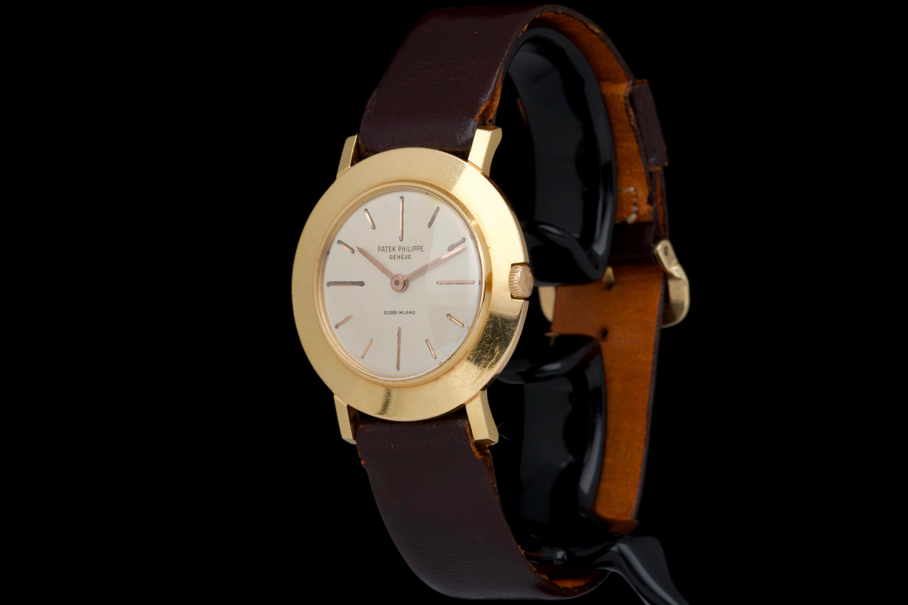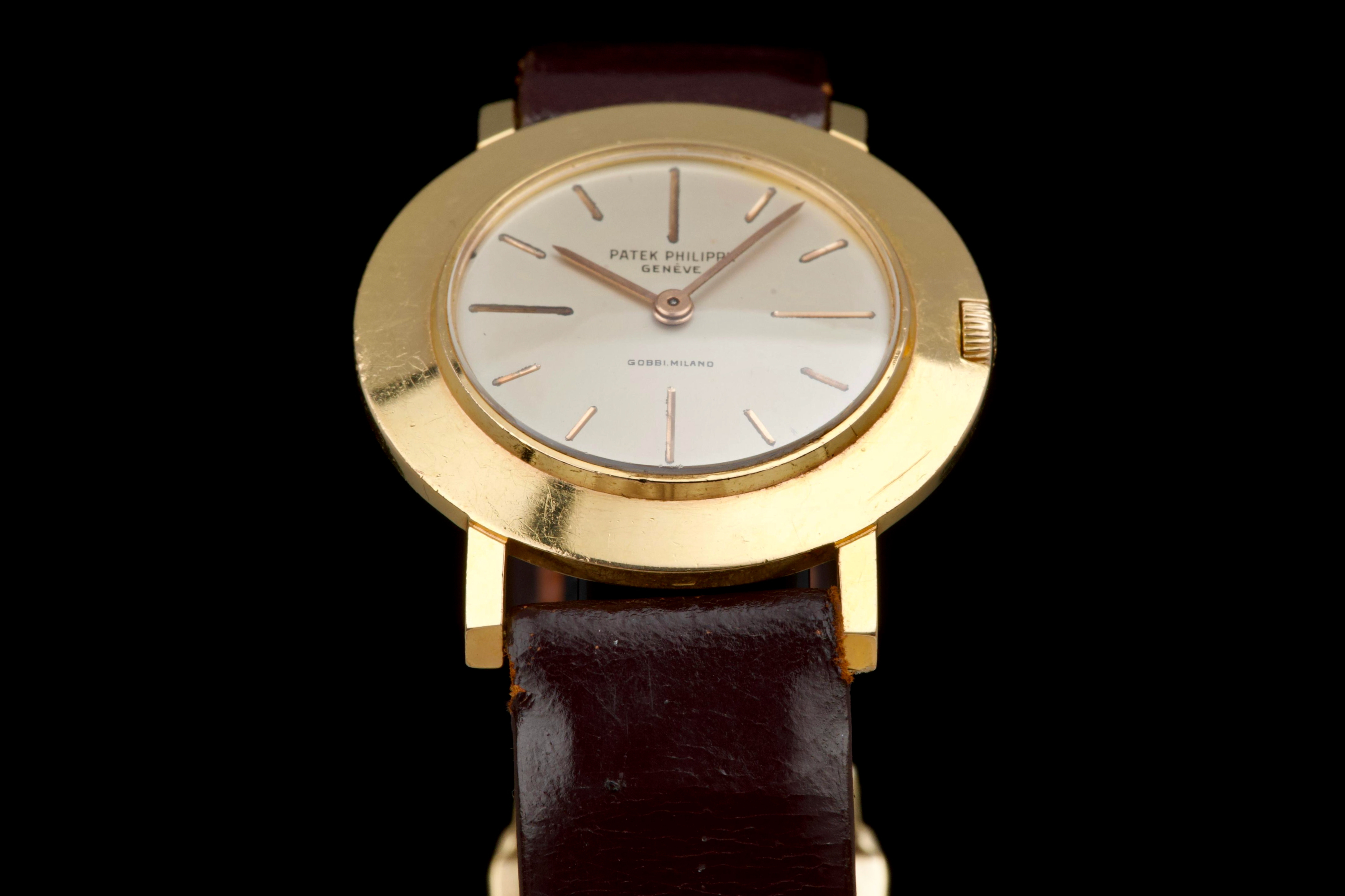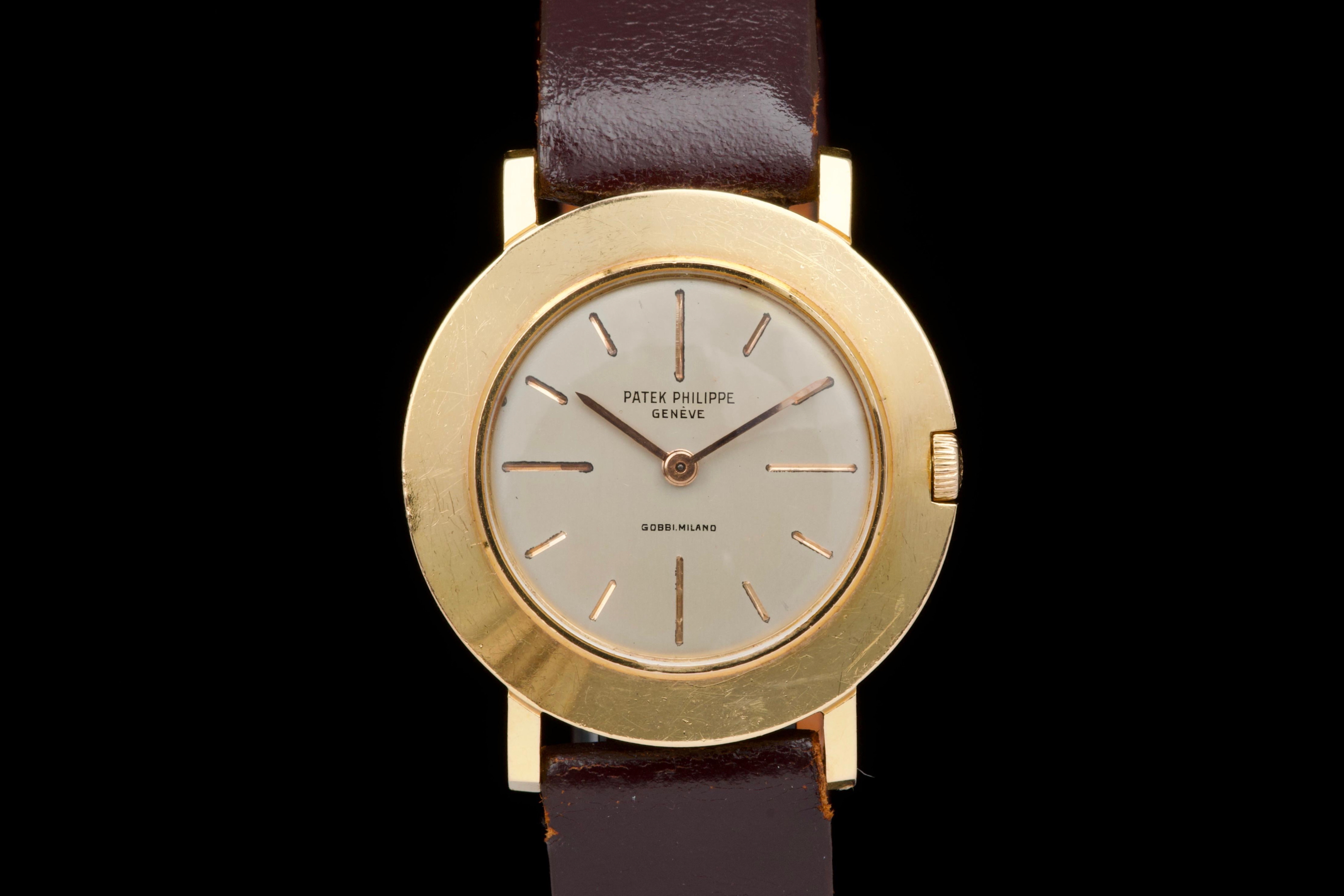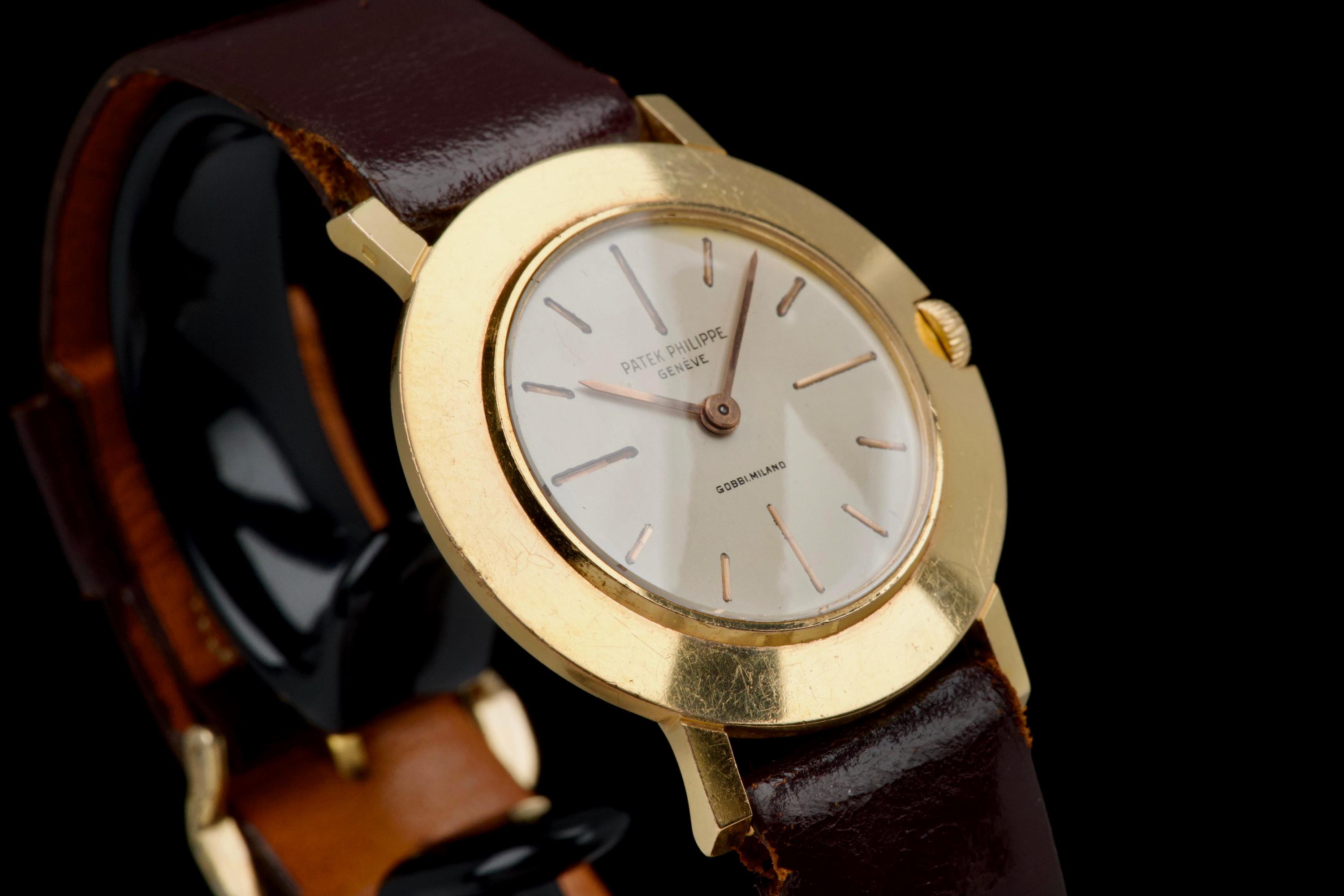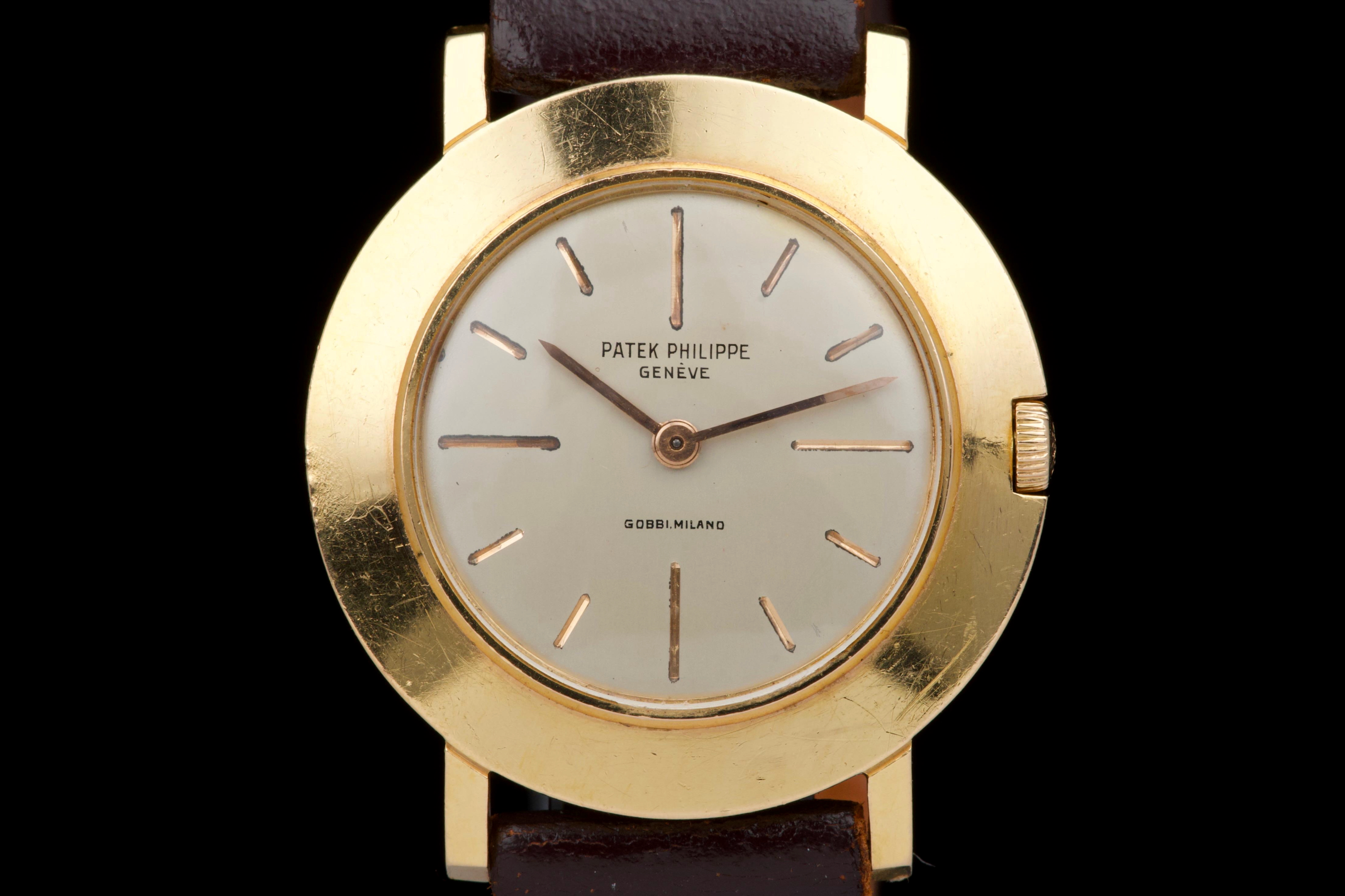 An evocative and highly charismatic example of the celebrated “Disco Volante” reference 2594, this yellow-gold Patek Philippe is distinguished by its desirable double-signed dial retailed by Gobbi, Milano, one of the most important Italian Patek Philippe agents of the mid-20th century. The case appears to be unpolished, retaining a deep and clearly legible hallmark on the side of the lug at approximately 1 o’clock—an uncommon and particularly attractive attribute for this reference. While the case shows surface scratches and small nicks consistent with age and honest wear, its overall proportions and sculptural profile remain well preserved. The caseback has been polished in the past and bears an engraved monogram “AF”. The dial is in good overall condition and appears unrestored, displaying light wear around the applied hour markers and a few small marks, entirely consistent with a watch of this period. The printing remains clear, and the Gobbi signature adds a layer of historical and collectible significance. The watch is fitted with a smooth calfskin leather strap and an aftermarket buckle that is not in gold. It is accompanied by its Extract from the Archives, confirming production in 1947 and sale in June 1958. The movement is running well at the time of cataloguing. Rare, elegant, and rich in character, this double-signed Disco Volante represents an excellent opportunity to acquire a highly collectible mid-century Patek Philippe with Italian retailer provenance and strong visual presence.