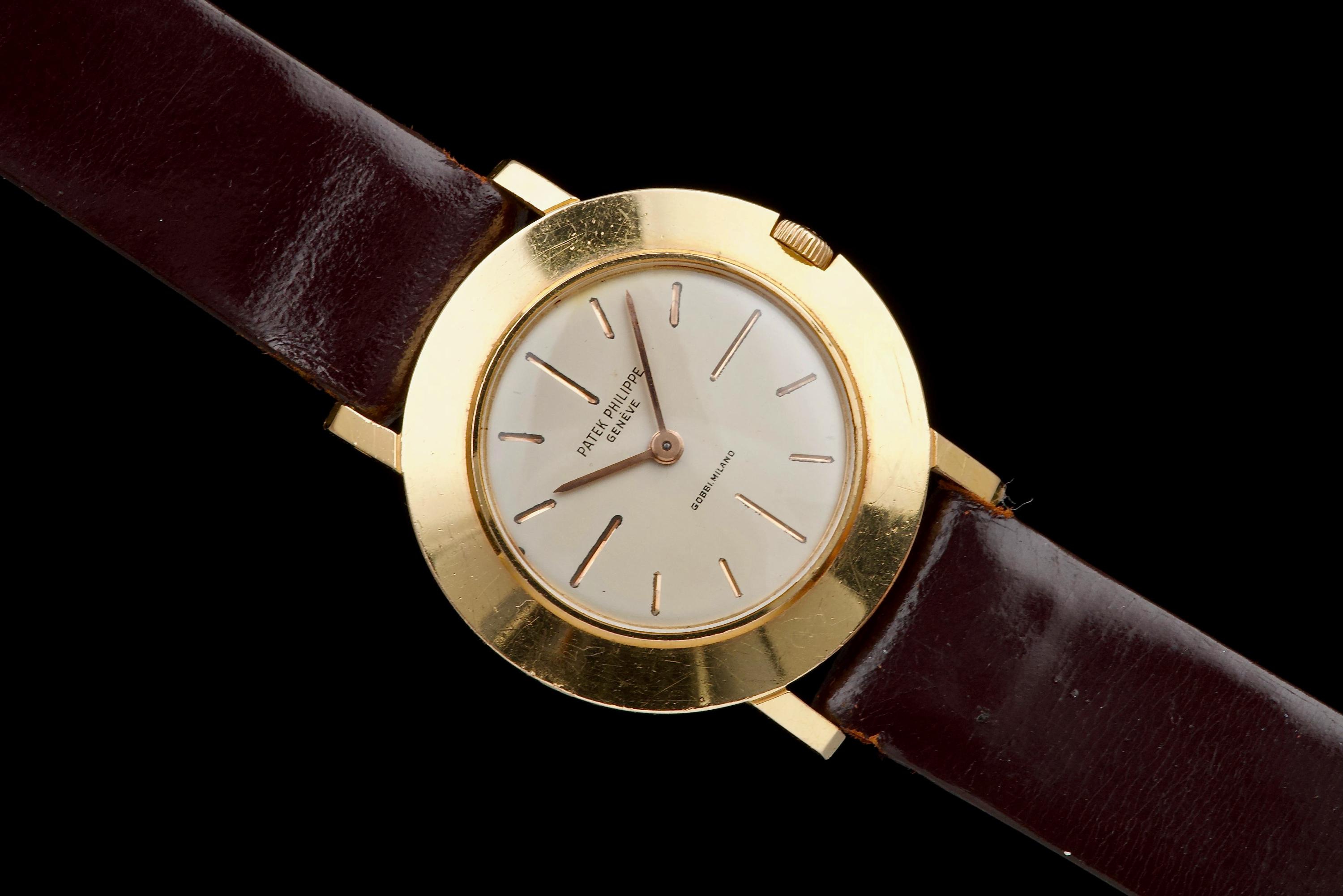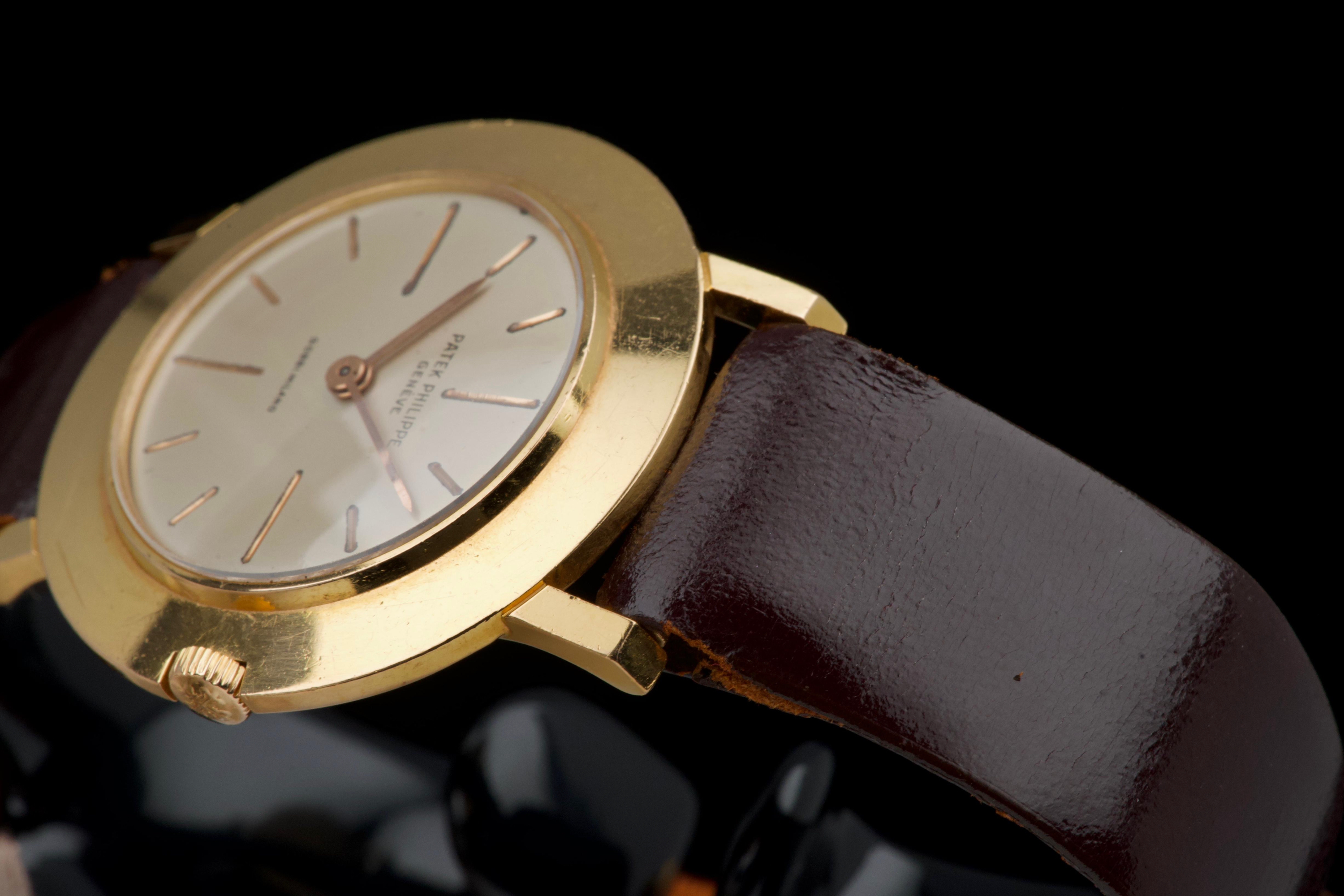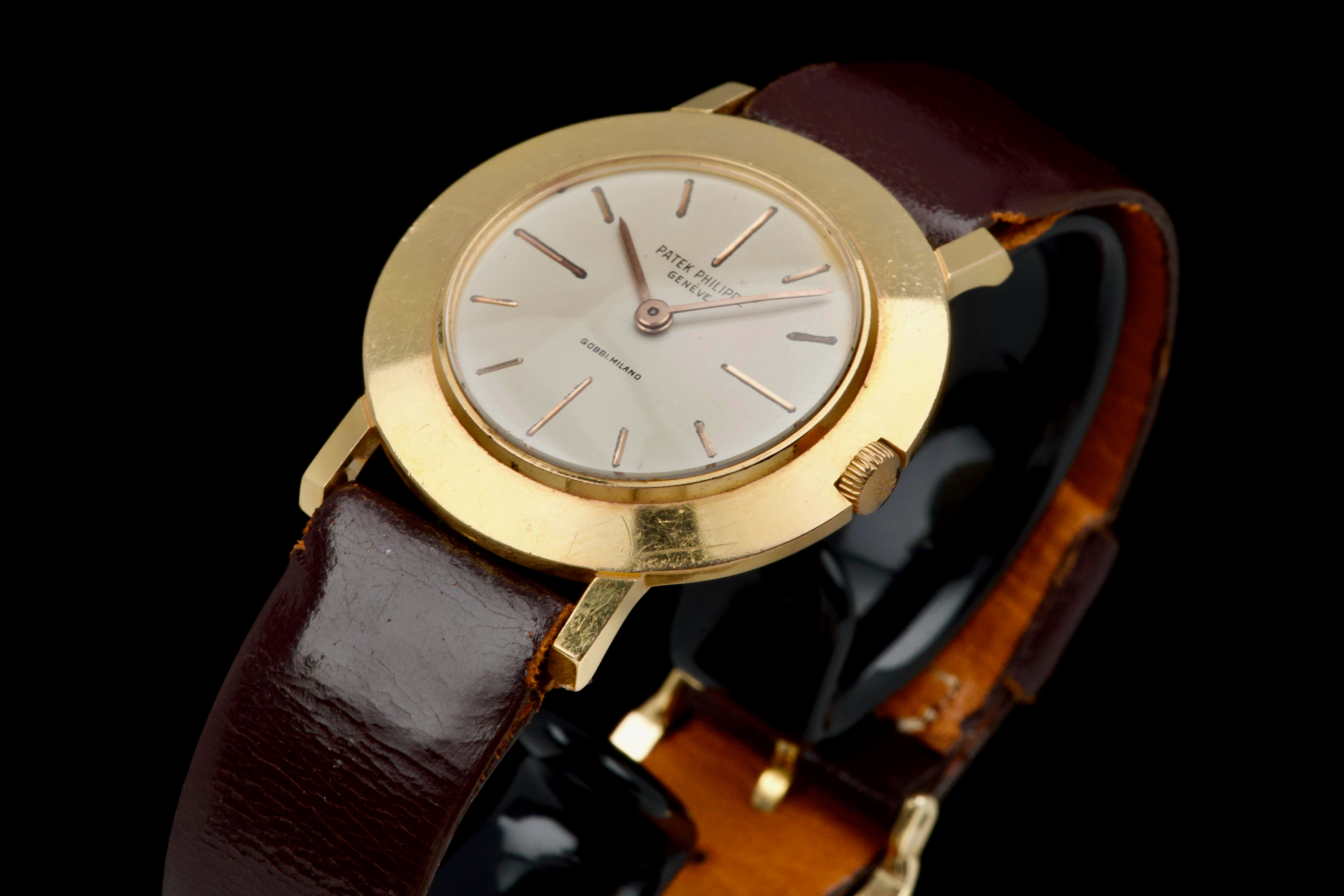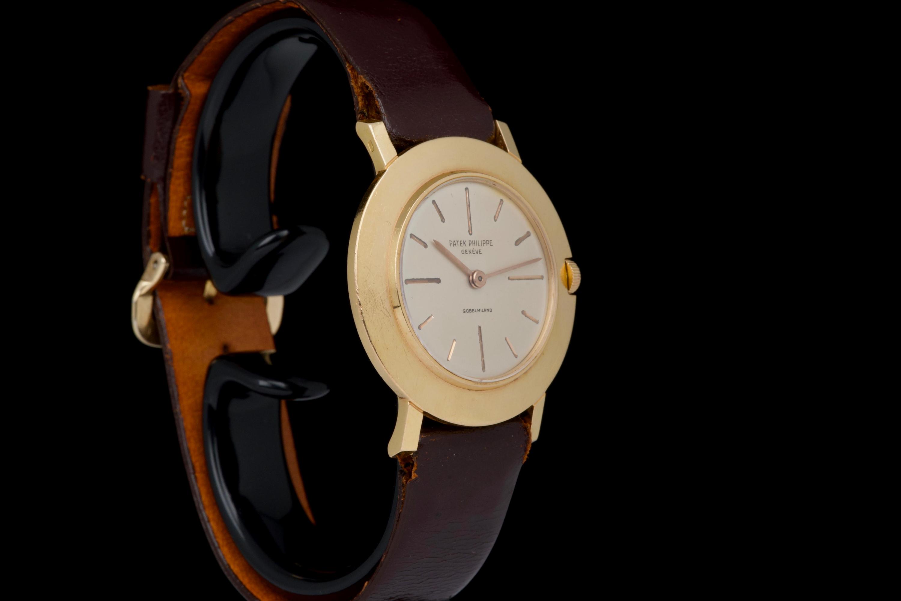 An evocative and highly charismatic example of the celebrated “Disco Volante” reference 2594, this yellow-gold Patek Philippe is distinguished by its desirable double-signed dial retailed by Gobbi, Milano, one of the most important Italian Patek Philippe agents of the mid-20th century. The case appears to be unpolished, retaining a deep and clearly legible hallmark on the side of the lug at approximately 1 o’clock—an uncommon and particularly attractive attribute for this reference. While the case shows surface scratches and small nicks consistent with age and honest wear, its overall proportions and sculptural profile remain well preserved. The caseback has been polished in the past and bears an engraved monogram “AF”. The dial is in good overall condition and appears unrestored, displaying light wear around the applied hour markers and a few small marks, entirely consistent with a watch of this period. The printing remains clear, and the Gobbi signature adds a layer of historical and collectible significance. The watch is fitted with a smooth calfskin leather strap and an aftermarket buckle that is not in gold. It is accompanied by its Extract from the Archives, confirming production in 1947 and sale in June 1958. The movement is running well at the time of cataloguing. Rare, elegant, and rich in character, this double-signed Disco Volante represents an excellent opportunity to acquire a highly collectible mid-century Patek Philippe with Italian retailer provenance and strong visual presence.