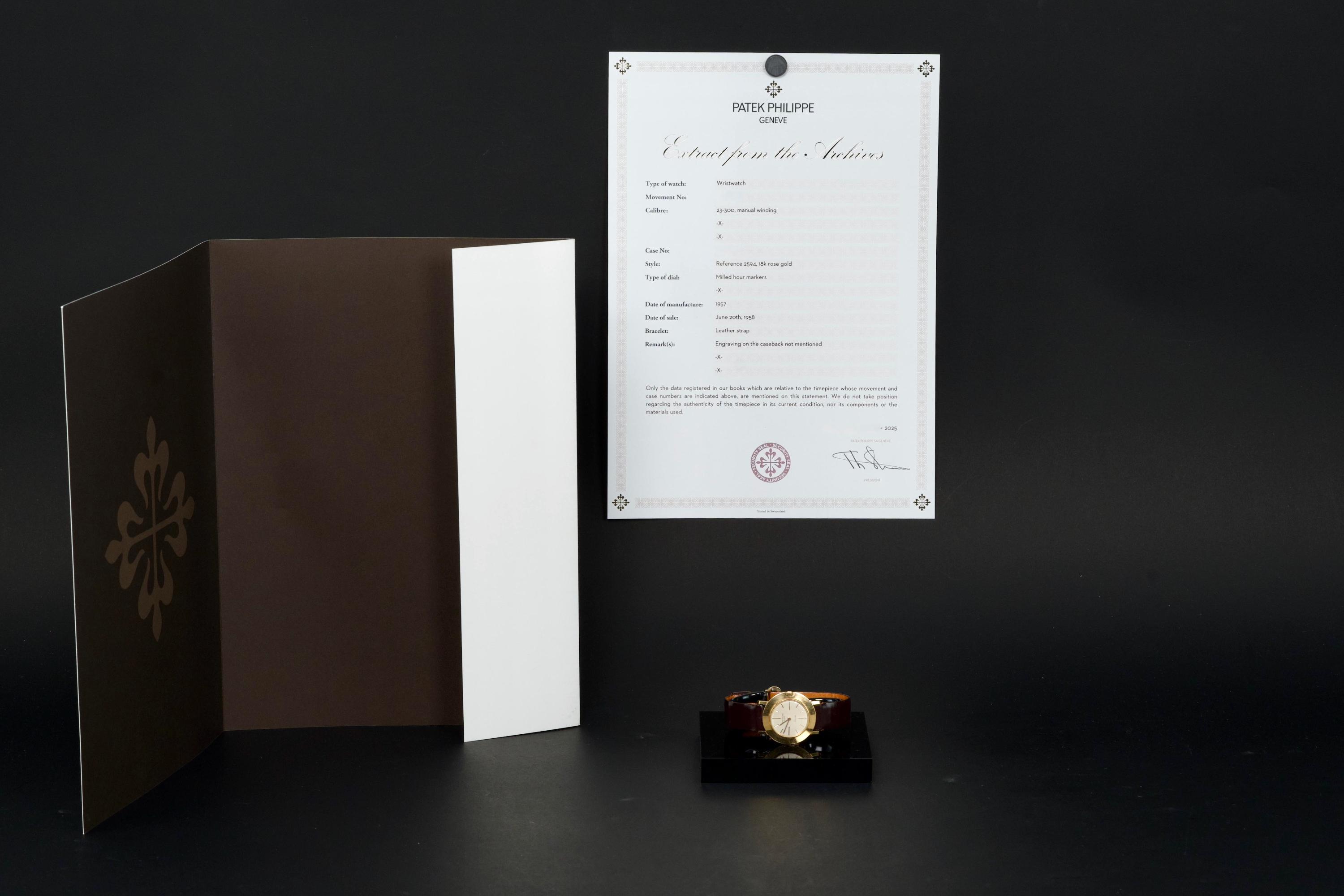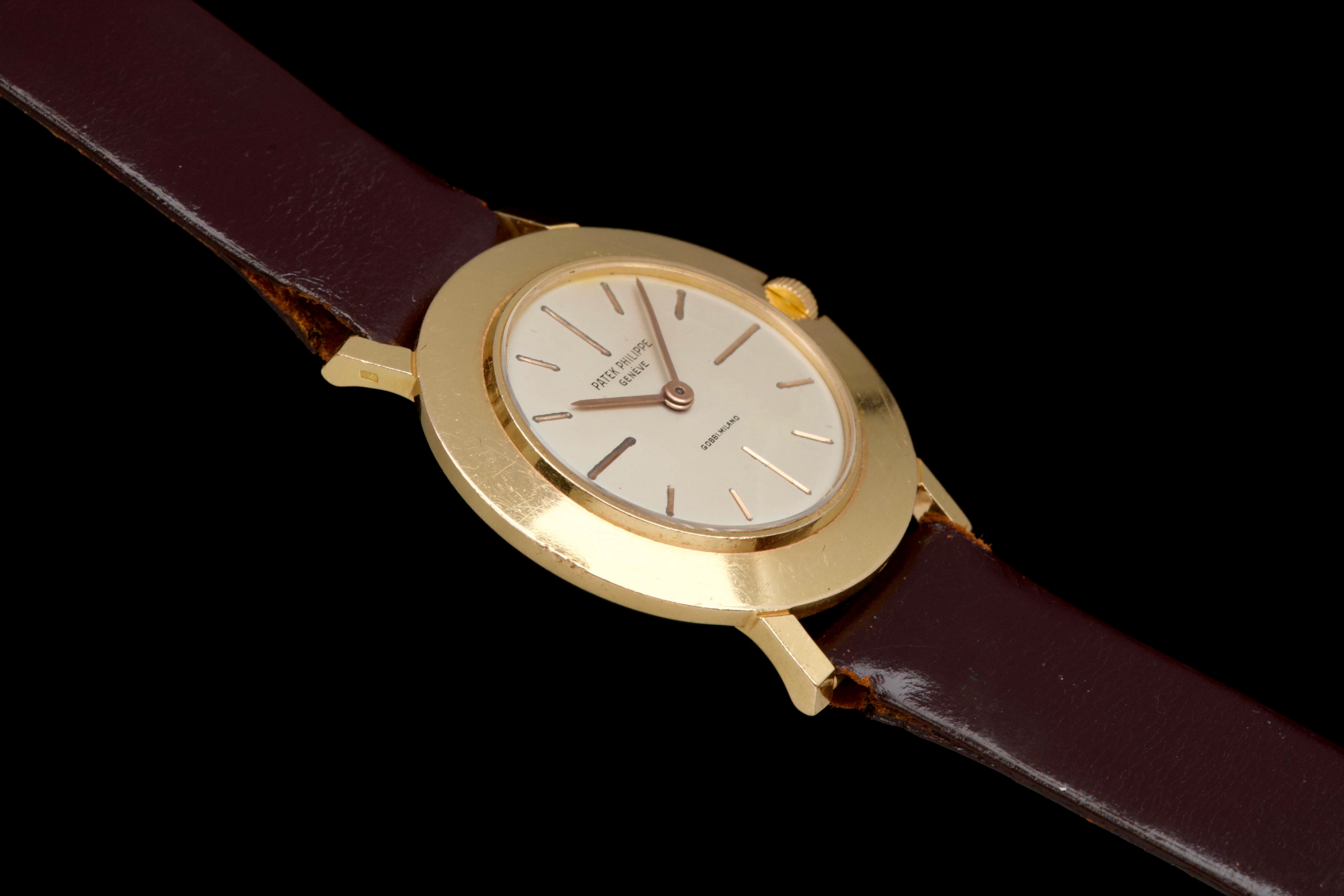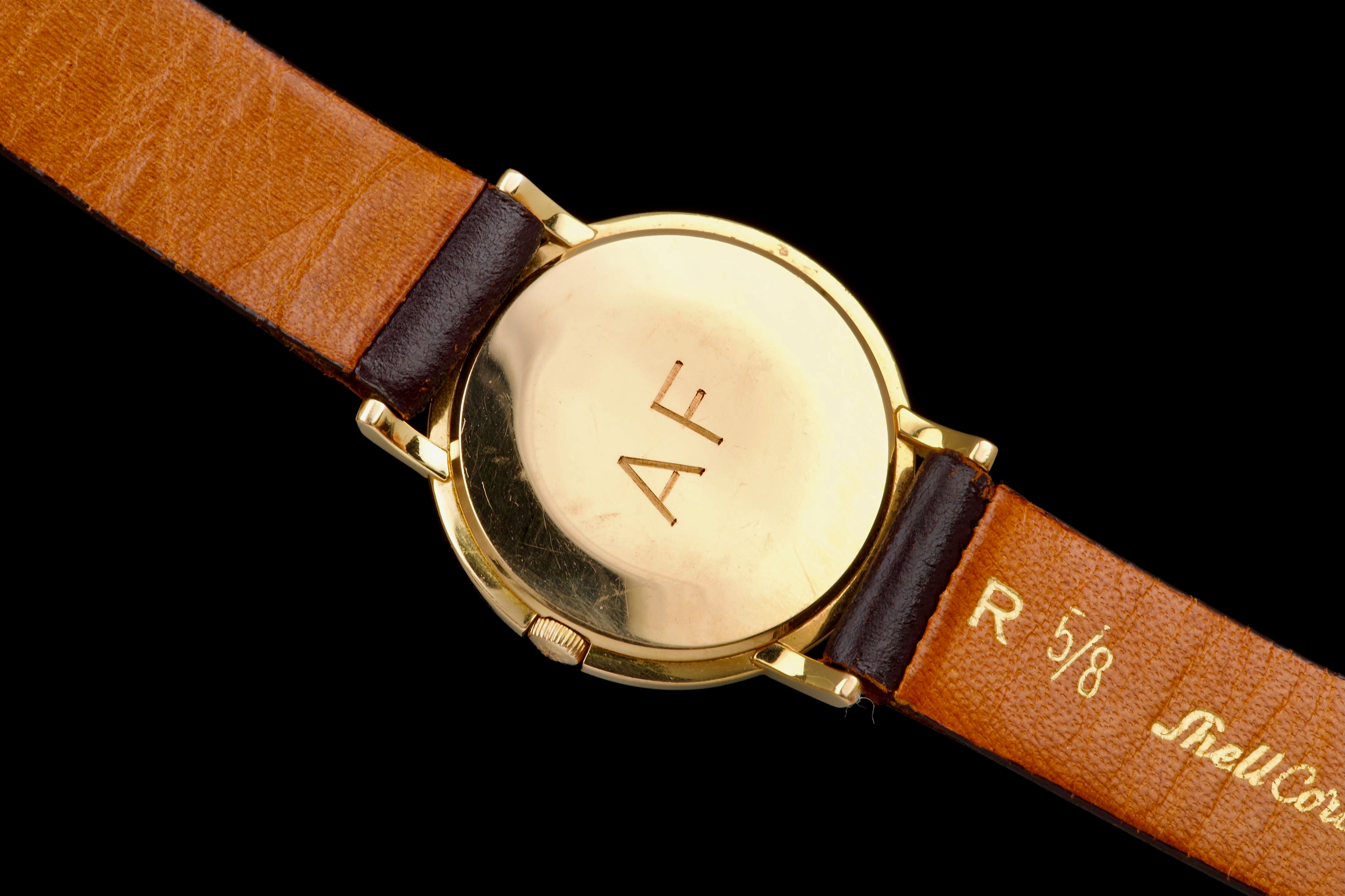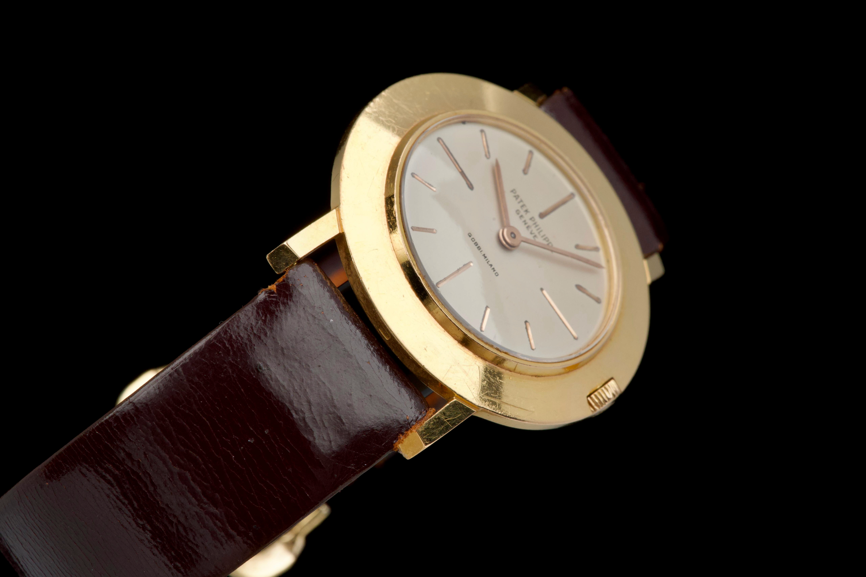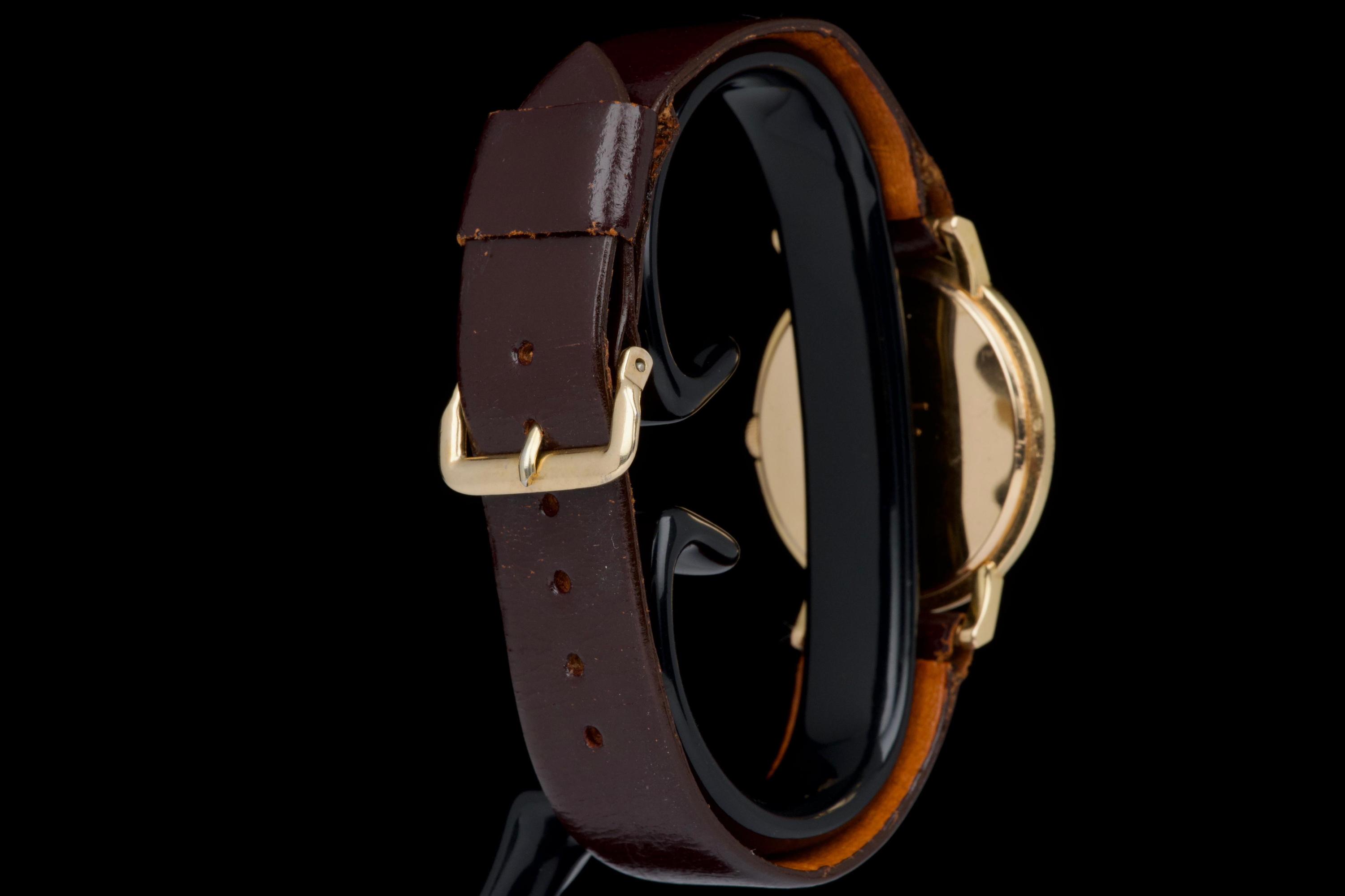 An evocative and highly charismatic example of the celebrated “Disco Volante” reference 2594, this yellow-gold Patek Philippe is distinguished by its desirable double-signed dial retailed by Gobbi, Milano, one of the most important Italian Patek Philippe agents of the mid-20th century. The case appears to be unpolished, retaining a deep and clearly legible hallmark on the side of the lug at approximately 1 o’clock—an uncommon and particularly attractive attribute for this reference. While the case shows surface scratches and small nicks consistent with age and honest wear, its overall proportions and sculptural profile remain well preserved. The caseback has been polished in the past and bears an engraved monogram “AF”. The dial is in good overall condition and appears unrestored, displaying light wear around the applied hour markers and a few small marks, entirely consistent with a watch of this period. The printing remains clear, and the Gobbi signature adds a layer of historical and collectible significance. The watch is fitted with a smooth calfskin leather strap and an aftermarket buckle that is not in gold. It is accompanied by its Extract from the Archives, confirming production in 1947 and sale in June 1958. The movement is running well at the time of cataloguing. Rare, elegant, and rich in character, this double-signed Disco Volante represents an excellent opportunity to acquire a highly collectible mid-century Patek Philippe with Italian retailer provenance and strong visual presence.