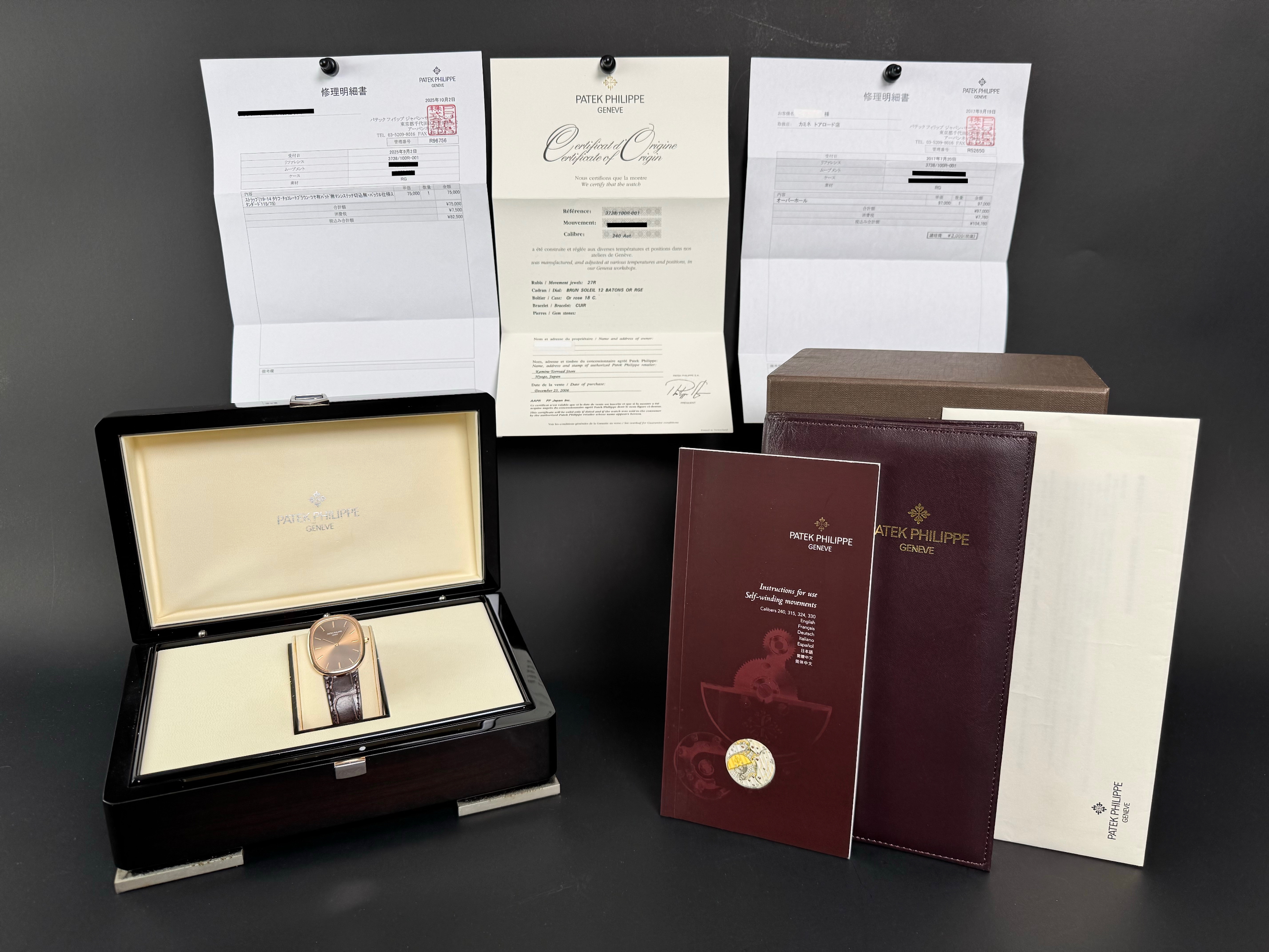 A superb example of the Patek Philippe Ellipse reference 3738/100R-001 in 18K rose gold, featuring the elegant brown sunburst dial. Originally sold in Japan in 2006, this watch benefits from an excellent and well-documented history. It comes with Patek Philippe Japan service papers from 2017, confirming a complete service. The watch appears to have been very lightly worn since. In 2025, the leather strap was replaced by Patek Japan (invoice included) and is presented here in unworn condition. Fitted with its original rose-gold Patek Philippe tang buckle. The 31 × 35 mm rose-gold case is in magnificent condition, with crisp lines and a flawless presentation. Complete with its full original 2006 set, including box, papers, booklets, and accessories. A beautifully preserved Ellipse with impeccable provenance — elegant, rare, and perfectly maintained.