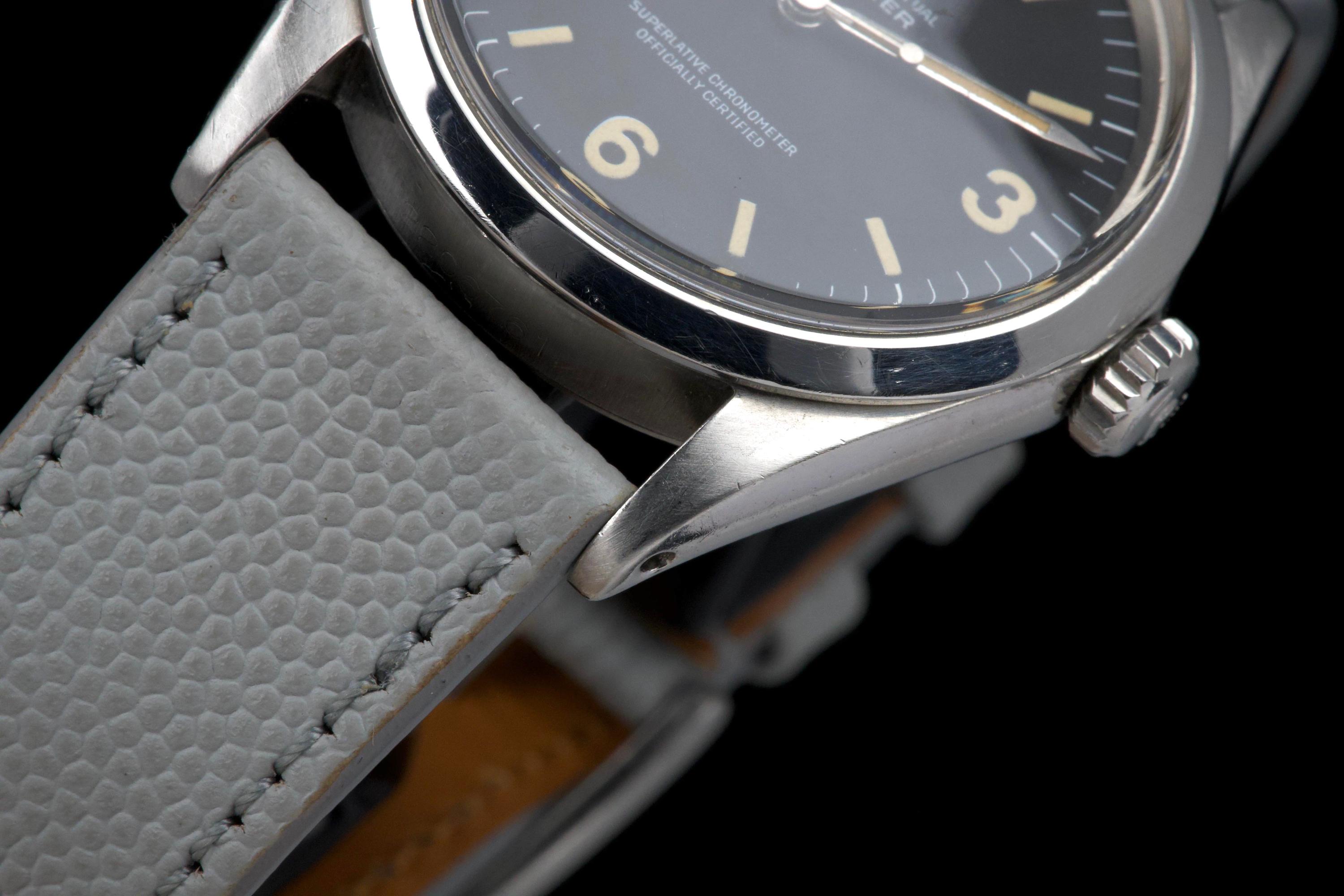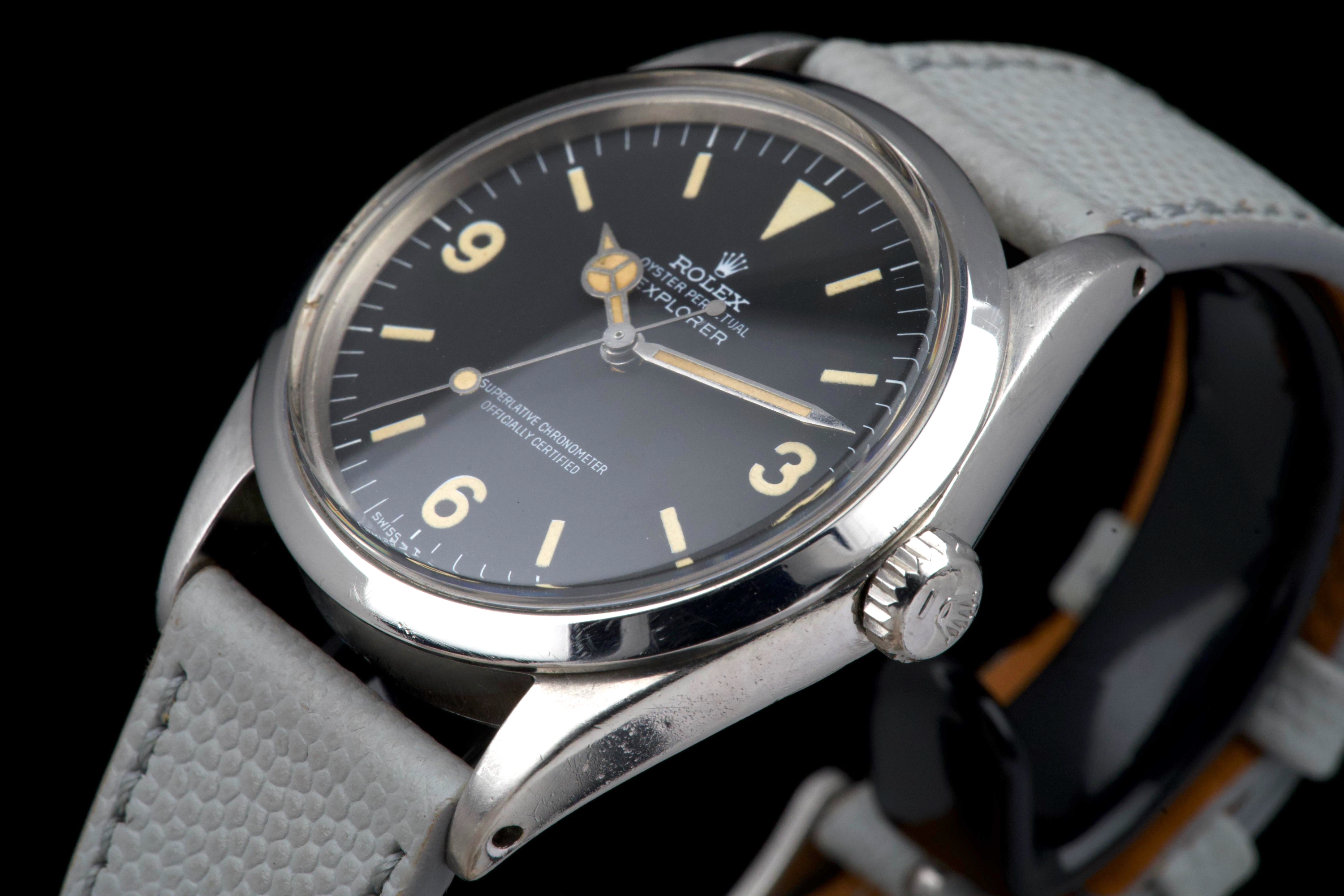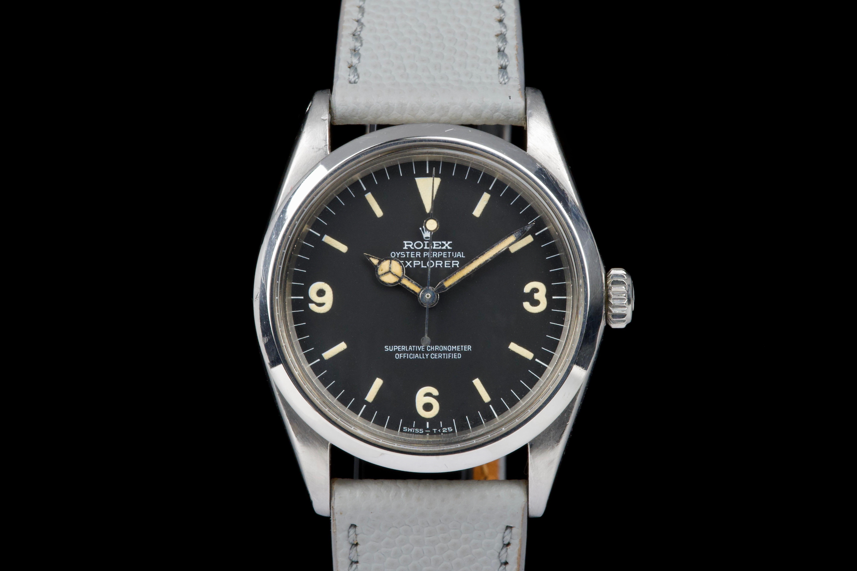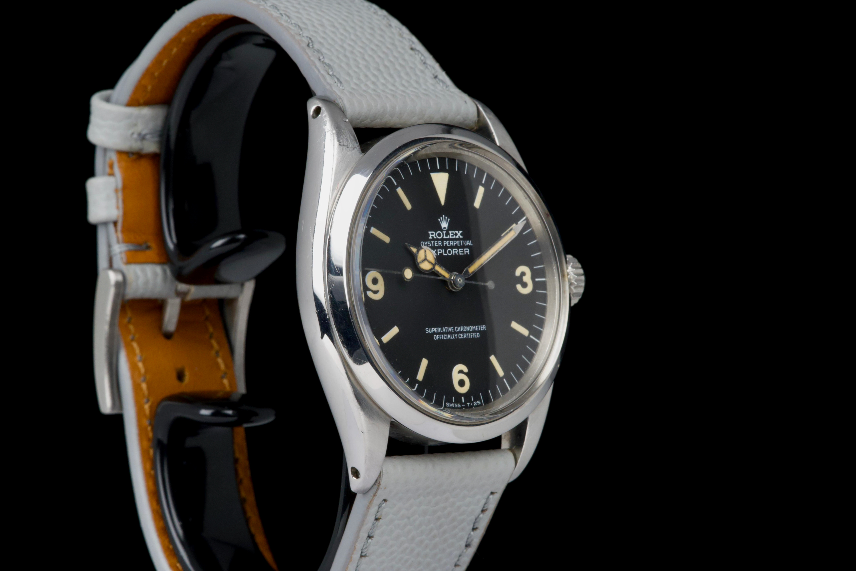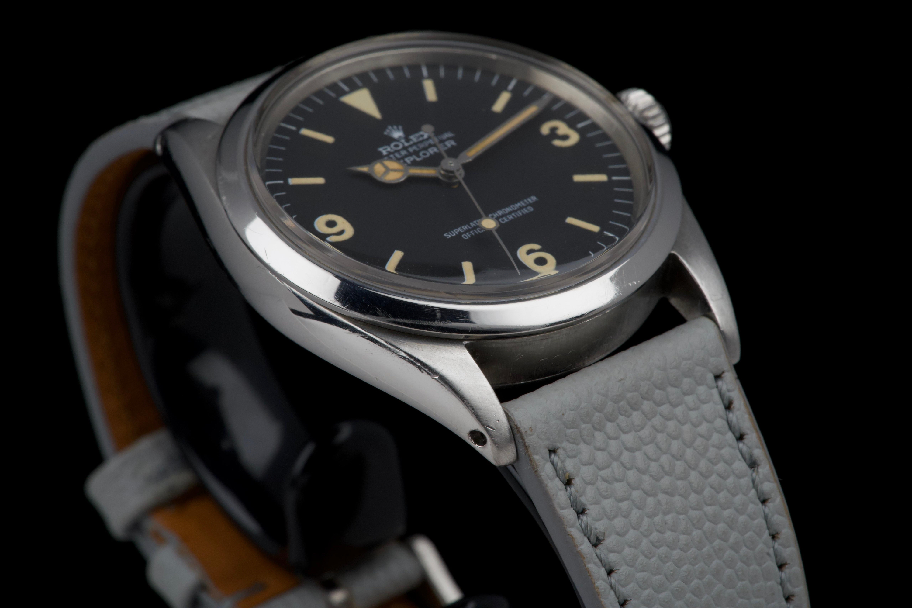 The present Rolex Explorer reference 1016 Mk I, dating to 1969 and bearing the serial number 220XXX, is a highly attractive and honest example of this iconic 36 mm tool watch, preserved with strong originality and desirable early features. The stainless-steel case has been polished in the past and shows light wear consistent with careful use, while retaining pleasing proportions and definition. The serial and reference numbers between the lugs remain crisp and well defined, and the caseback is correctly stamped “II.69,” firmly anchoring the watch within its production period. The watch is fitted with an original Mk I “Frog Foot” tritium dial, preserved in excellent condition. The luminous material on the hour markers has aged to a warm vanilla patina, giving the dial a beautifully balanced and period-correct appearance. The hands are original tritium and have aged a few shades darker than the dial, a natural and frequently observed trait that adds character without detracting from the overall harmony of the watch. Powering the watch is the Rolex calibre 1570, which has been serviced by our watchmaker and is running perfectly at the time of cataloguing. The watch is presented on a grained leather strap (non-Rolex); no steel bracelet accompanies the watch. With its desirable Mk I Frog Foot dial, correct late-1960s configuration, strong case details, and freshly serviced movement, this Explorer 1016 represents a compelling opportunity to acquire a classic Rolex sports watch that epitomizes the understated, utilitarian spirit of the model.