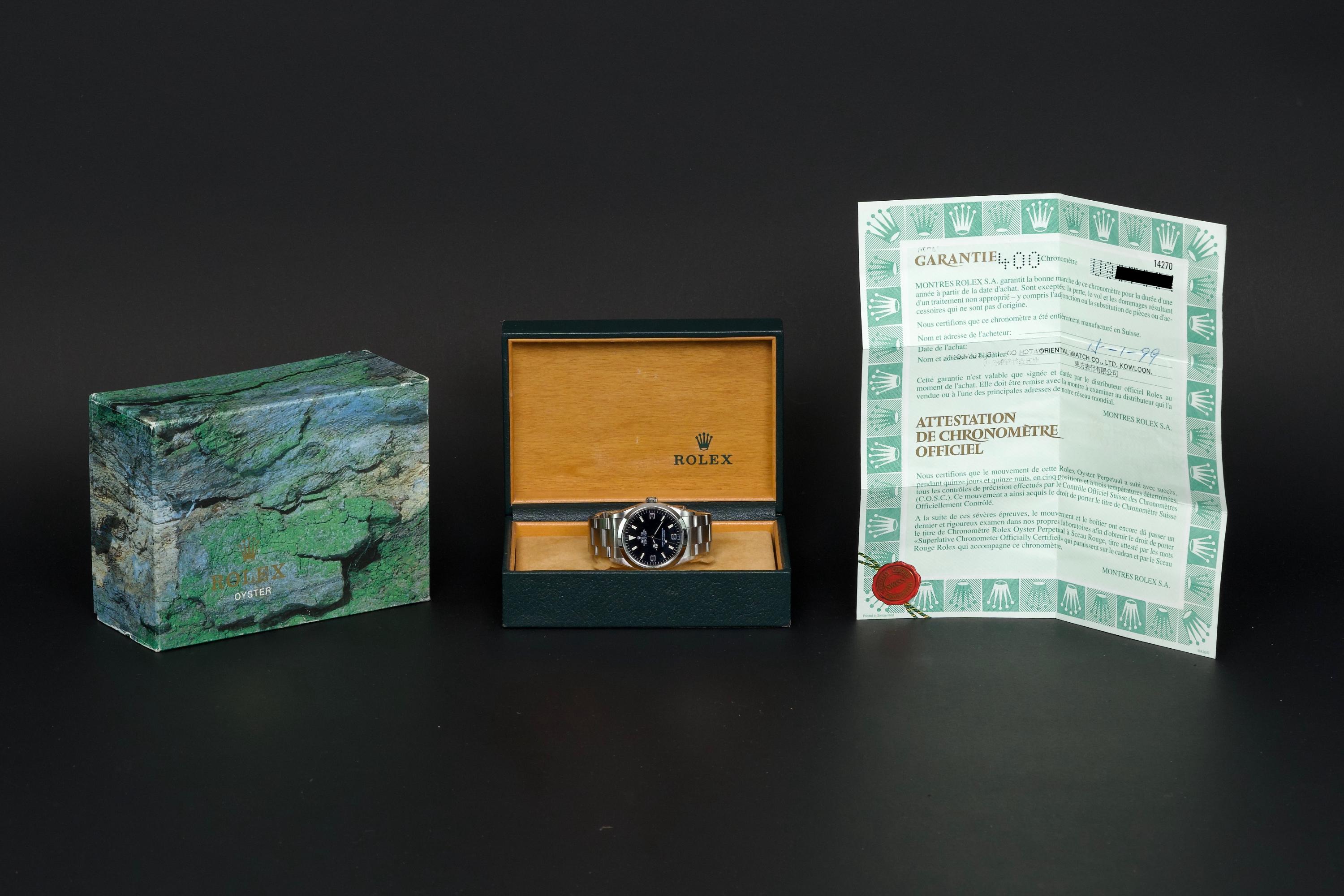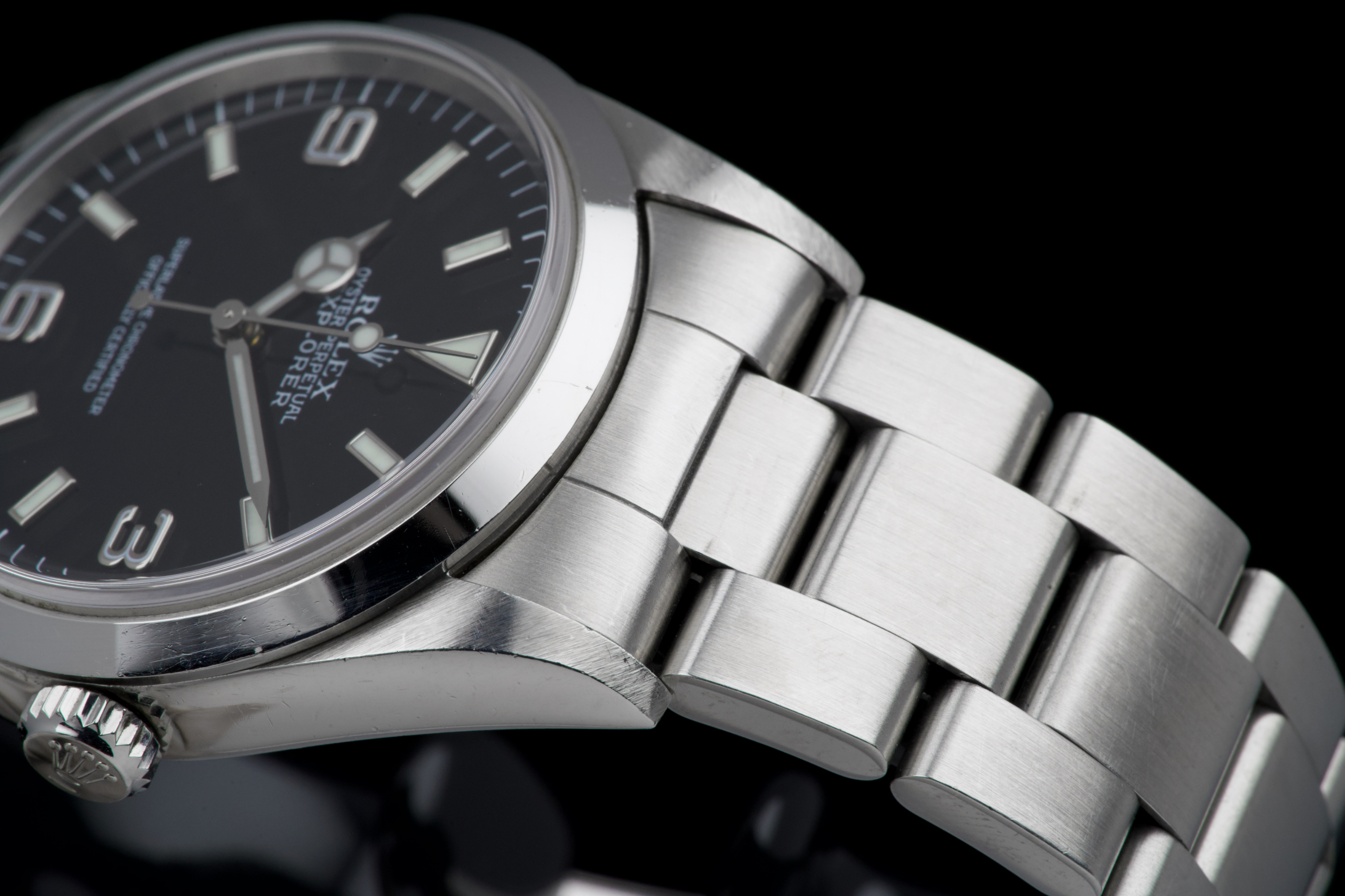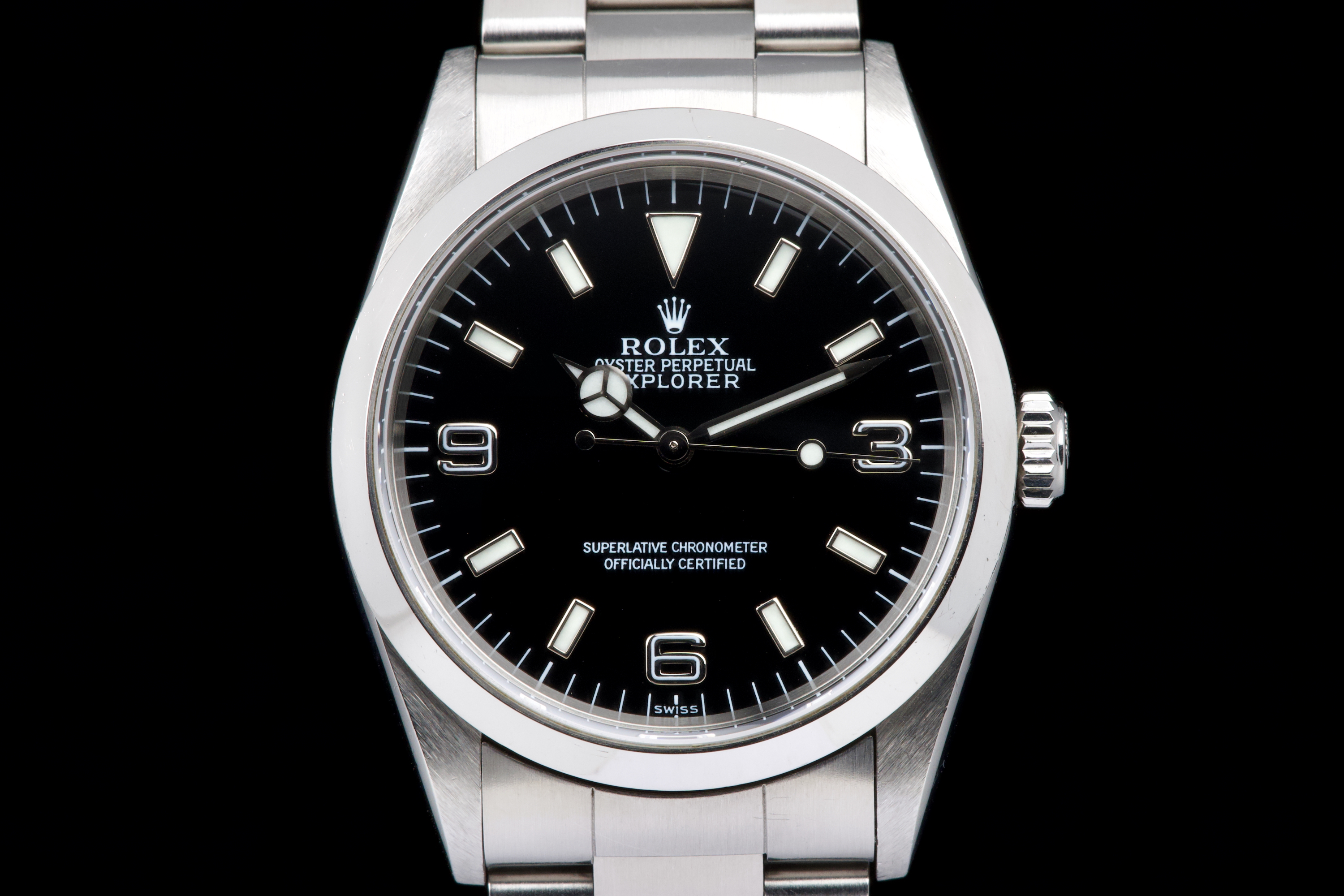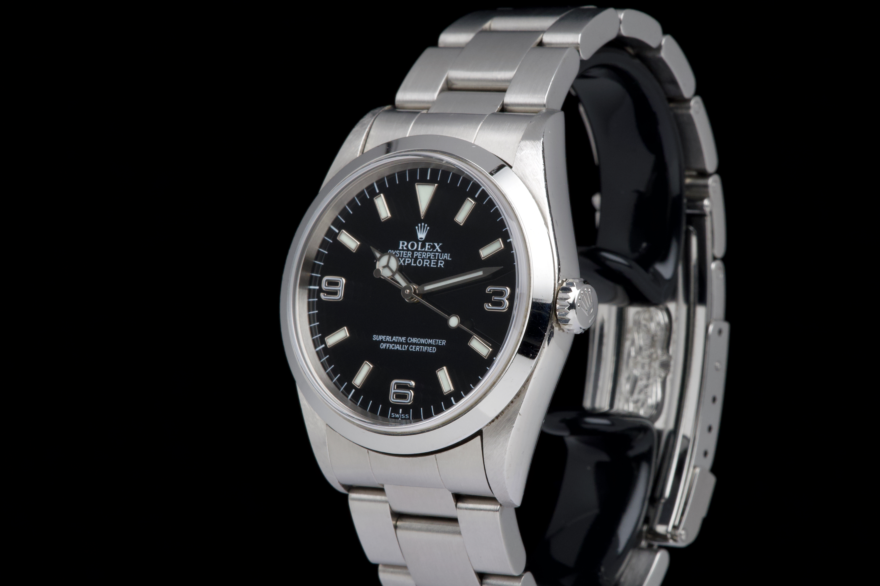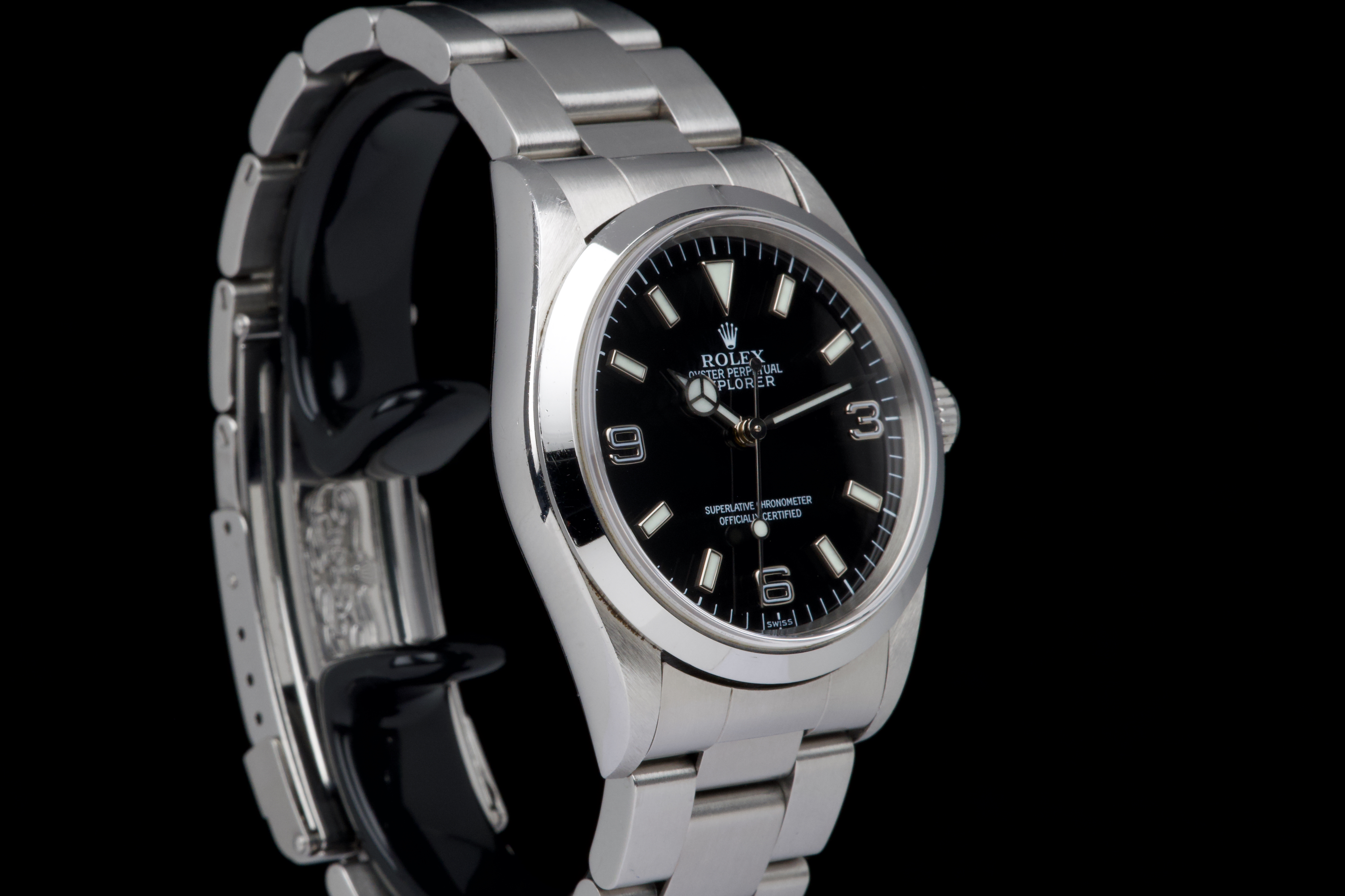 A superb and very well-preserved example of the Rolex Explorer 14270, featuring the desirable “Swiss Only” Luminova dial. The watch is unpolished, still retaining the original green factory sticker on the caseback, and shows minimal wear overall. The black glossy dial with white gold hour markers is flawless, and the hands perfectly match. Fitted with its original Oyster bracelet reference 78790, with 558B endlinks, claspcode U11, and showing almost no stretch for its age. Complete with the box and papers set shown in the photos. A stunning and honest late-series Explorer 14270 — unpolished, box and papers, checked by our watchmaker and in outstanding collector condition.
