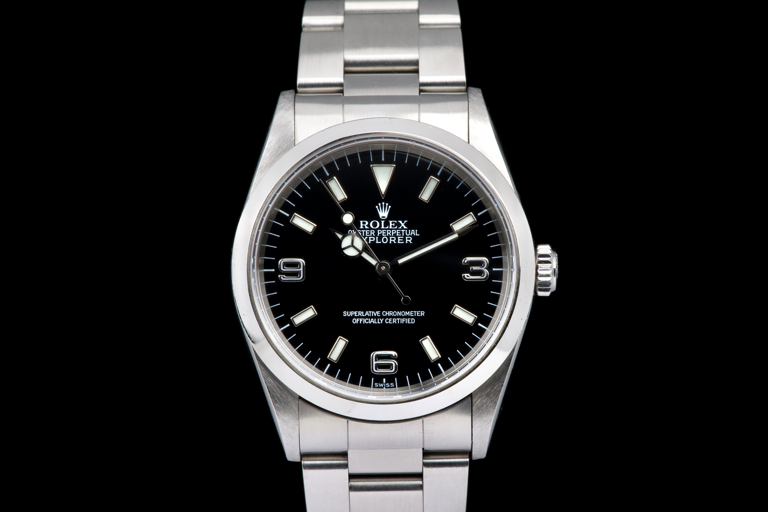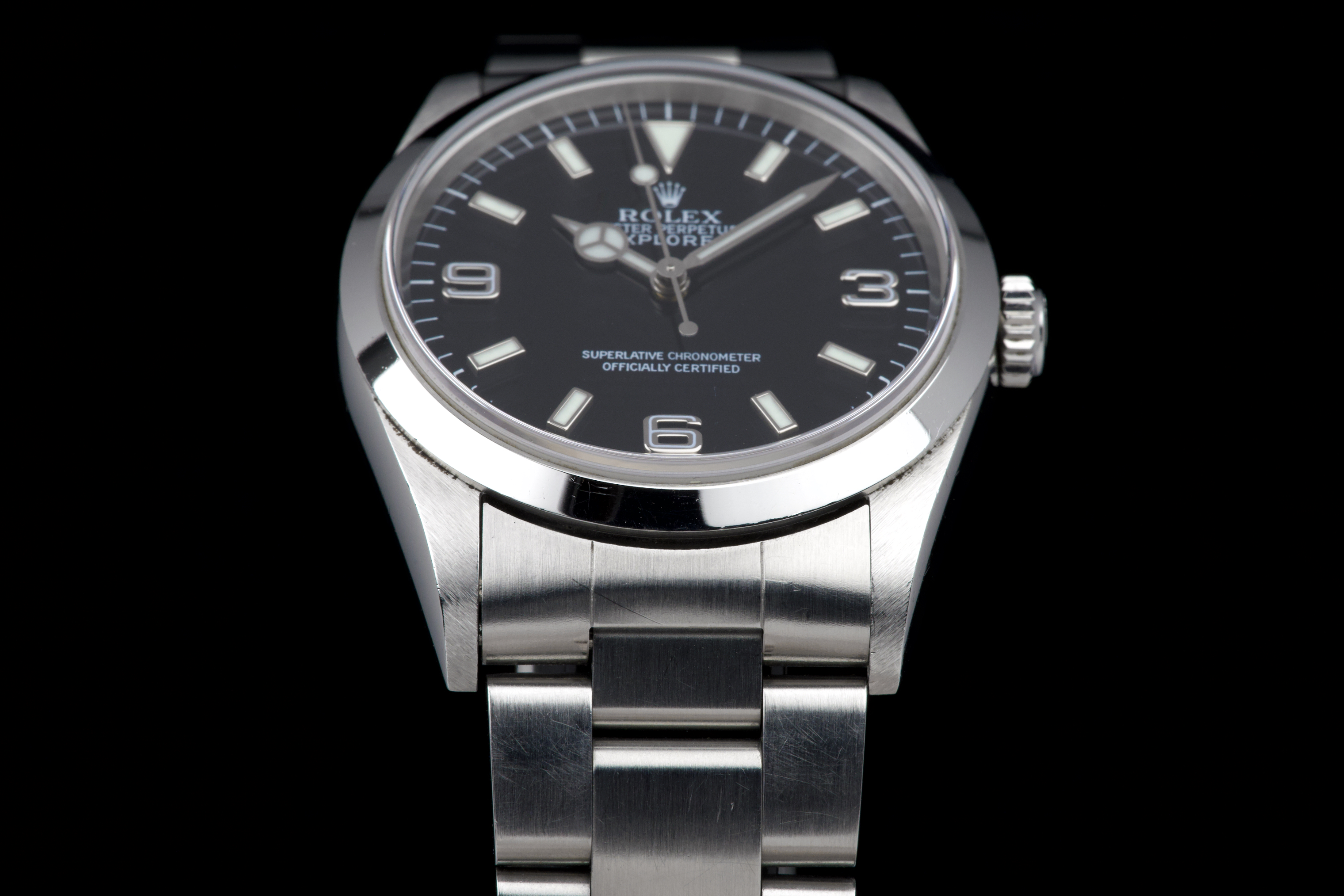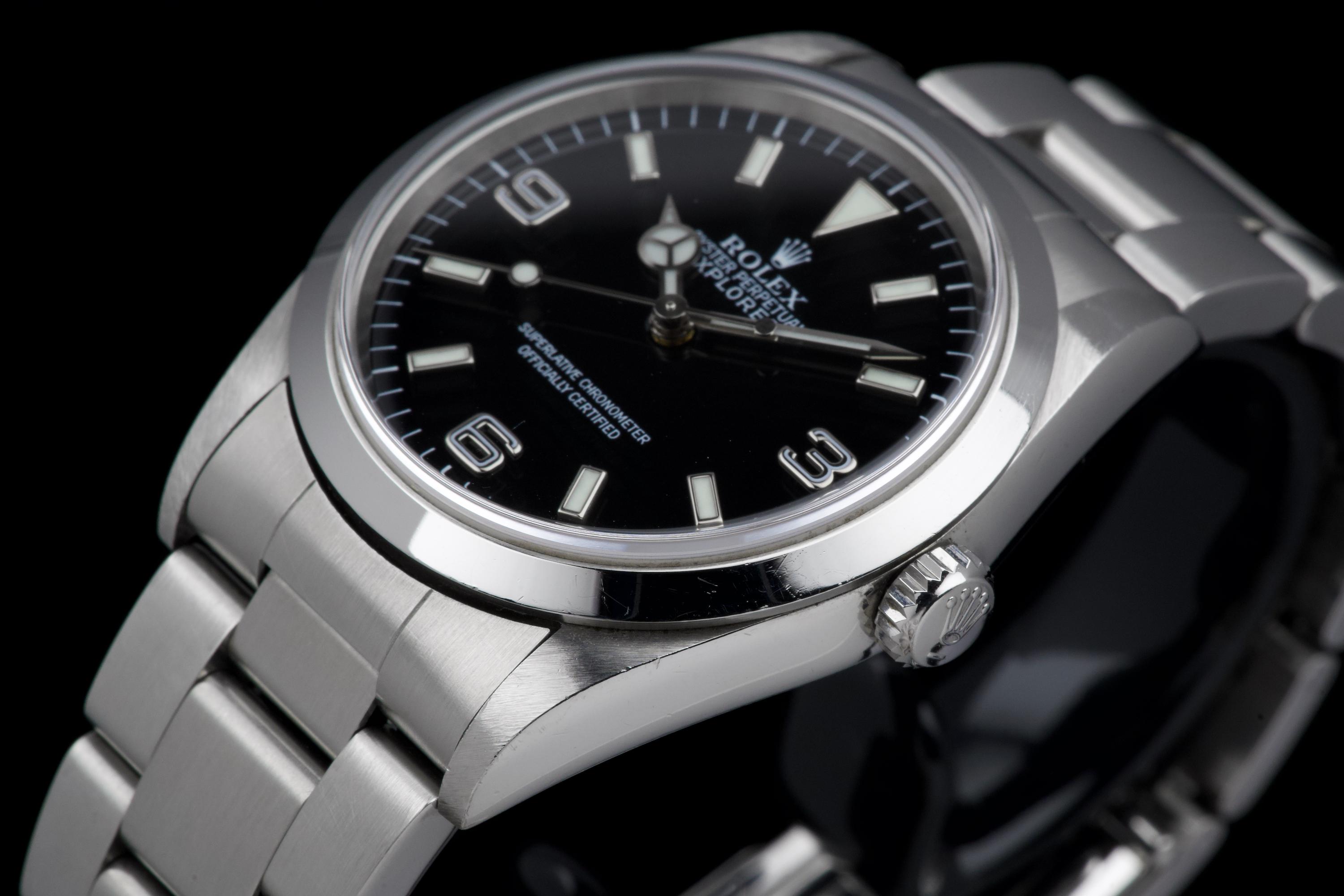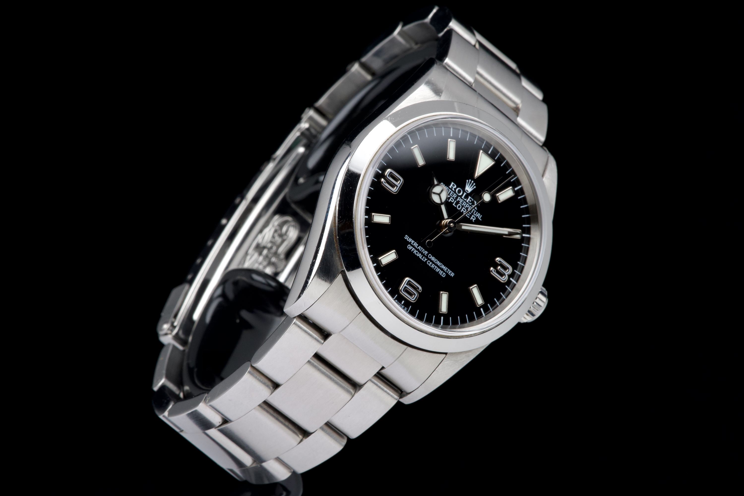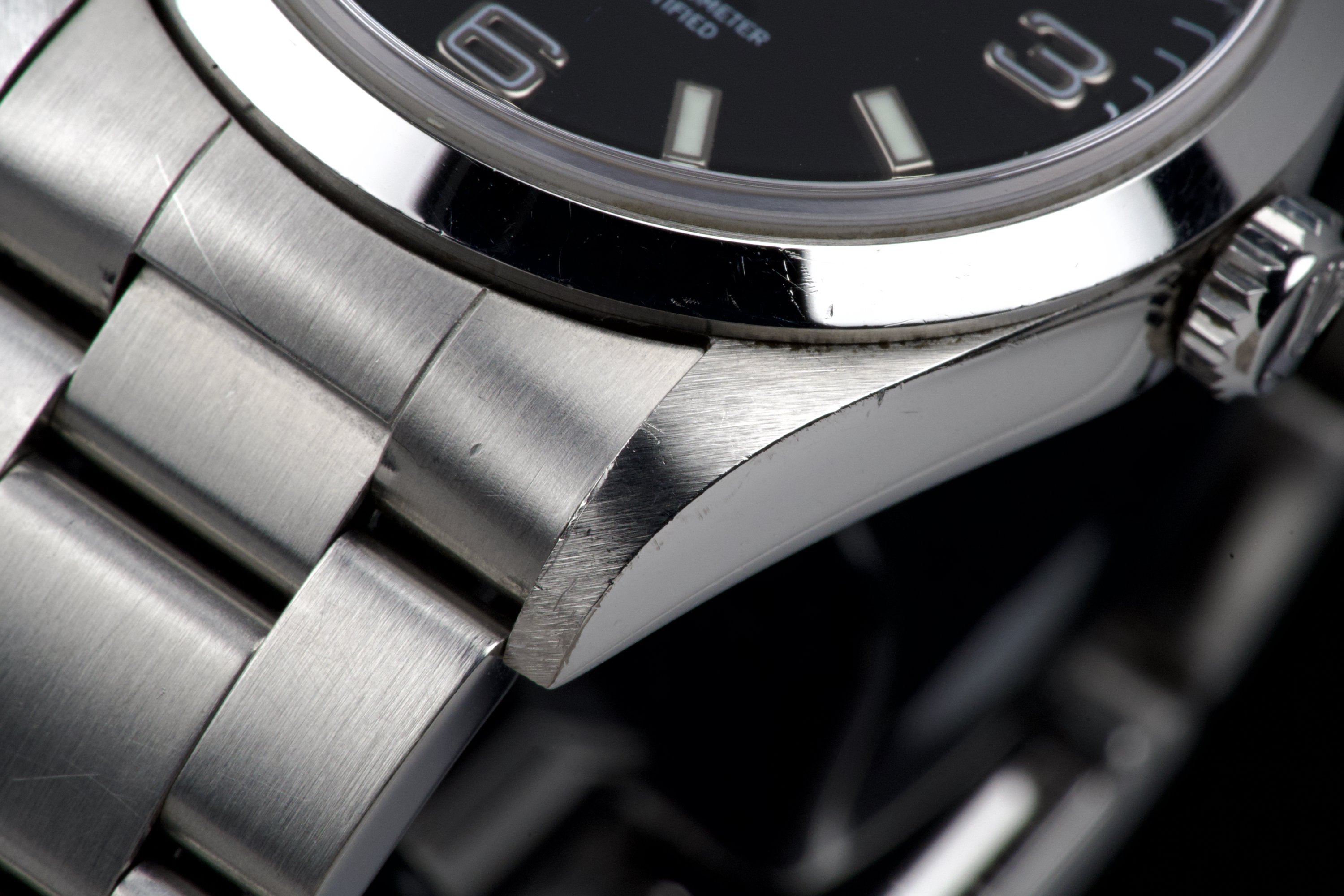 A superb and very well-preserved example of the Rolex Explorer 14270, featuring the desirable “Swiss Only” Luminova dial. The watch is unpolished, still retaining the original green factory sticker on the caseback, and shows minimal wear overall. The black glossy dial with white gold hour markers is flawless, and the hands perfectly match. Fitted with its original Oyster bracelet reference 78790, with 558B endlinks, claspcode U11, and showing almost no stretch for its age. Complete with the box and papers set shown in the photos. A stunning and honest late-series Explorer 14270 — unpolished, box and papers, checked by our watchmaker and in outstanding collector condition.