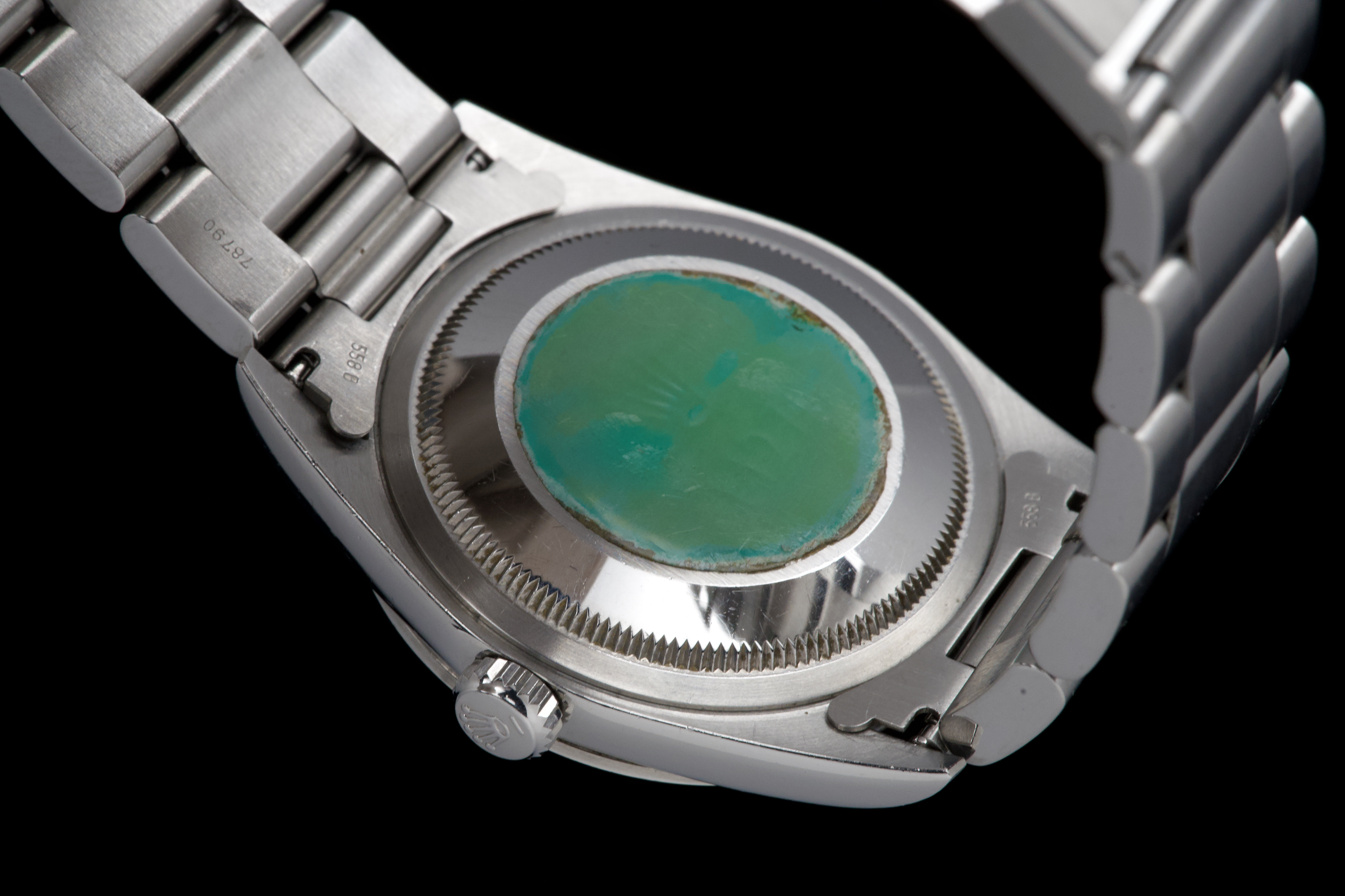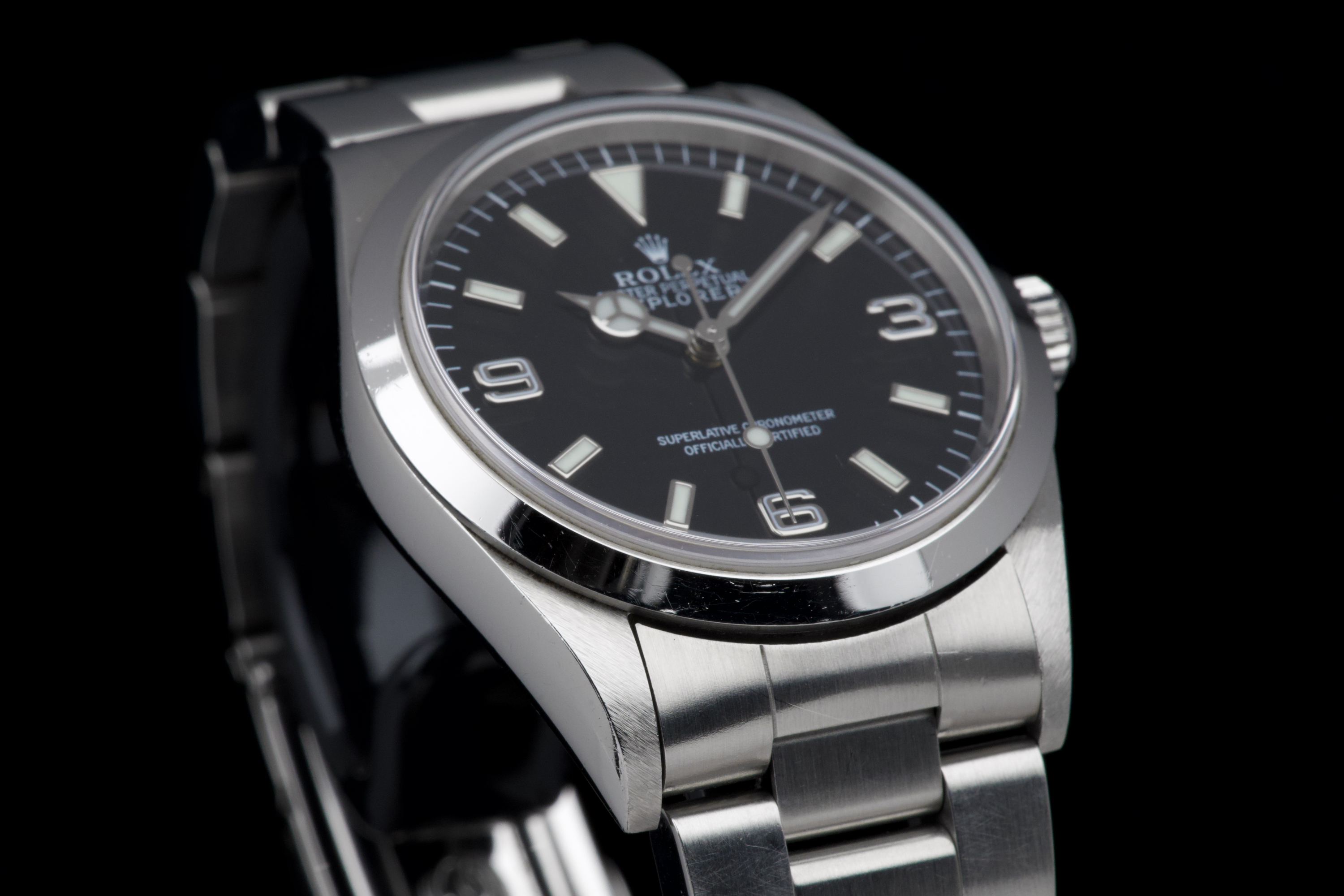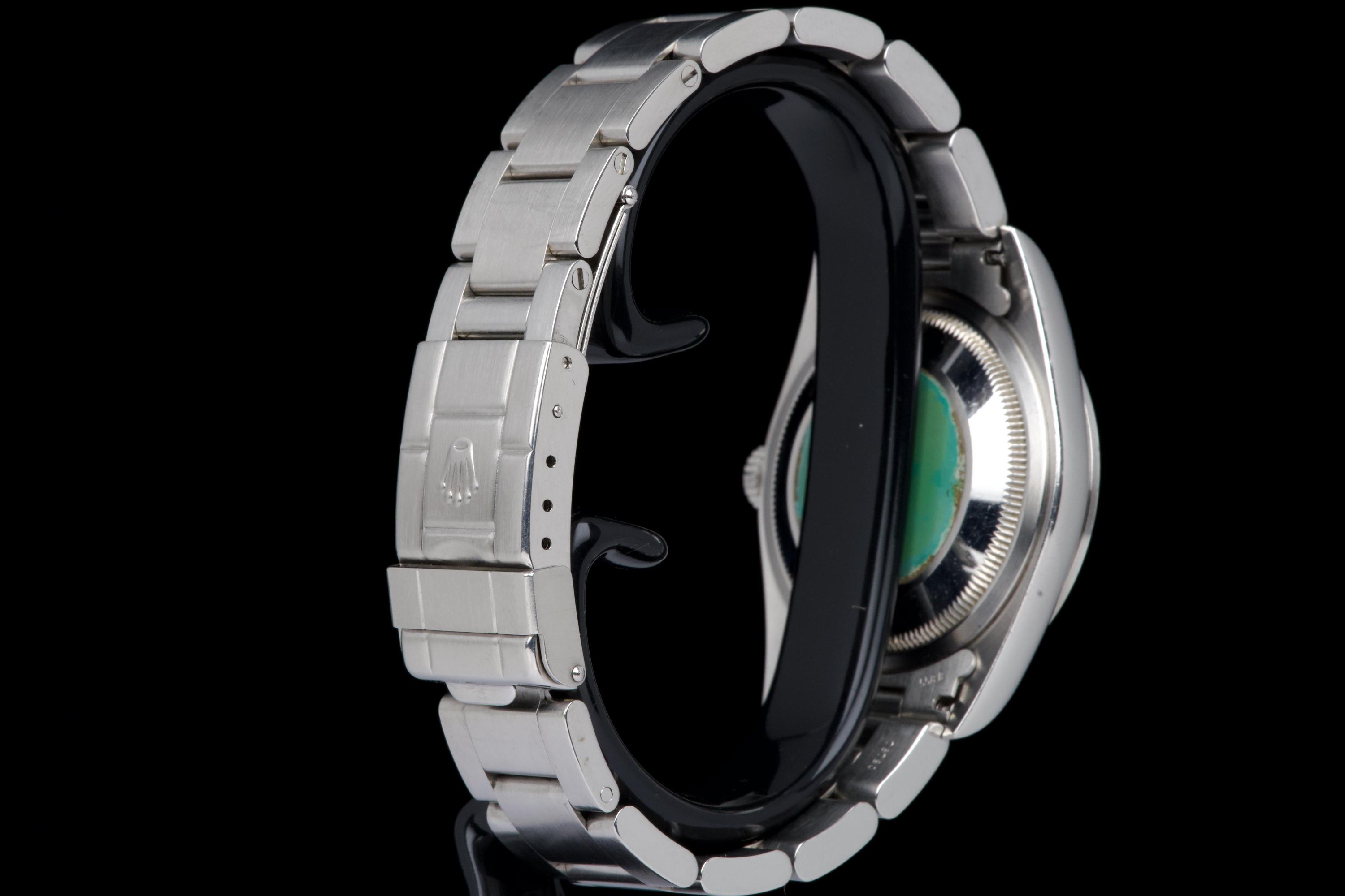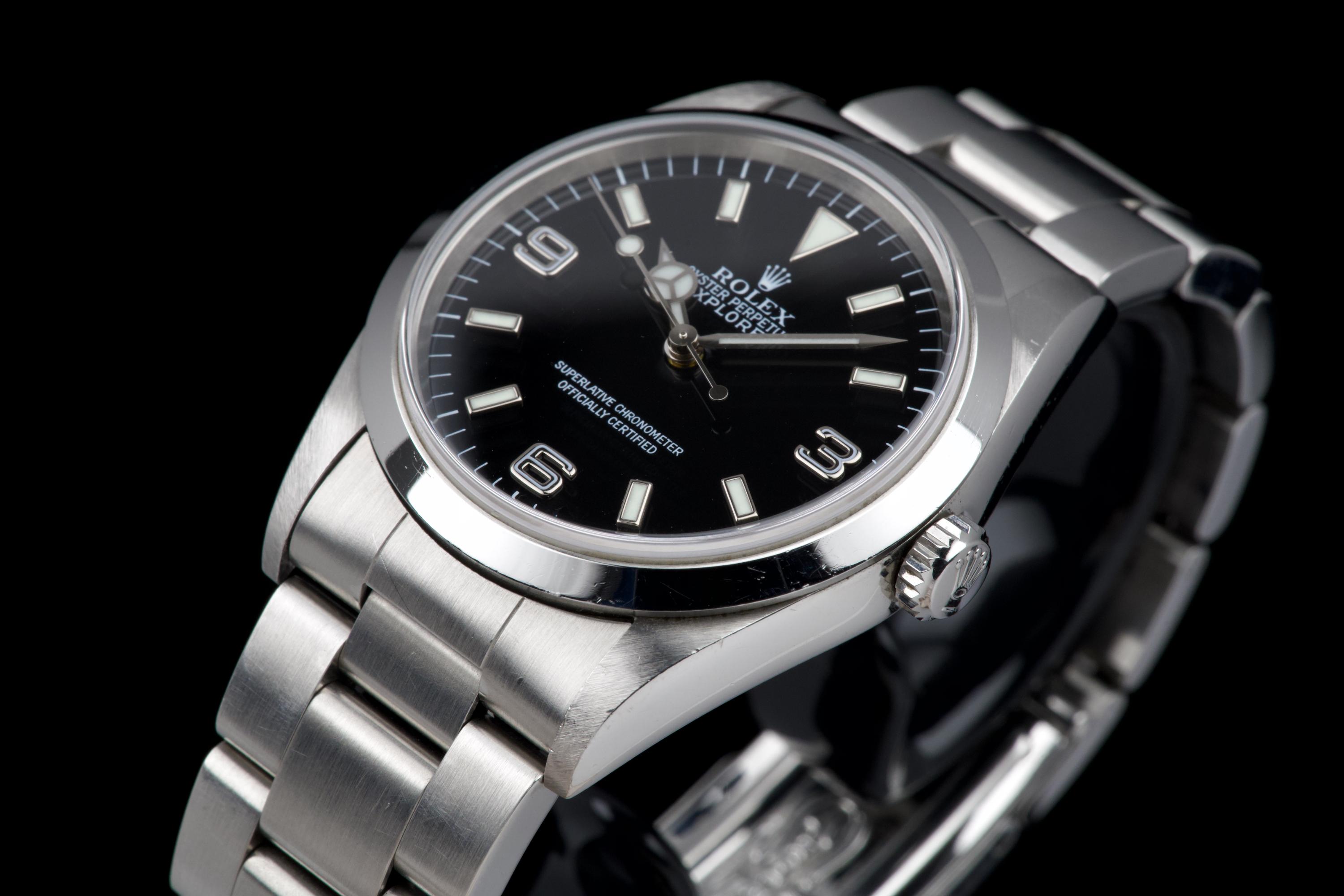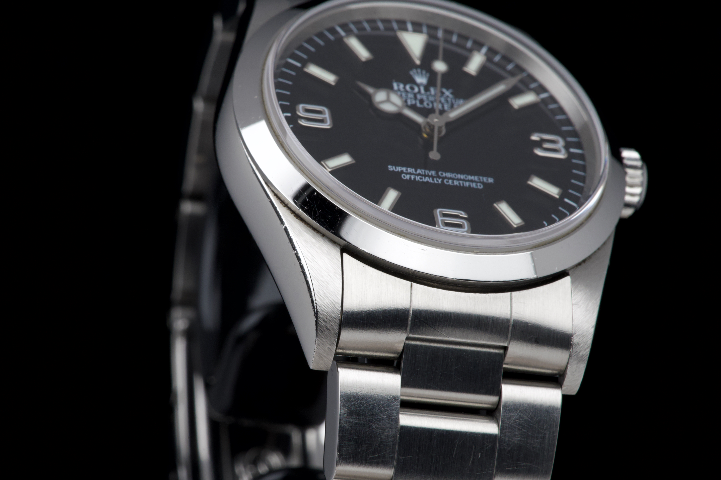 A superb and very well-preserved example of the Rolex Explorer 14270, featuring the desirable “Swiss Only” Luminova dial. The watch is unpolished, still retaining the original green factory sticker on the caseback, and shows minimal wear overall. The black glossy dial with white gold hour markers is flawless, and the hands perfectly match. Fitted with its original Oyster bracelet reference 78790, with 558B endlinks, claspcode U11, and showing almost no stretch for its age. Complete with the box and papers set shown in the photos. A stunning and honest late-series Explorer 14270 — unpolished, box and papers, checked by our watchmaker and in outstanding collector condition.