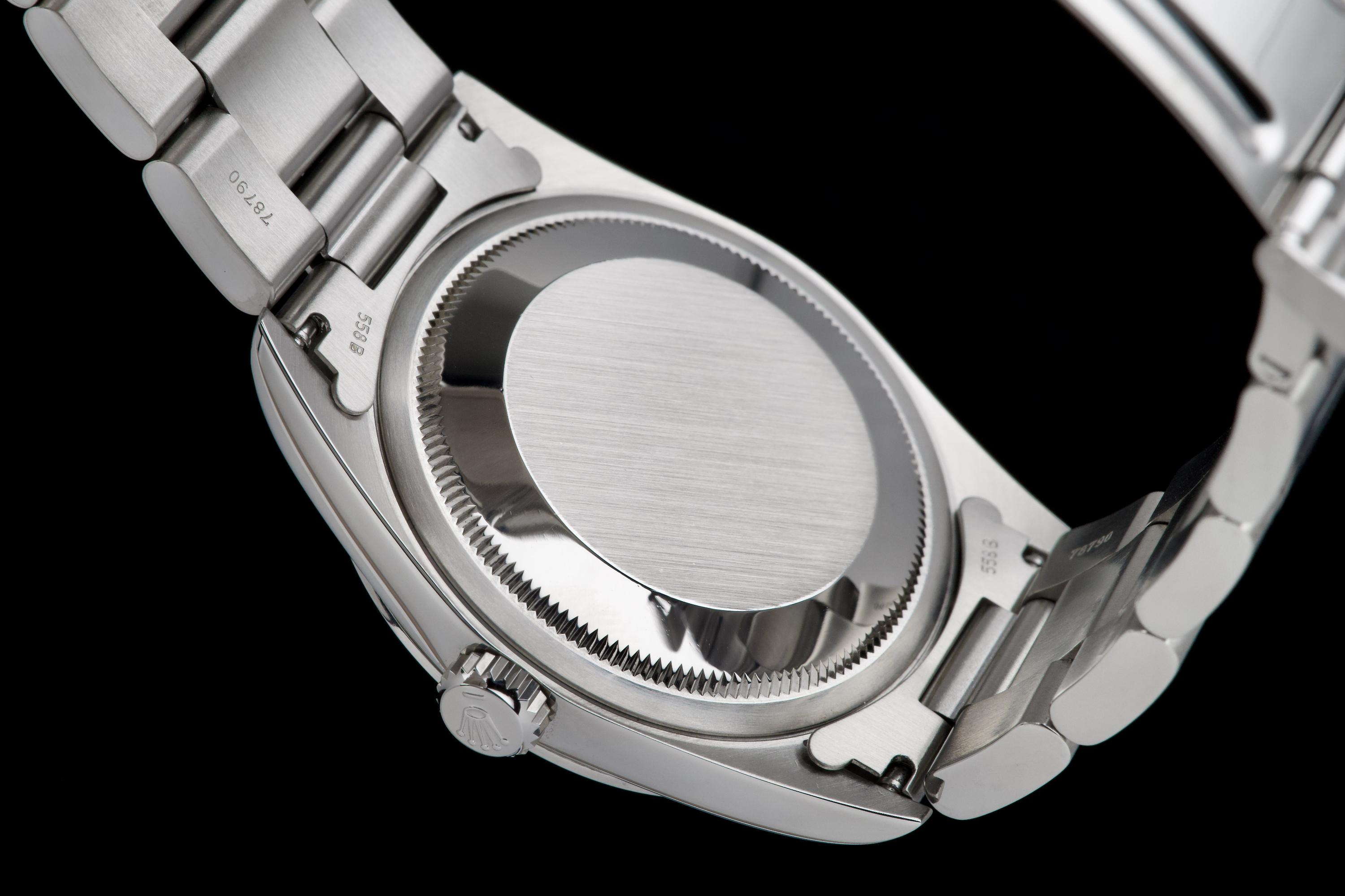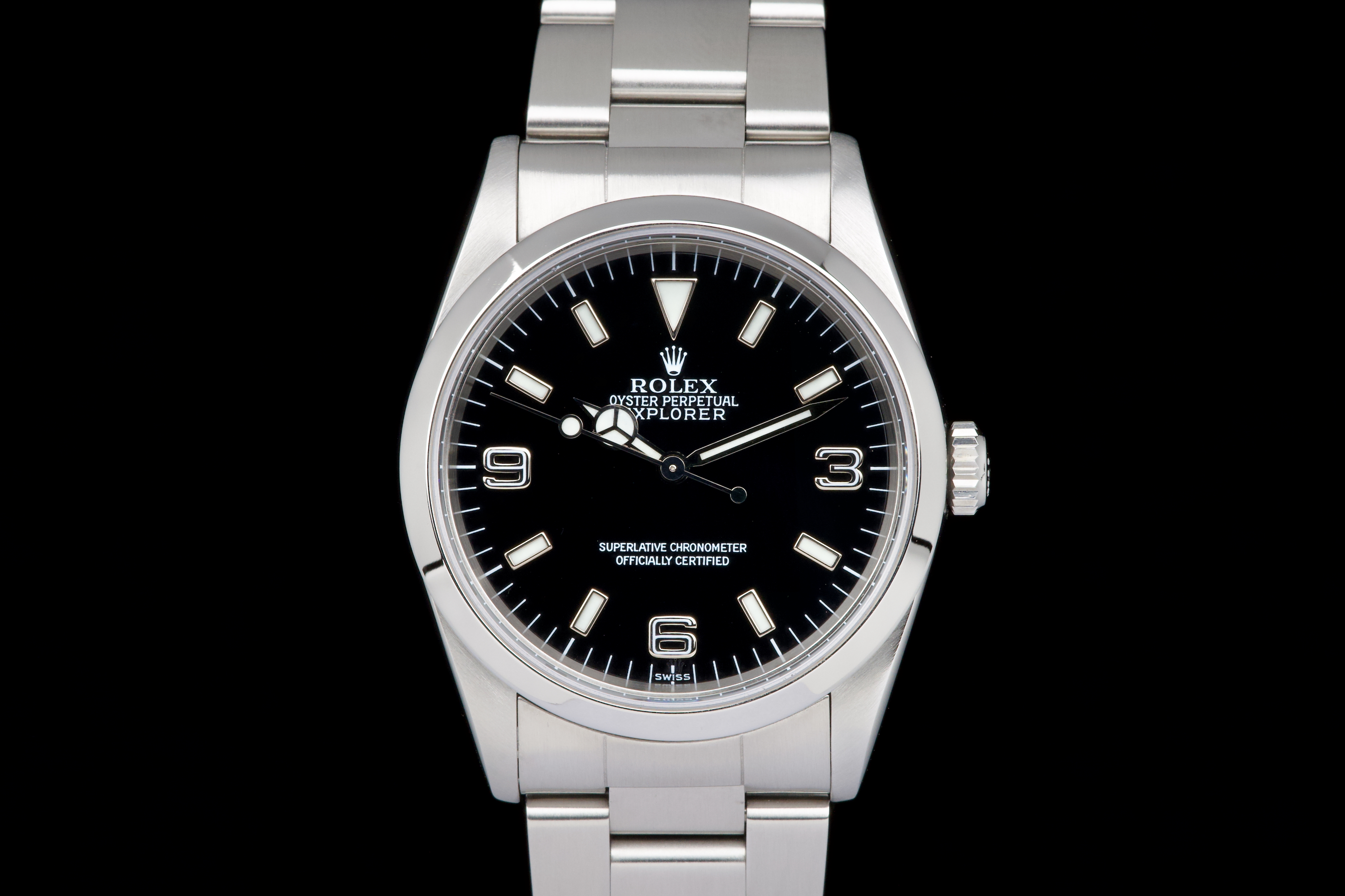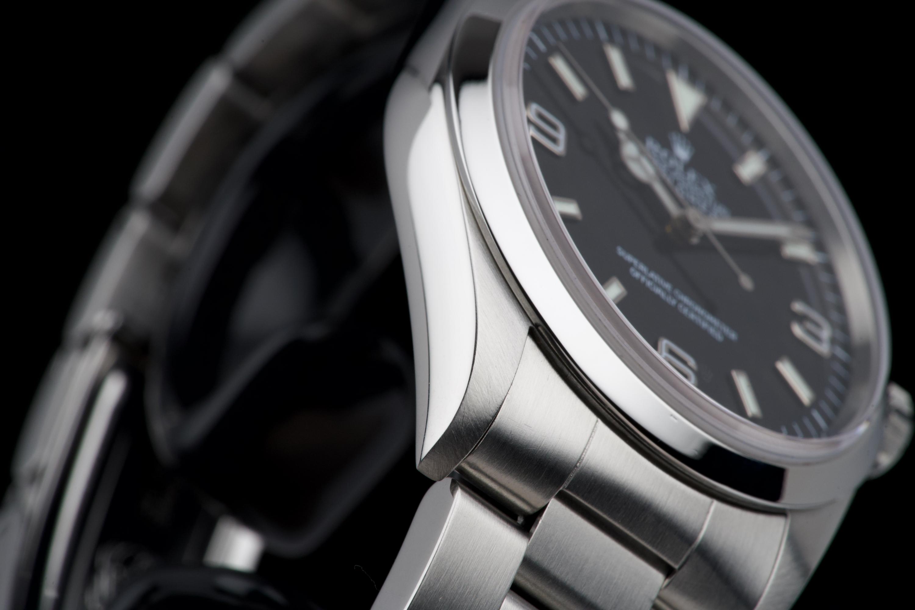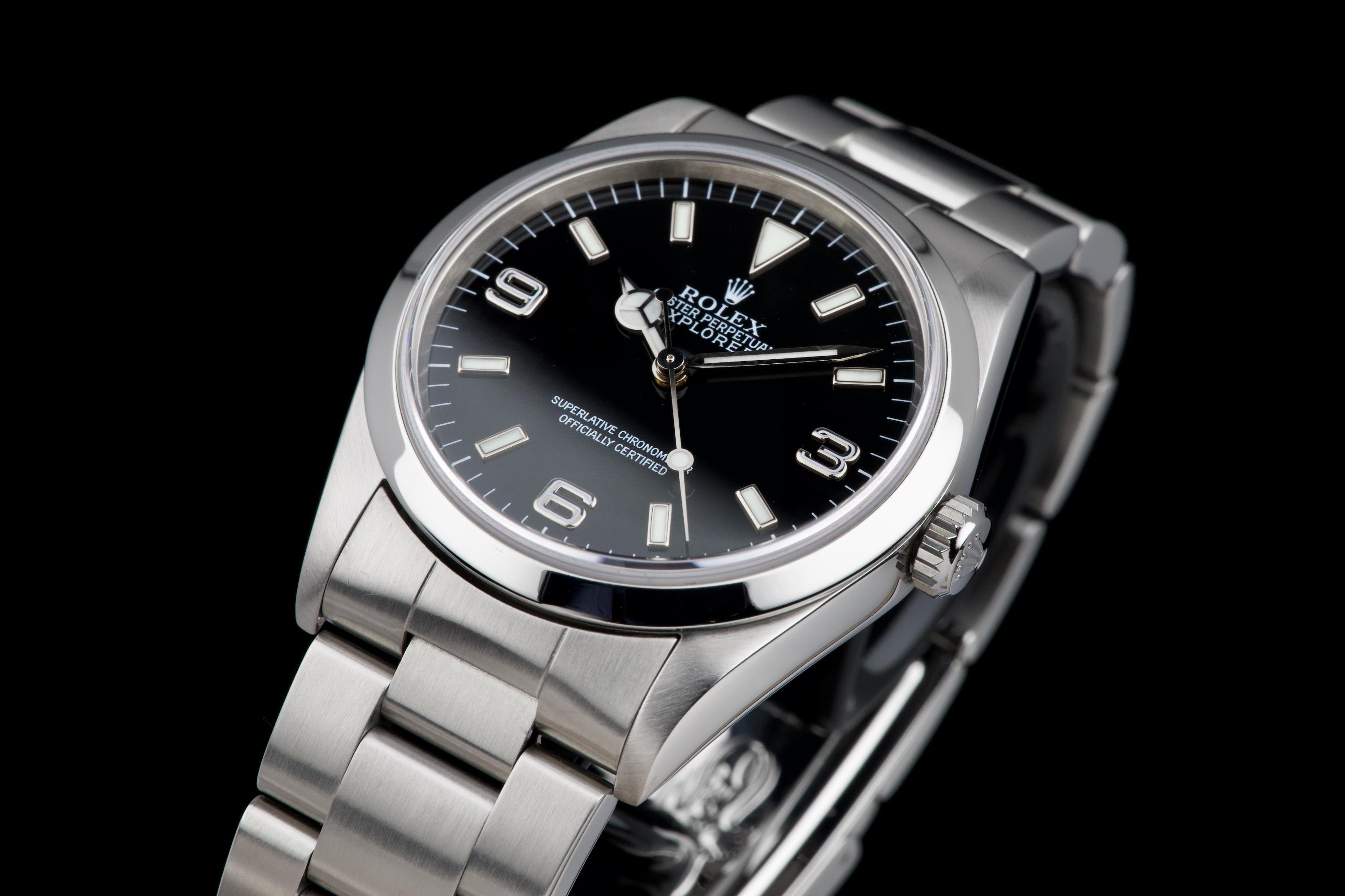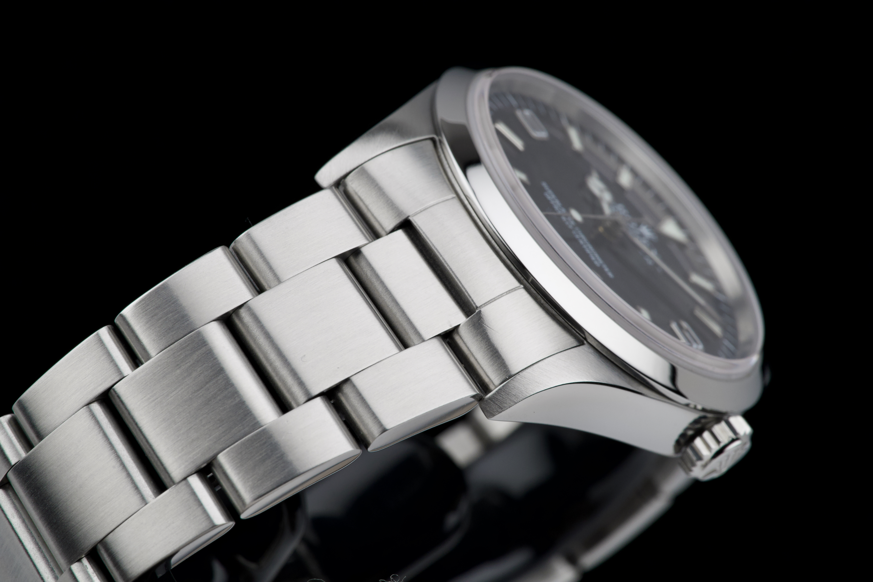 A beautiful example of the Rolex Explorer I reference 14270, featuring the rare transitional “Swiss Only” luminova dial, produced for a very short period in the late 1990s. Originally sold in 1999, this watch no longer retains its original box and papers but was officially sold by Bucherer as a Certified Pre-Owned (CPO) piece in 2021. It therefore comes with the Bucherer leather presentation box and Bucherer CPO international warranty card. The stainless steel case has been polished in the past and remains in perfect condition, with crisp lines and minimal wear. The black “Swiss Only” dial and matching luminova hands are flawless, displaying strong contrast and perfect printing. The original Oyster bracelet reference 78790 with 558B endlinks is in excellent condition, showing minimal stretch, claspcode X11. The automatic movement has been fully checked by our watchmaker and is running perfectly. A superb example of the transitional Explorer 14270 “Swiss Only,” combining perfect aesthetics, originality, and recent Bucherer CPO provenance — one of the most collectible configurations of the late 1990s Explorer I.