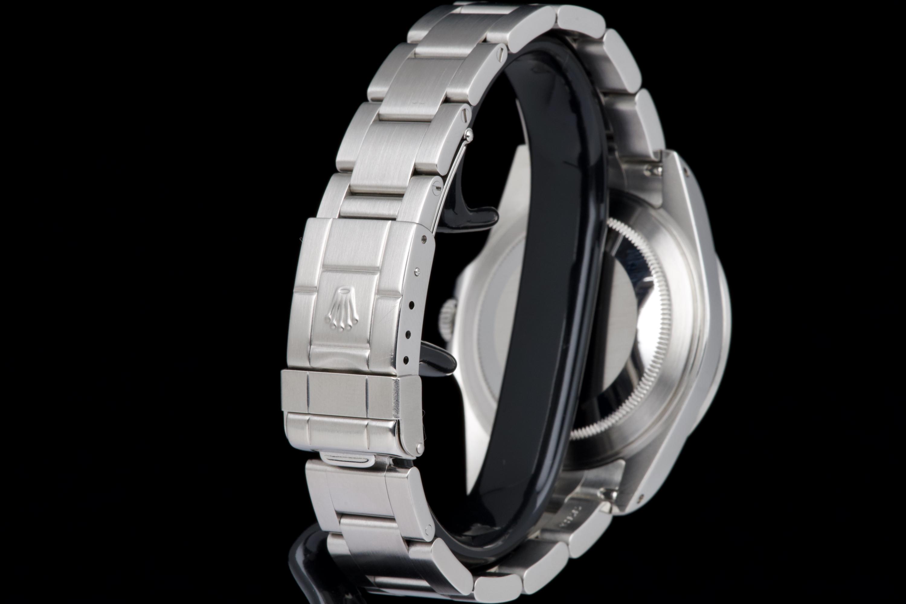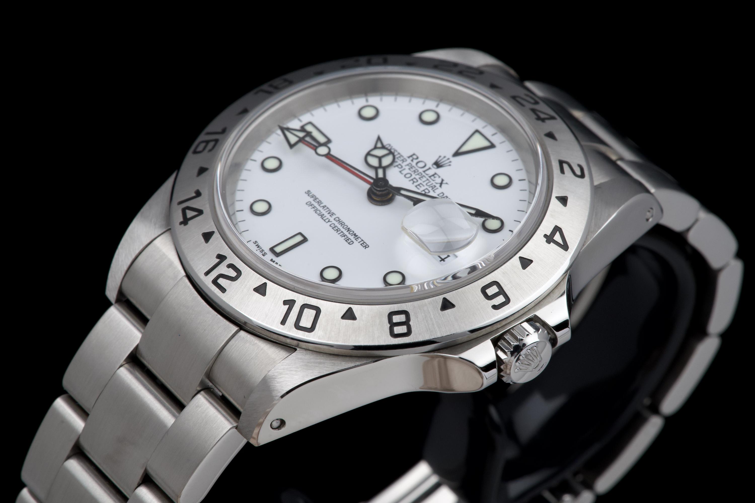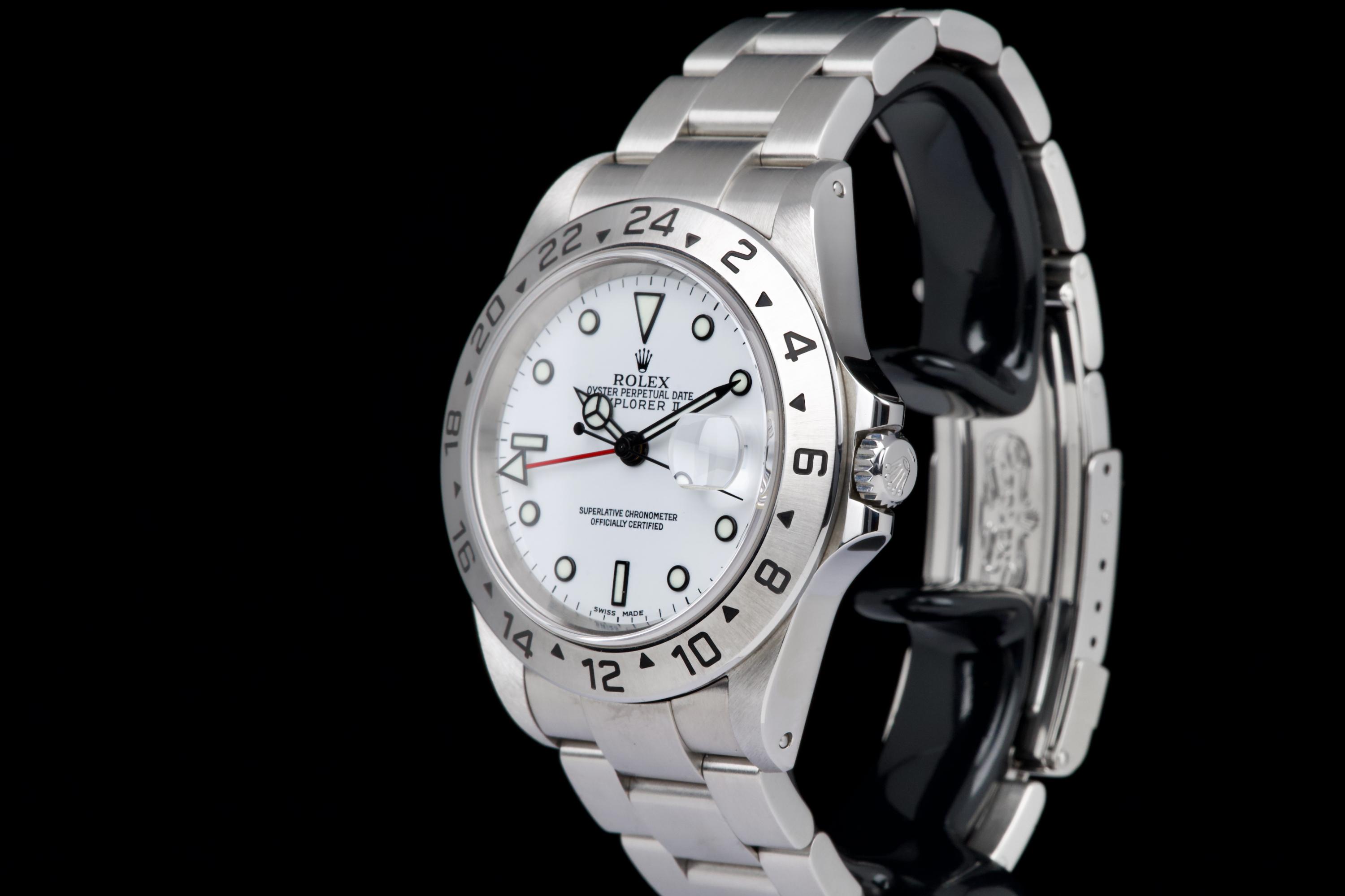 A beautiful example of the Rolex Explorer II “Polar”, featuring the bright white Luminova dial, confirmed as original on the accompanying papers. The watch has been recently polished and is presented in excellent overall condition, showing extremely light wear from use. The stainless steel bezel retains its original factory brushing, and the case remains sharp and clean. Fitted with the Oyster bracelet reference 78790A with solid endlinks, claspcode DE2, and showing very light stretch only. The movement has been serviced by our watchmaker and runs perfectly. Complete with its full 2001 set, including box, warranty papers, and booklets. A superb and crisp example of the classic Explorer II “Polar” — timeless, versatile, and ready to wear.