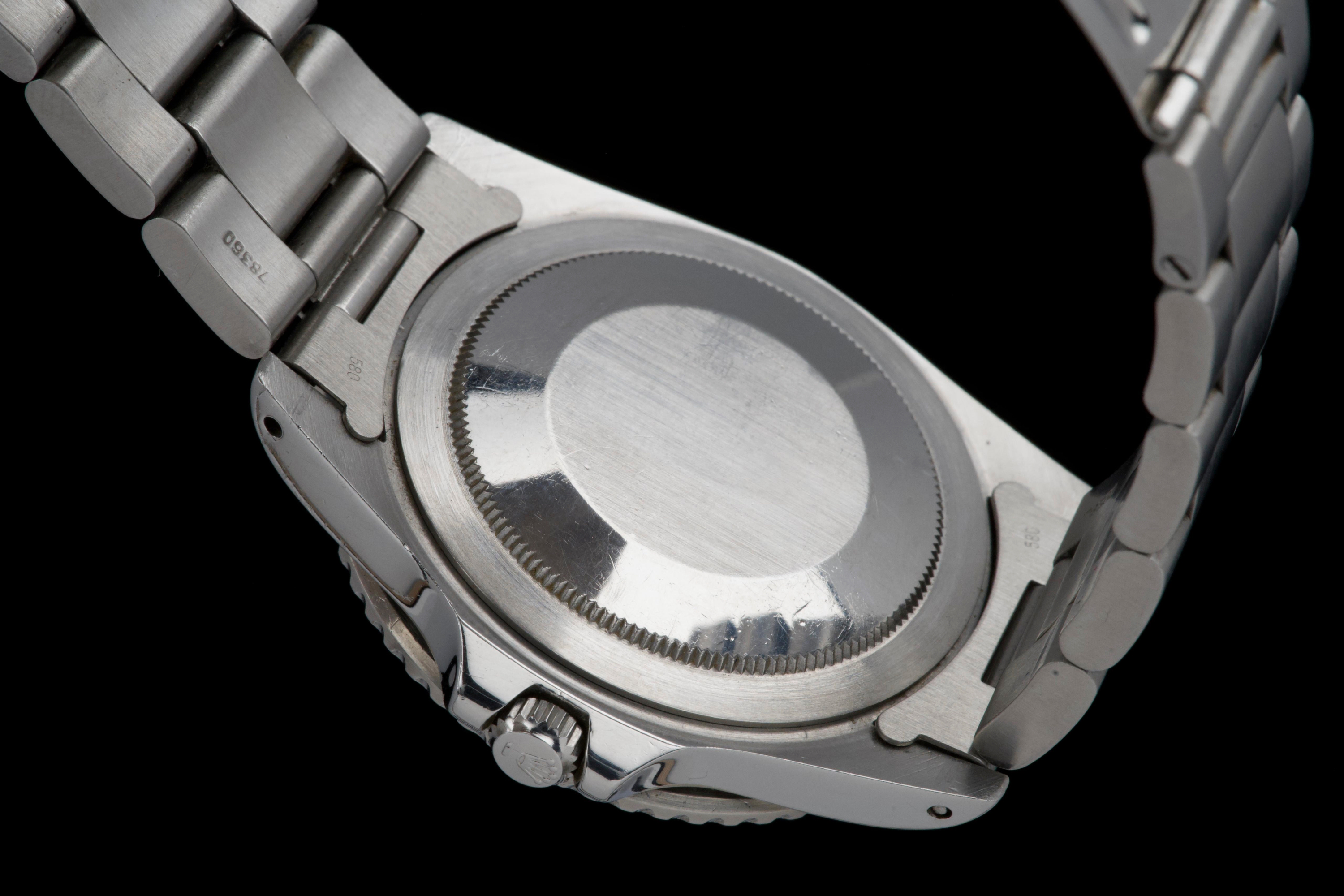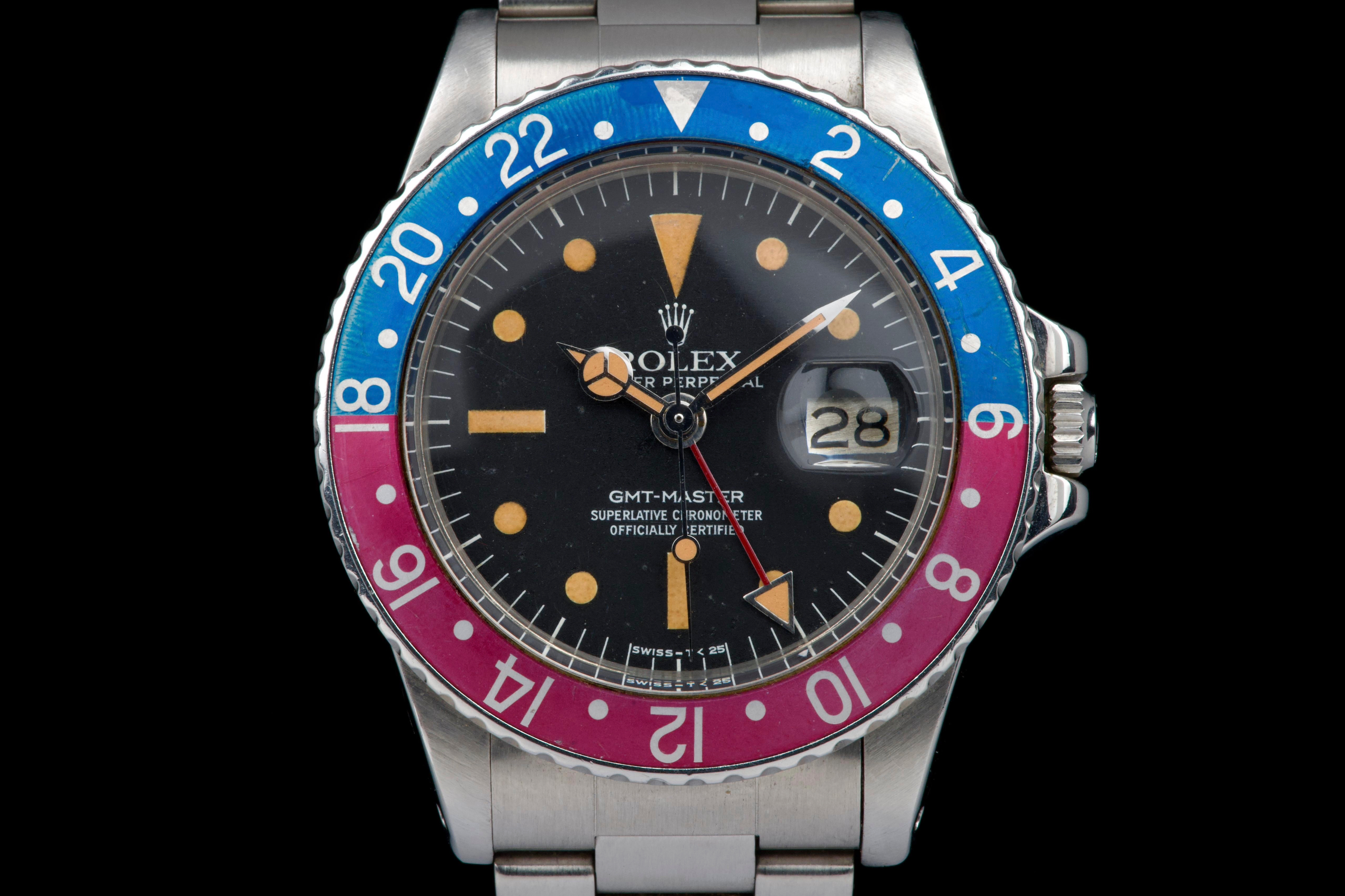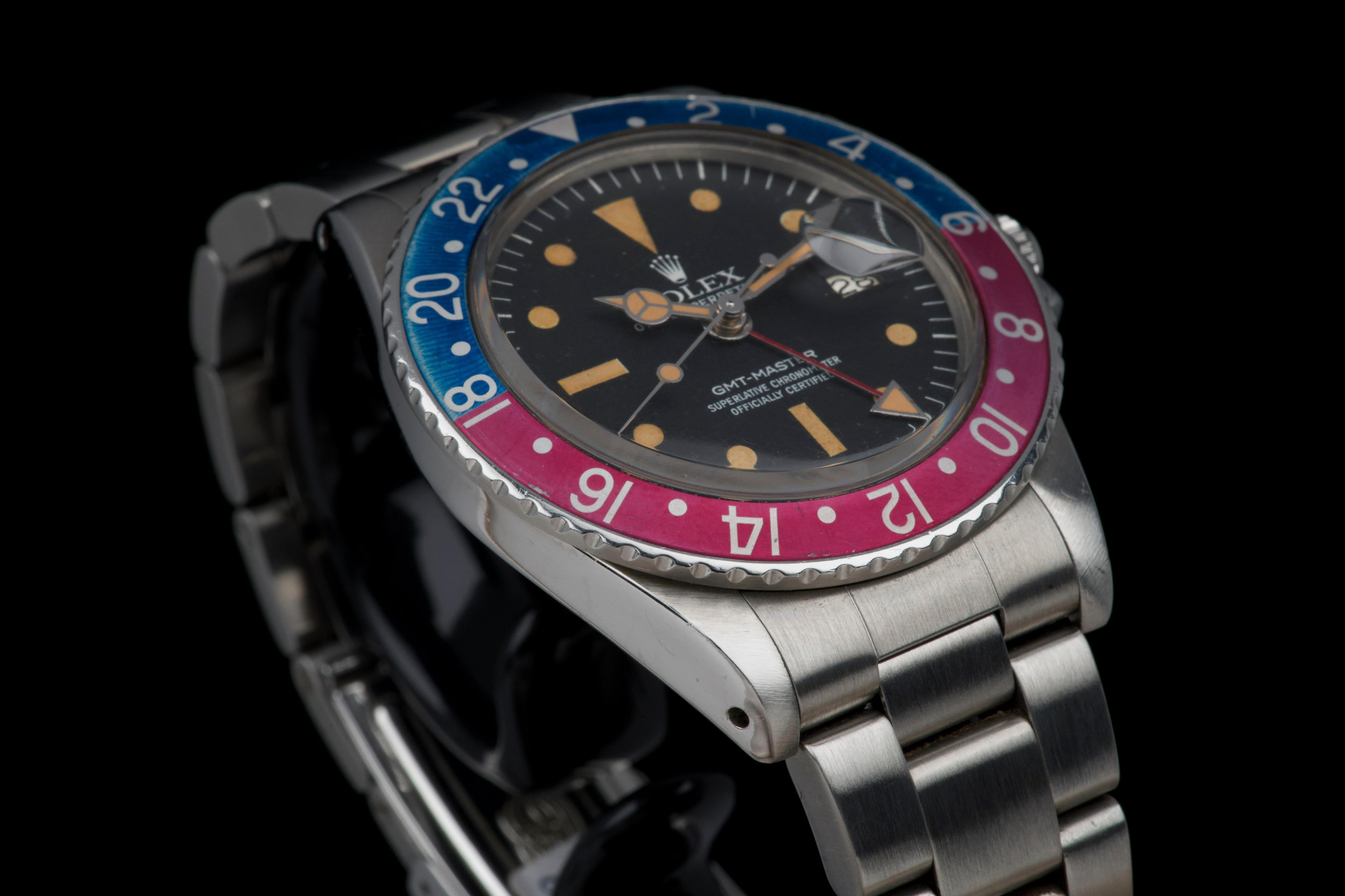 Presented here is a well-preserved and highly appealing example of the Rolex GMT-Master reference 1675, featuring the sought-after “Pepsi” bezel and dating to 1978, with a serial number in the 5.747.xxx range. The case has been polished in the past and today shows light wear consistent with use, while retaining well-defined proportions and crisp, clearly legible reference and serial numbers between the lugs. The caseback is correctly stamped 1675. The watch is distinguished by its rare MK3 radial dial, displaying an attractive “pumpkin” patina across the tritium hour markers and perfectly matching hands. The dial surface shows minor surface spotting, a characteristic commonly observed on radial dials from this period and appreciated by collectors as an authentic sign of age. The original Pepsi bezel insert presents with gentle fading, the red portion having shifted subtly toward a fuchsia tone, adding further vintage character. The watch is fitted with a slightly later Oyster bracelet, reference 78360 with correct 580 end links, showing only very light stretch. With no recorded service history, the movement is nonetheless in perfect working condition. A correct and characterful example of the classic GMT-Master 1675, combining a rare dial configuration, honest wear, and strong overall presentation, appealing to collectors of vintage Rolex sports models.