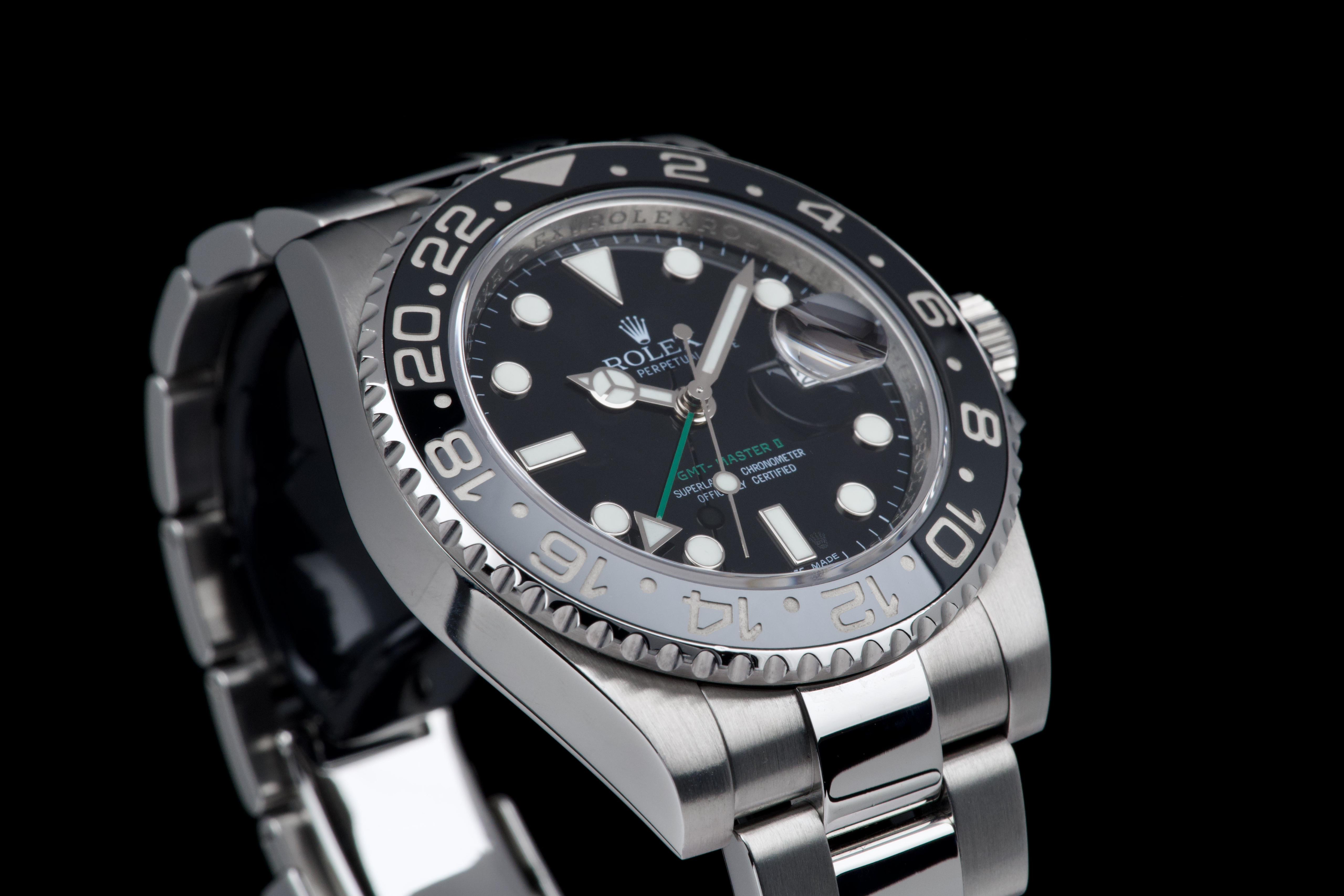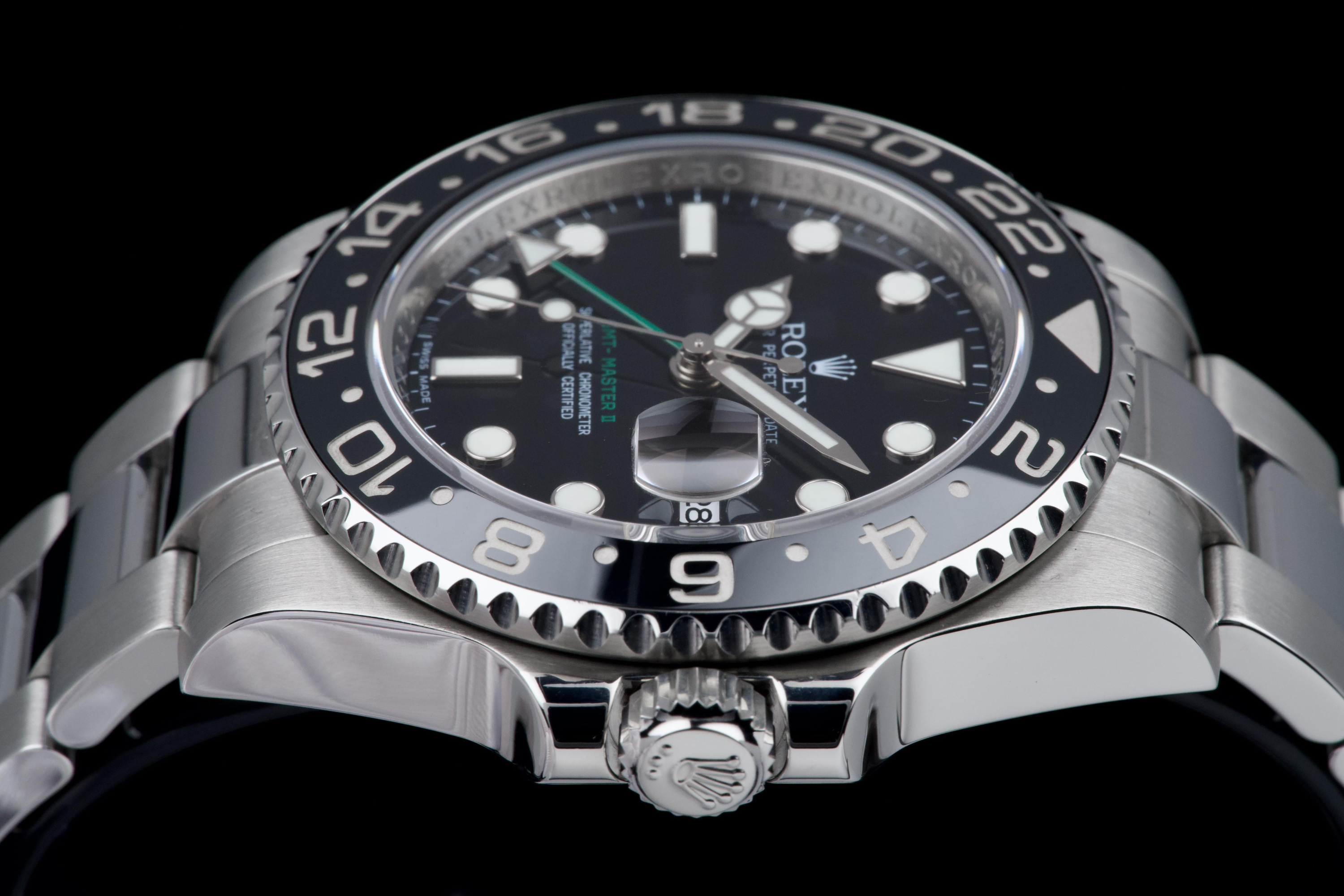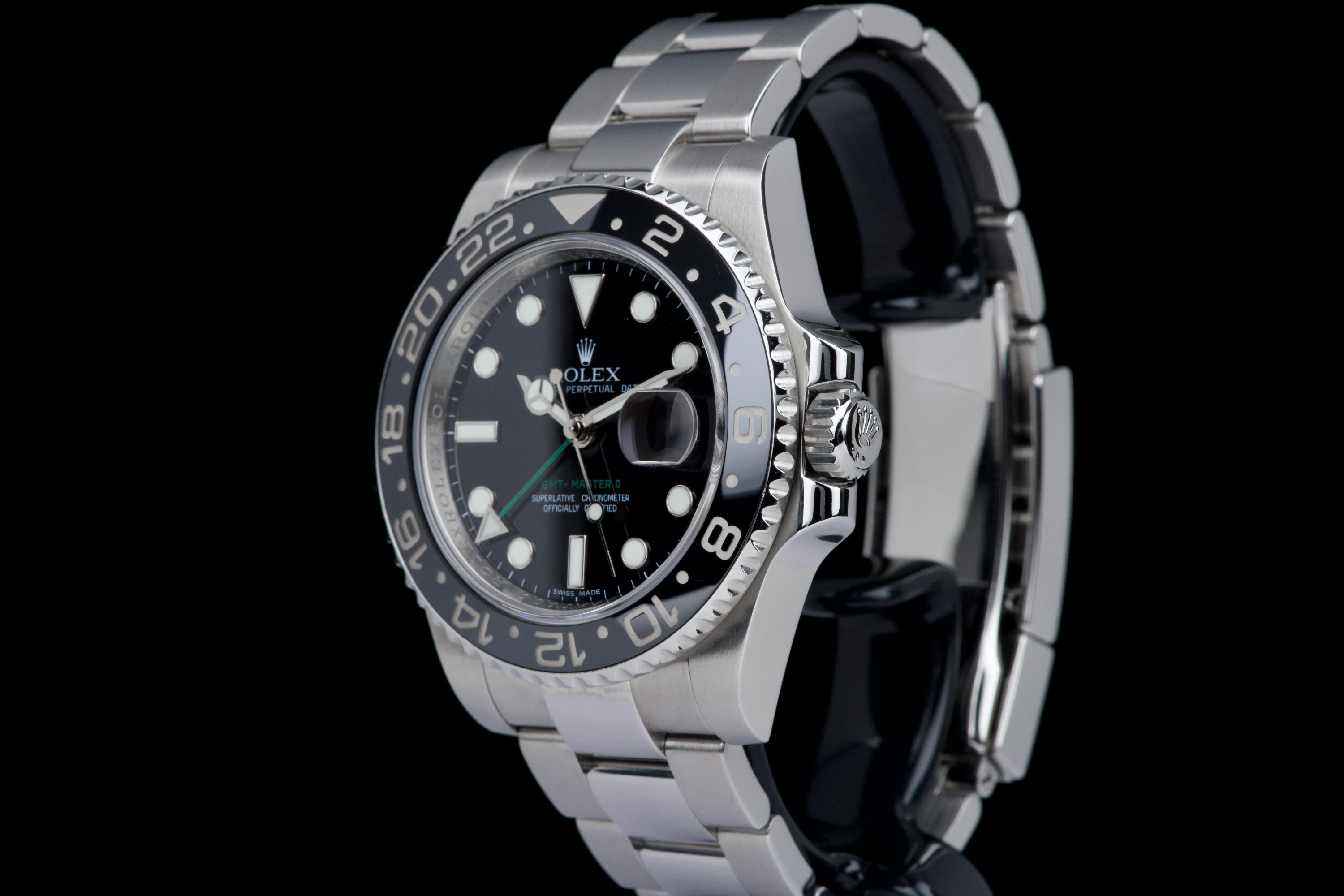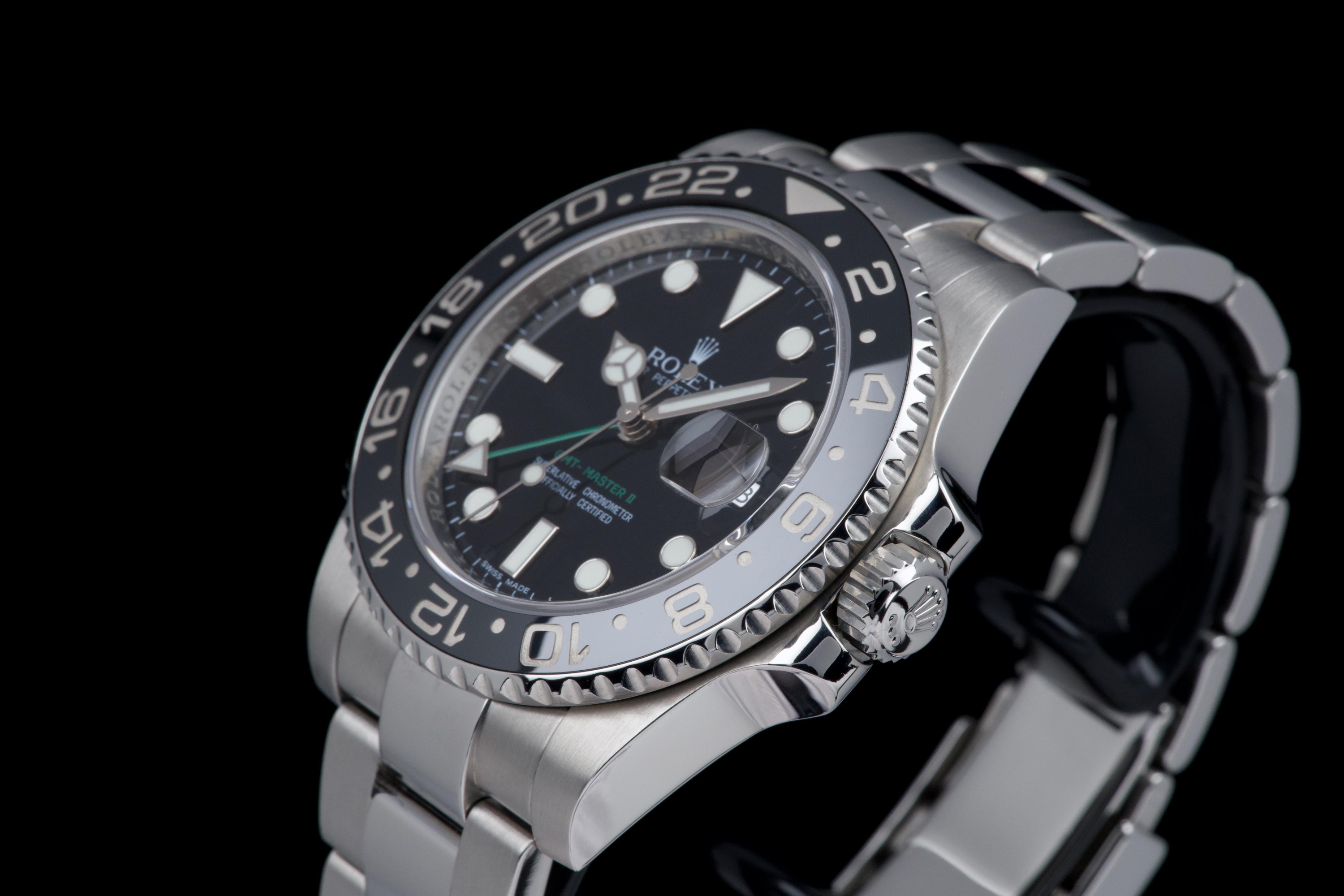 Rolex GMT-Master II, reference 116710LN, stainless steel wristwatch with date, black Cerachrom bezel and bracelet, full set, circa 2009. An iconic travel watch from Rolex’s professional line, the present GMT-Master II reference 116710LN is offered in excellent condition and accompanied by its original accessories. Produced in 2009, the model features the classic black dial paired with a black Cerachrom bezel insert, a highly durable ceramic material resistant to scratches and fading. The watch is housed in a 40 mm stainless steel Oyster case with crown guards and a Triplock screw-down crown, ensuring robustness and water resistance suitable for everyday wear. The black dial is fitted with applied luminous hour markers and Mercedes hands, complemented by the characteristic green 24-hour hand allowing the wearer to track a second time zone. A sapphire crystal with Cyclops magnifier is positioned above the date aperture at 3 o’clock. Powering the watch is Rolex’s reliable automatic GMT movement, designed for precision and practicality when travelling, with an independently adjustable local hour hand. The watch is presented on its original stainless steel Oyster bracelet with Oysterlock clasp. It was fully serviced and carefully polished by Rolex in 2026, ensuring excellent mechanical performance and a very attractive overall presentation. Originally sold in 2009, the watch is offered as a full set, including its original box, warranty card and accessories; however, the outer box is missing. Combining technical robustness with timeless design, this GMT-Master II 116710LN represents an excellent opportunity to acquire a well-maintained example of one of Rolex’s most recognizable modern sports watches.
