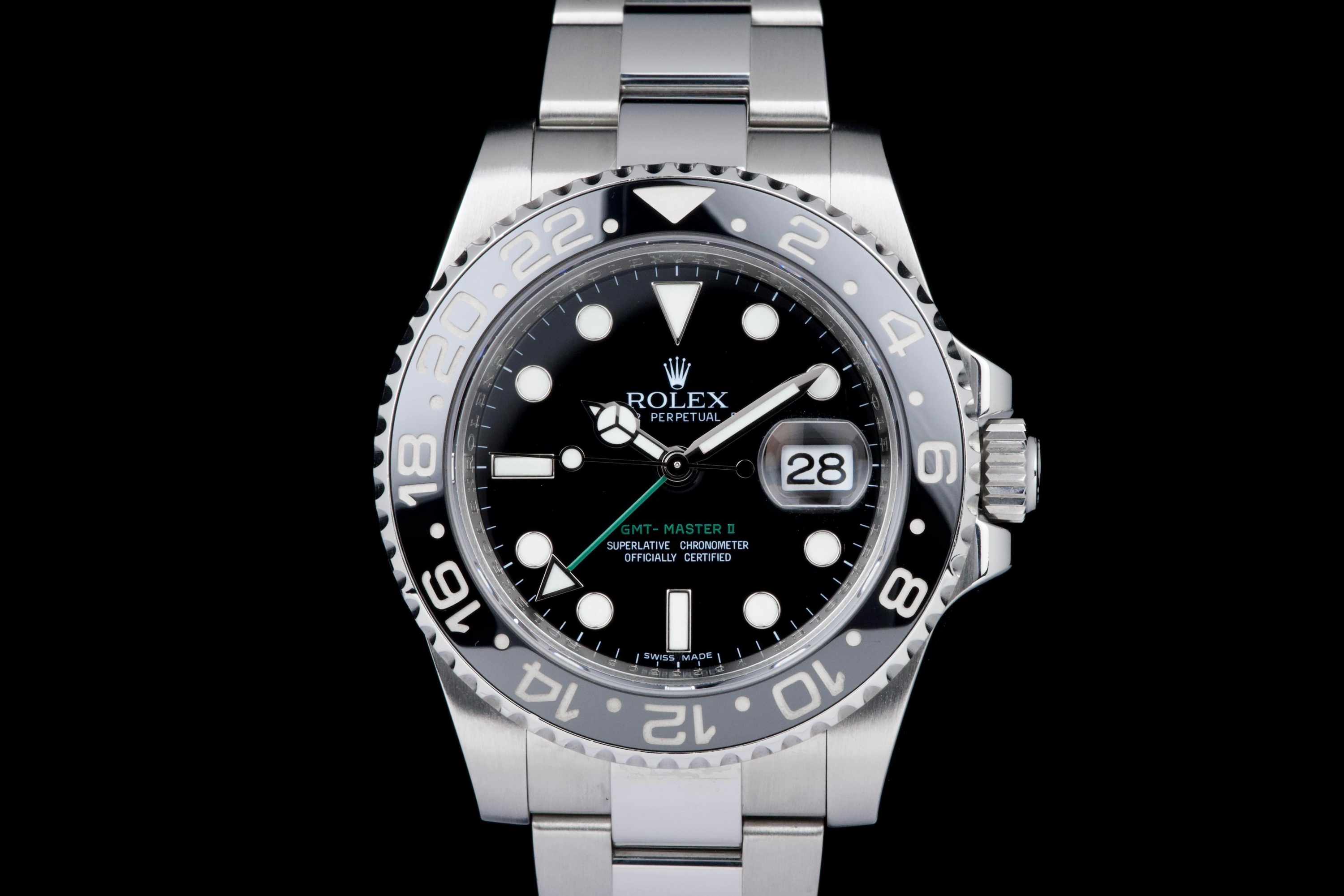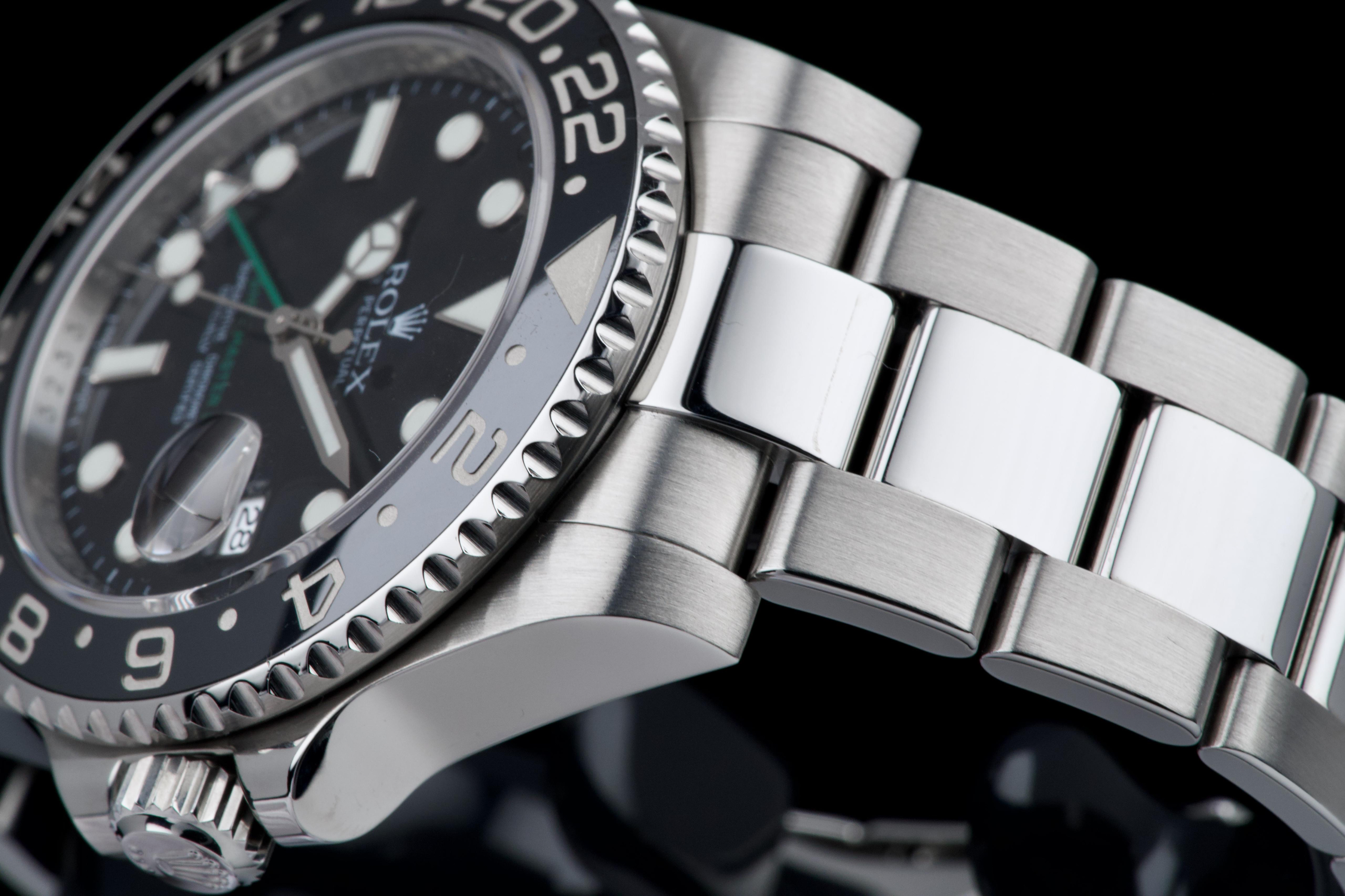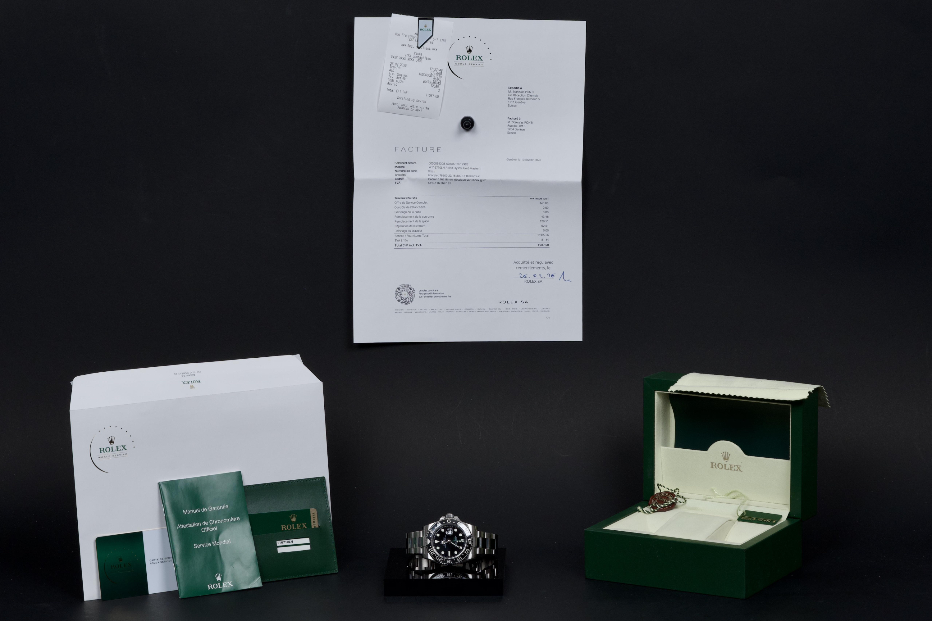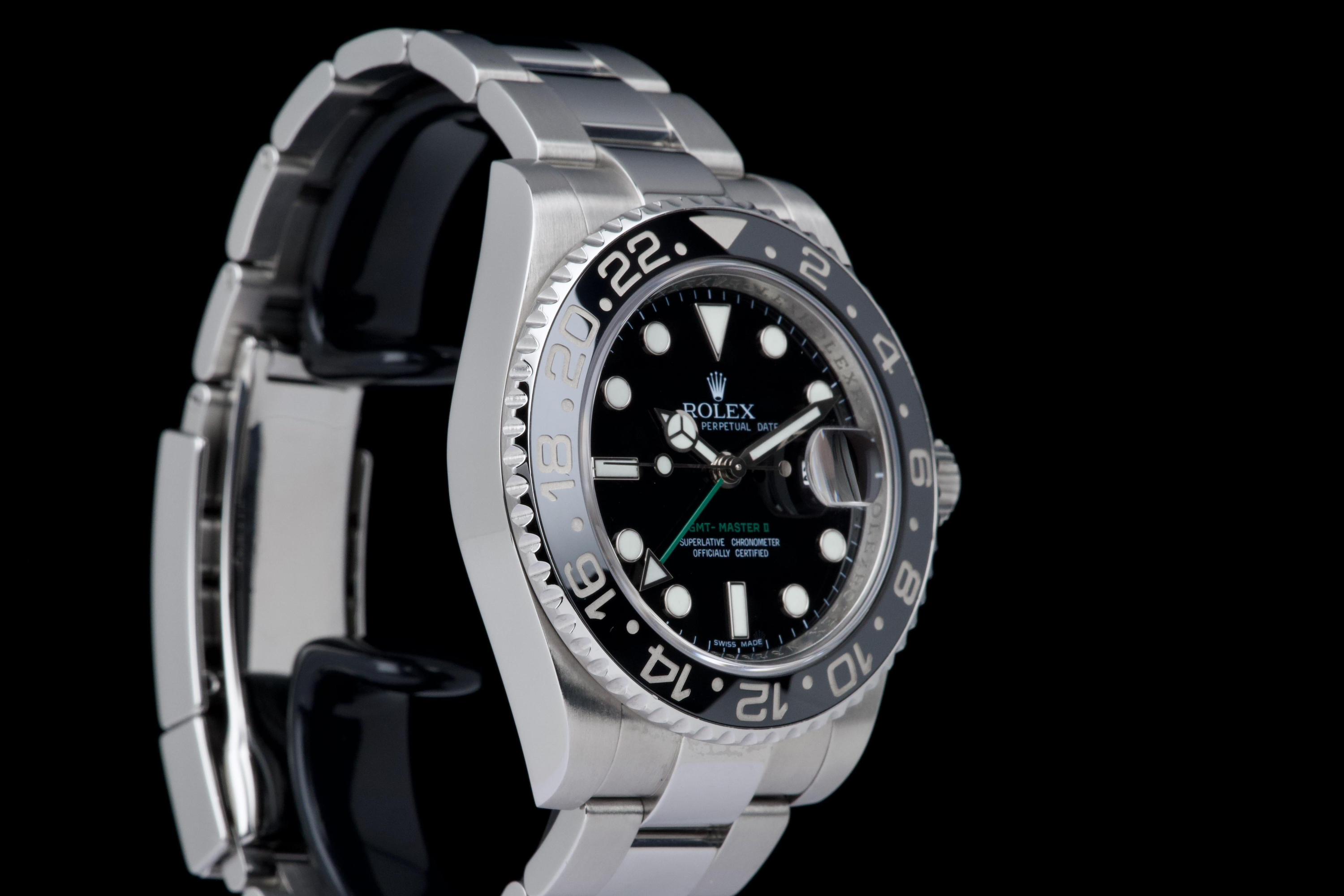 Rolex GMT-Master II, reference 116710LN, stainless steel wristwatch with date, black Cerachrom bezel and bracelet, full set, circa 2009. An iconic travel watch from Rolex’s professional line, the present GMT-Master II reference 116710LN is offered in excellent condition and accompanied by its original accessories. Produced in 2009, the model features the classic black dial paired with a black Cerachrom bezel insert, a highly durable ceramic material resistant to scratches and fading. The watch is housed in a 40 mm stainless steel Oyster case with crown guards and a Triplock screw-down crown, ensuring robustness and water resistance suitable for everyday wear. The black dial is fitted with applied luminous hour markers and Mercedes hands, complemented by the characteristic green 24-hour hand allowing the wearer to track a second time zone. A sapphire crystal with Cyclops magnifier is positioned above the date aperture at 3 o’clock. Powering the watch is Rolex’s reliable automatic GMT movement, designed for precision and practicality when travelling, with an independently adjustable local hour hand. The watch is presented on its original stainless steel Oyster bracelet with Oysterlock clasp. It was fully serviced and carefully polished by Rolex in 2026, ensuring excellent mechanical performance and a very attractive overall presentation. Originally sold in 2009, the watch is offered as a full set, including its original box, warranty card and accessories; however, the outer box is missing. Combining technical robustness with timeless design, this GMT-Master II 116710LN represents an excellent opportunity to acquire a well-maintained example of one of Rolex’s most recognizable modern sports watches.