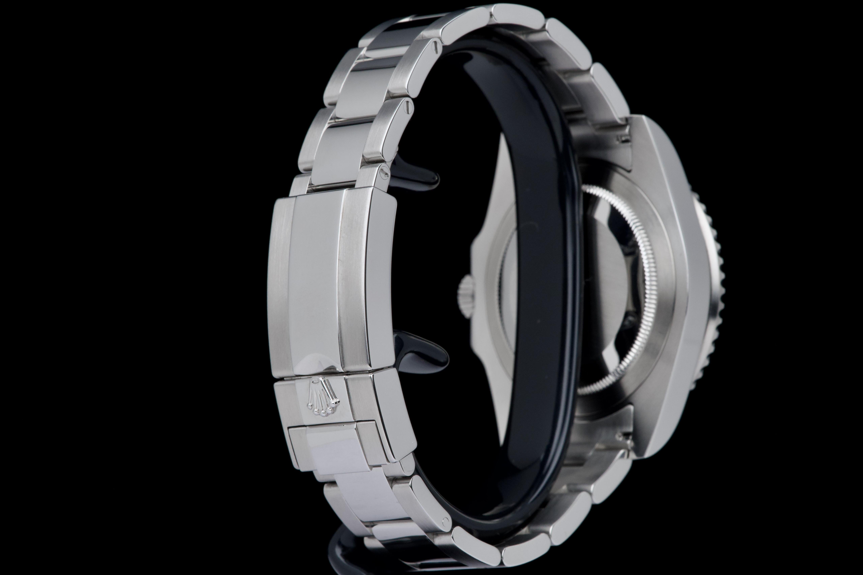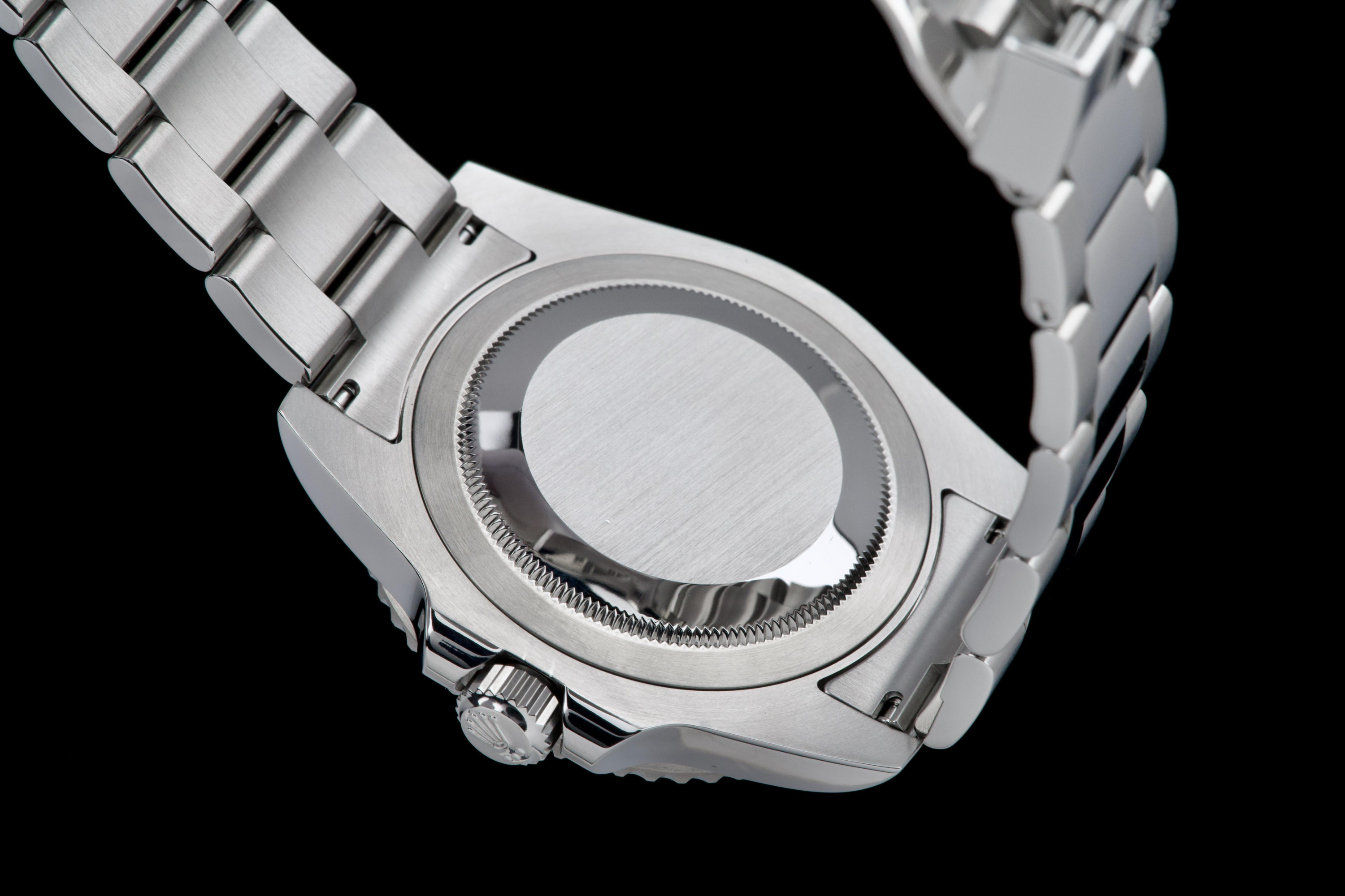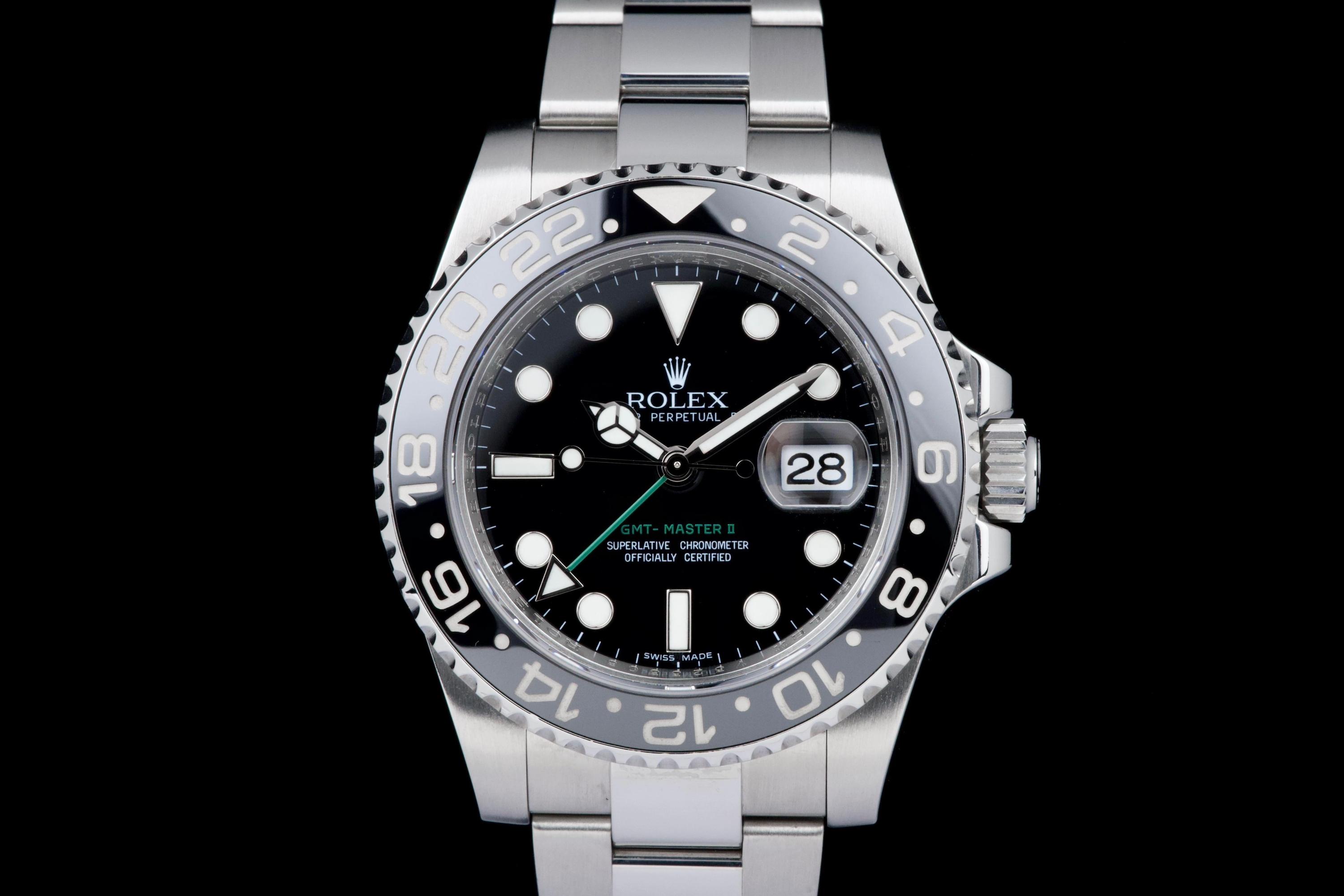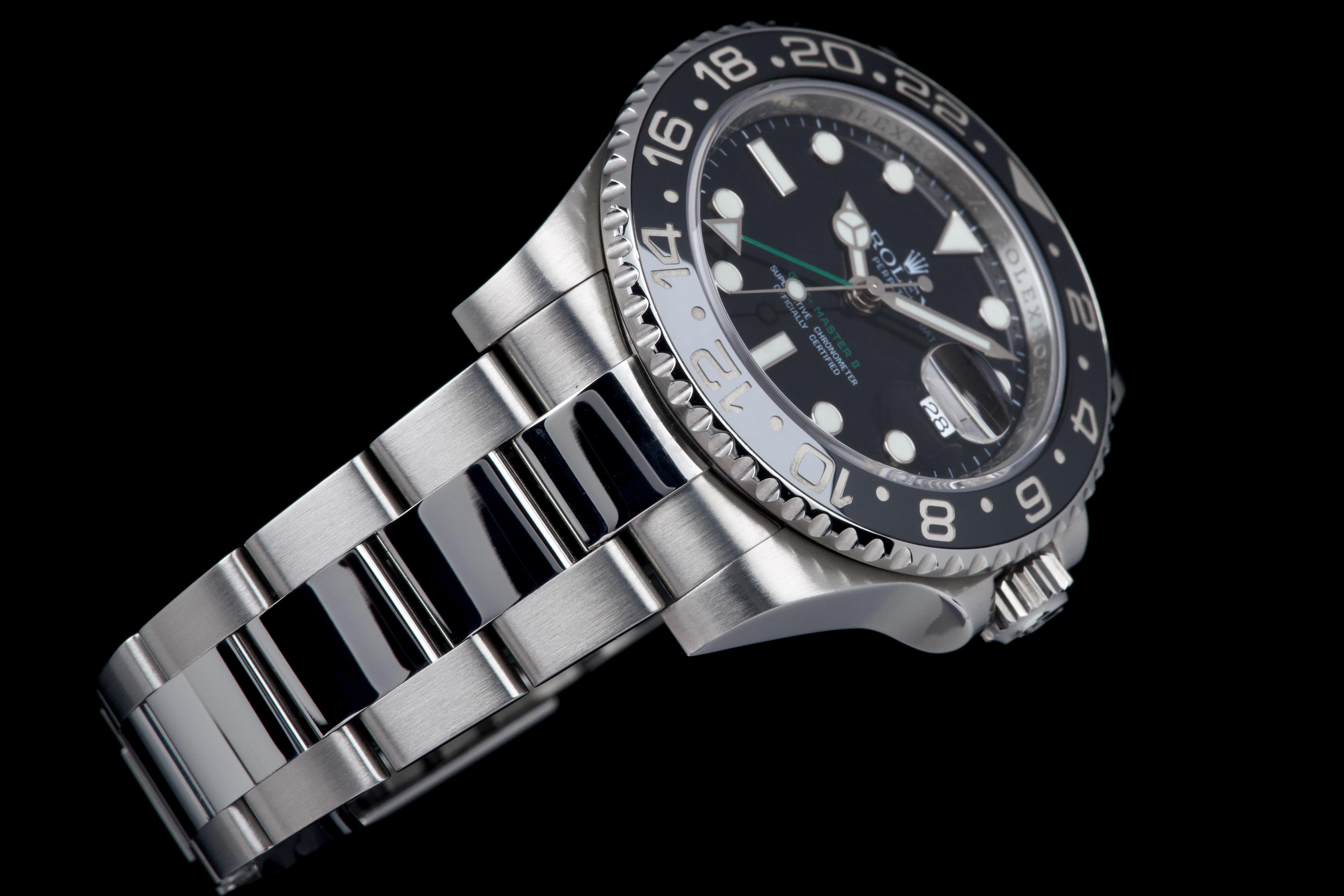Rolex GMT-Master II, reference 116710LN, stainless steel wristwatch with date, black Cerachrom bezel and bracelet, full set, circa 2009. An iconic travel watch from Rolex’s professional line, the present GMT-Master II reference 116710LN is offered in excellent condition and accompanied by its original accessories. Produced in 2009, the model features the classic black dial paired with a black Cerachrom bezel insert, a highly durable ceramic material resistant to scratches and fading. The watch is housed in a 40 mm stainless steel Oyster case with crown guards and a Triplock screw-down crown, ensuring robustness and water resistance suitable for everyday wear. The black dial is fitted with applied luminous hour markers and Mercedes hands, complemented by the characteristic green 24-hour hand allowing the wearer to track a second time zone. A sapphire crystal with Cyclops magnifier is positioned above the date aperture at 3 o’clock. Powering the watch is Rolex’s reliable automatic GMT movement, designed for precision and practicality when travelling, with an independently adjustable local hour hand. The watch is presented on its original stainless steel Oyster bracelet with Oysterlock clasp. It was fully serviced and carefully polished by Rolex in 2026, ensuring excellent mechanical performance and a very attractive overall presentation. Originally sold in 2009, the watch is offered as a full set, including its original box, warranty card and accessories; however, the outer box is missing. Combining technical robustness with timeless design, this GMT-Master II 116710LN represents an excellent opportunity to acquire a well-maintained example of one of Rolex’s most recognizable modern sports watches.
