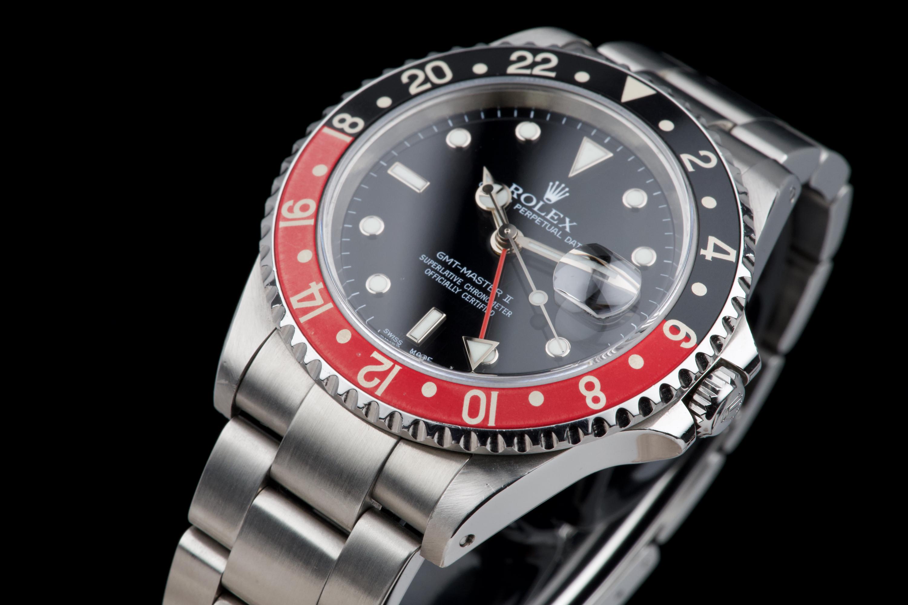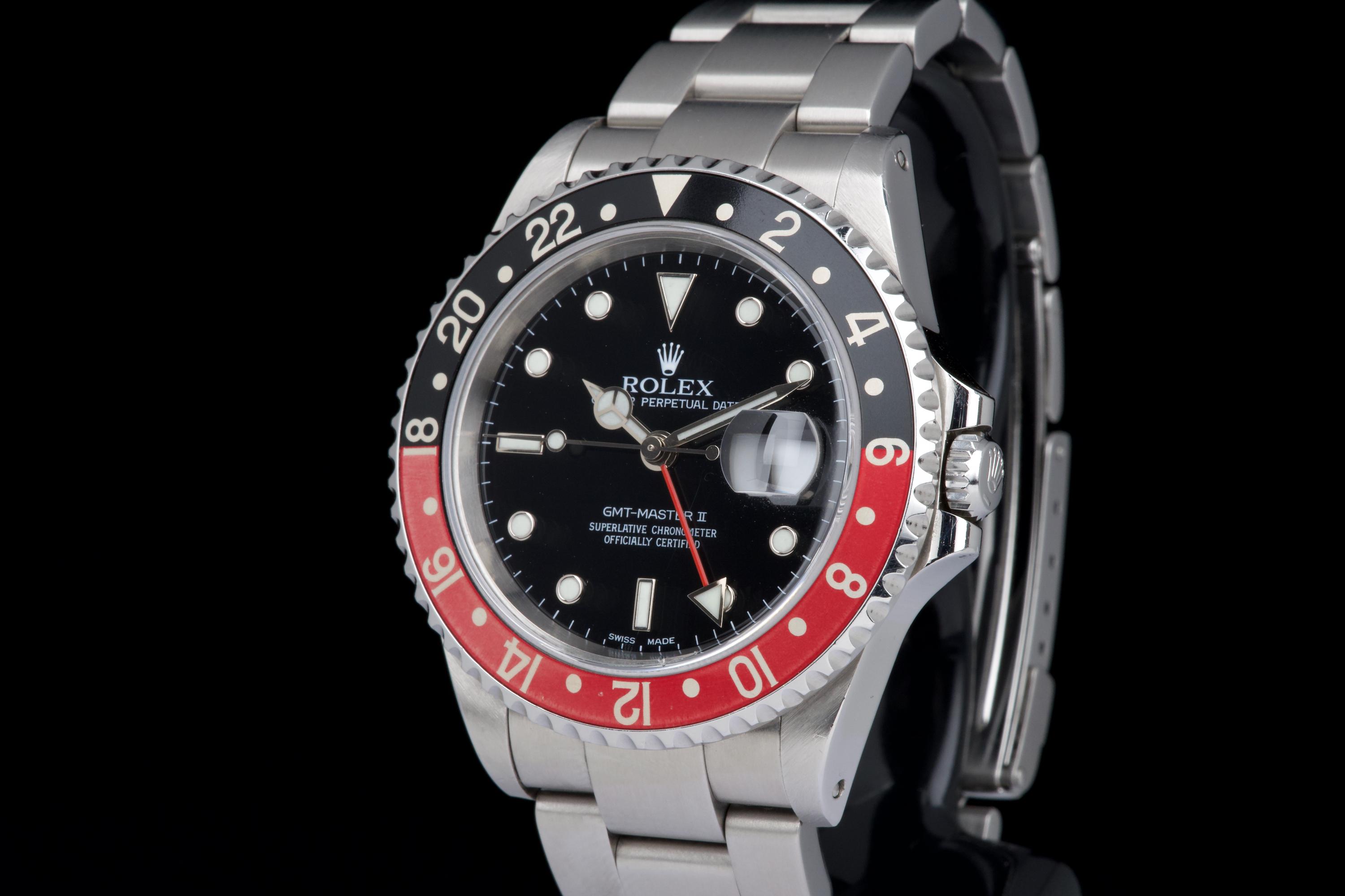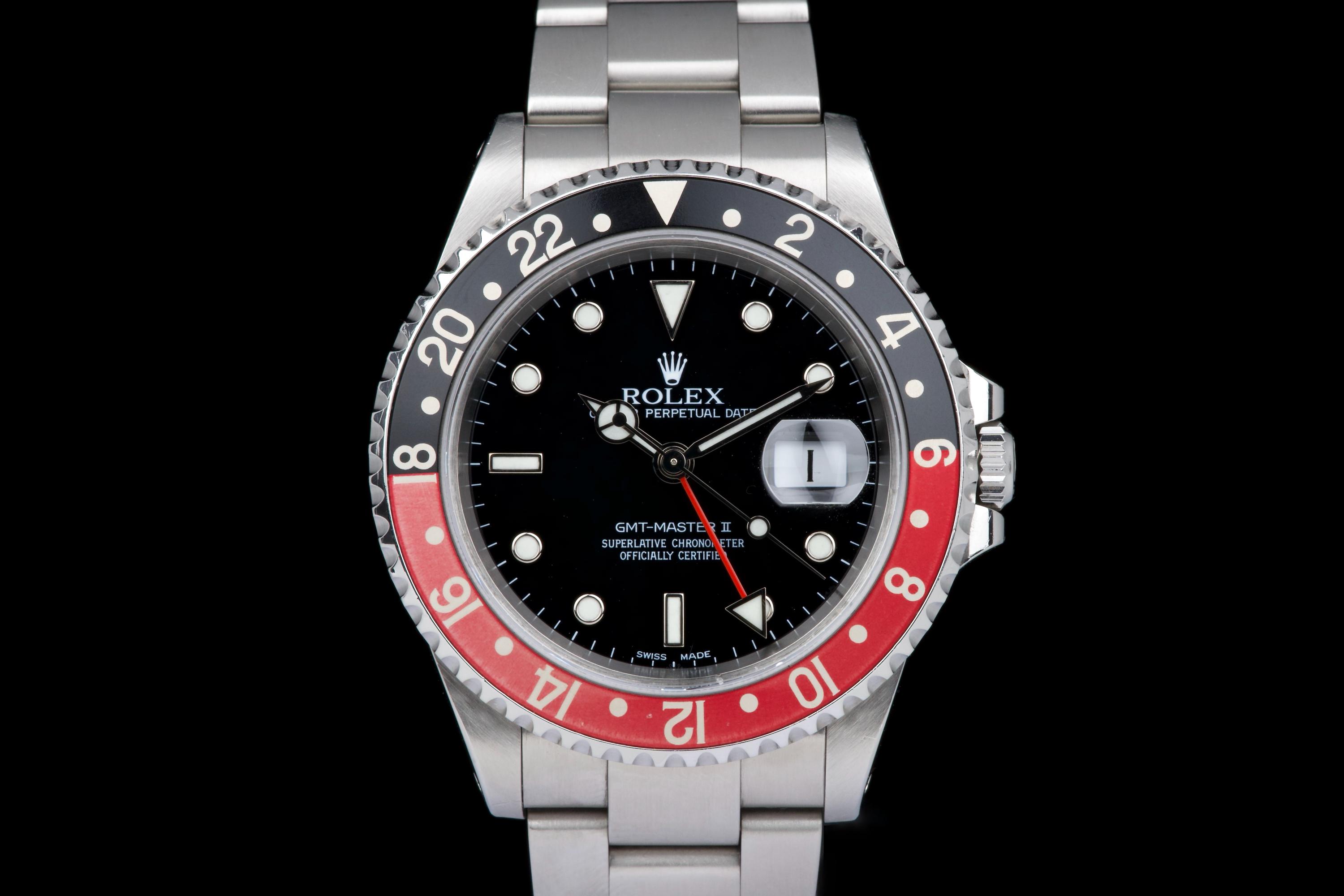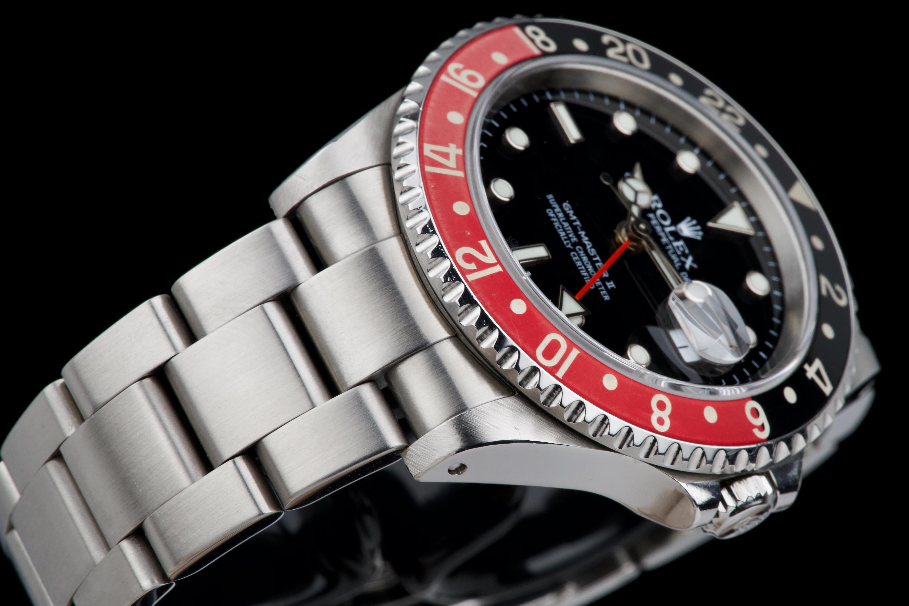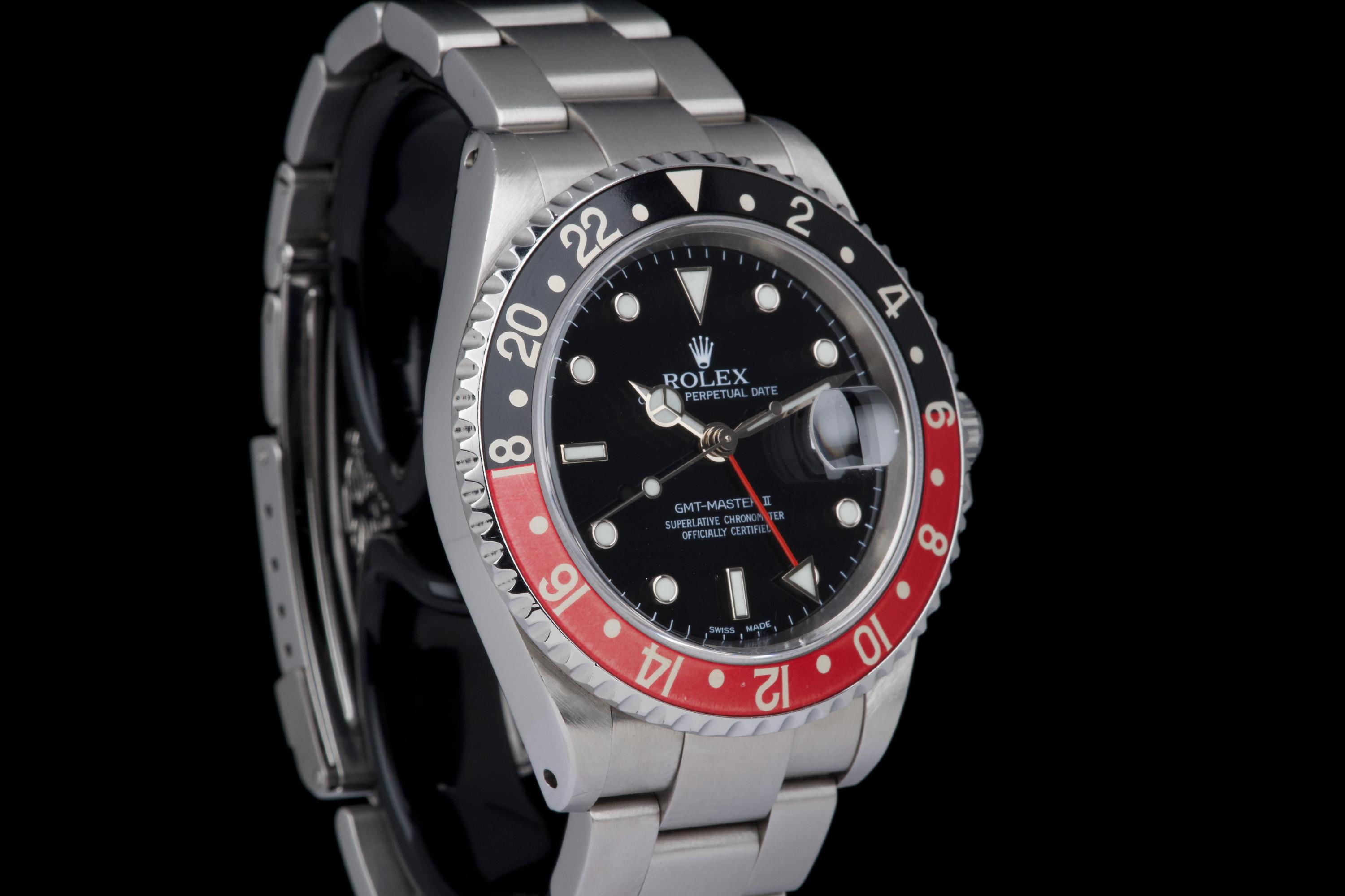 A beautiful example of the classic GMT-Master II “Coke” K Serial featuring the black dial and red/black bezel insert. The stainless steel case has been polished in the past but remains thick with strong proportions. It shows light wear with a few minor scratches and dings, nothing out of the ordinary for a watch of this age. The glossy black luminova dial is in perfect condition with matching hands. The steel bezel is excellent, and the original serif “Coke” insert shows a pleasing light fade, giving it a very attractive vintage look. The original Oyster bracelet 78790A with solid end-links (claspcode DT7) shows minimal stretch and remains tight and crisp. The movement has just been fully serviced and authenticated by our watchmaker. The watch is offered without its original box and papers. A strong example of the now discontinued GMT-Master II 16710 “Coke,” combining a clean case, excellent dial, and a beautiful lightly faded insert — a highly collectible modern classic.