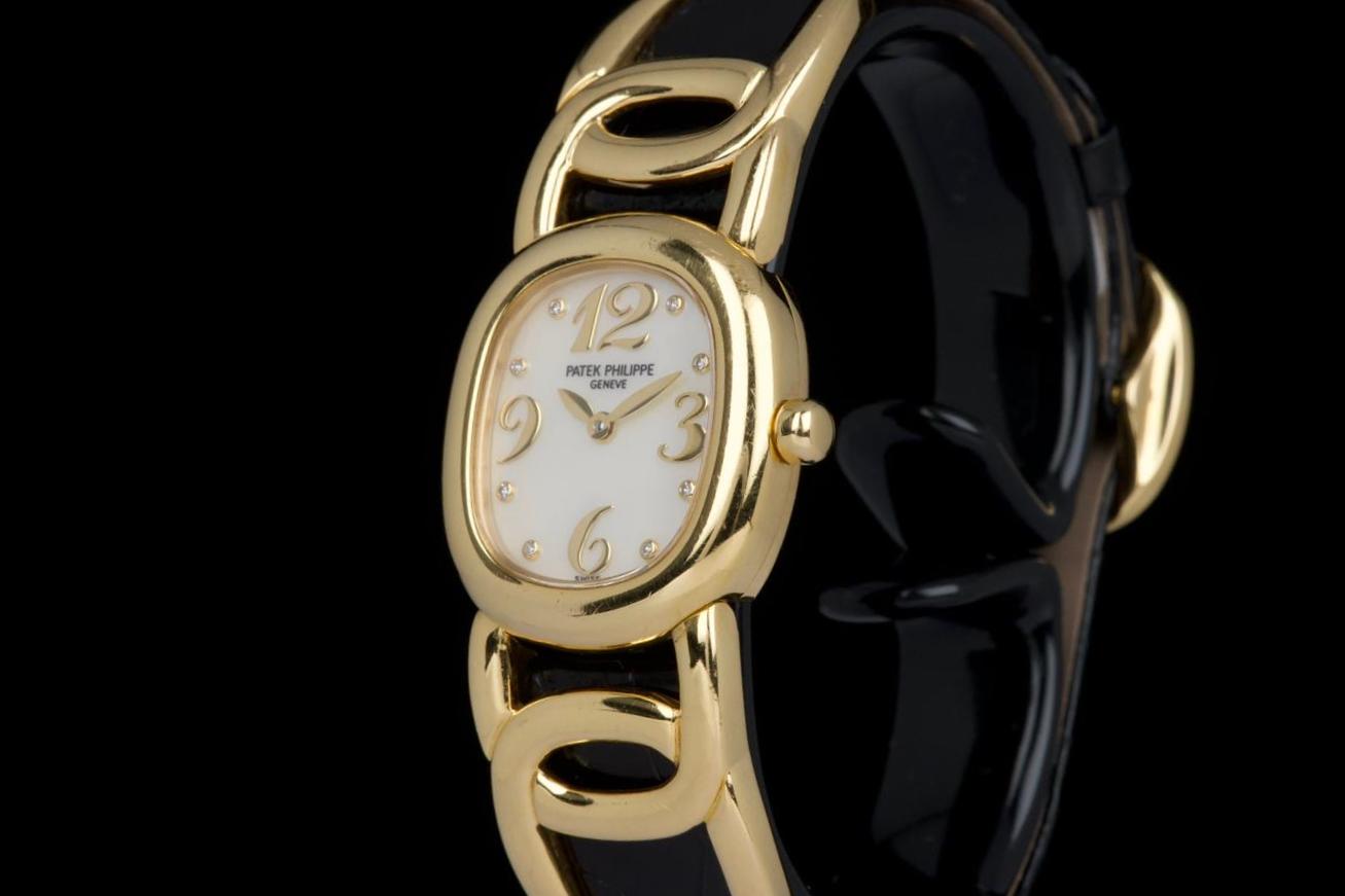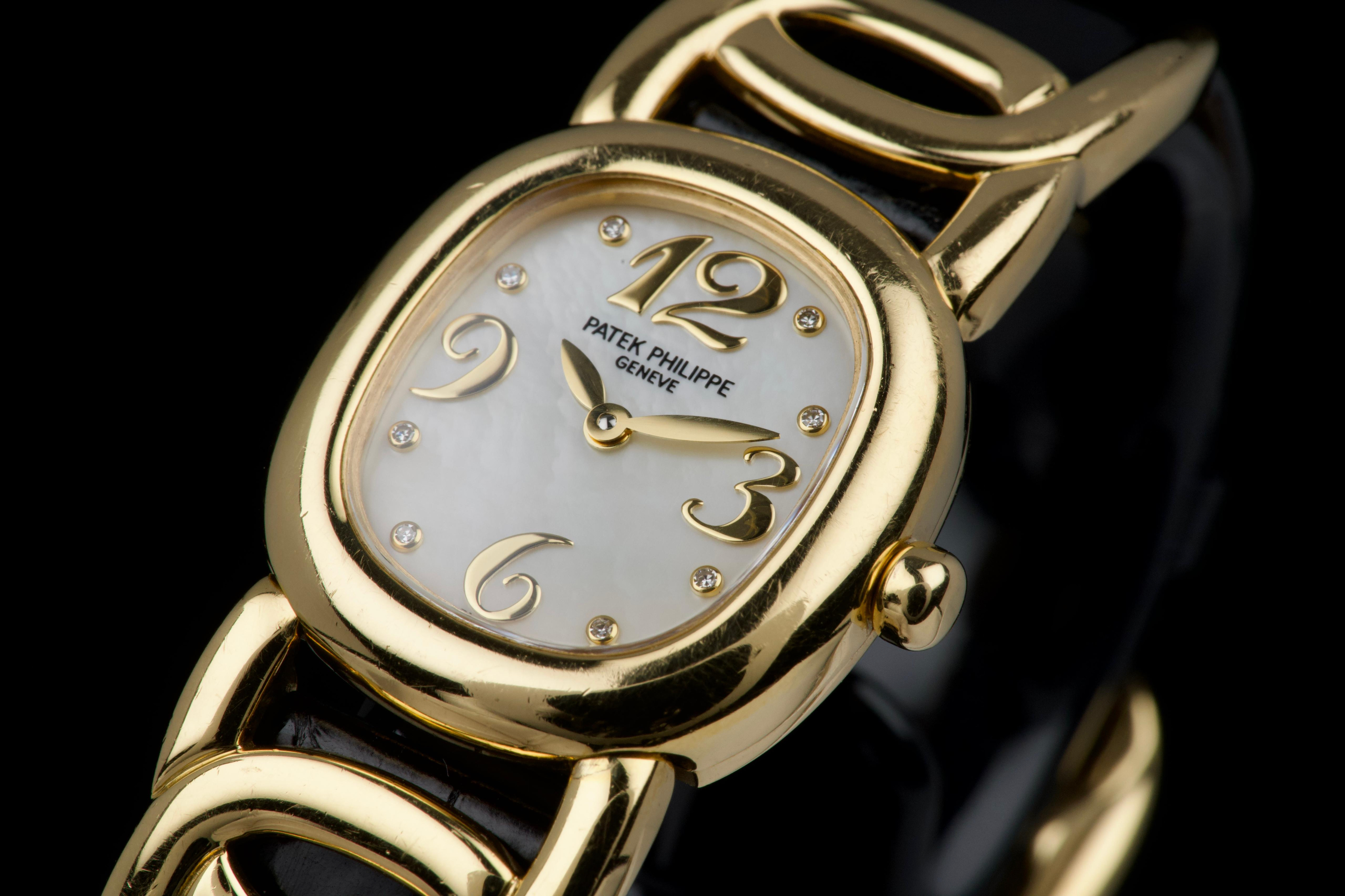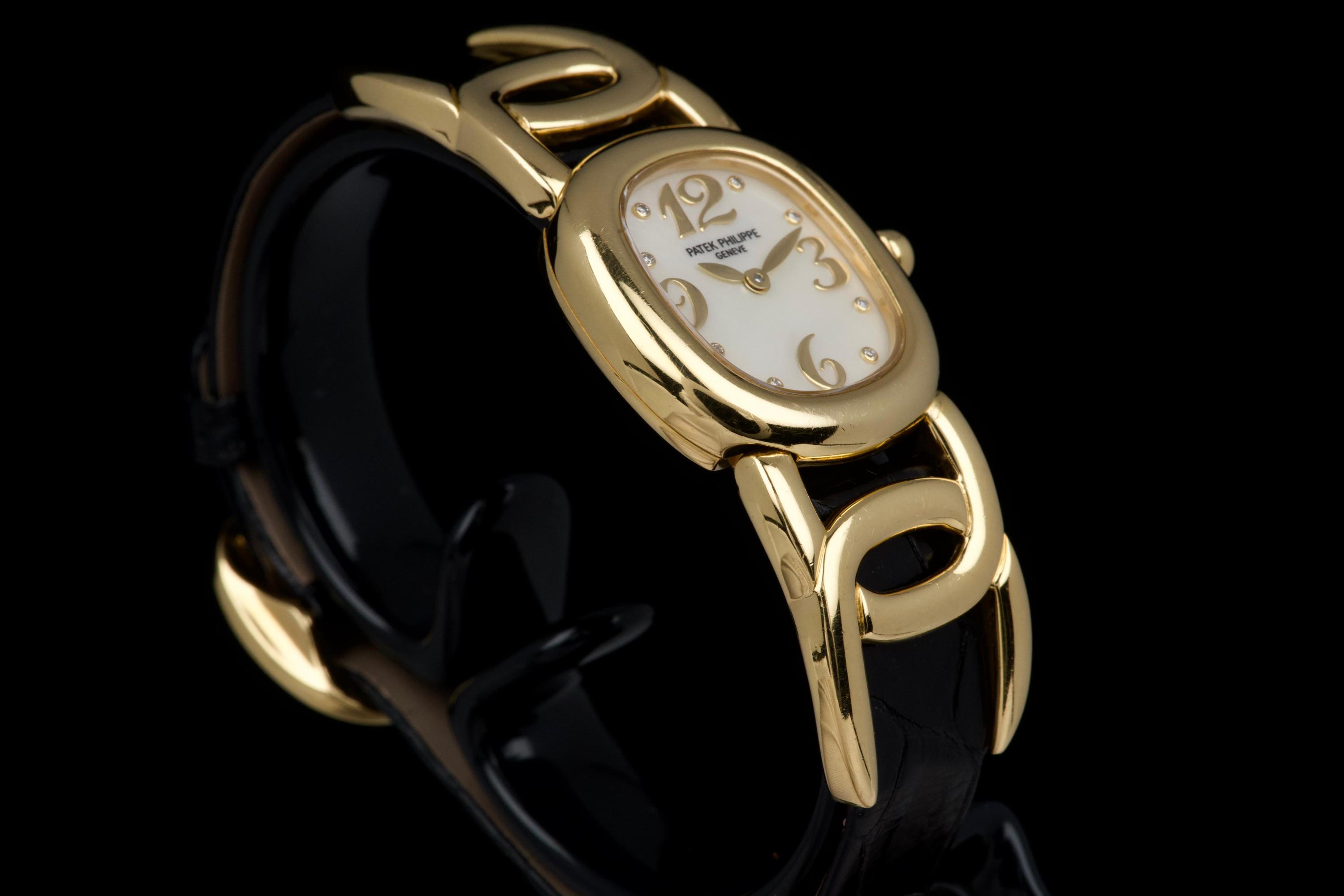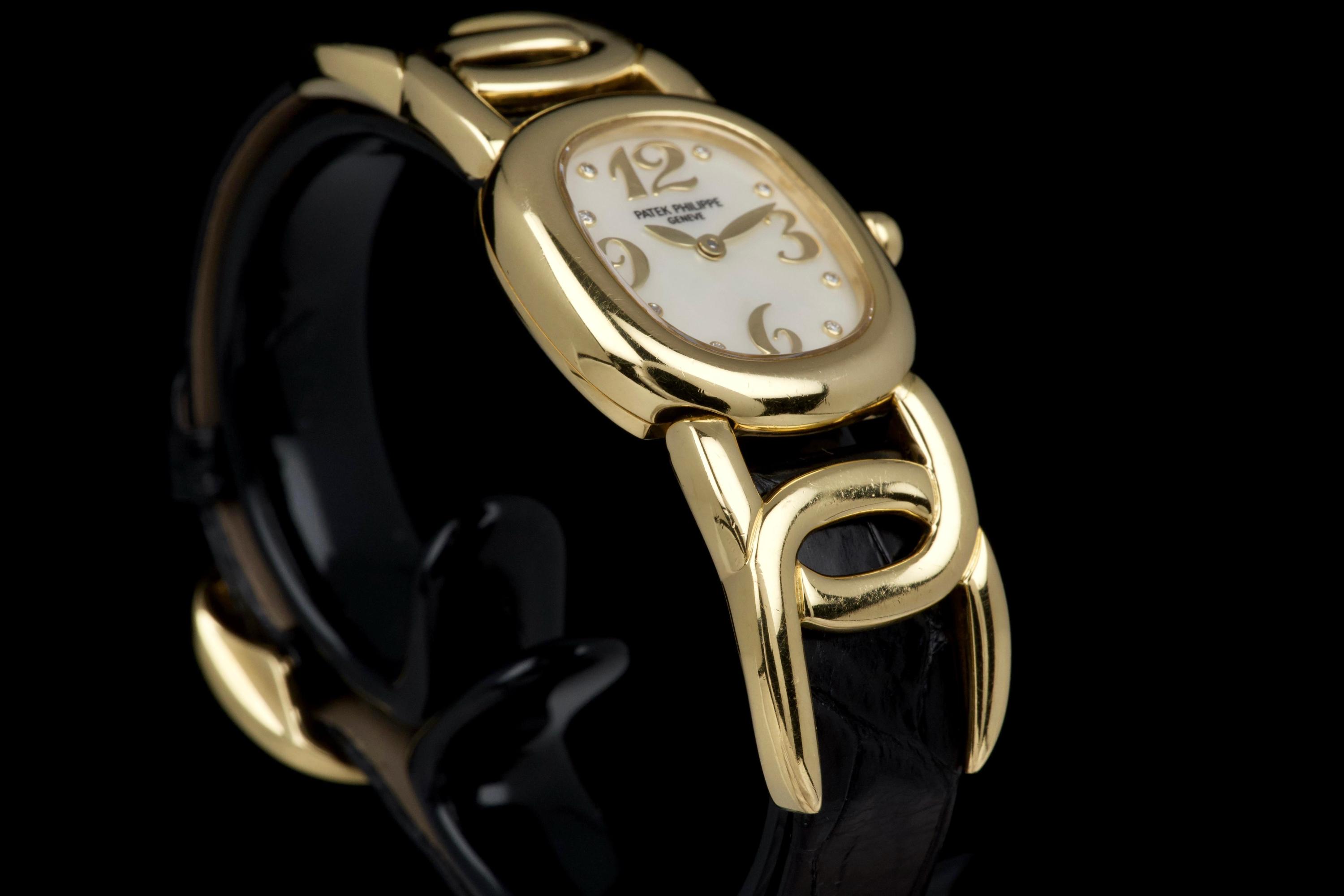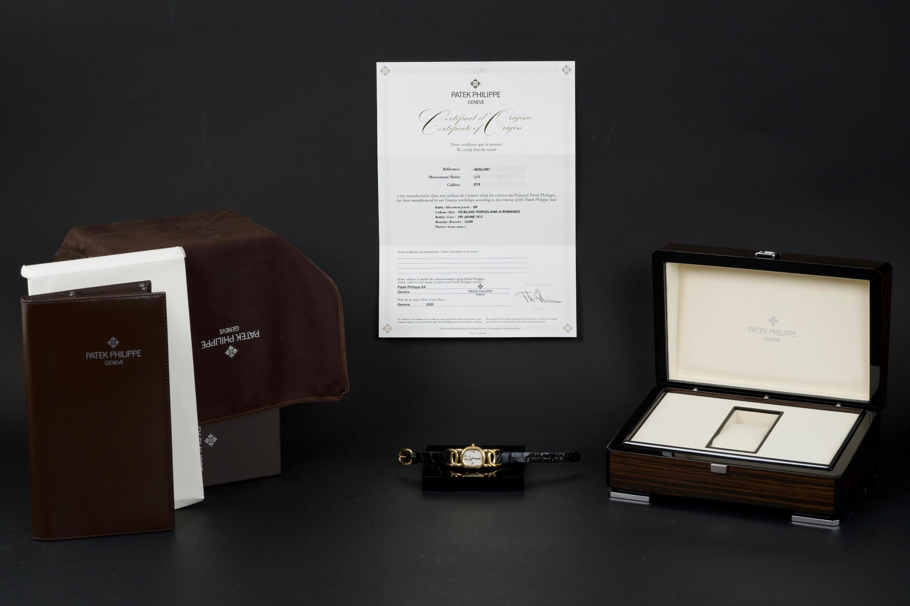 The present Patek Philippe Golden Ellipse reference 4830J, featuring a mother-of-pearl dial, is offered as a complete full set and presents a particularly interesting provenance linked to the manufacture itself. Originally produced in 2001, the watch was used as a presentation watch for a Patek Philippe employee, reflecting the tradition within the manufacture of awarding timepieces to long-serving staff members. Upon the employee’s retirement in 2020, the watch was returned to Patek Philippe where it underwent a full service and polishing before being formally offered to the employee as a retirement gift. At the employee’s request, a mother-of-pearl dial was installed during this intervention, giving the watch a refined and elegant new aesthetic. Since then, the watch has been worn regularly for approximately three years and is now preserved in very good overall condition, showing some light surface scratches consistent with daily wear. The mother-of-pearl dial remains beautiful and vibrant, offering subtle iridescent reflections that enhance the timeless elegance of the Golden Ellipse design. The watch is powered by a quartz movement, ensuring reliability and practicality for everyday use. It is fitted with a black crocodile leather strap in excellent condition, completing the watch’s classic and refined presentation. With its distinctive dial, documented full set, and charming provenance connected to the Patek Philippe manufacture itself, this Golden Ellipse 4830J represents a particularly appealing and meaningful example of one of the brand’s most iconic dress watch designs.