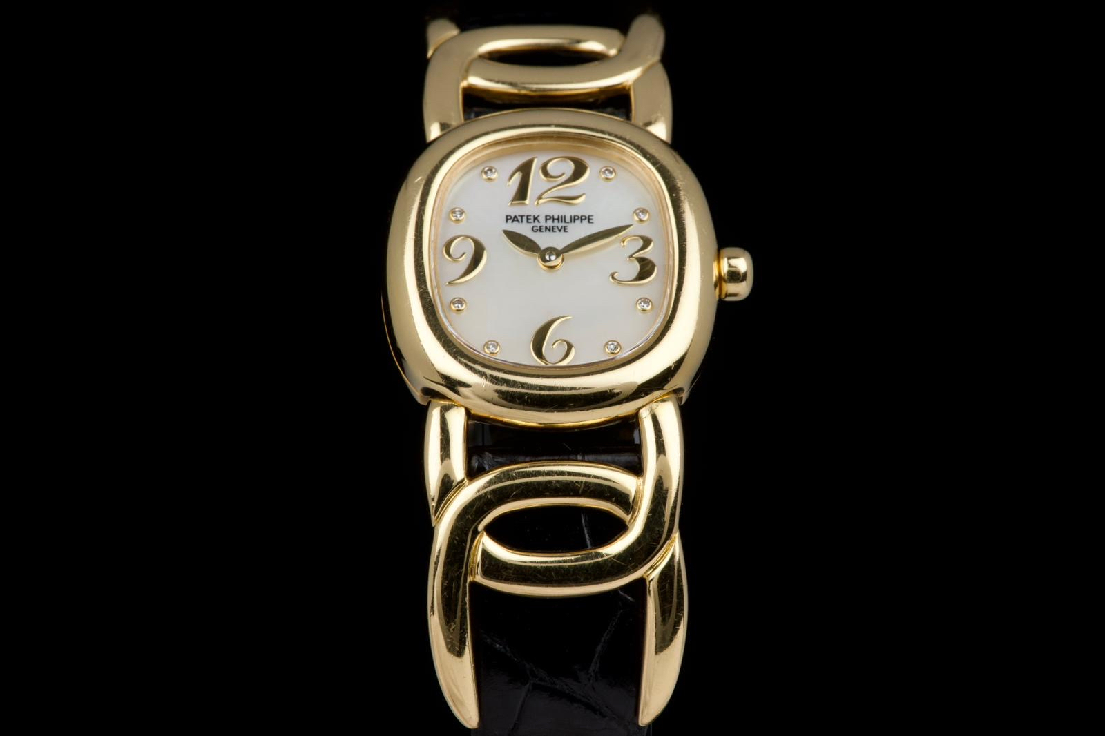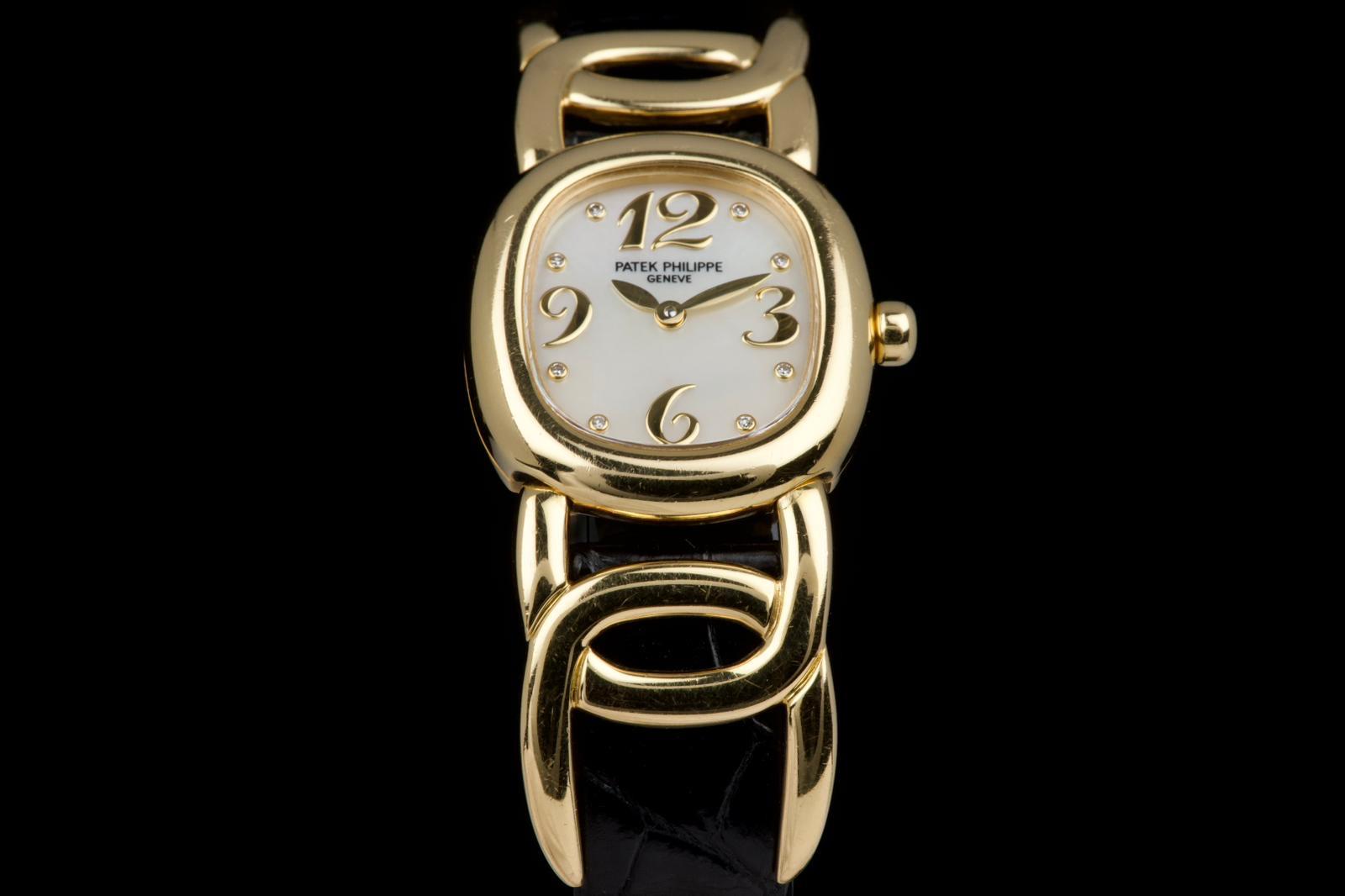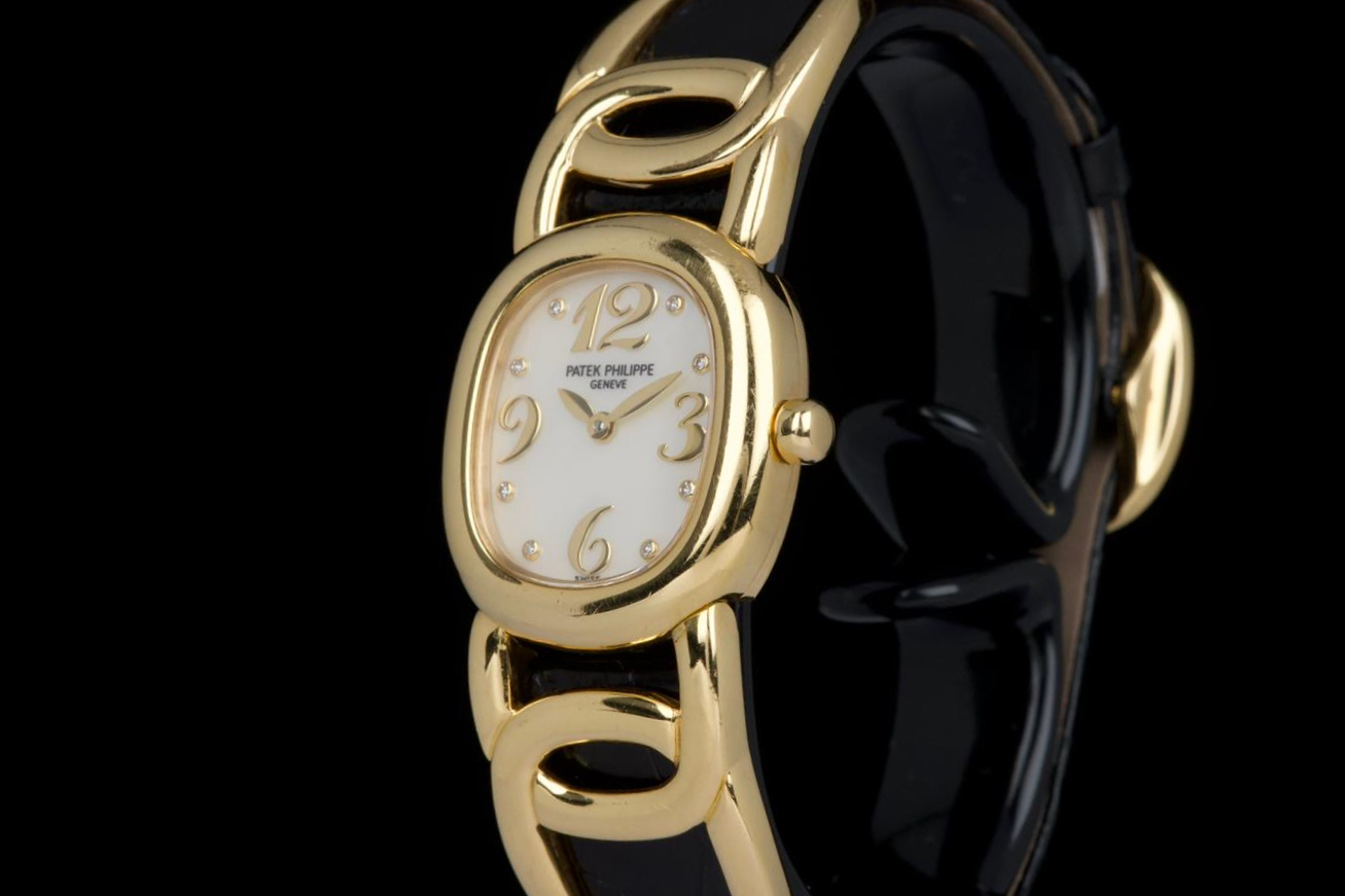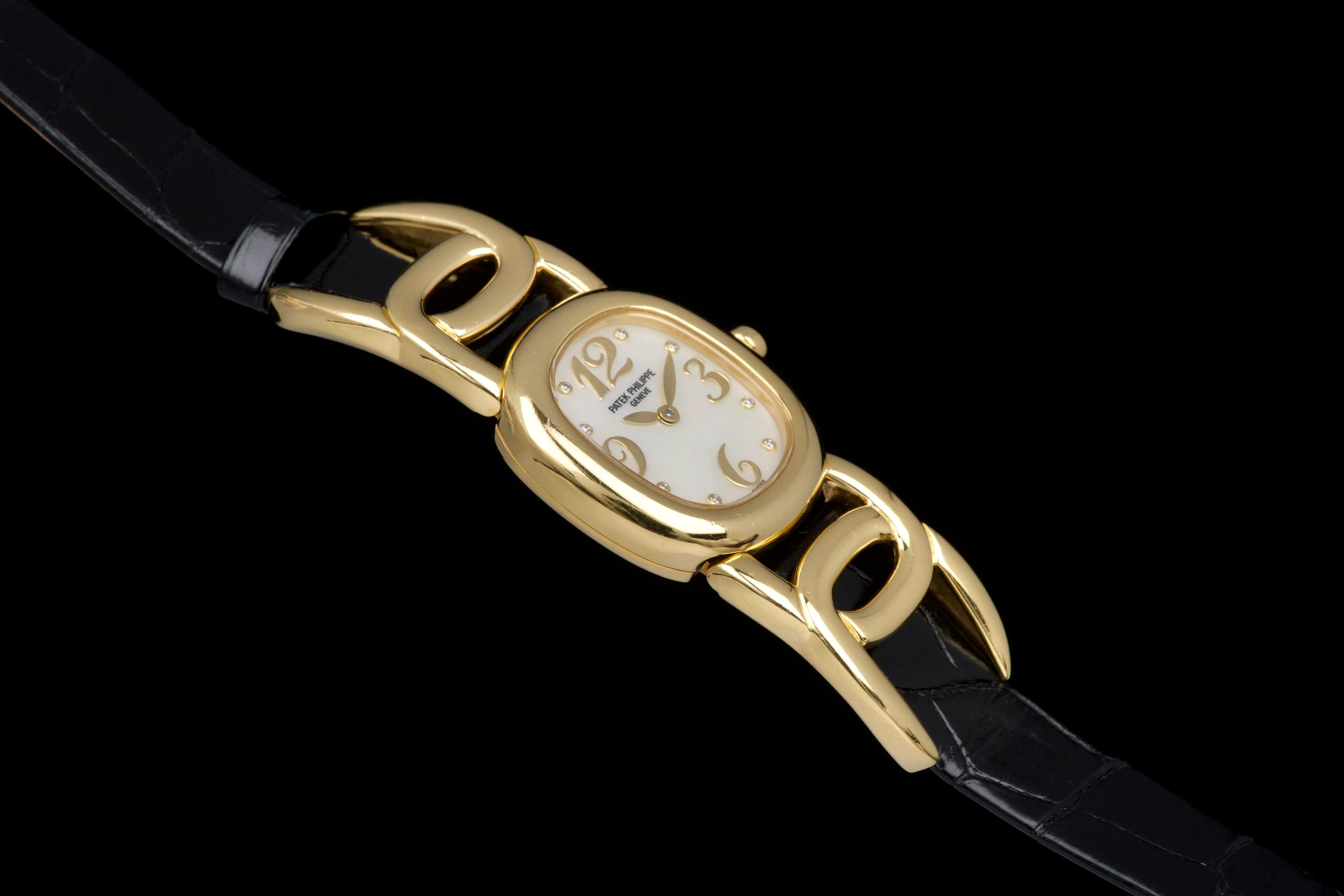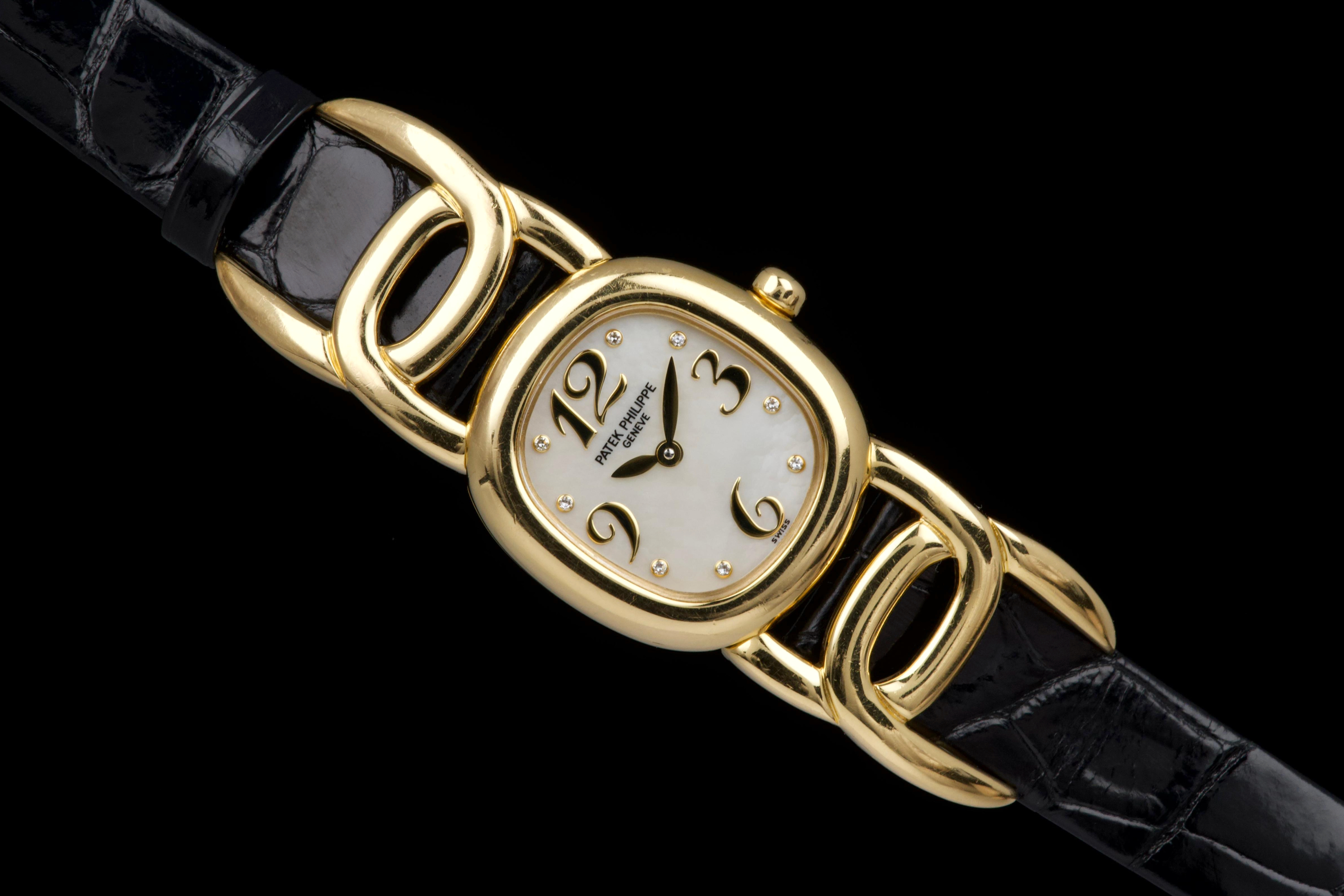 The present Patek Philippe Golden Ellipse reference 4830J, featuring a mother-of-pearl dial, is offered as a complete full set and presents a particularly interesting provenance linked to the manufacture itself. Originally produced in 2001, the watch was used as a presentation watch for a Patek Philippe employee, reflecting the tradition within the manufacture of awarding timepieces to long-serving staff members. Upon the employee’s retirement in 2020, the watch was returned to Patek Philippe where it underwent a full service and polishing before being formally offered to the employee as a retirement gift. At the employee’s request, a mother-of-pearl dial was installed during this intervention, giving the watch a refined and elegant new aesthetic. Since then, the watch has been worn regularly for approximately three years and is now preserved in very good overall condition, showing some light surface scratches consistent with daily wear. The mother-of-pearl dial remains beautiful and vibrant, offering subtle iridescent reflections that enhance the timeless elegance of the Golden Ellipse design. The watch is powered by a quartz movement, ensuring reliability and practicality for everyday use. It is fitted with a black crocodile leather strap in excellent condition, completing the watch’s classic and refined presentation. With its distinctive dial, documented full set, and charming provenance connected to the Patek Philippe manufacture itself, this Golden Ellipse 4830J represents a particularly appealing and meaningful example of one of the brand’s most iconic dress watch designs.