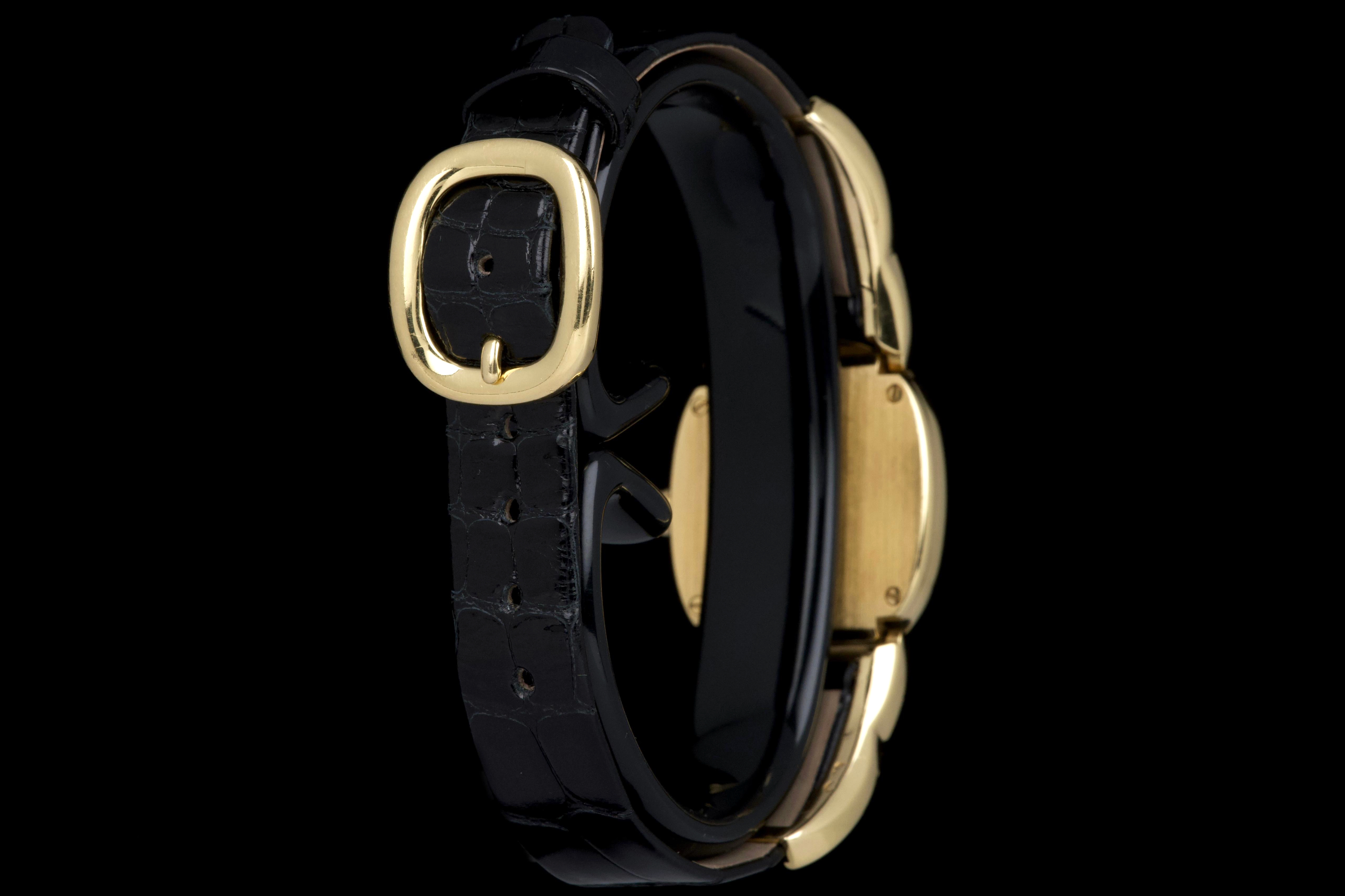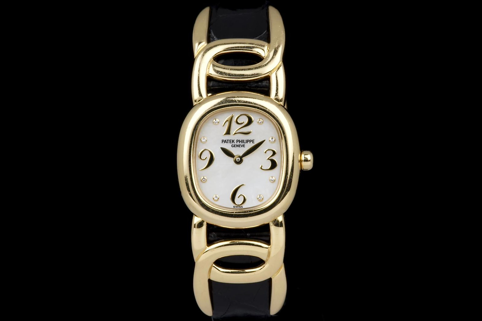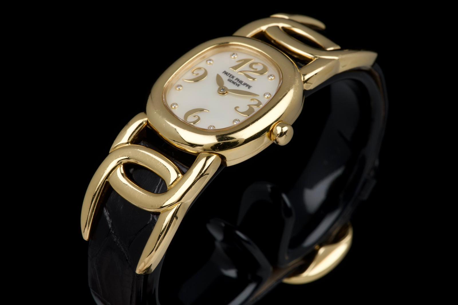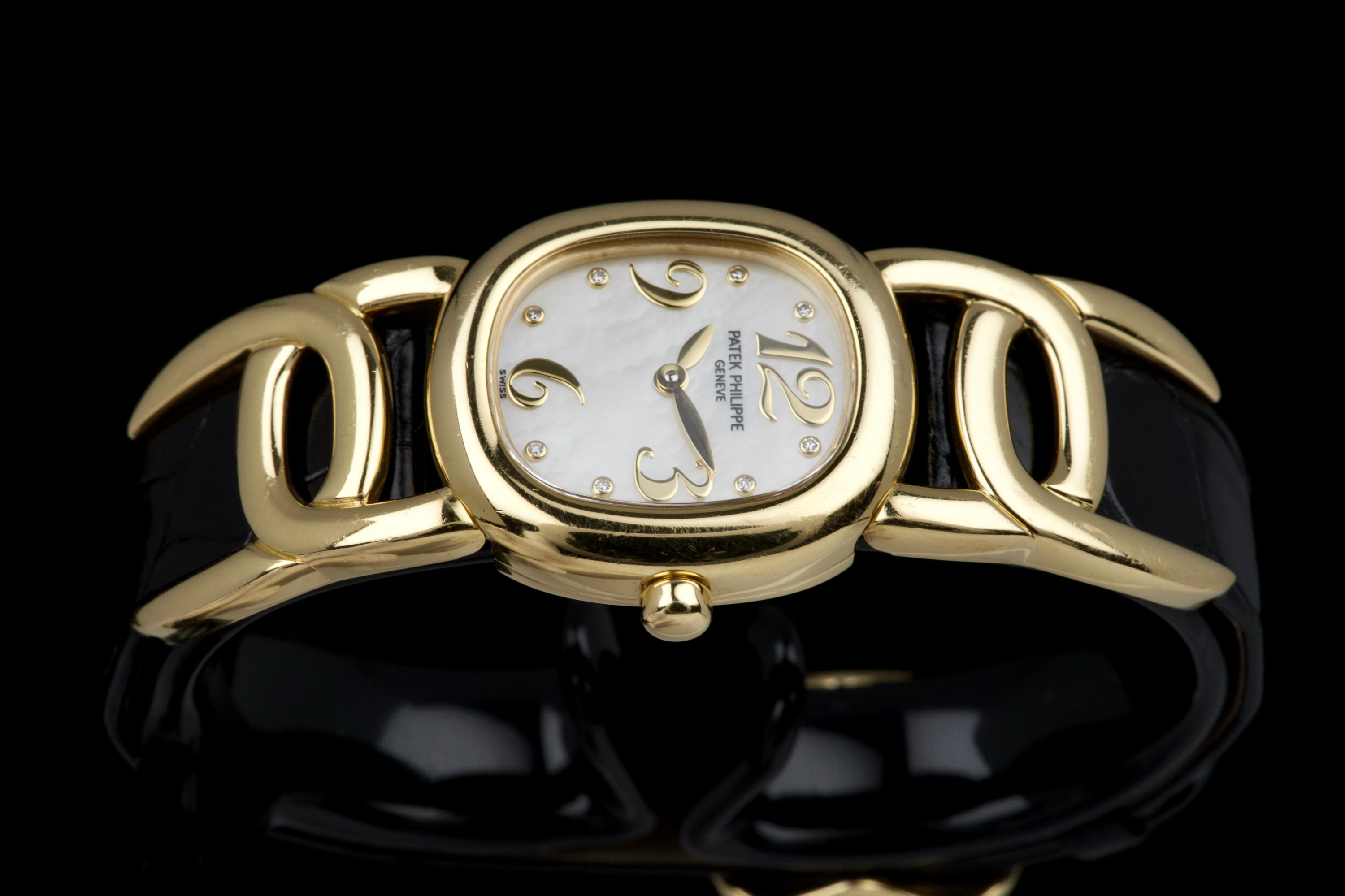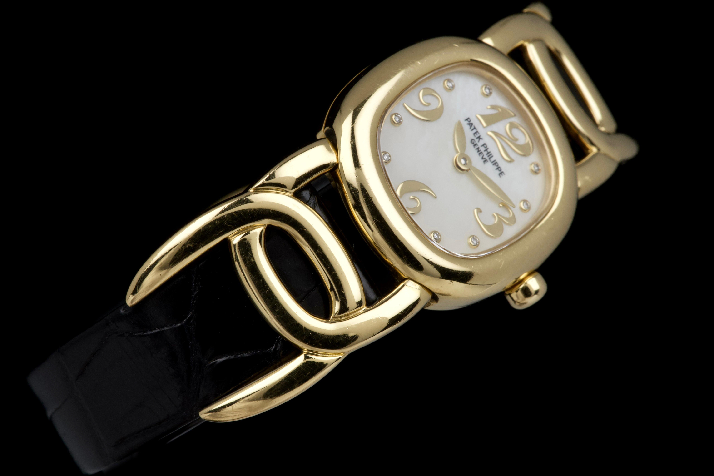 The present Patek Philippe Golden Ellipse reference 4830J, featuring a mother-of-pearl dial, is offered as a complete full set and presents a particularly interesting provenance linked to the manufacture itself. Originally produced in 2001, the watch was used as a presentation watch for a Patek Philippe employee, reflecting the tradition within the manufacture of awarding timepieces to long-serving staff members. Upon the employee’s retirement in 2020, the watch was returned to Patek Philippe where it underwent a full service and polishing before being formally offered to the employee as a retirement gift. At the employee’s request, a mother-of-pearl dial was installed during this intervention, giving the watch a refined and elegant new aesthetic. Since then, the watch has been worn regularly for approximately three years and is now preserved in very good overall condition, showing some light surface scratches consistent with daily wear. The mother-of-pearl dial remains beautiful and vibrant, offering subtle iridescent reflections that enhance the timeless elegance of the Golden Ellipse design. The watch is powered by a quartz movement, ensuring reliability and practicality for everyday use. It is fitted with a black crocodile leather strap in excellent condition, completing the watch’s classic and refined presentation. With its distinctive dial, documented full set, and charming provenance connected to the Patek Philippe manufacture itself, this Golden Ellipse 4830J represents a particularly appealing and meaningful example of one of the brand’s most iconic dress watch designs.