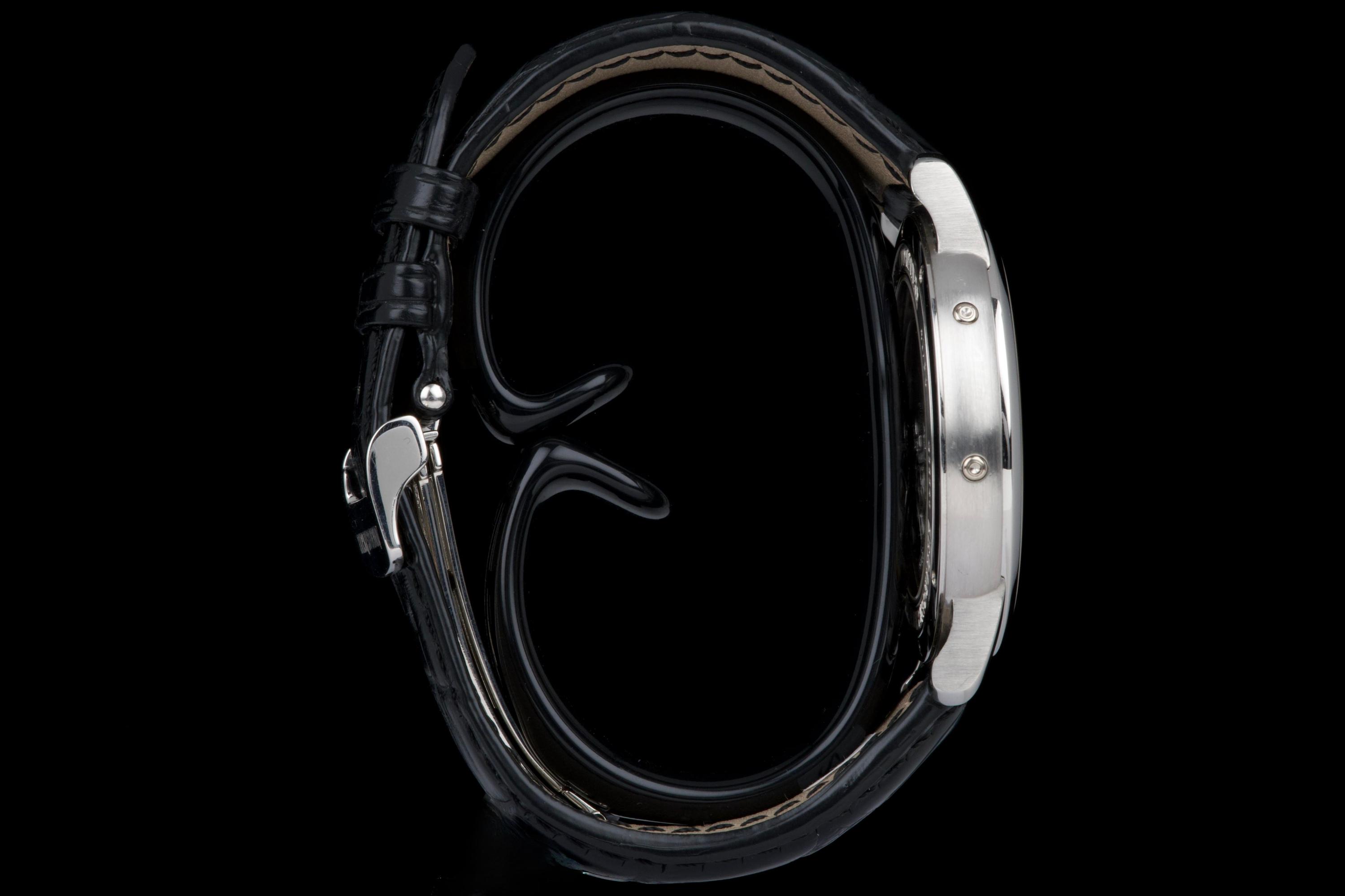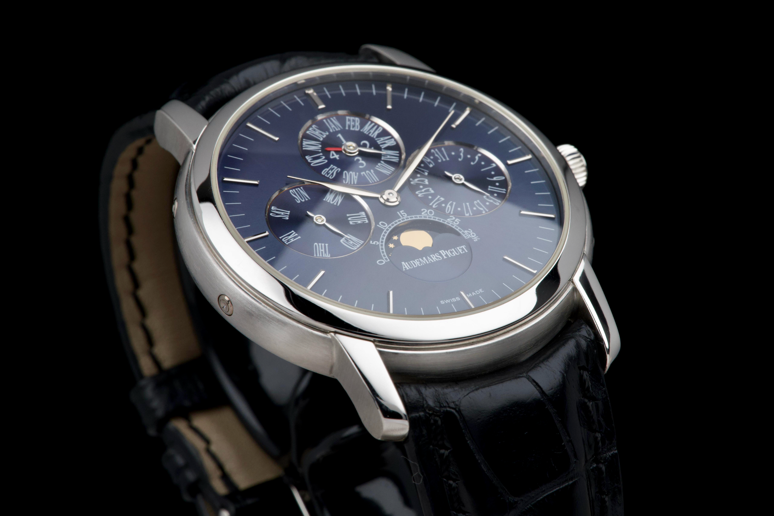 The present Audemars Piguet Jules Audemars Quantième Perpétuel reference 26000PT, dating to 2008, is an exceptionally rare and refined example of the manufacture’s classical high complications, produced in a limited edition of only 90 pieces. Executed in platinum and measuring 40.5 mm in diameter, this discreet yet highly sophisticated perpetual calendar embodies Audemars Piguet’s mastery of traditional watchmaking at the highest level. The watch is preserved in excellent overall condition and has been lightly polished in the past, while retaining strong proportions and an elegant presence on the wrist. It is fitted with a black Audemars Piguet alligator leather strap, paired with a platinum deployant clasp, completing the ensemble with period-correct coherence and refinement. Although no service history accompanies the watch, it is in perfect working condition at the time of cataloguing. Importantly, the watch is accompanied by a Certificate of Authenticity issued by Audemars Piguet in 2022, providing valuable confirmation of its originality and configuration. Produced in extremely limited numbers and offered with official manufacturer documentation, this Jules Audemars Perpetual Calendar represents a rare opportunity to acquire a discreet, highly collectible platinum complicated watch from Audemars Piguet’s modern era.