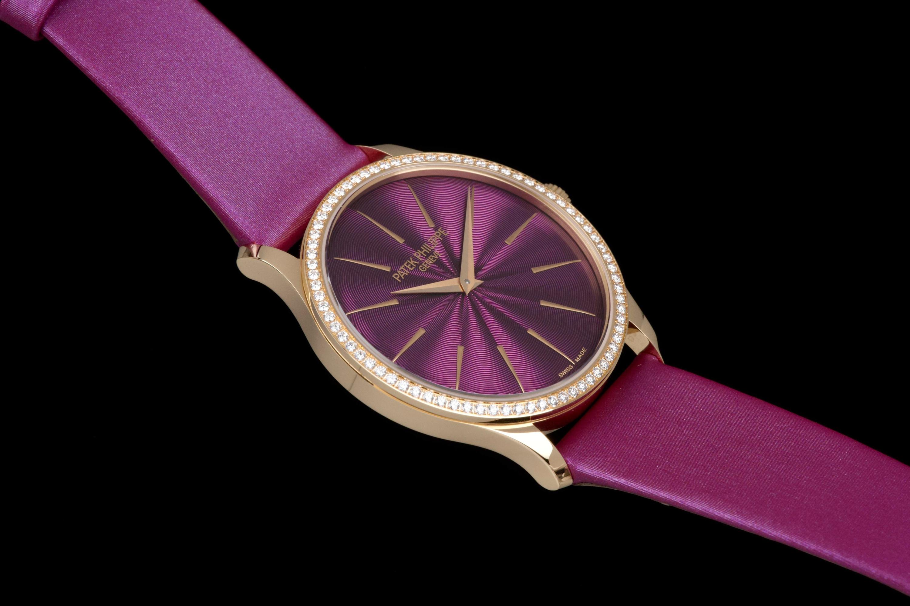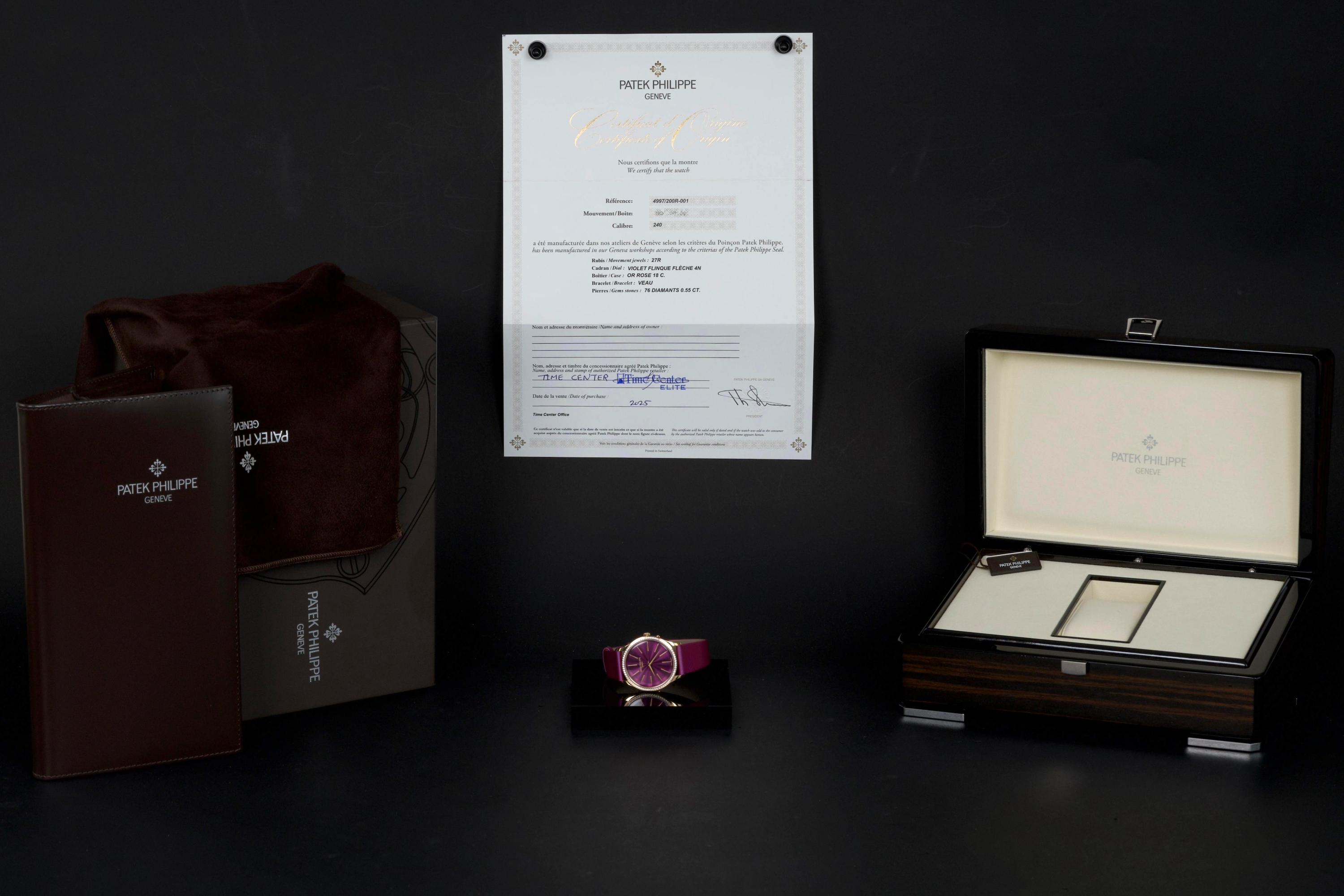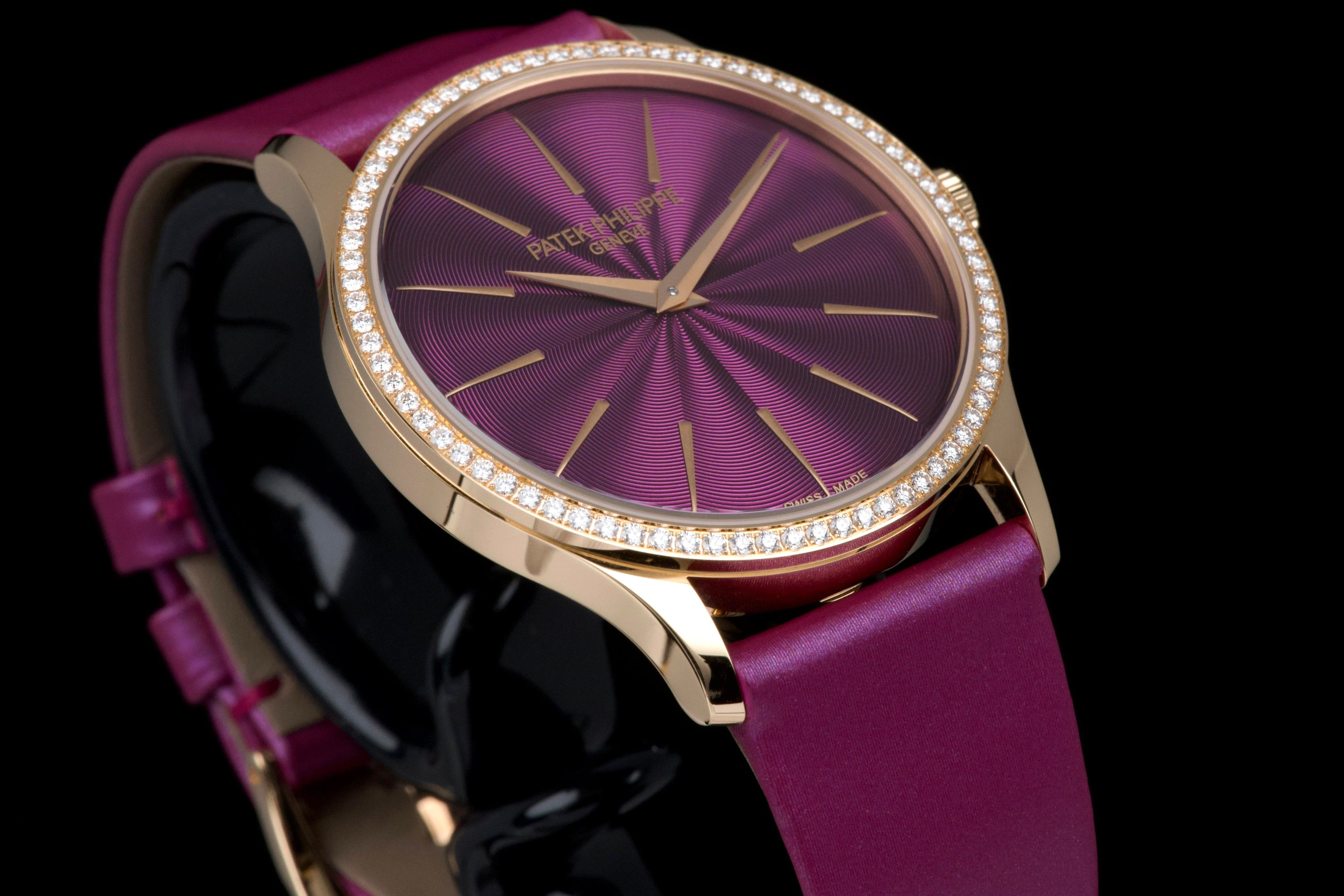 Presented here is an elegant and contemporary example of the Patek Philippe Lady Calatrava reference 4997/200R-001. Crafted in rose gold, this refined timepiece perfectly reflects Patek Philippe’s mastery of classic feminine watchmaking, combining timeless proportions with discreet luxury. This example dates to 2025 and is offered as a full set with its original box, papers, and accessories. Presented in close-to-new condition, the watch shows only the slightest signs of handling, preserving its crisp and refined overall appearance. The beautifully finished dial, enhanced by diamond hour markers and the signature hobnail-patterned bezel, offers a sophisticated and luminous presence on the wrist. A superb opportunity to acquire a nearly unworn example of a modern Lady Calatrava, combining elegance, craftsmanship, and enduring Patek Philippe refinement.