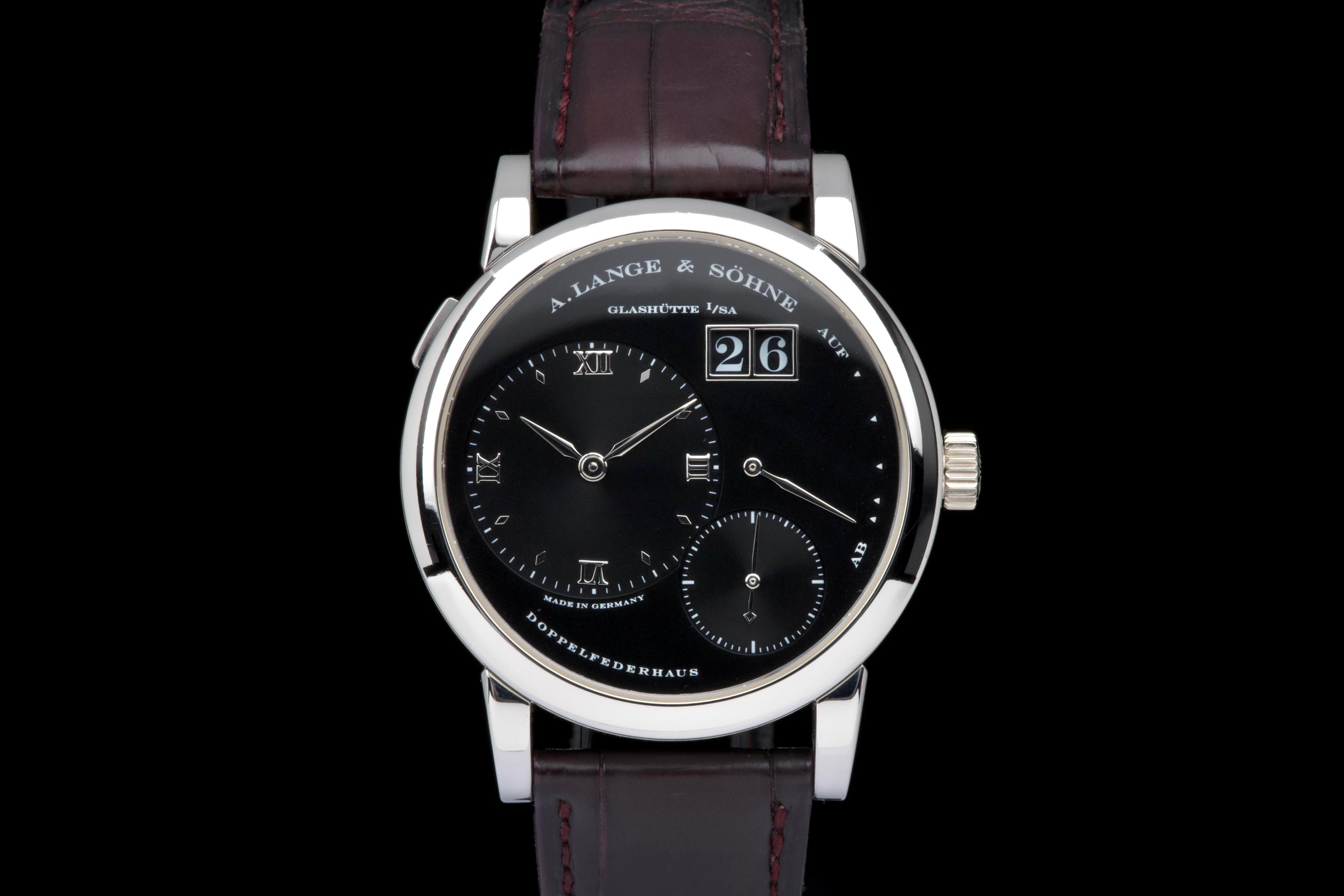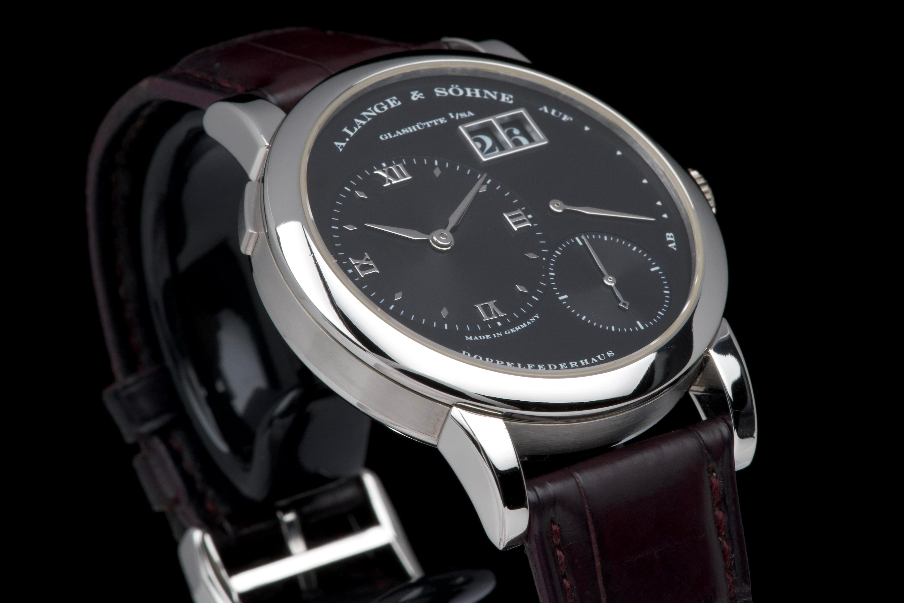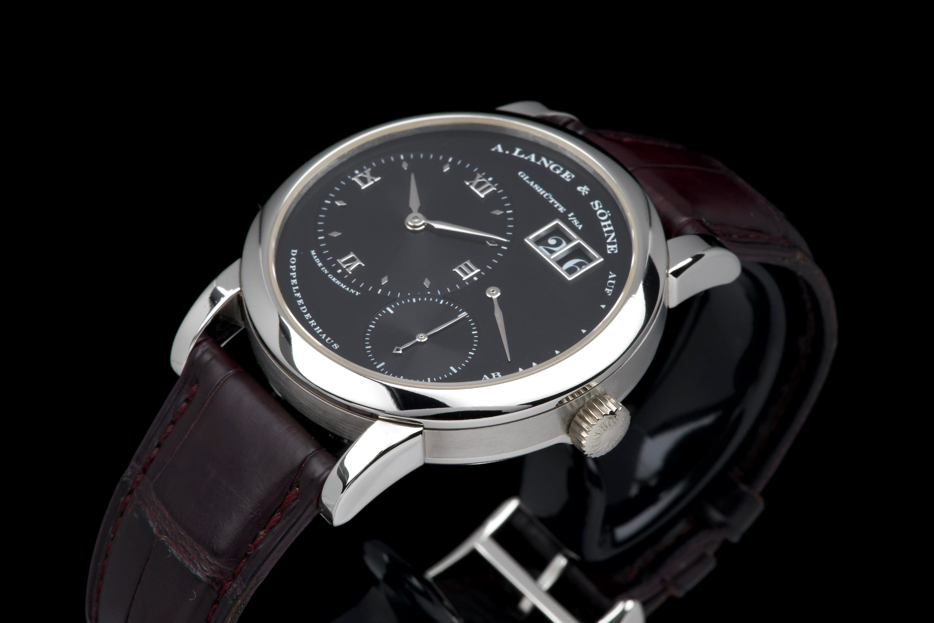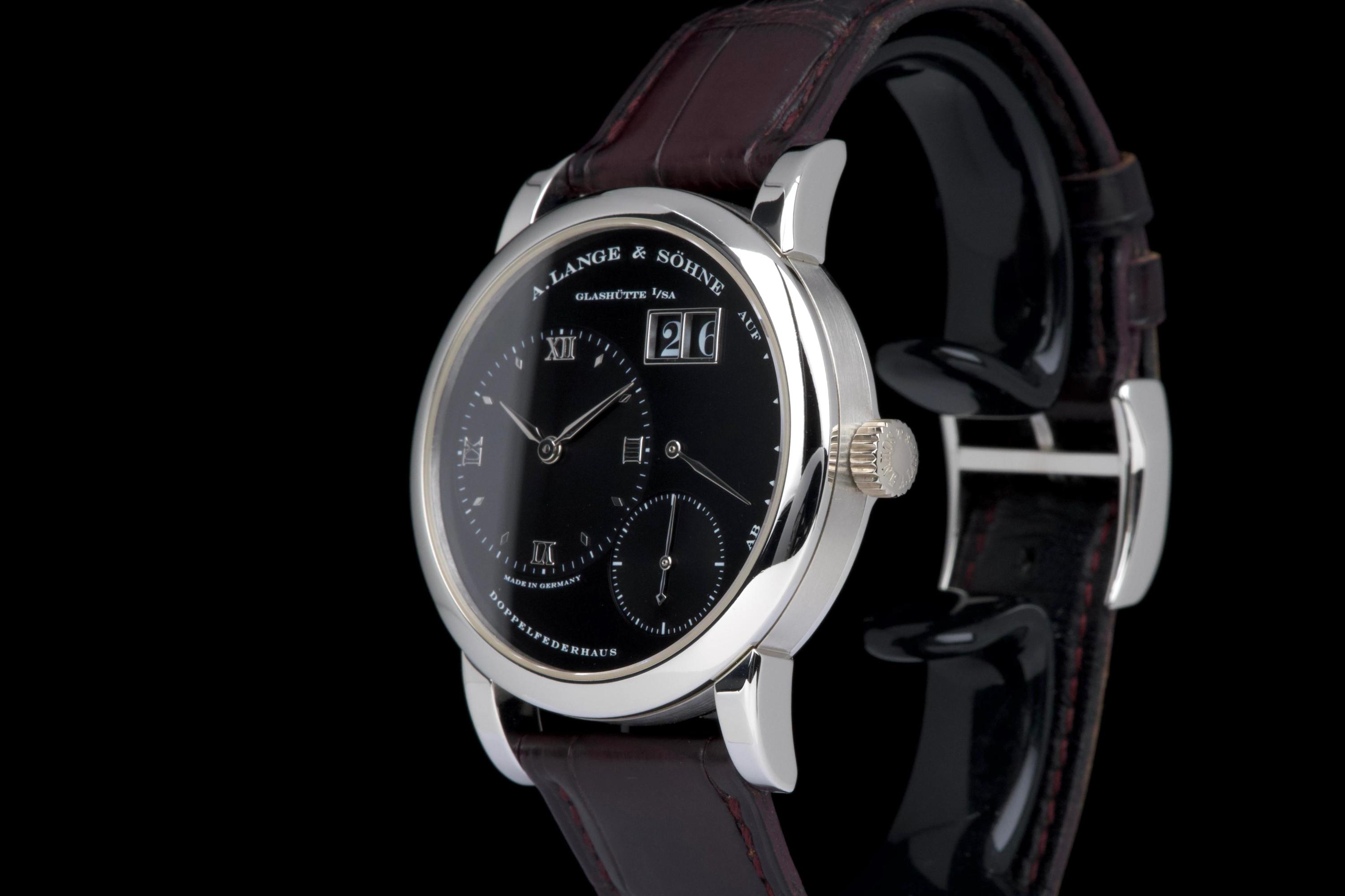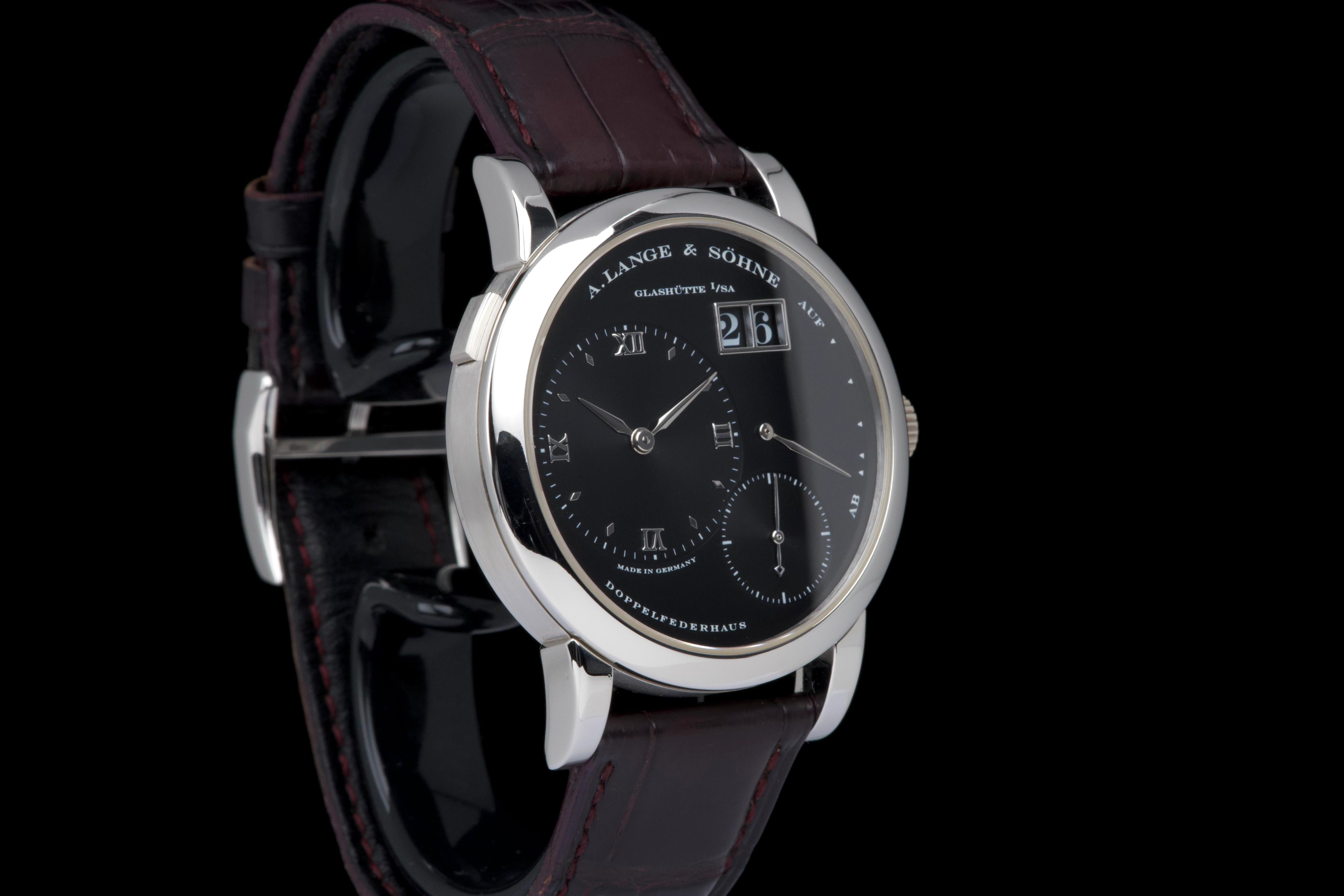 The present A. Lange & Söhne Lange 1, reference 101.035, dating to 2006, is a superb and highly collectible example of one of the manufacture’s most iconic and enduring models. Executed in platinum with a black dial, this Lange 1 embodies the quintessential aesthetic that has defined A. Lange & Söhne’s modern era since the model’s reintroduction in the 1990s. The platinum case measures approximately 38.5 mm in diameter, offering a harmonious and balanced wrist presence. The watch has been lightly polished in the past and is presented in excellent overall condition, showing only minimal signs of wear. This example features a beautiful black dial with the iconic outsize date (grande date) at 2 o’clock, a signature of the Lange 1 family. The large date display is achieved through a proprietary double-disc mechanism, allowing for excellent legibility and a distinctive aesthetic. The watch is powered by the in-house manual-winding calibre L901.0, visible through the sapphire case back, and is equipped with a power reserve of approximately 72 hours. This movement is renowned for its intricate finishing and the classic three-quarter plate architecture that is a hallmark of Lange’s Glashütte tradition. The watch is fitted with a brown alligator Lange strap in approximately 70% condition, paired with a matching platinum ardillon buckle. While no service history is provided, the watch is in excellent working order. Combining the understated elegance of platinum, the iconic outsize date, and strong provenance, this Lange 1 reference 101.035 represents a compelling opportunity to acquire one of A. Lange & Söhne’s most enduring modern classics, combining mechanical sophistication with timeless design.