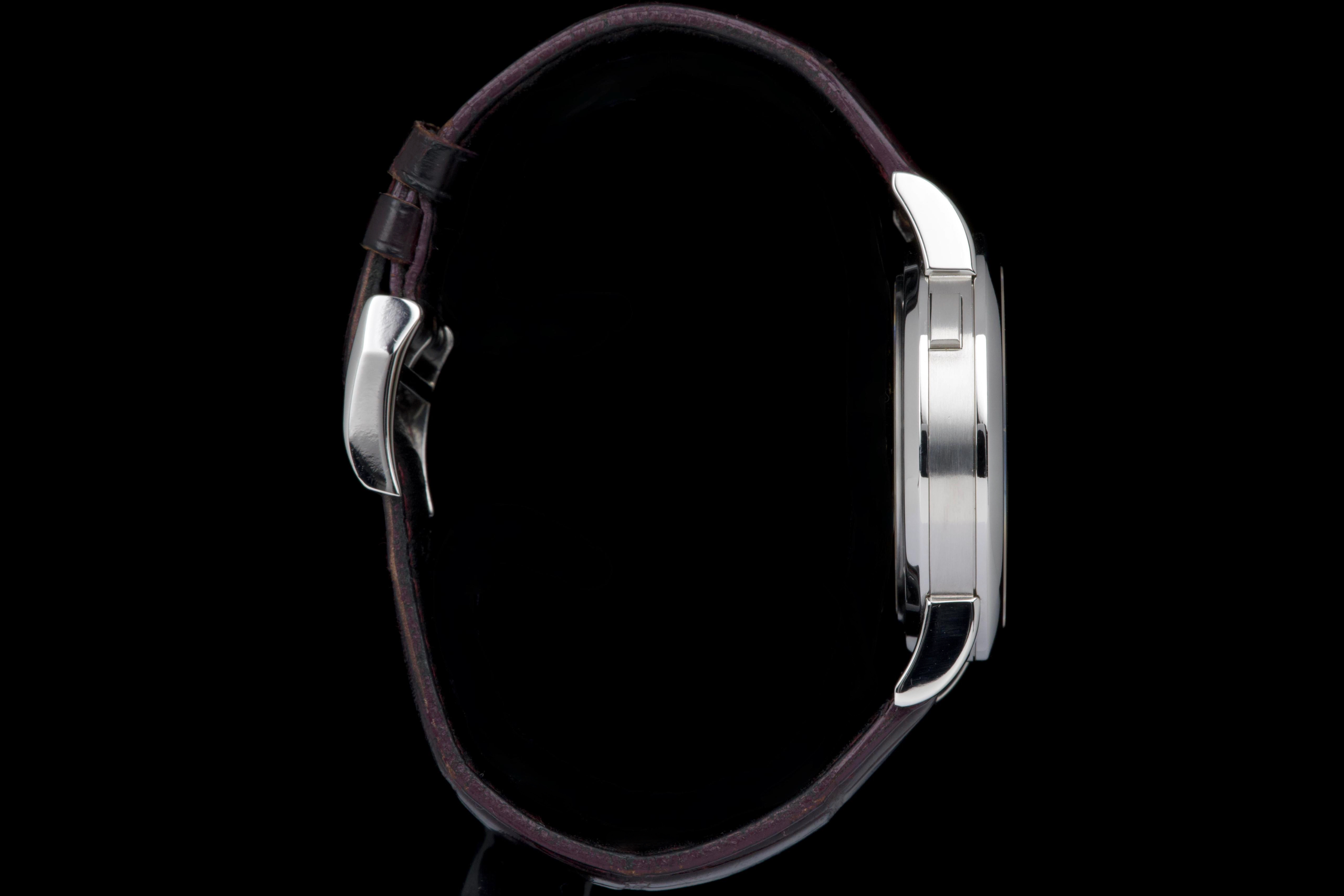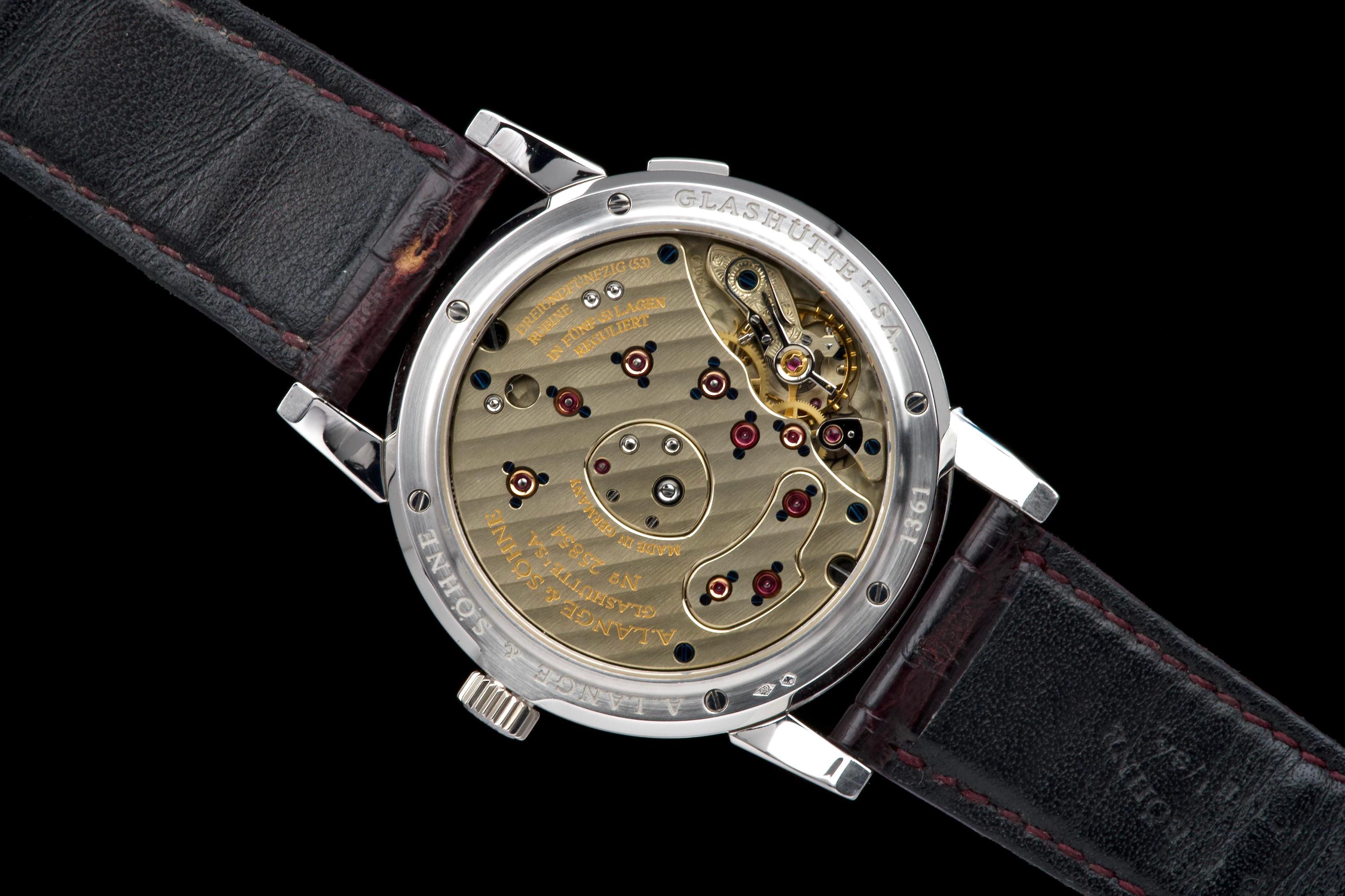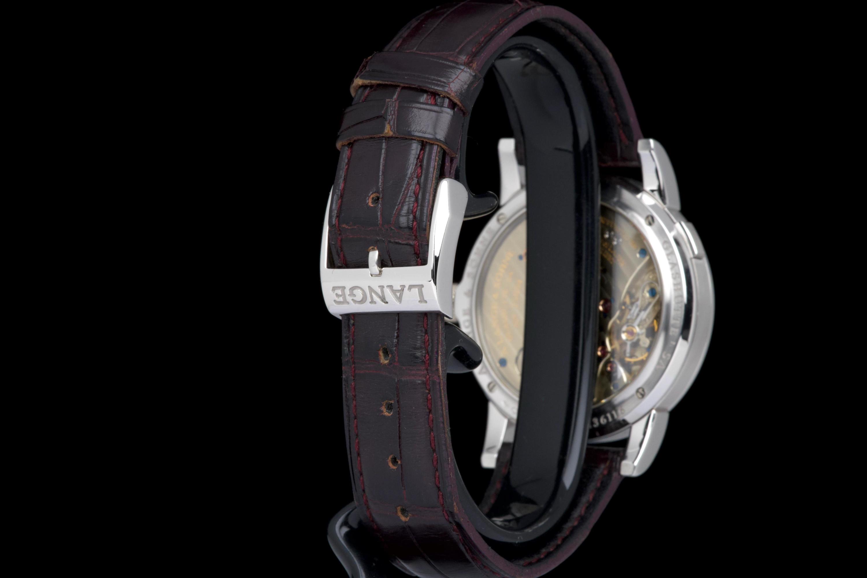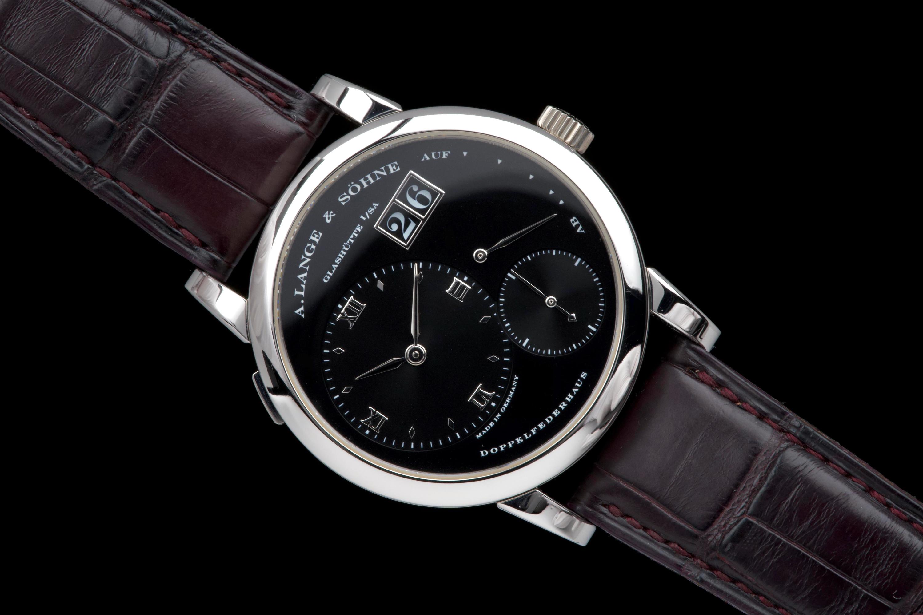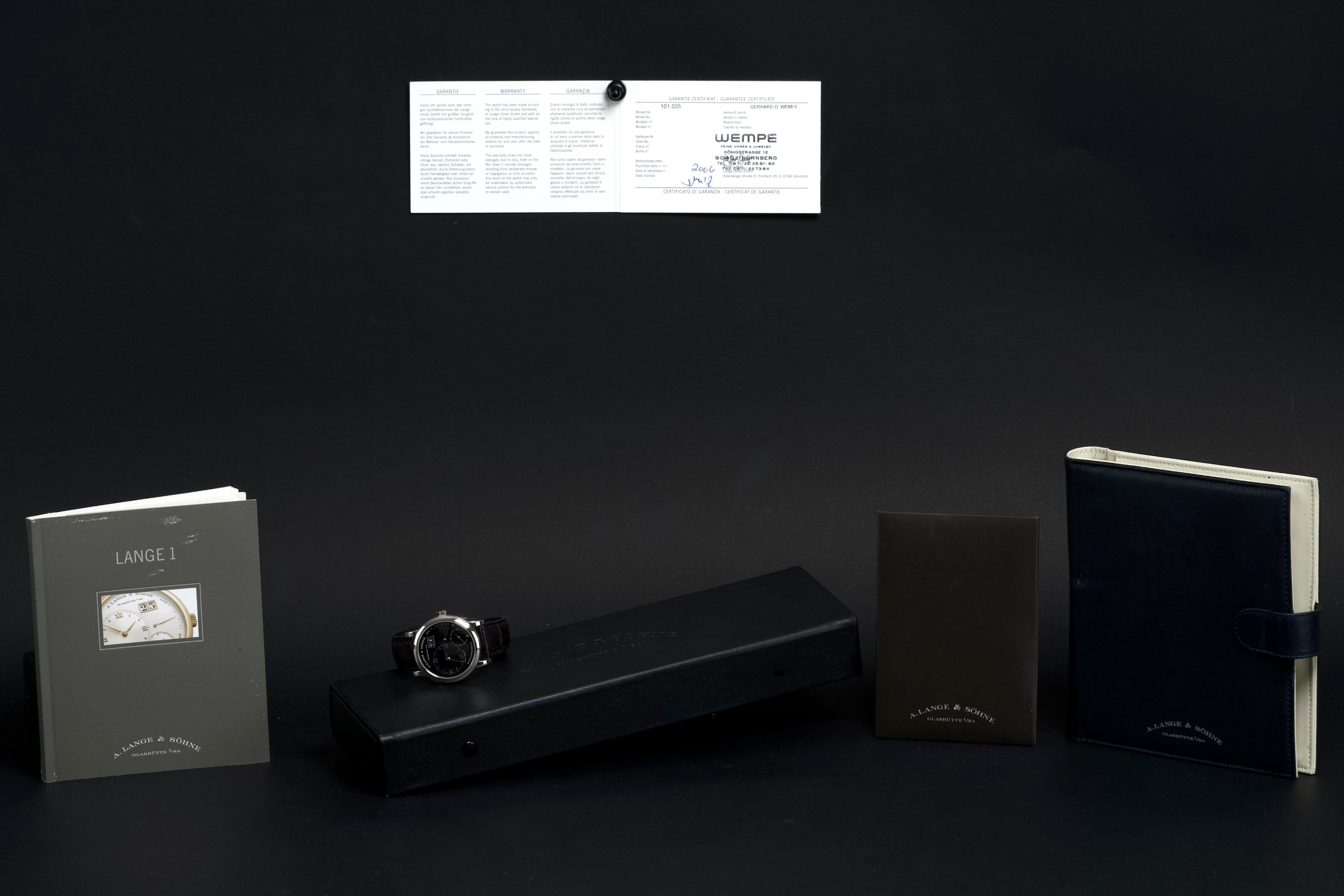 The present A. Lange & Söhne Lange 1, reference 101.035, dating to 2006, is a superb and highly collectible example of one of the manufacture’s most iconic and enduring models. Executed in platinum with a black dial, this Lange 1 embodies the quintessential aesthetic that has defined A. Lange & Söhne’s modern era since the model’s reintroduction in the 1990s. The platinum case measures approximately 38.5 mm in diameter, offering a harmonious and balanced wrist presence. The watch has been lightly polished in the past and is presented in excellent overall condition, showing only minimal signs of wear. This example features a beautiful black dial with the iconic outsize date (grande date) at 2 o’clock, a signature of the Lange 1 family. The large date display is achieved through a proprietary double-disc mechanism, allowing for excellent legibility and a distinctive aesthetic. The watch is powered by the in-house manual-winding calibre L901.0, visible through the sapphire case back, and is equipped with a power reserve of approximately 72 hours. This movement is renowned for its intricate finishing and the classic three-quarter plate architecture that is a hallmark of Lange’s Glashütte tradition. The watch is fitted with a brown alligator Lange strap in approximately 70% condition, paired with a matching platinum ardillon buckle. While no service history is provided, the watch is in excellent working order. Combining the understated elegance of platinum, the iconic outsize date, and strong provenance, this Lange 1 reference 101.035 represents a compelling opportunity to acquire one of A. Lange & Söhne’s most enduring modern classics, combining mechanical sophistication with timeless design.