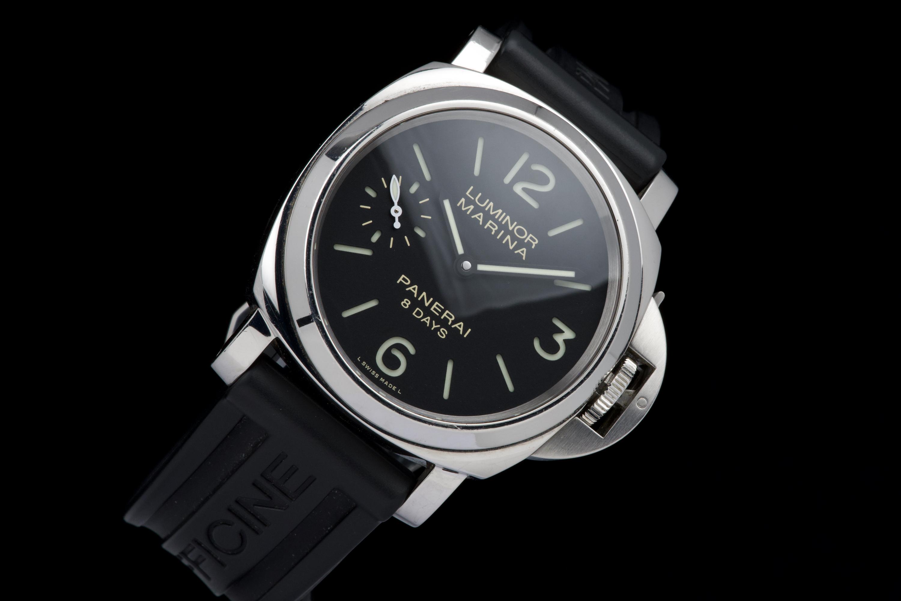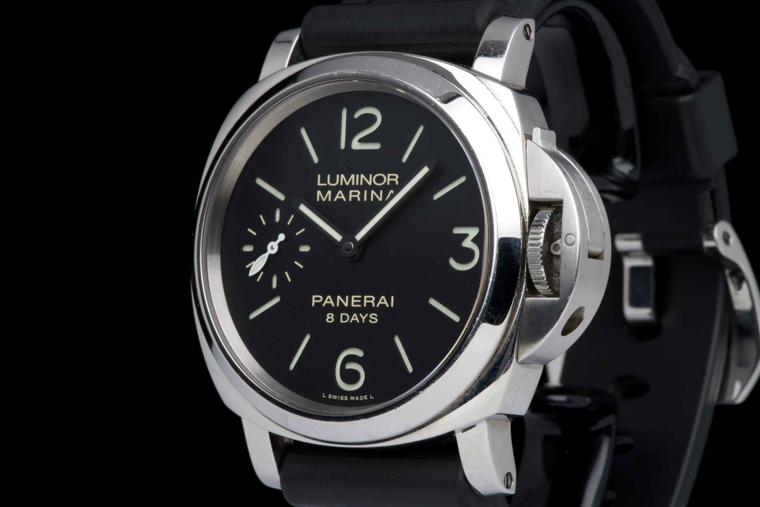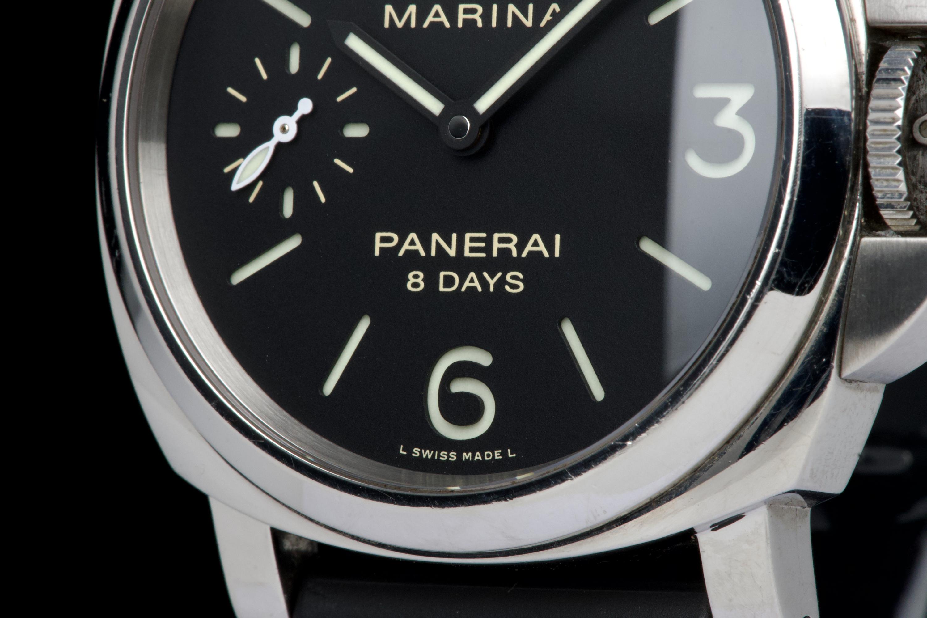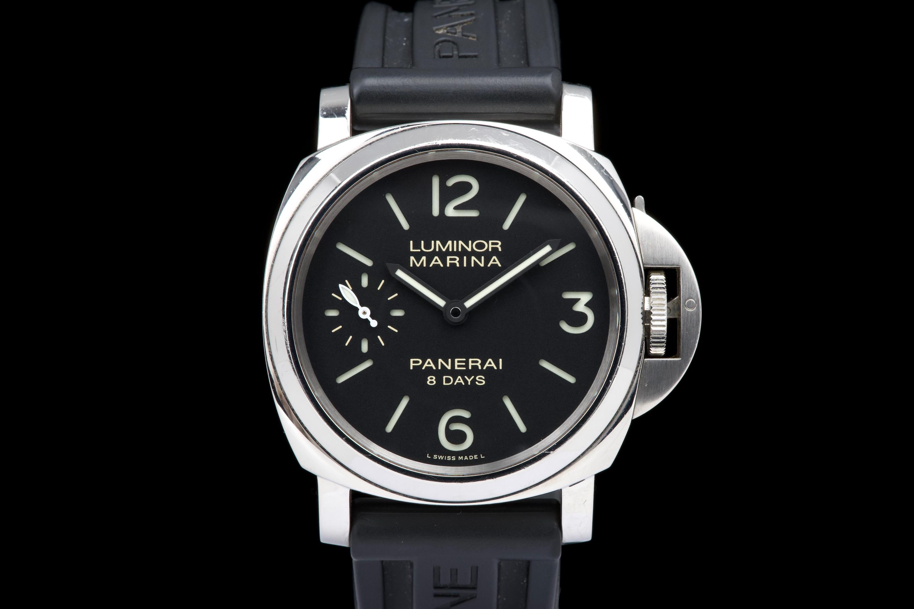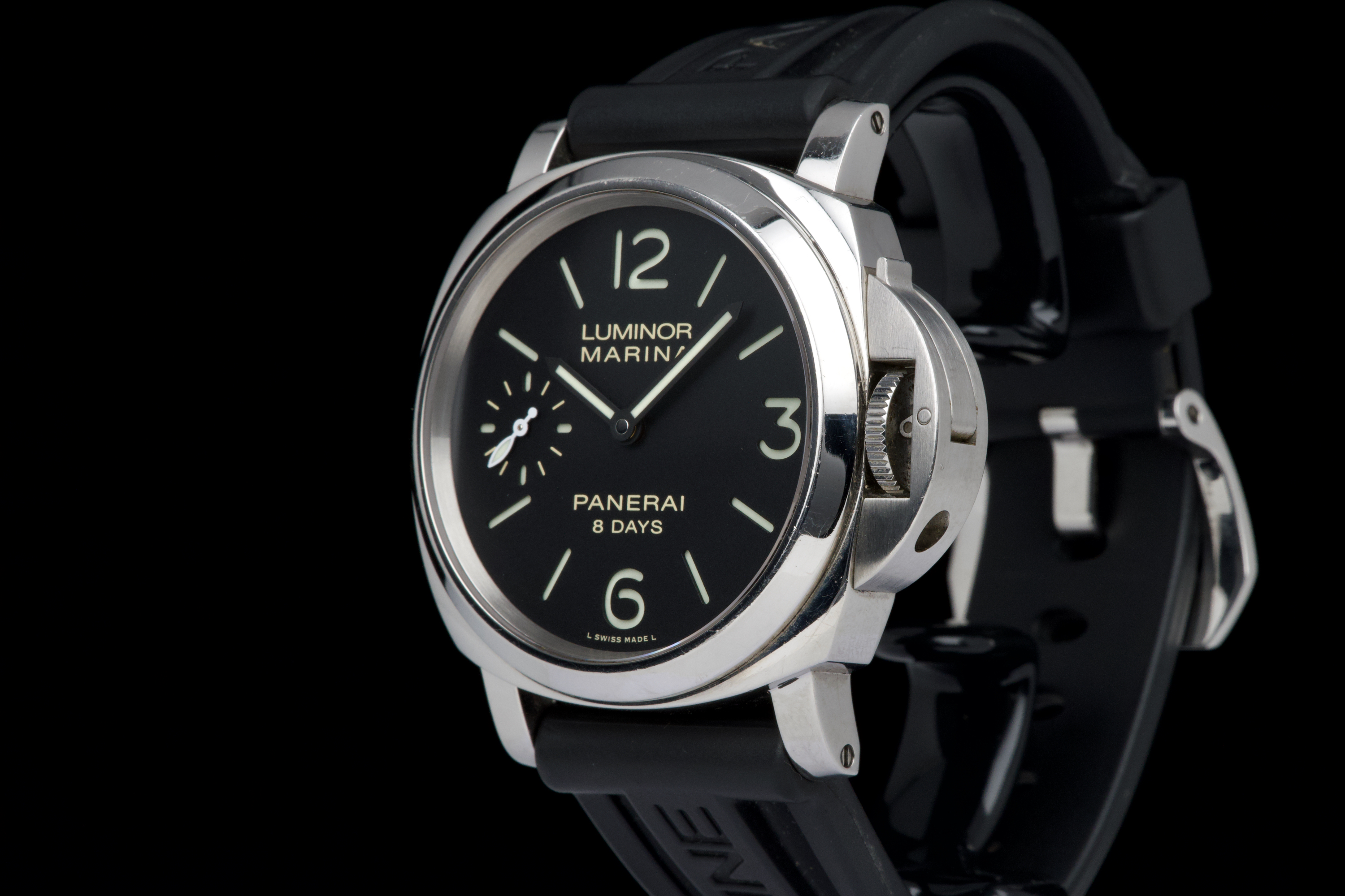 Offered here is a Panerai Luminor 8 Days reference PAM510, a classic 44 mm model known for its clean design and impressive eight-day power reserve. Originally sold in Seville, Spain, the watch comes with its original box and papers (no outer box). The warranty card is undated, though the watch is estimated to have been sold around 2013. The stainless steel case shows visible signs of wear and has not been recently refinished, though polishing can be arranged upon request. The dial, hands and sapphire crystal are all in perfect condition, preserving the crisp and highly legible aesthetic typical of the Luminor line. The watch is fitted with a black rubber strap in correct overall condition. There is no documented service history; however, the movement has been checked and is running well, with an amplitude of approximately 300 and a rate of around +5 seconds per day. An honest example of the manual-wind Panerai Luminor 8 Days, offered with its original accessories and ready to be enjoyed.