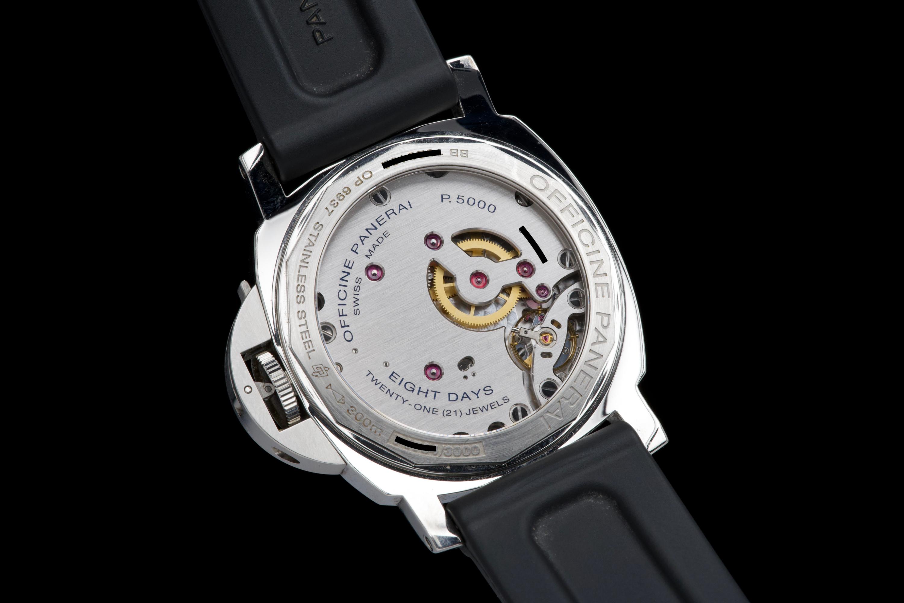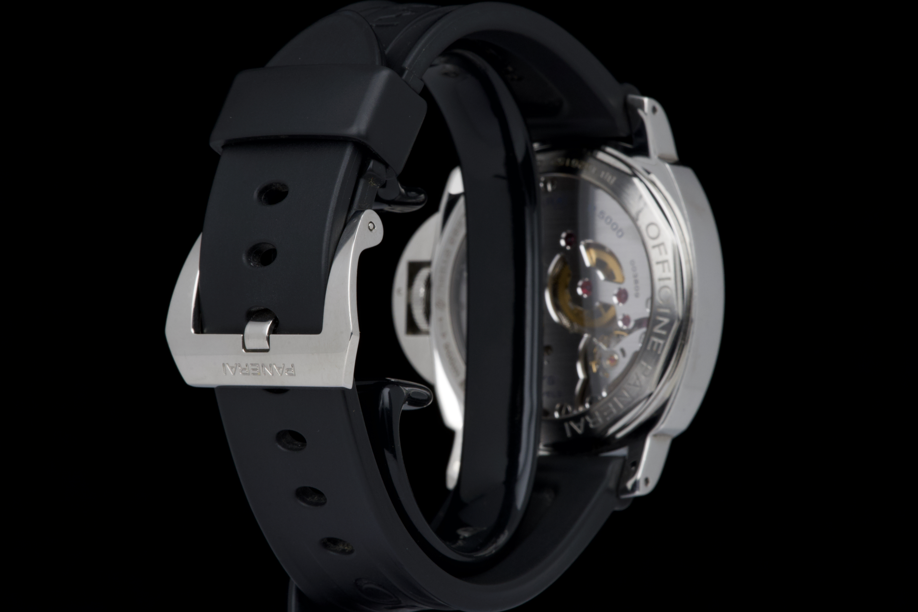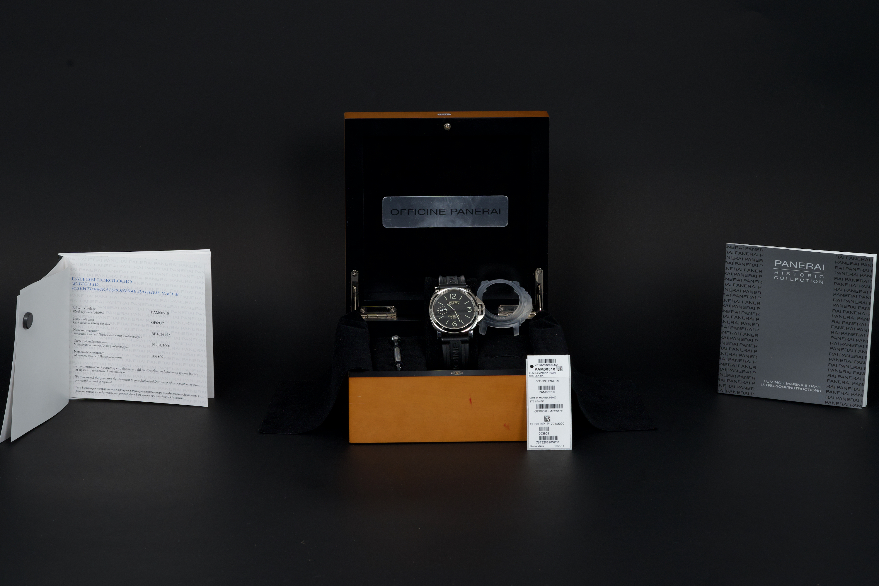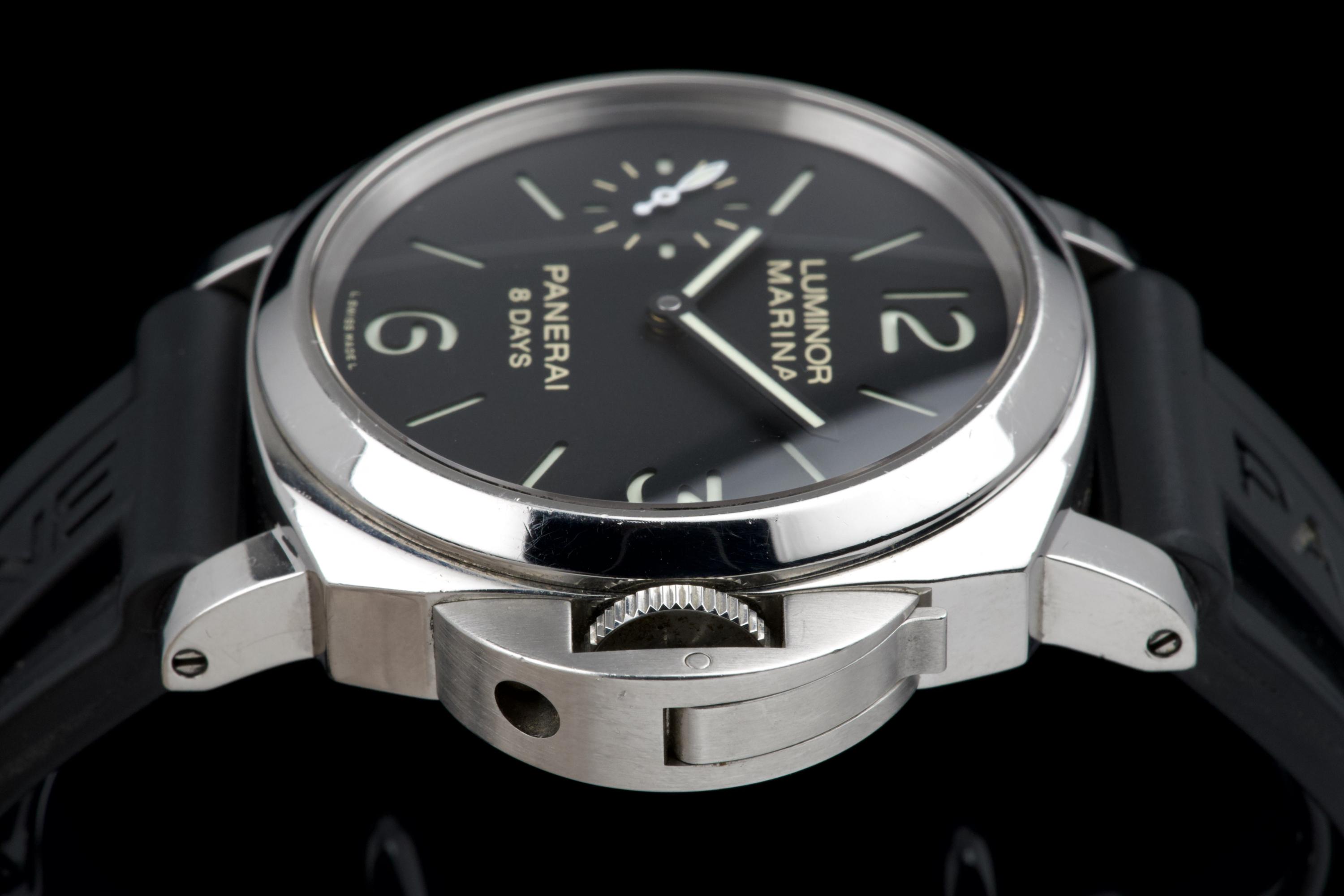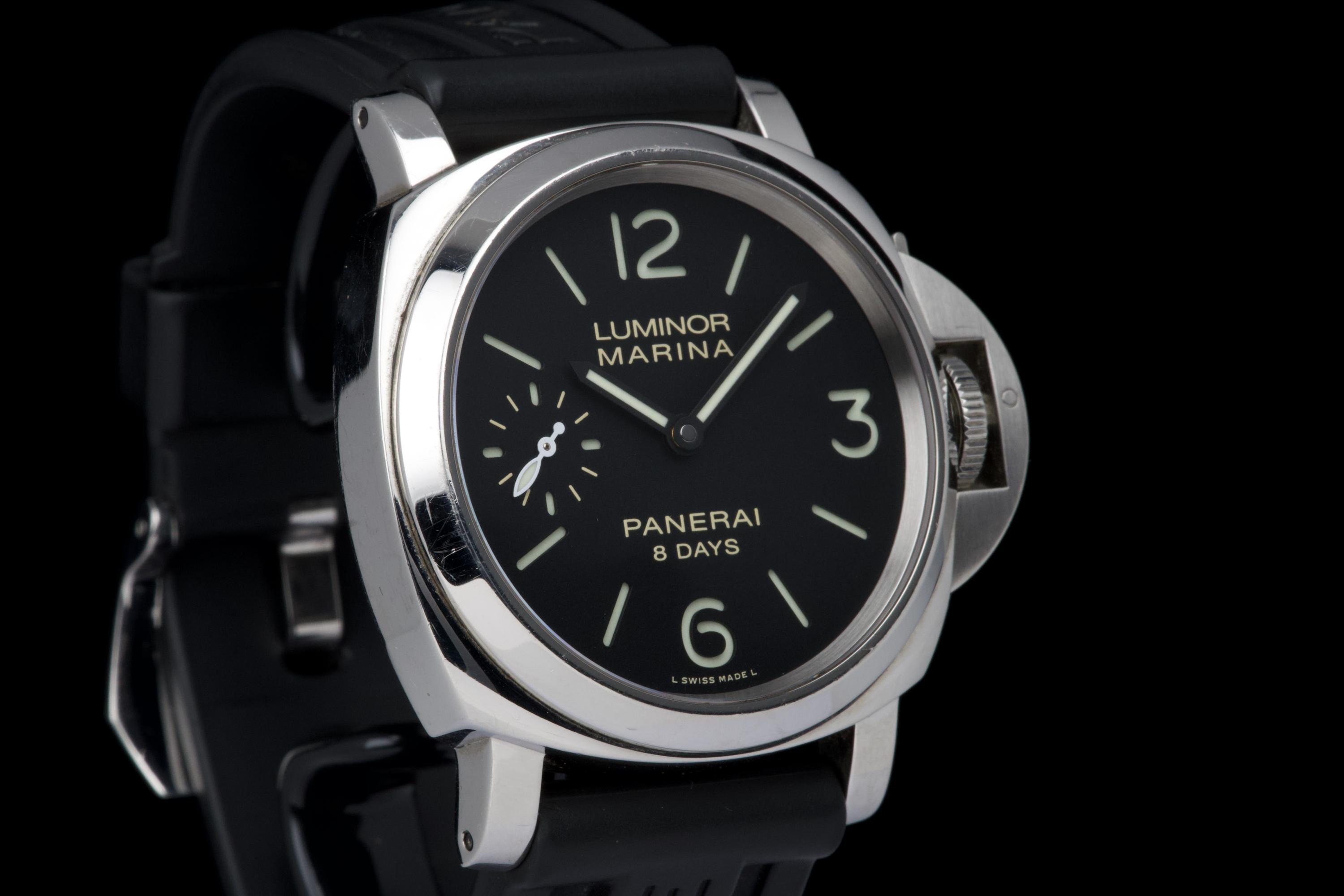 Offered here is a Panerai Luminor 8 Days reference PAM510, a classic 44 mm model known for its clean design and impressive eight-day power reserve. Originally sold in Seville, Spain, the watch comes with its original box and papers (no outer box). The warranty card is undated, though the watch is estimated to have been sold around 2013. The stainless steel case shows visible signs of wear and has not been recently refinished, though polishing can be arranged upon request. The dial, hands and sapphire crystal are all in perfect condition, preserving the crisp and highly legible aesthetic typical of the Luminor line. The watch is fitted with a black rubber strap in correct overall condition. There is no documented service history; however, the movement has been checked and is running well, with an amplitude of approximately 300 and a rate of around +5 seconds per day. An honest example of the manual-wind Panerai Luminor 8 Days, offered with its original accessories and ready to be enjoyed.