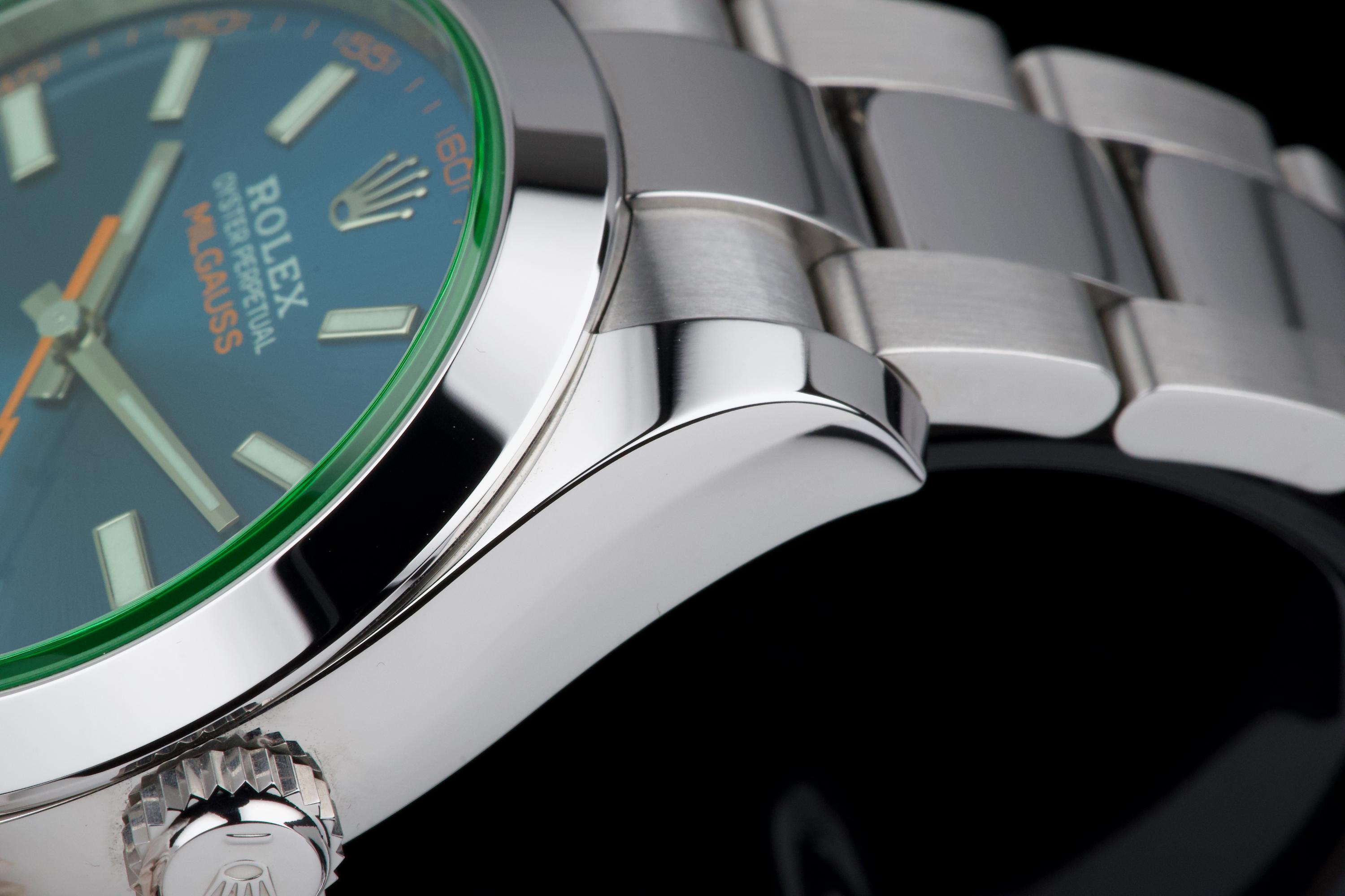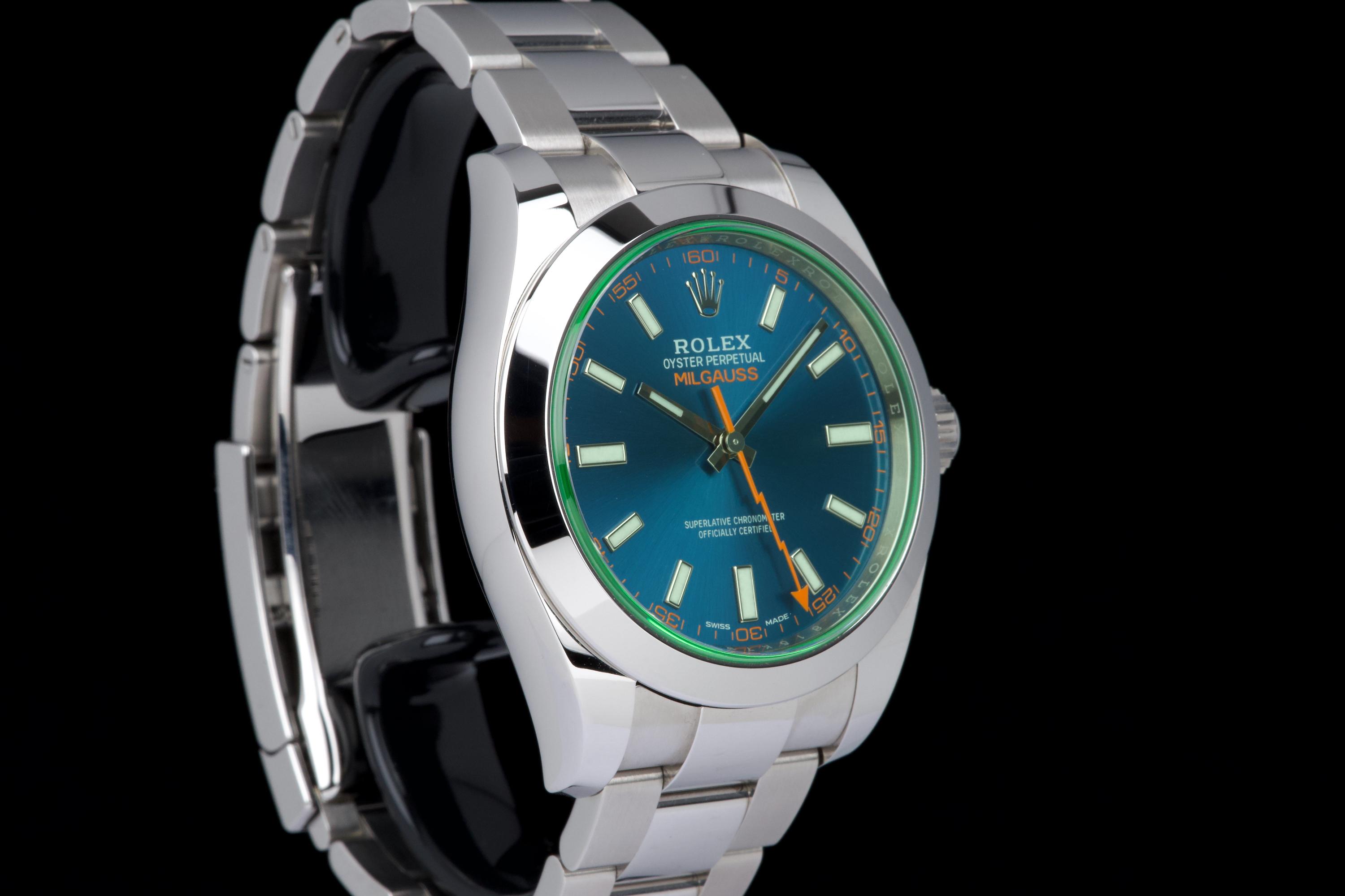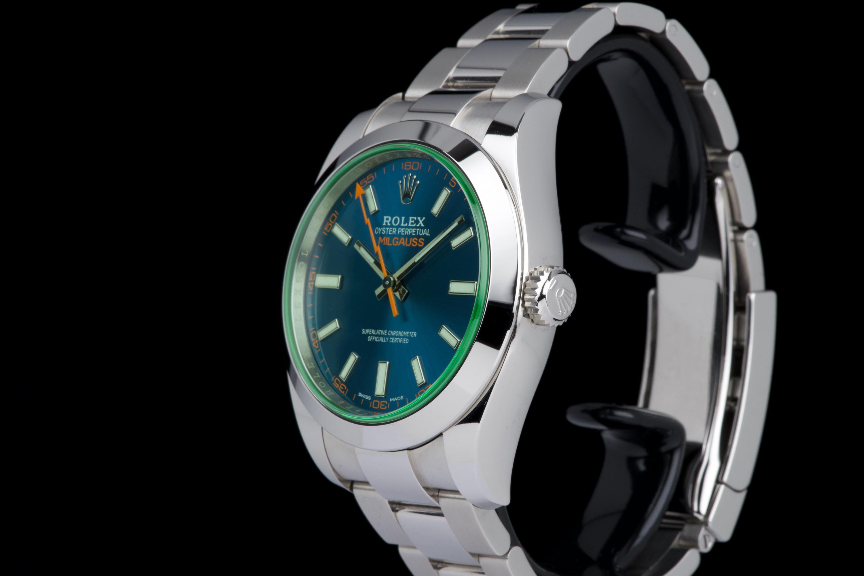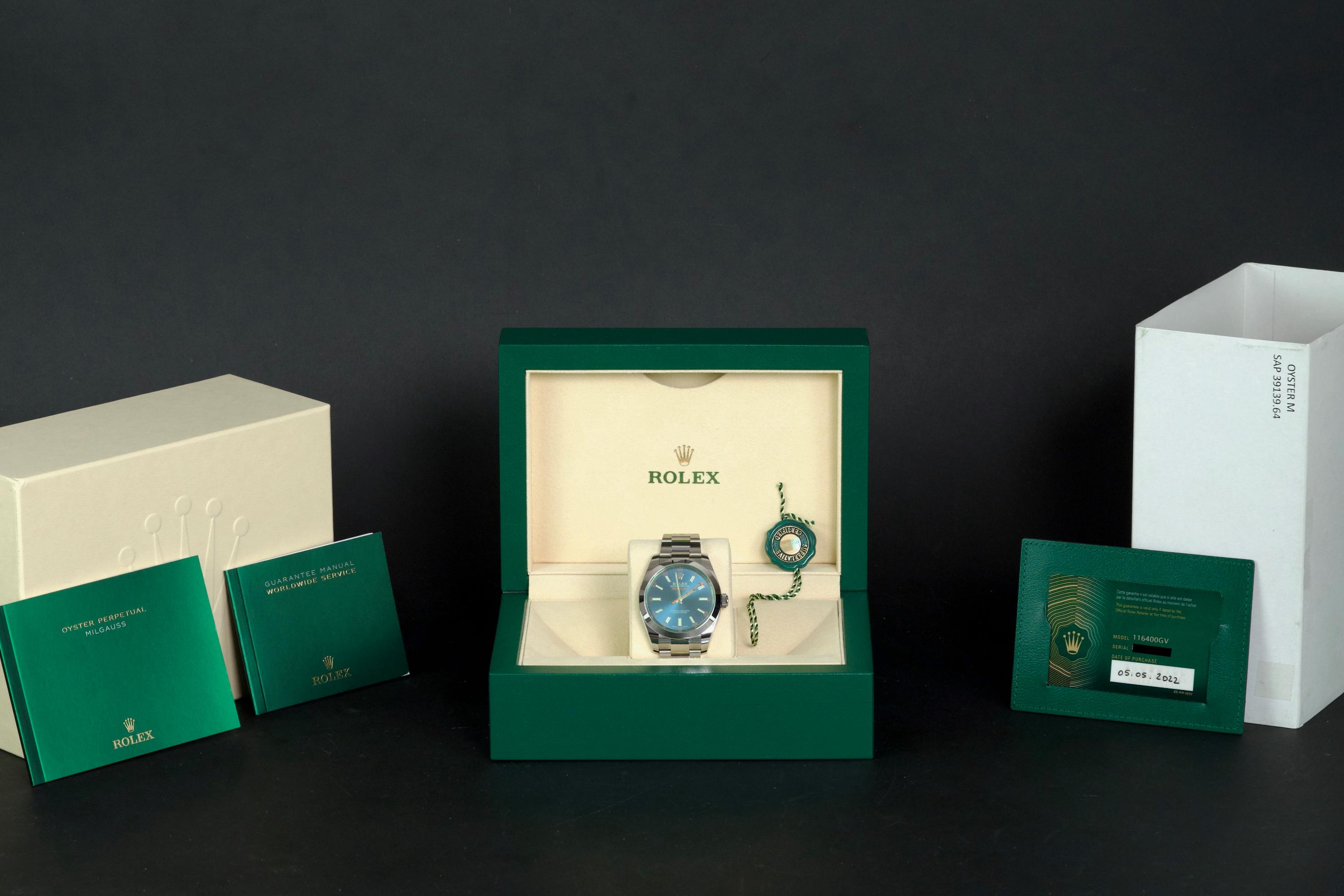 An unworn example of the Rolex Milgauss 116400GV, featuring the striking Z-Blue sunburst dial under the signature green sapphire crystal. The 40 mm stainless steel case remains in factory condition, with no signs of wear. Powered by the Rolex caliber 3131, specifically engineered for anti-magnetic resistance, combining precision and durability. Complete with its original box, 2022 warranty card, booklets, and accessories. A perfect collector-grade example of the now discontinued Milgauss 116400GV.