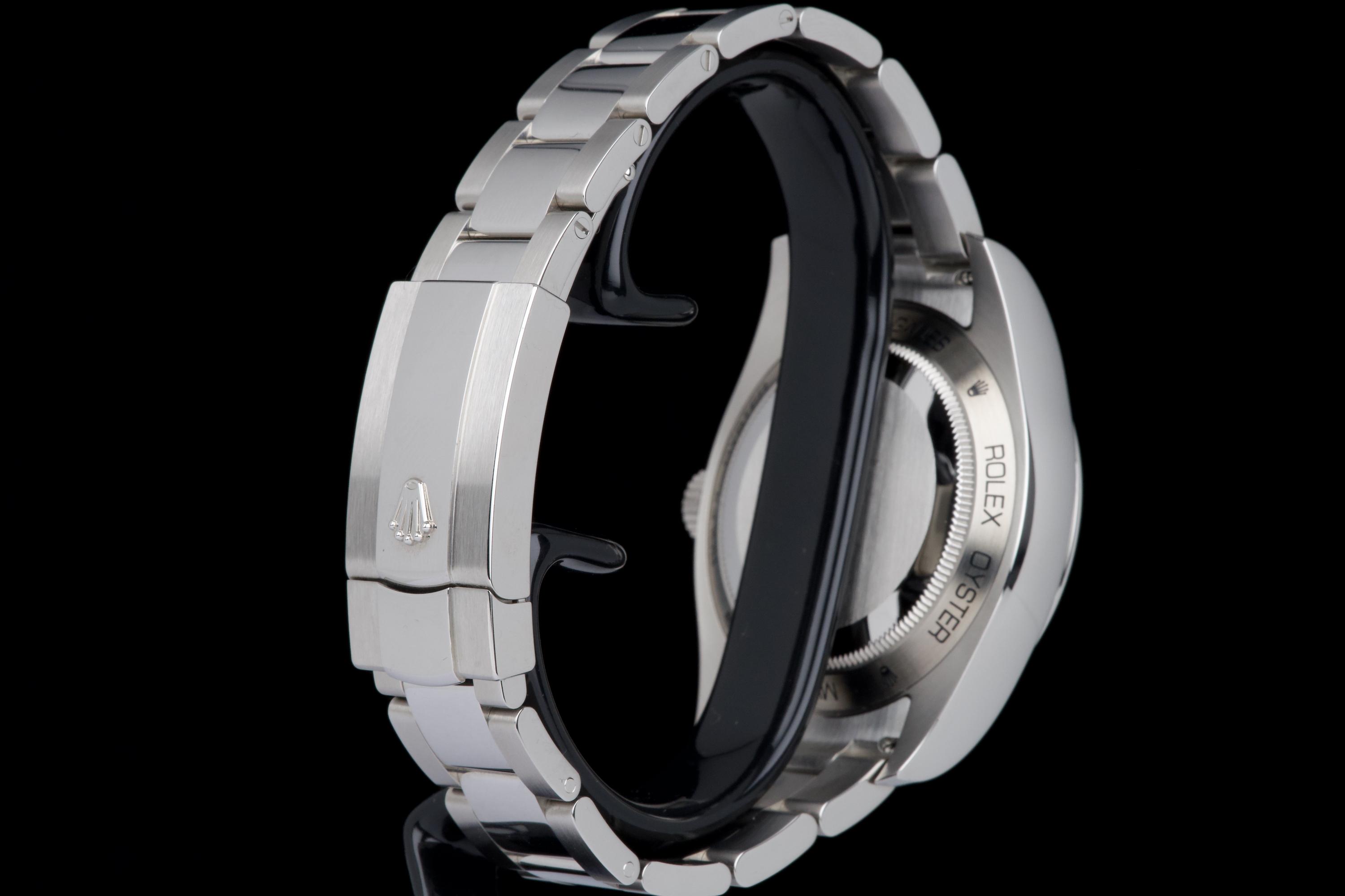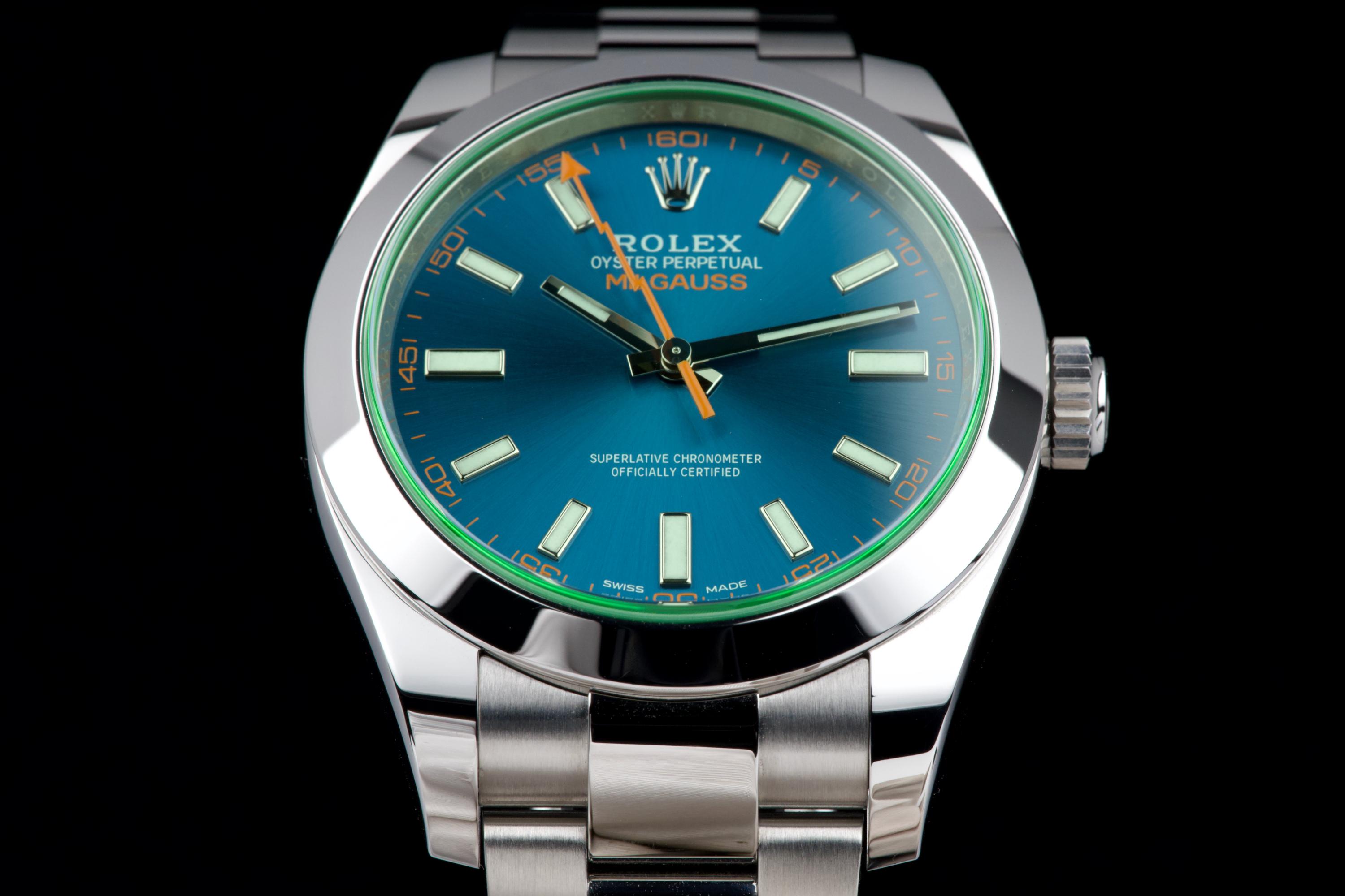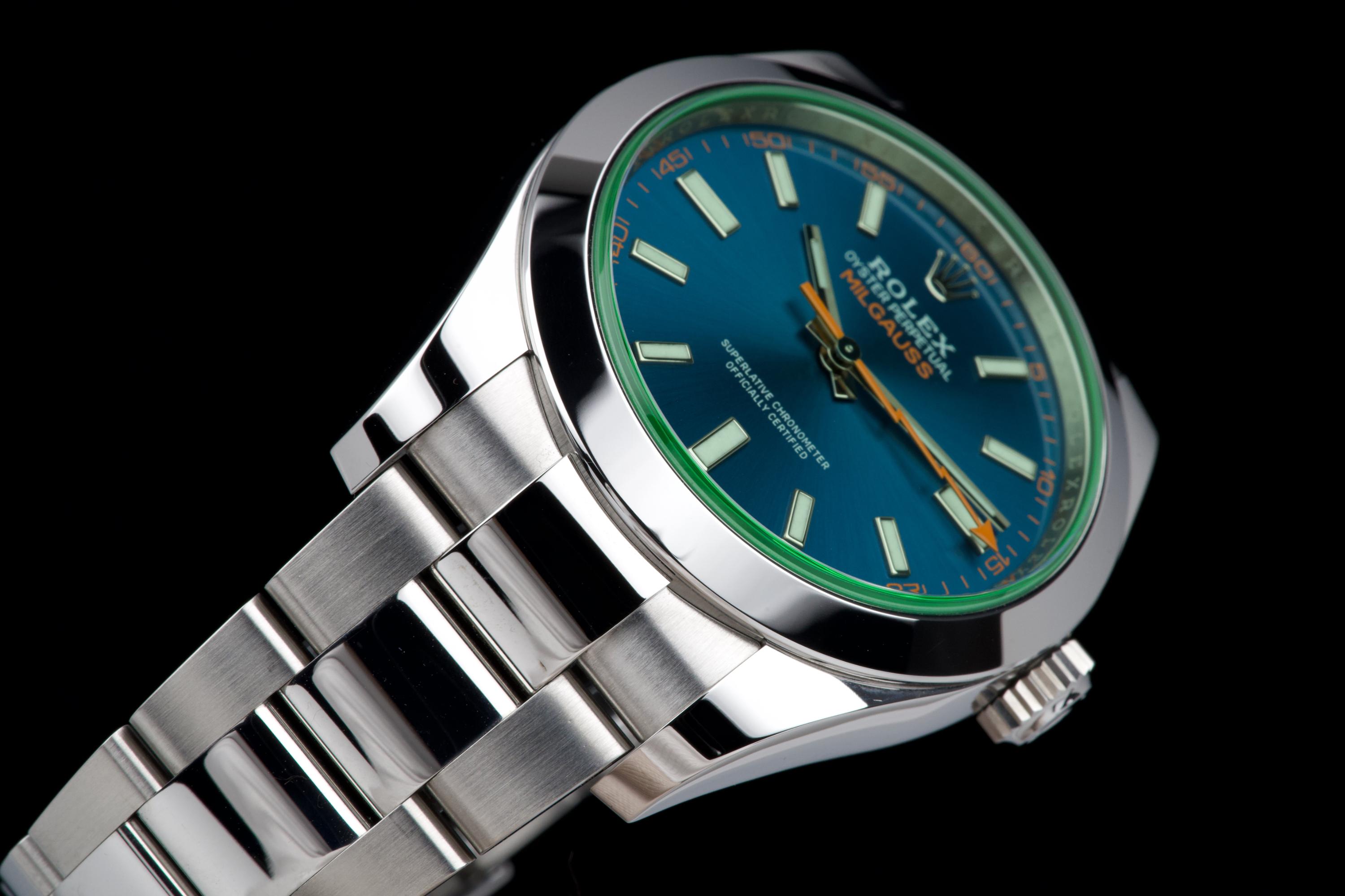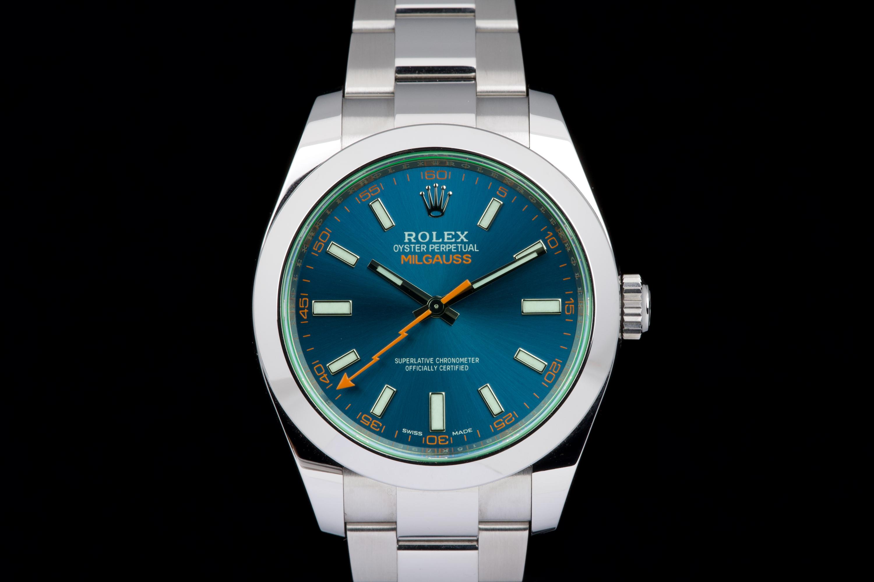 An unworn example of the Rolex Milgauss 116400GV, featuring the striking Z-Blue sunburst dial under the signature green sapphire crystal. The 40 mm stainless steel case remains in factory condition, with no signs of wear. Powered by the Rolex caliber 3131, specifically engineered for anti-magnetic resistance, combining precision and durability. Complete with its original box, 2022 warranty card, booklets, and accessories. A perfect collector-grade example of the now discontinued Milgauss 116400GV.