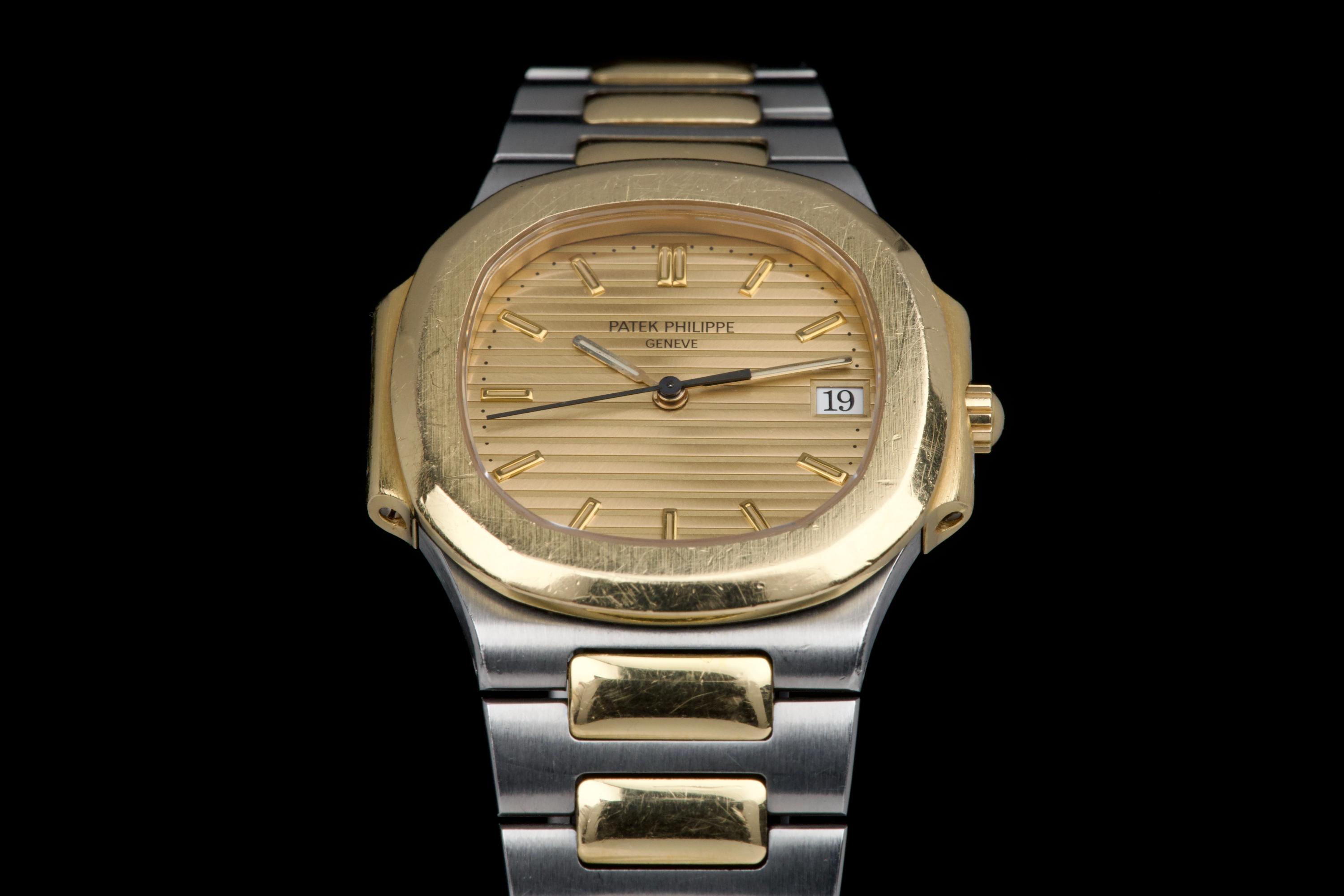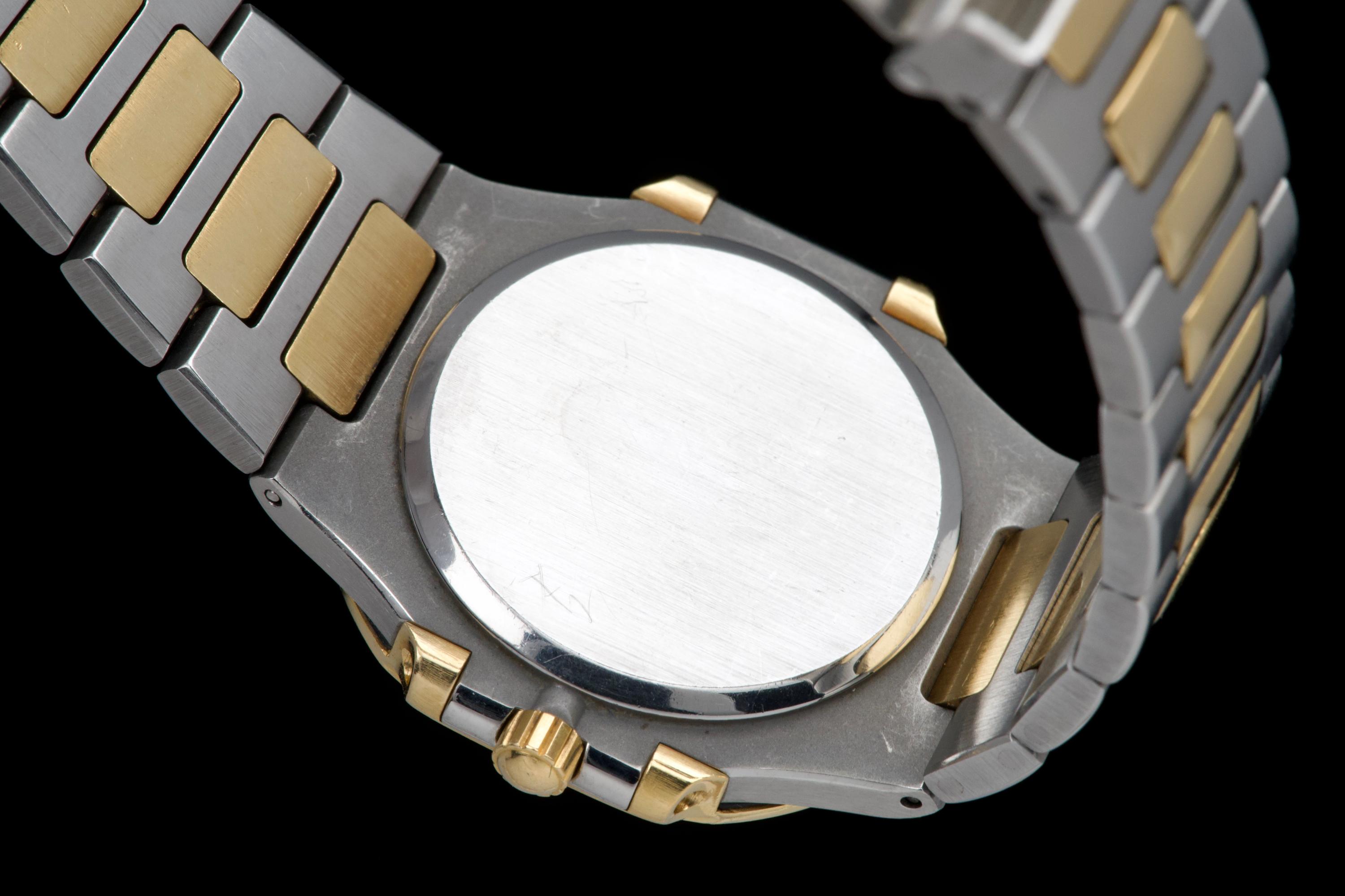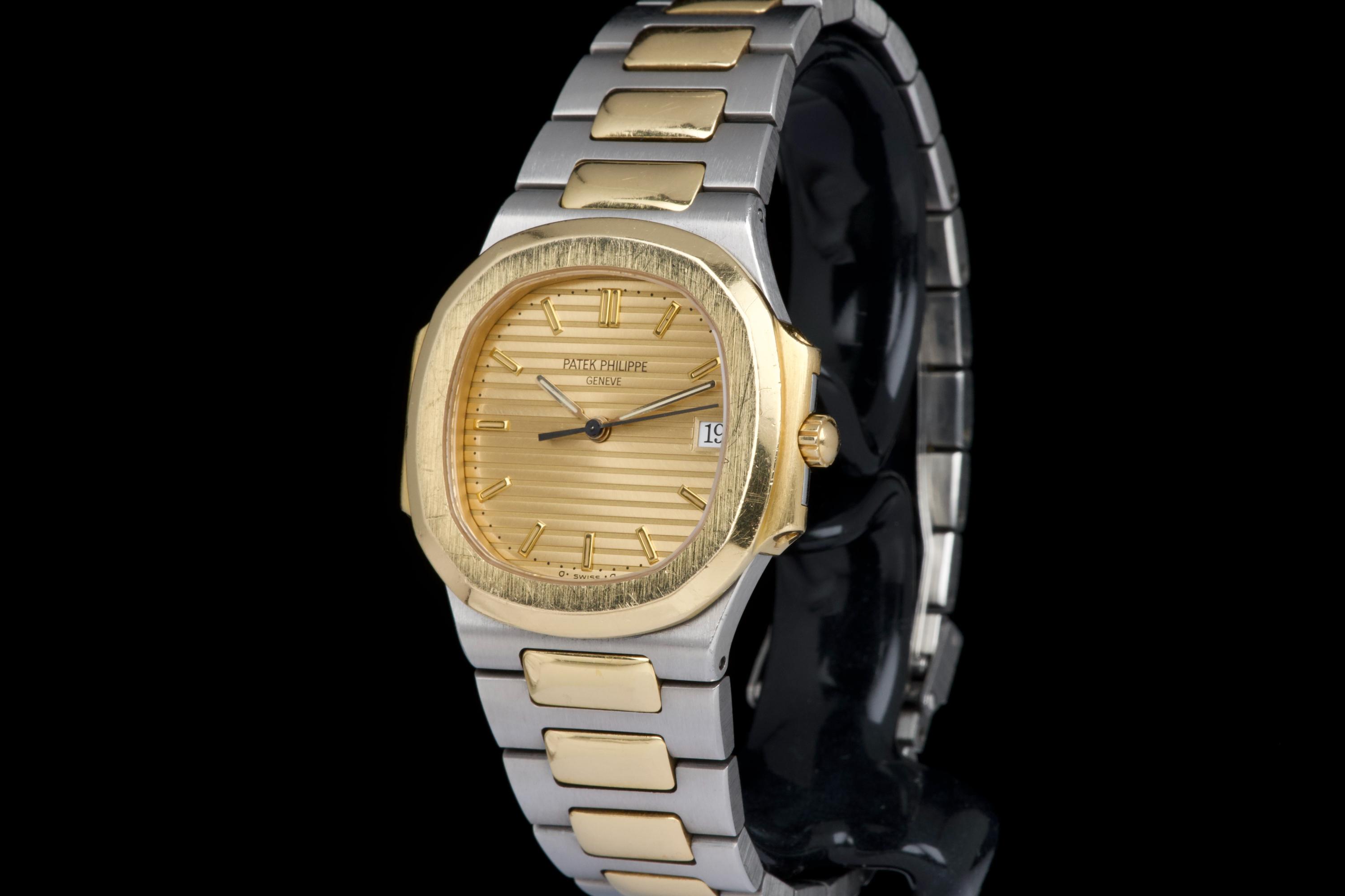 The present Patek Philippe Nautilus reference 3900, measuring 33 mm and executed in two-tone stainless steel and yellow gold, dates from the early 1990s and is offered in highly attractive and honest original condition. This example comes directly from its original owner, although the box and papers have unfortunately been misplaced over time. The case appears unpolished and shows wear consistent with age and careful use, retaining its original proportions and character. The bracelet remains in excellent condition with extremely little stretch and includes a generous number of links, comfortably fitting a wrist of up to approximately 18.5 cm, a particularly desirable attribute for this reference. The watch is fitted with an excellent original champagne “sigma” tritium dial, preserved in very fine condition. The tritium hour markers display attractive, even ageing, while the tritium hands have aged a few shades lighter, a natural and commonly observed phenomenon that adds to the watch’s vintage charm without detracting from its overall harmony. Powered by a quartz movement, the watch has had its battery replaced and is in perfect working order at the time of cataloguing, offering the convenience and reliability that defined Patek Philippe’s high-end quartz production of the period. Elegant, understated, and increasingly appreciated by collectors, this Nautilus 3900 represents a compelling opportunity to acquire a well-preserved early two-tone Nautilus with strong originality, excellent wearability, and appealing first-owner provenance