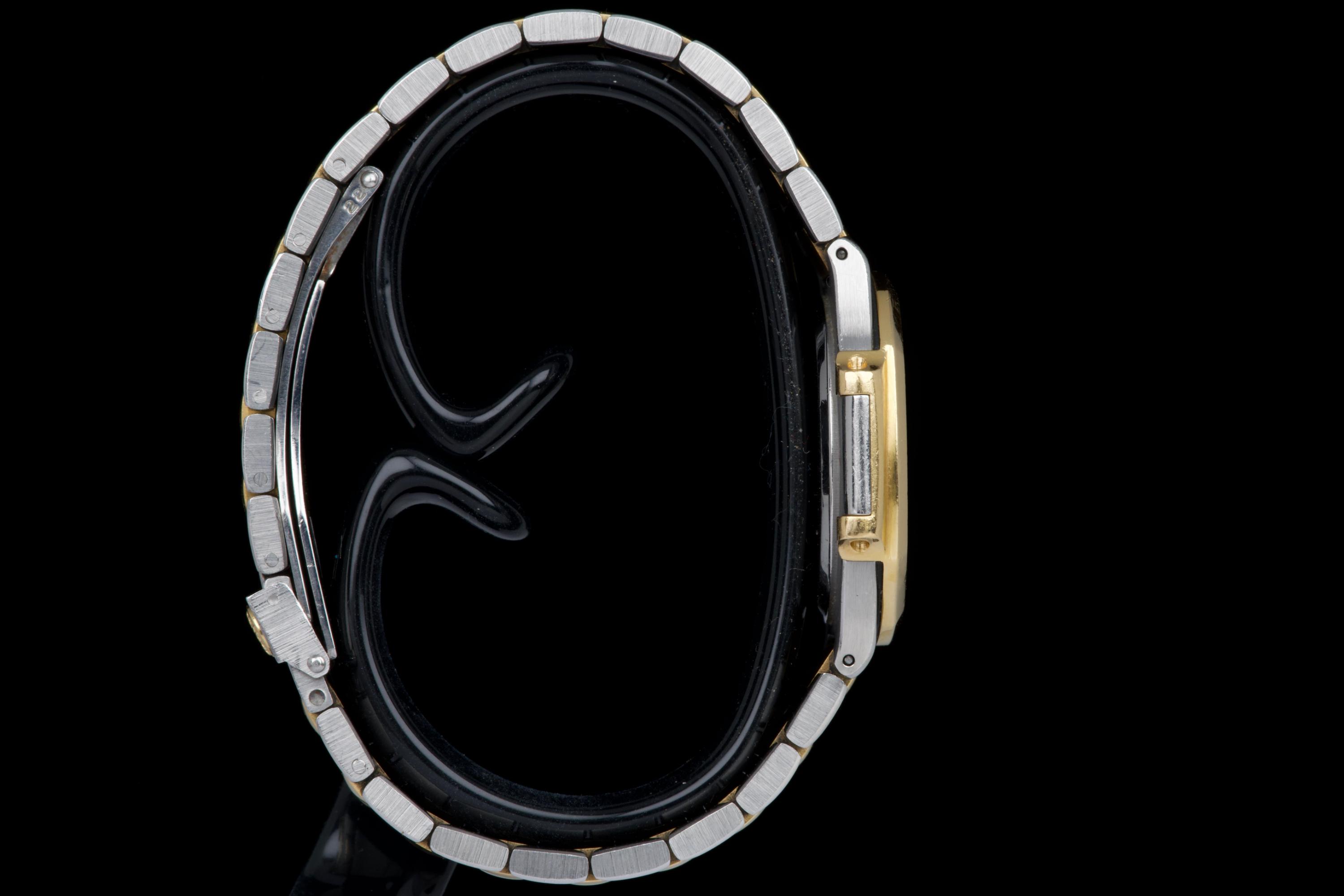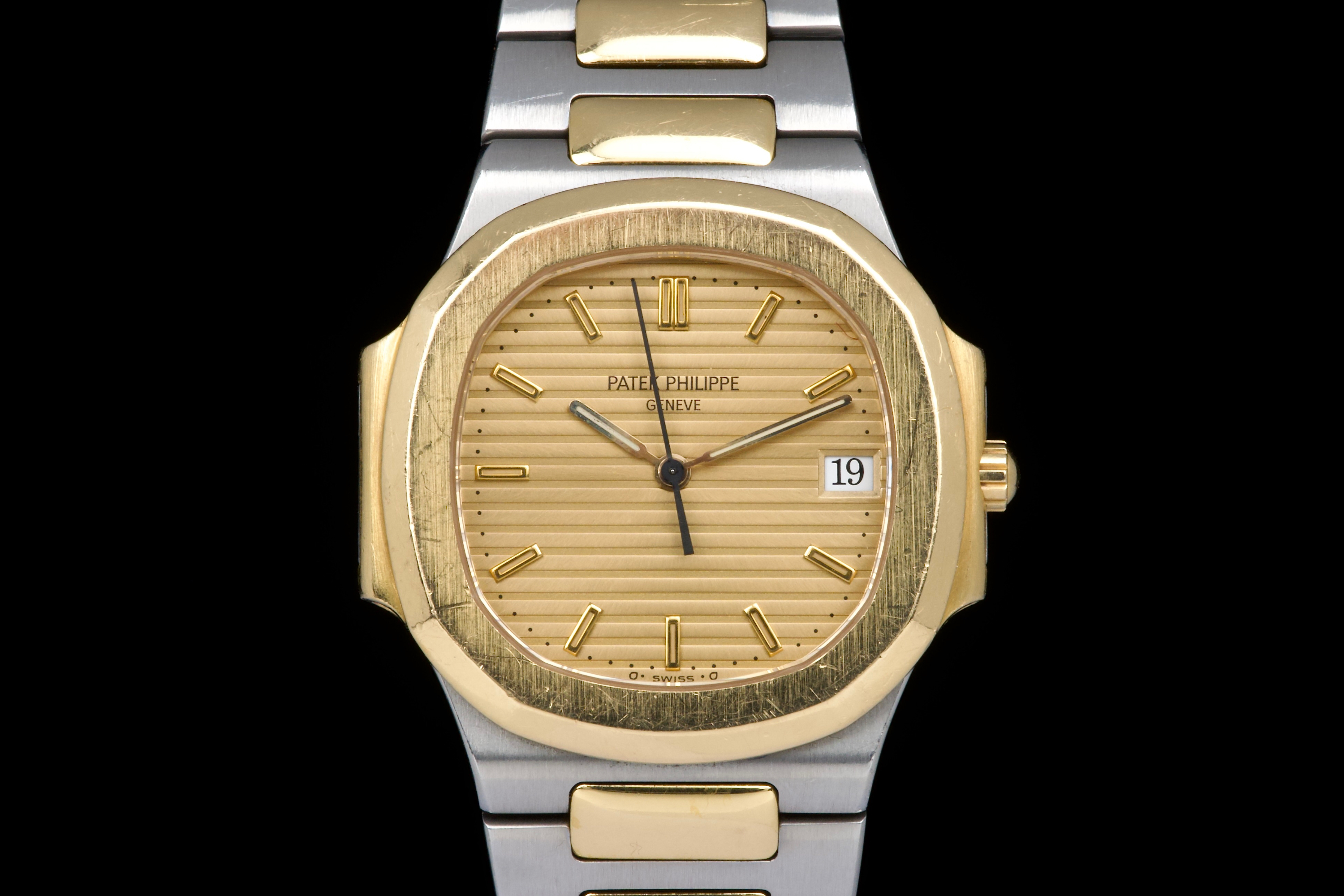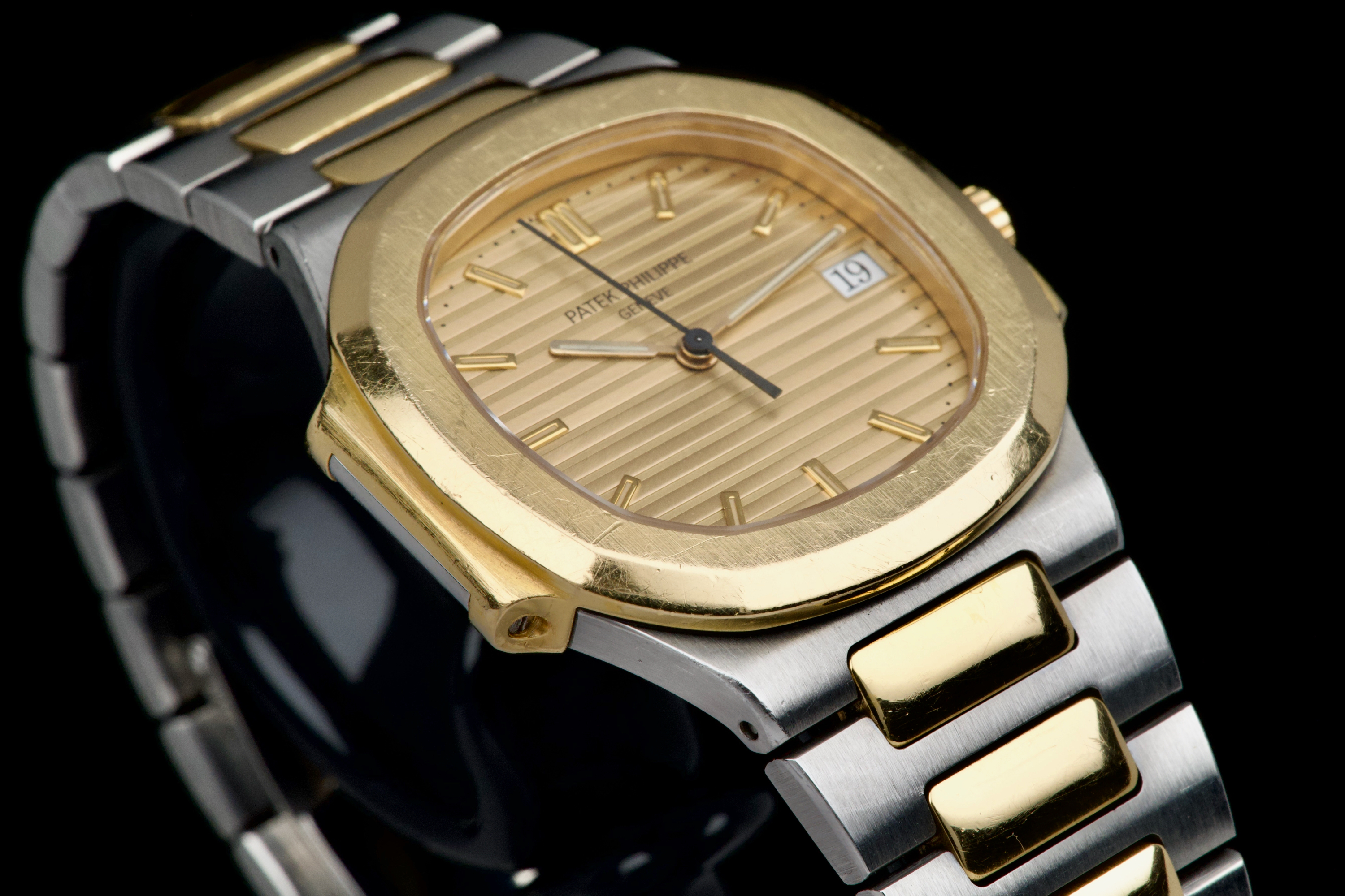 The present Patek Philippe Nautilus reference 3900, measuring 33 mm and executed in two-tone stainless steel and yellow gold, dates from the early 1990s and is offered in highly attractive and honest original condition. This example comes directly from its original owner, although the box and papers have unfortunately been misplaced over time. The case appears unpolished and shows wear consistent with age and careful use, retaining its original proportions and character. The bracelet remains in excellent condition with extremely little stretch and includes a generous number of links, comfortably fitting a wrist of up to approximately 18.5 cm, a particularly desirable attribute for this reference. The watch is fitted with an excellent original champagne “sigma” tritium dial, preserved in very fine condition. The tritium hour markers display attractive, even ageing, while the tritium hands have aged a few shades lighter, a natural and commonly observed phenomenon that adds to the watch’s vintage charm without detracting from its overall harmony. Powered by a quartz movement, the watch has had its battery replaced and is in perfect working order at the time of cataloguing, offering the convenience and reliability that defined Patek Philippe’s high-end quartz production of the period. Elegant, understated, and increasingly appreciated by collectors, this Nautilus 3900 represents a compelling opportunity to acquire a well-preserved early two-tone Nautilus with strong originality, excellent wearability, and appealing first-owner provenance
