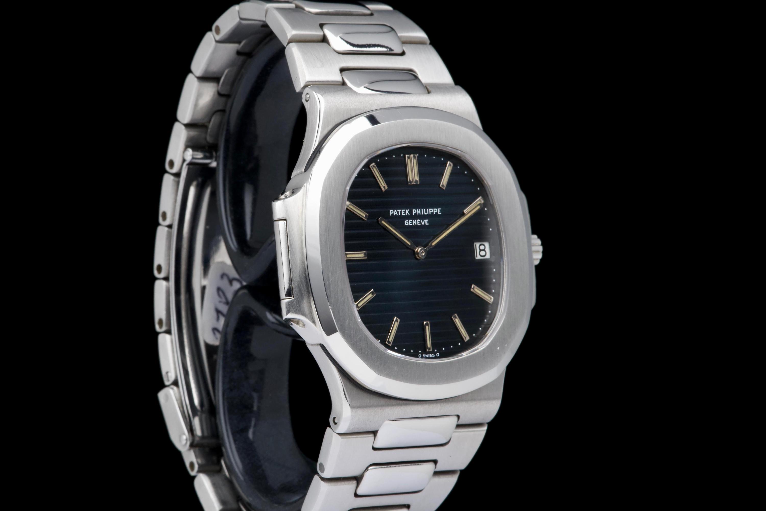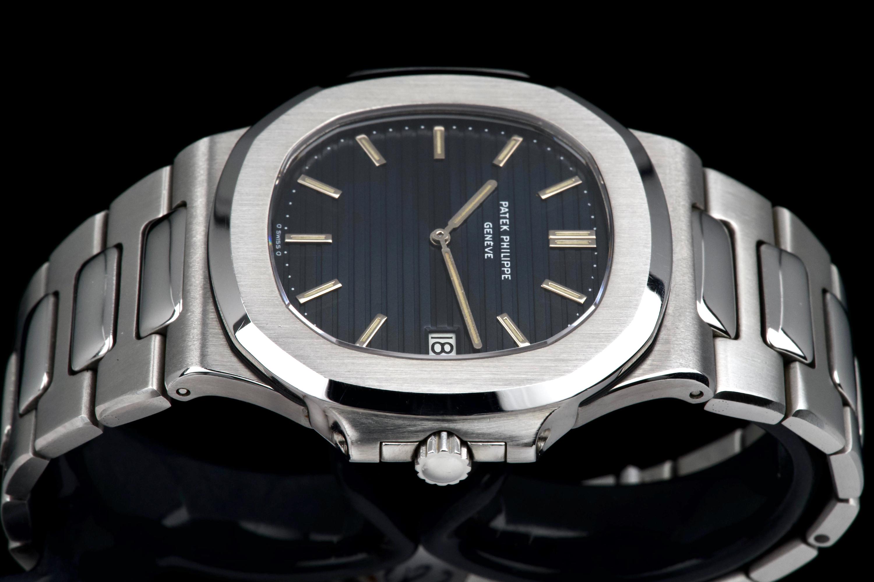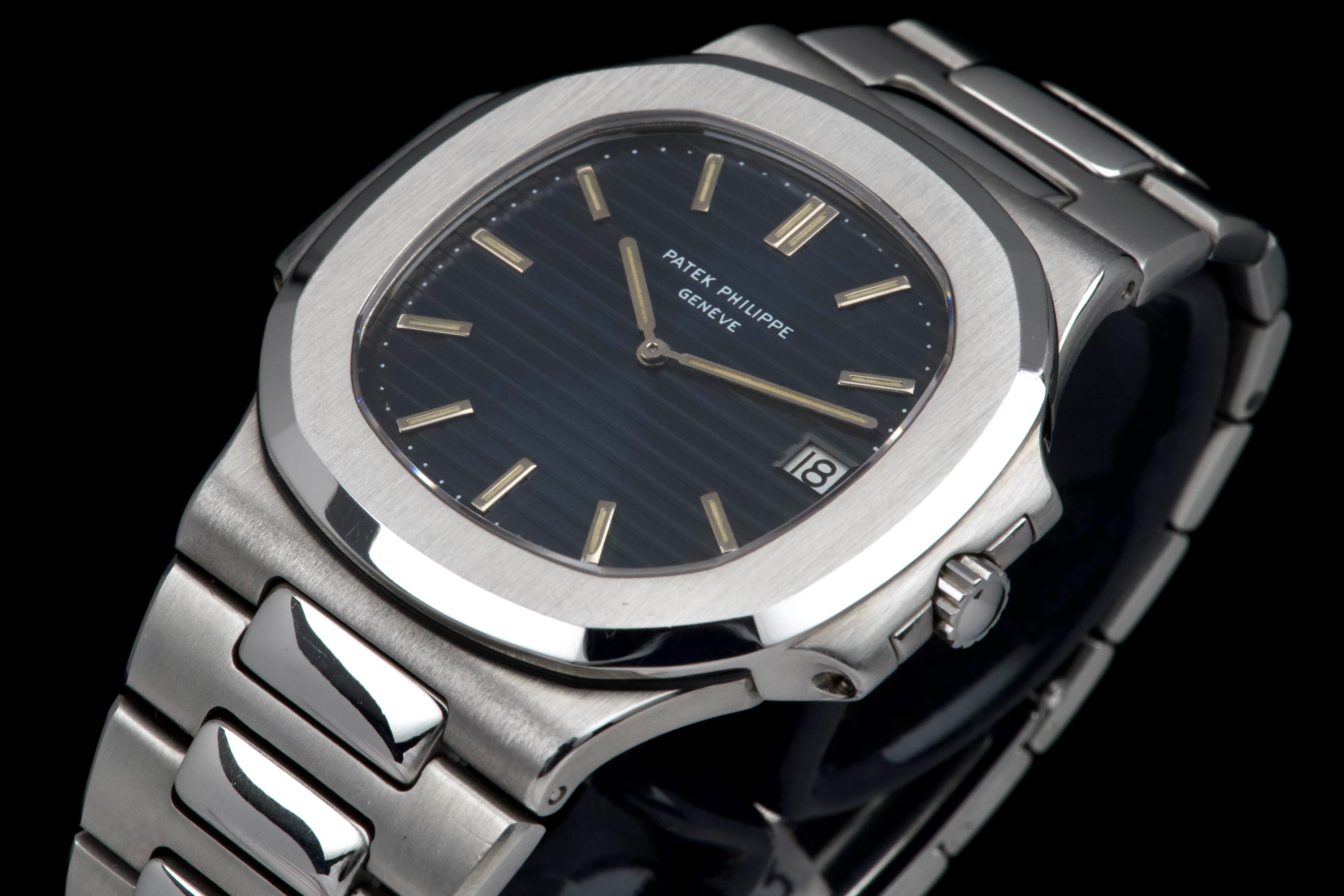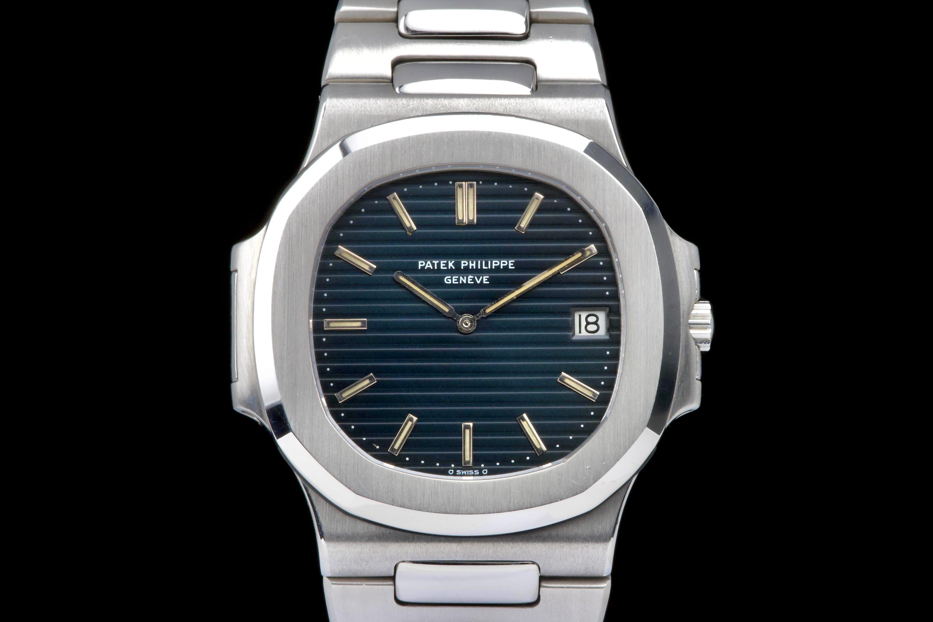 The present Patek Philippe Nautilus reference 3700/1, dating to 1978, is a superb and highly attractive example of Gérald Genta’s most iconic sports watch, preserved in outstanding overall condition and representing a particularly high-quality specimen of this landmark reference. The stainless-steel case has been very lightly polished in the past and now shows only light wear consistent with careful use. Importantly, the bezel remains well defined, symmetrical, and sharp, retaining its original geometry and crisp edges—an essential characteristic for discerning collectors of early Nautilus models. The watch is fitted with the highly desirable “large” integrated bracelet, preserved in excellent condition with very little stretch. Notably, the bracelet is sufficiently tight that the watch can stand upright when placed on its clasp, a strong indicator of exceptional bracelet integrity. The clasp is original and correct for the period. The original Mk II dial is truly outstanding, displaying a deep and vibrant navy blue tone with remarkable richness and freshness. The hands match perfectly, creating a harmonious and coherent aesthetic. The original date disc is also present, further underscoring the originality and quality of this example. The watch is accompanied by an Extract from the Archives, confirming production in 1978 and original sale in June 1980, adding important historical documentation and further strengthening the provenance of the piece. Altogether, this Nautilus 3700 Mk II stands out as a particularly high-grade example, combining a strong case, exceptional bracelet condition, a sublime original dial, and confirmed archival documentation. A watch of this quality represents a rare opportunity to acquire one of the most important and collectible sports watches of the 20th century in truly outstanding condition.