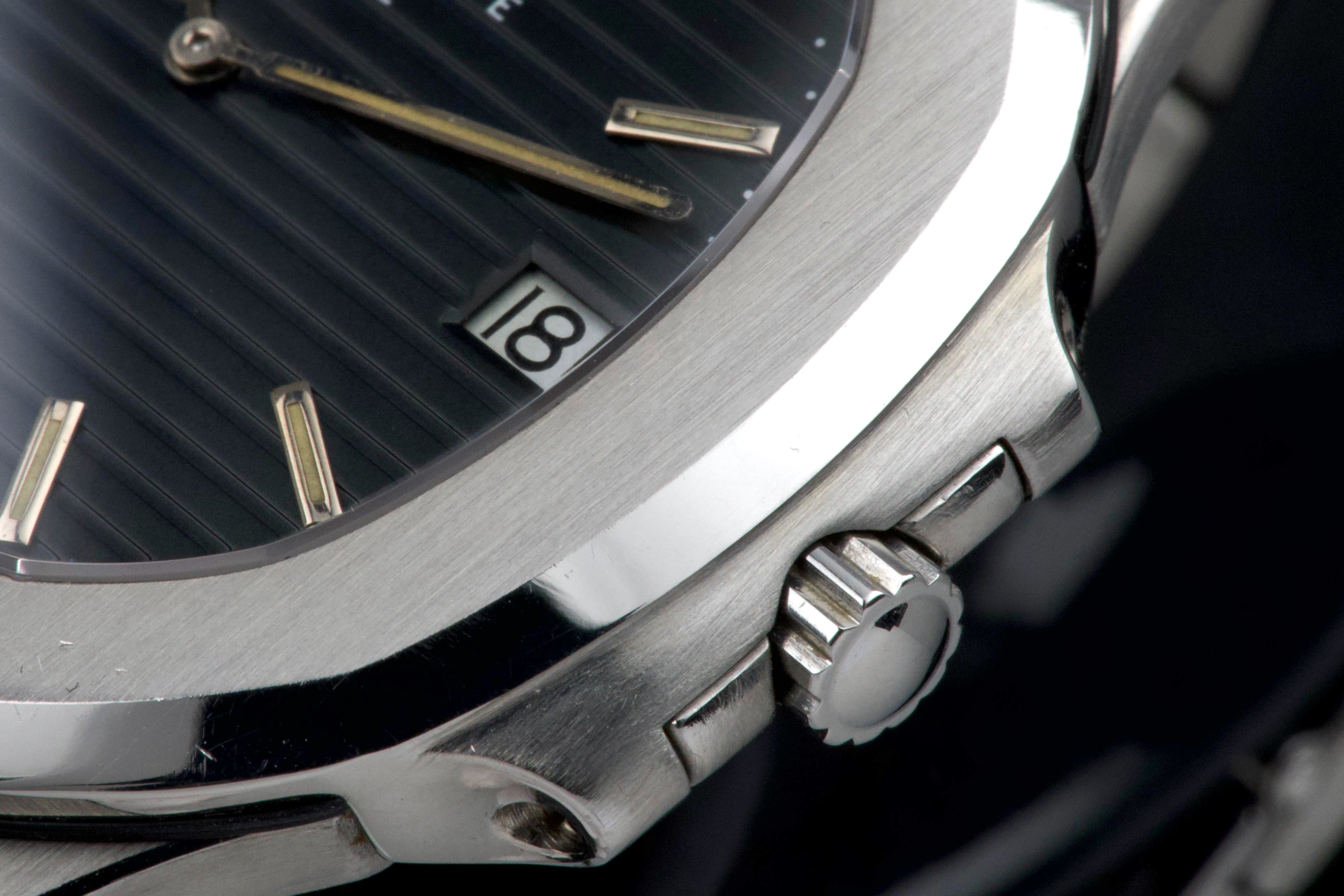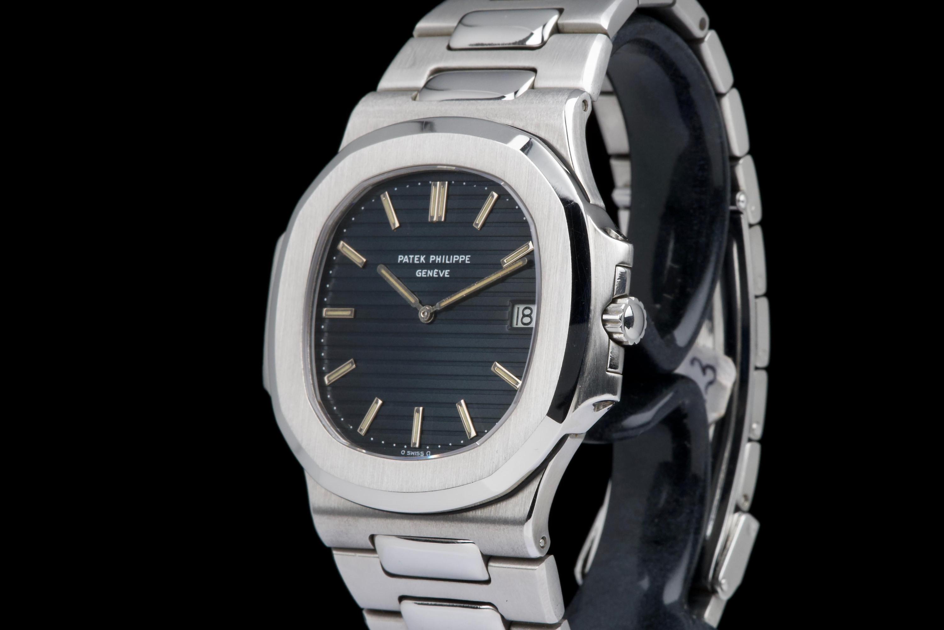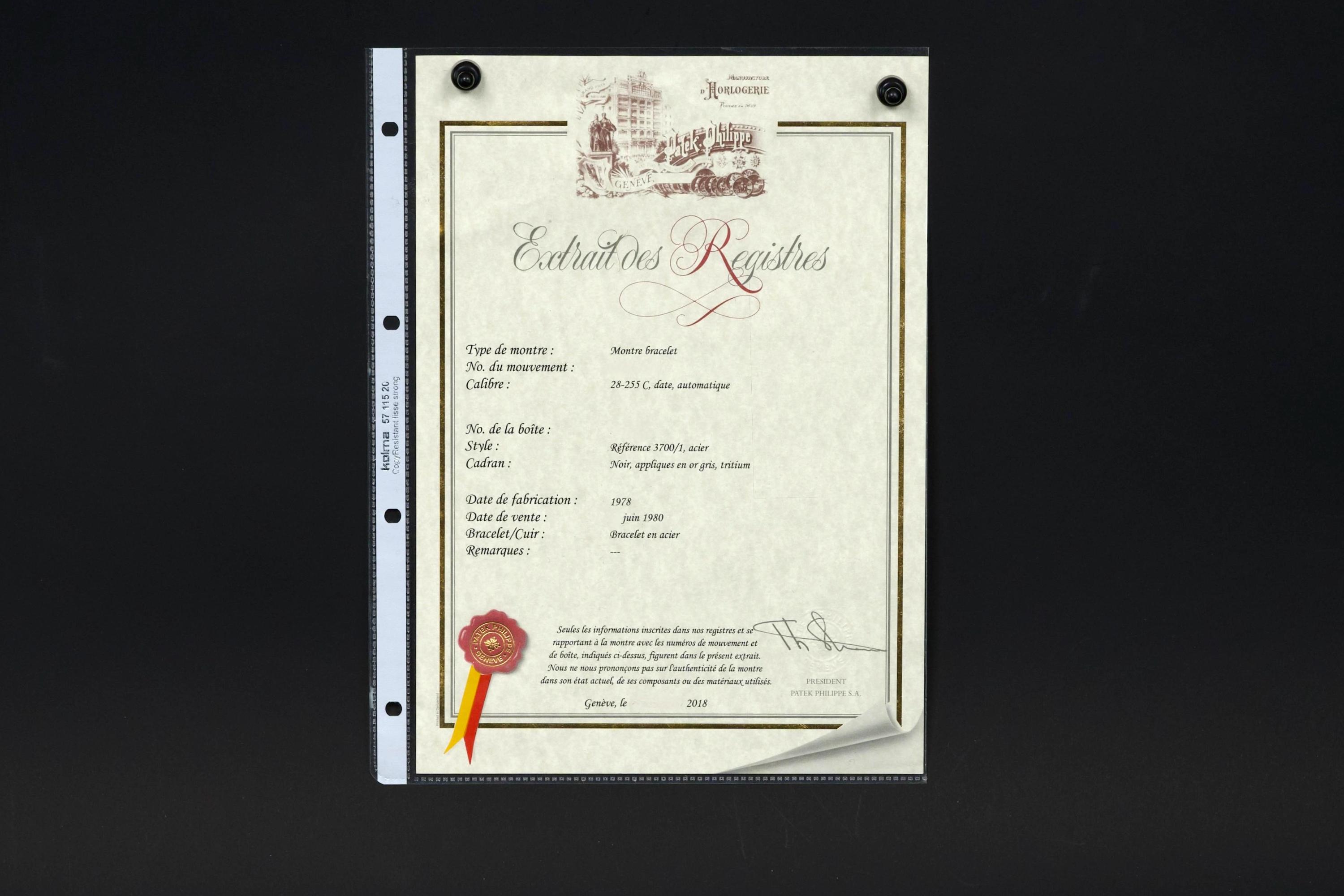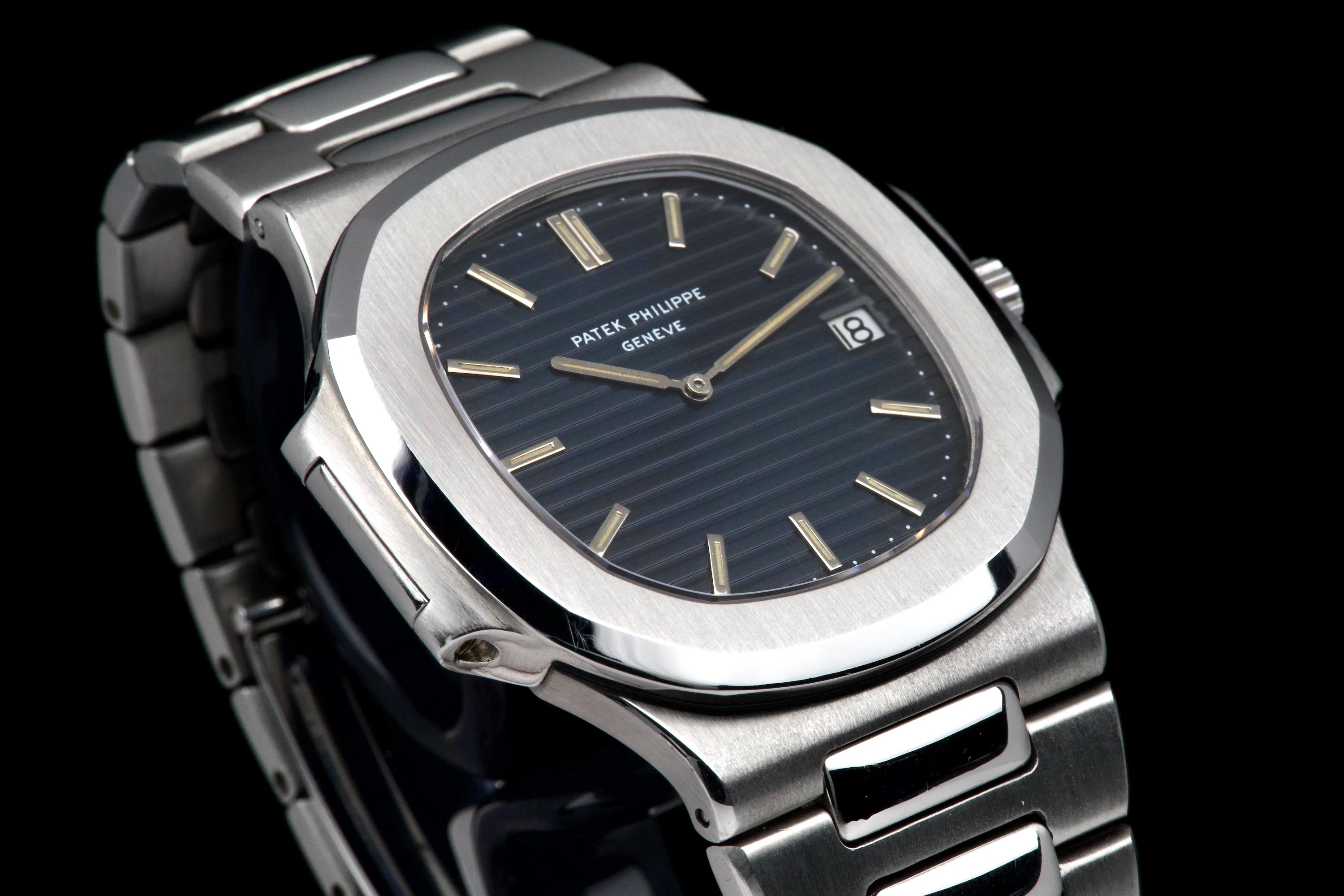 The present Patek Philippe Nautilus reference 3700/1, dating to 1978, is a superb and highly attractive example of Gérald Genta’s most iconic sports watch, preserved in outstanding overall condition and representing a particularly high-quality specimen of this landmark reference. The stainless-steel case has been very lightly polished in the past and now shows only light wear consistent with careful use. Importantly, the bezel remains well defined, symmetrical, and sharp, retaining its original geometry and crisp edges—an essential characteristic for discerning collectors of early Nautilus models. The watch is fitted with the highly desirable “large” integrated bracelet, preserved in excellent condition with very little stretch. Notably, the bracelet is sufficiently tight that the watch can stand upright when placed on its clasp, a strong indicator of exceptional bracelet integrity. The clasp is original and correct for the period. The original Mk II dial is truly outstanding, displaying a deep and vibrant navy blue tone with remarkable richness and freshness. The hands match perfectly, creating a harmonious and coherent aesthetic. The original date disc is also present, further underscoring the originality and quality of this example. The watch is accompanied by an Extract from the Archives, confirming production in 1978 and original sale in June 1980, adding important historical documentation and further strengthening the provenance of the piece. Altogether, this Nautilus 3700 Mk II stands out as a particularly high-grade example, combining a strong case, exceptional bracelet condition, a sublime original dial, and confirmed archival documentation. A watch of this quality represents a rare opportunity to acquire one of the most important and collectible sports watches of the 20th century in truly outstanding condition.
