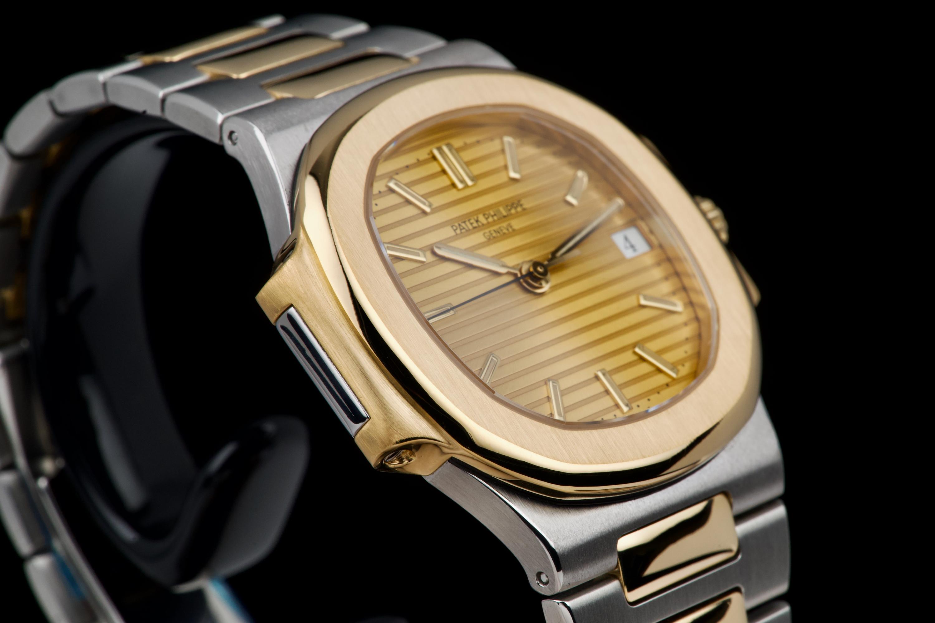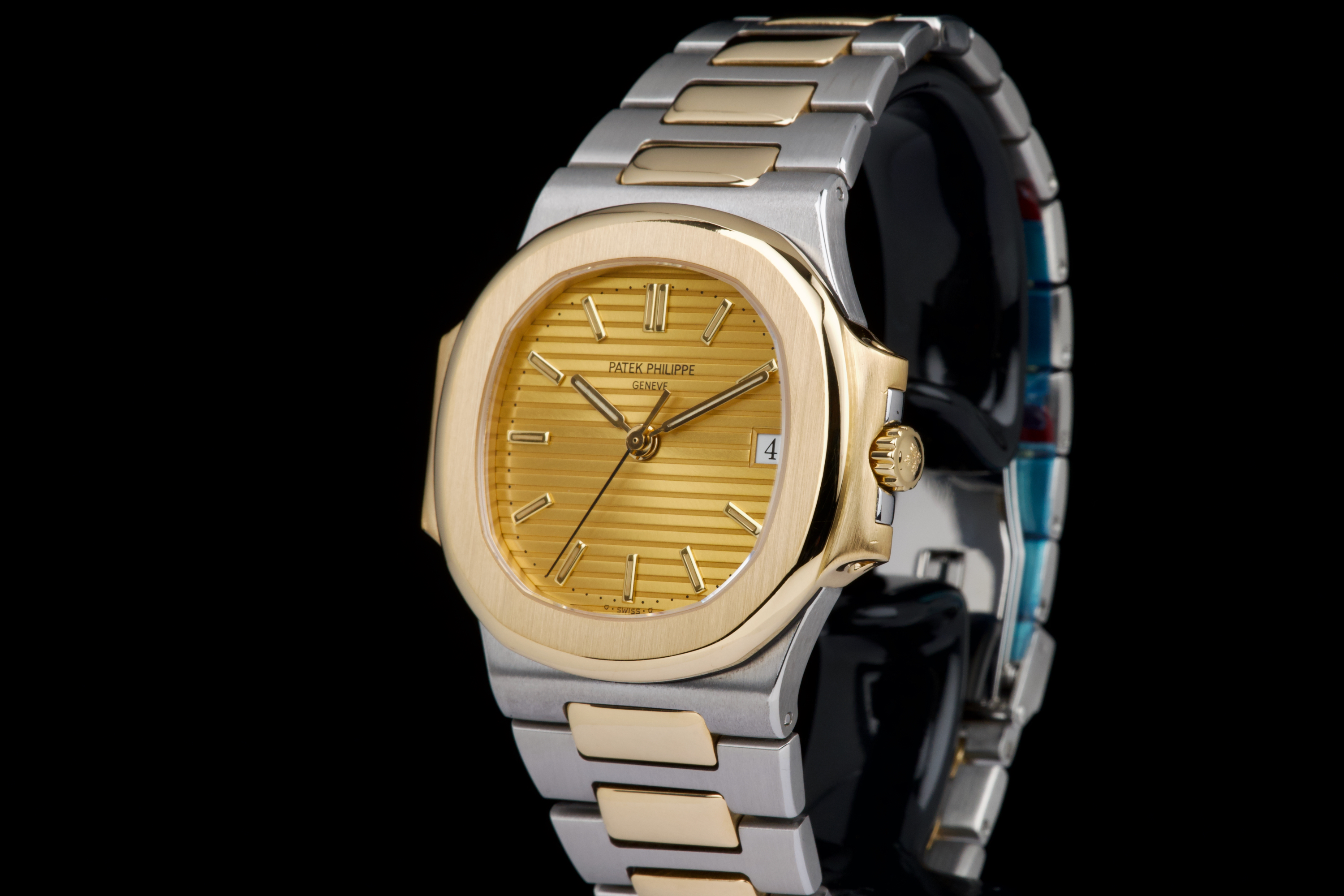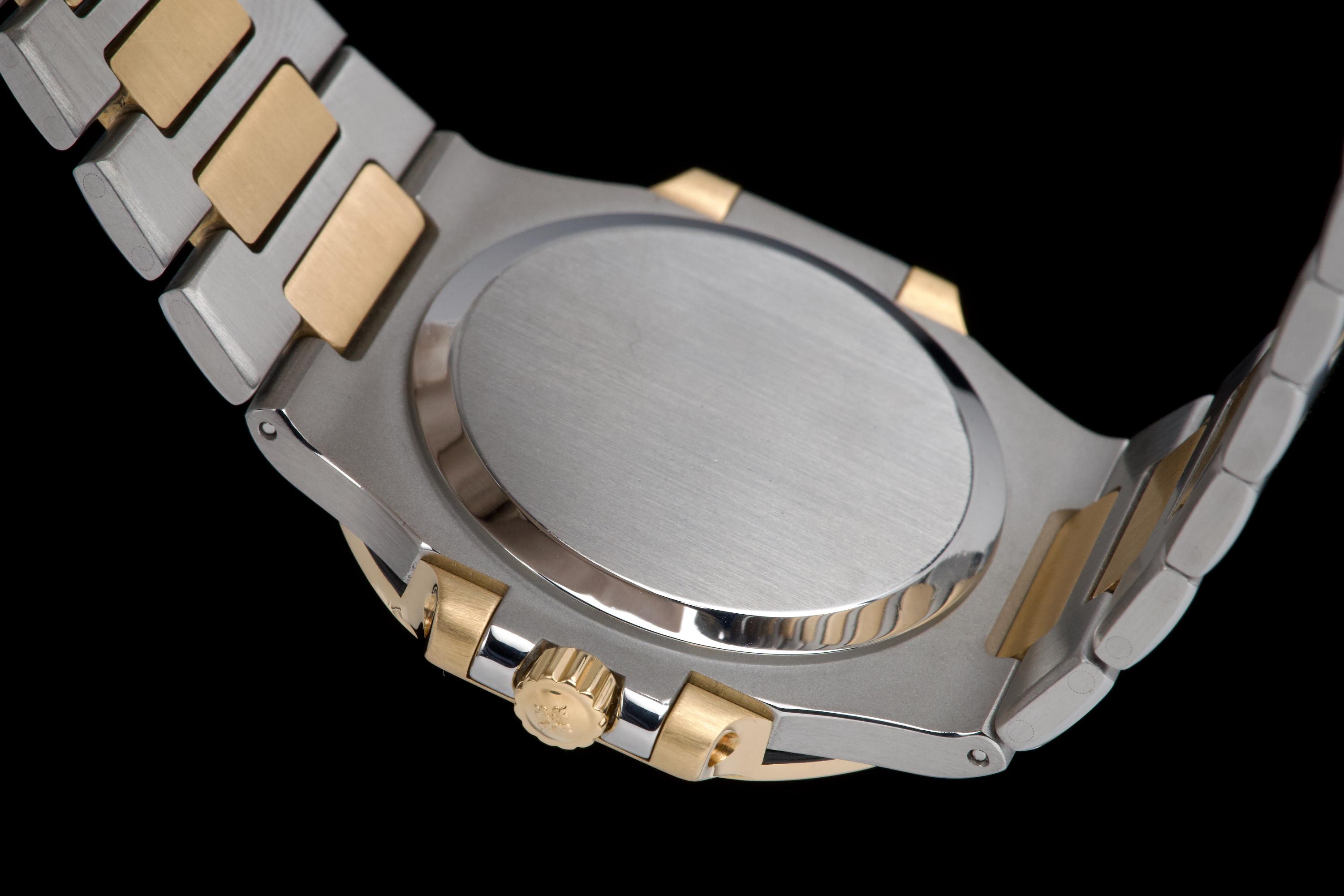 A beautiful and classic example of the two-tone Patek Philippe Nautilus reference 3800/1JA, featuring the sought-after gilt dial. This watch comes from its original owner and has just returned from a complete service and polish by Patek Philippein 2025. The original dial is flawless, with perfectly matching hands, and the two-tone gold and steel case and bracelet retain their crisp lines and elegant contrast. The bracelet shows moderate stretch from use, consistent with age. Accompanied by its original box, a copy of the Extract from the Archives confirming production in 1994 and sale in 1995, as well as the 2025 Patek Philippe service papers. A refined and timeless example of the Nautilus 3800 — beautifully maintained, freshly serviced, and preserved with its complete documentation.