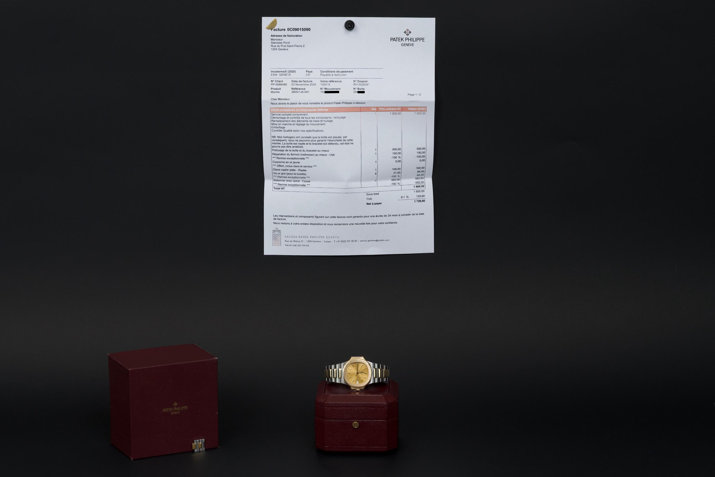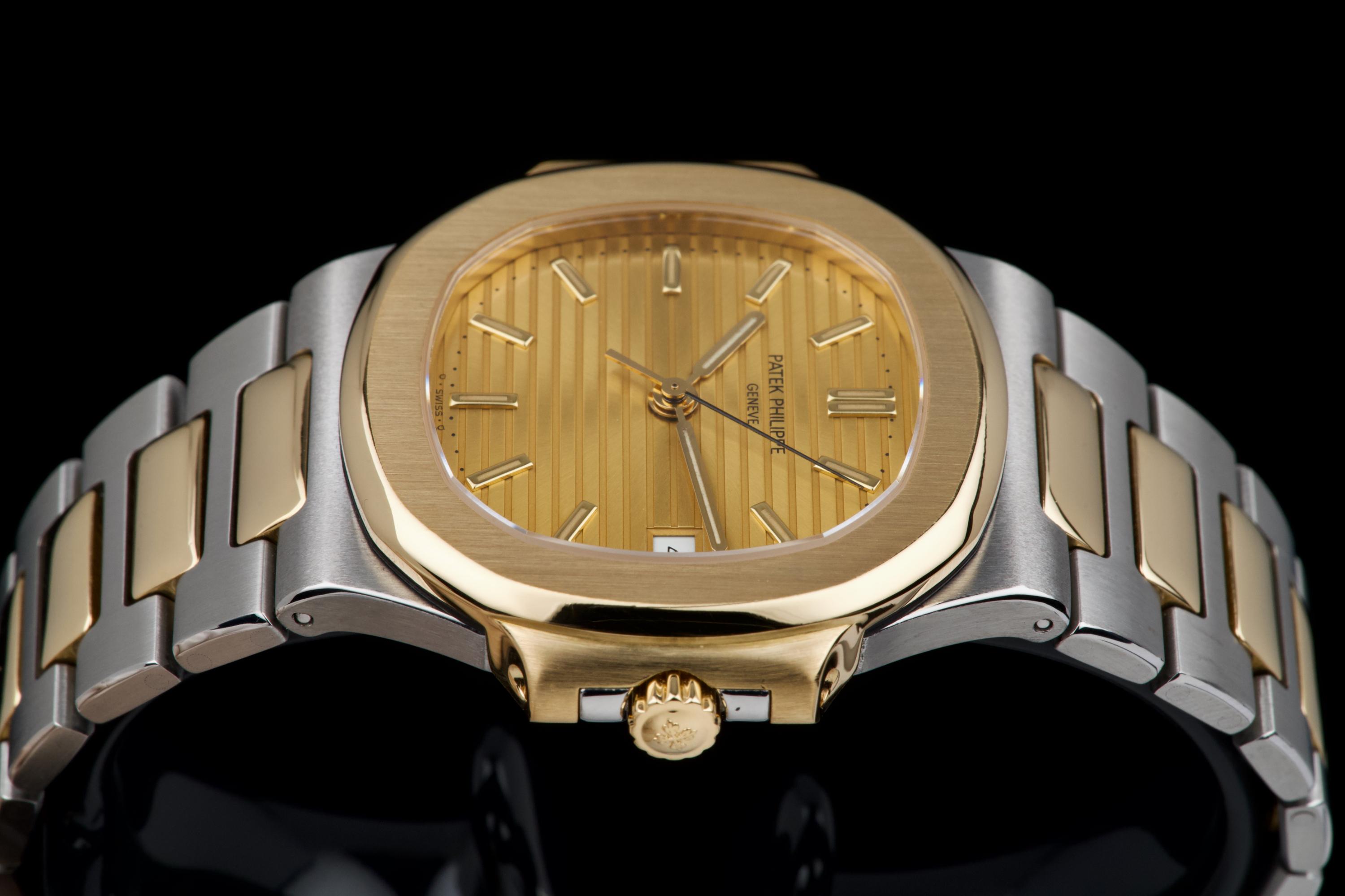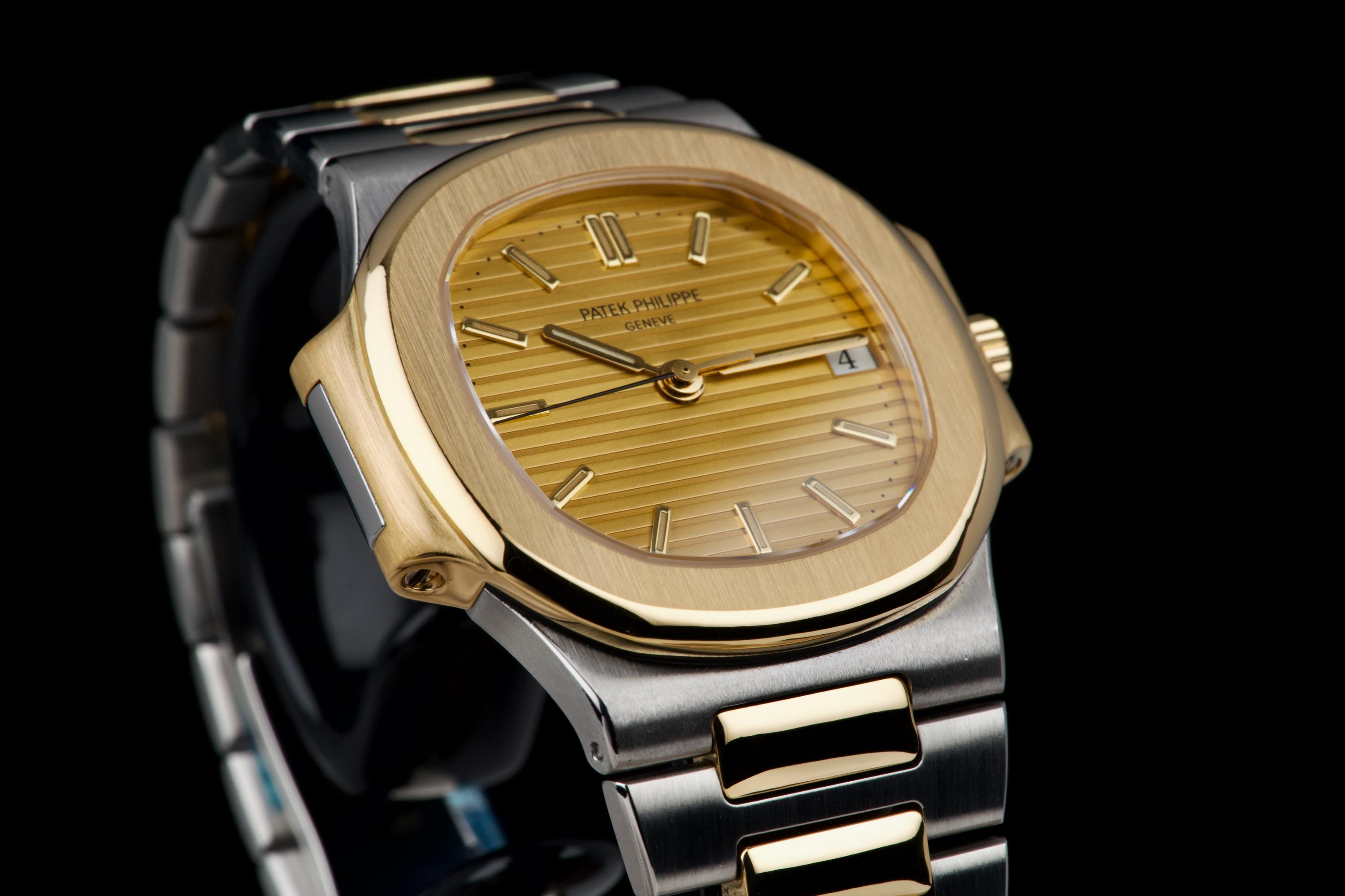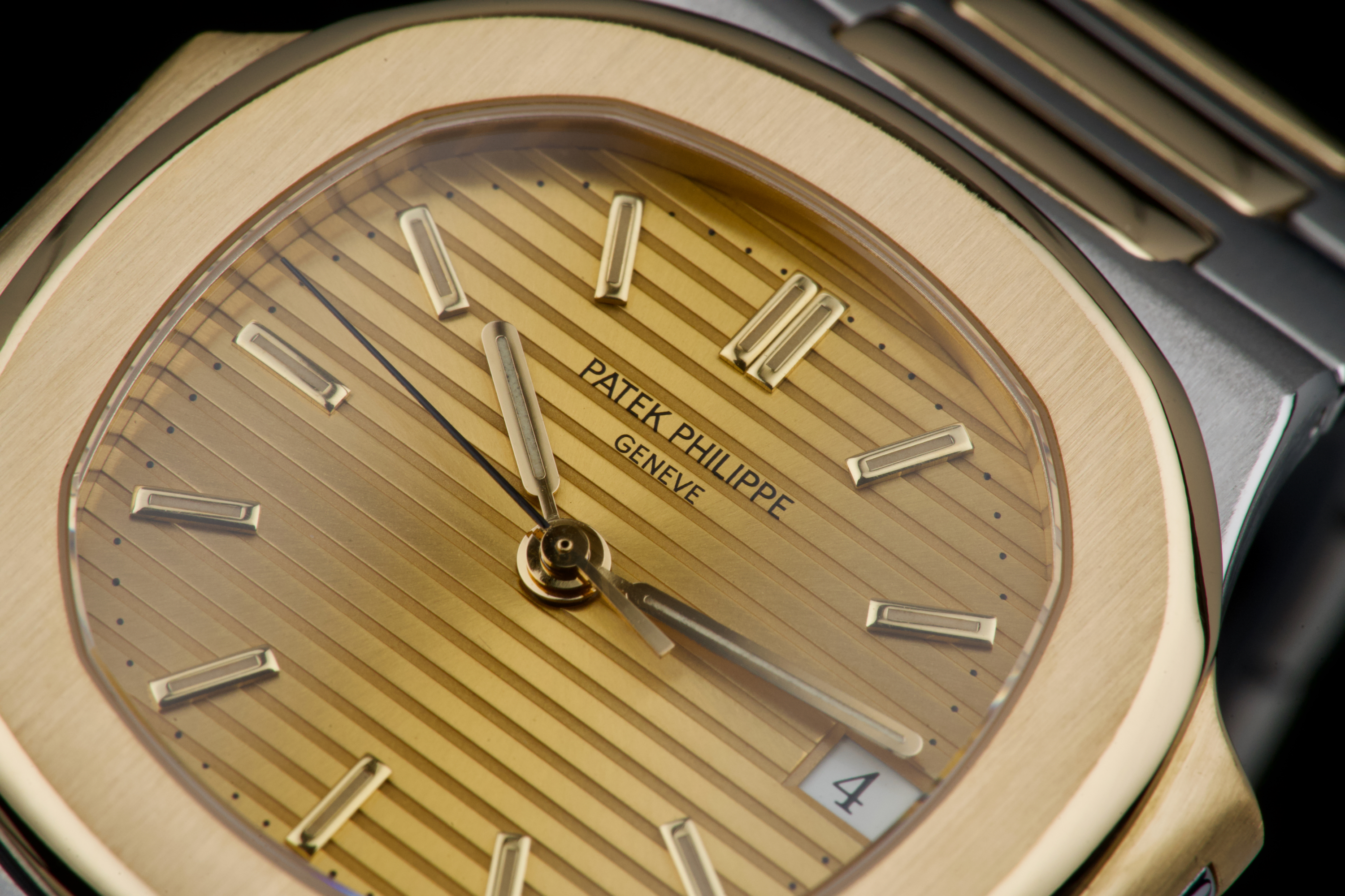 A beautiful and classic example of the two-tone Patek Philippe Nautilus reference 3800/1JA, featuring the sought-after gilt dial. This watch comes from its original owner and has just returned from a complete service and polish by Patek Philippein 2025. The original dial is flawless, with perfectly matching hands, and the two-tone gold and steel case and bracelet retain their crisp lines and elegant contrast. The bracelet shows moderate stretch from use, consistent with age. Accompanied by its original box, a copy of the Extract from the Archives confirming production in 1994 and sale in 1995, as well as the 2025 Patek Philippe service papers. A refined and timeless example of the Nautilus 3800 — beautifully maintained, freshly serviced, and preserved with its complete documentation.