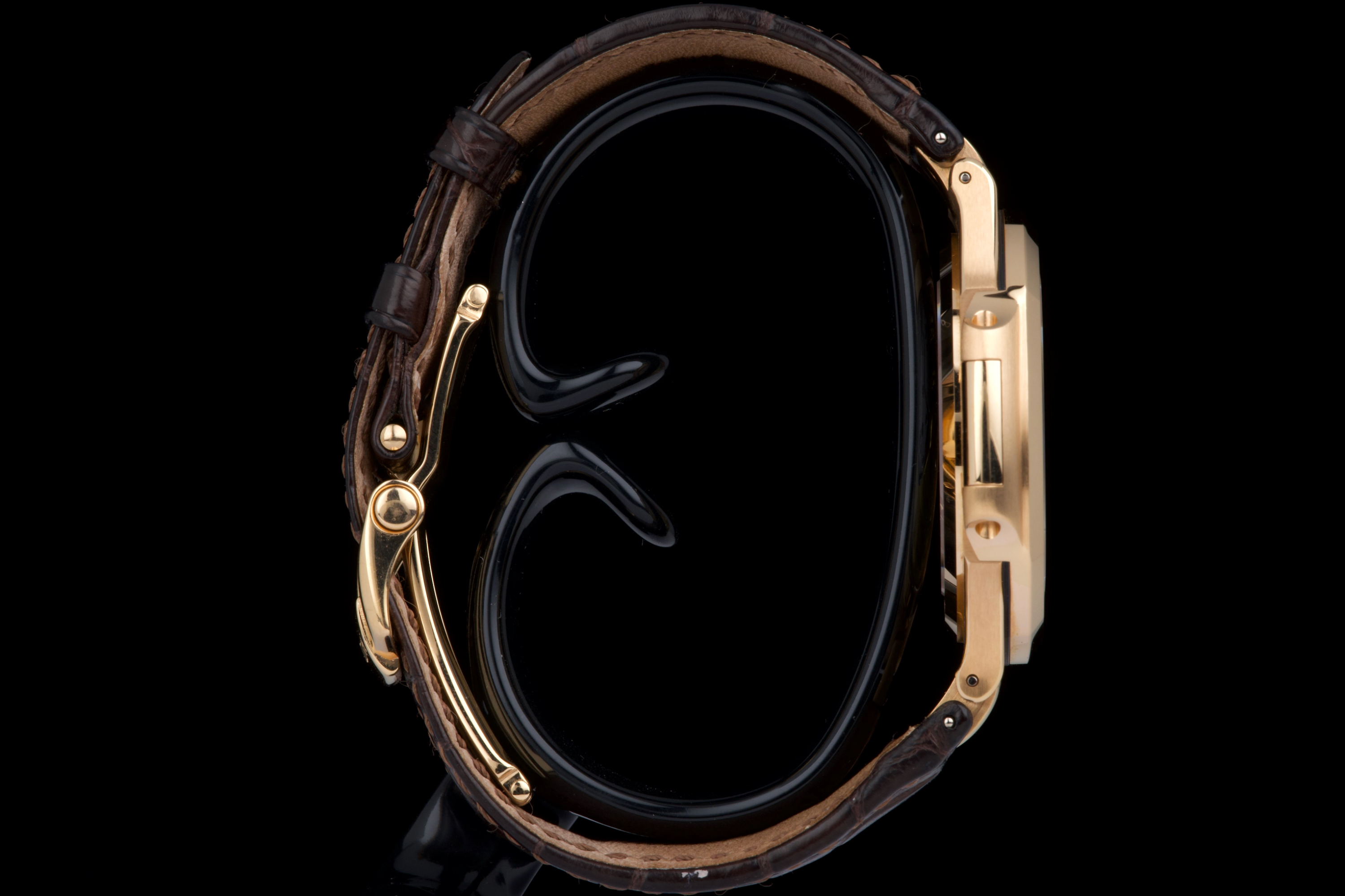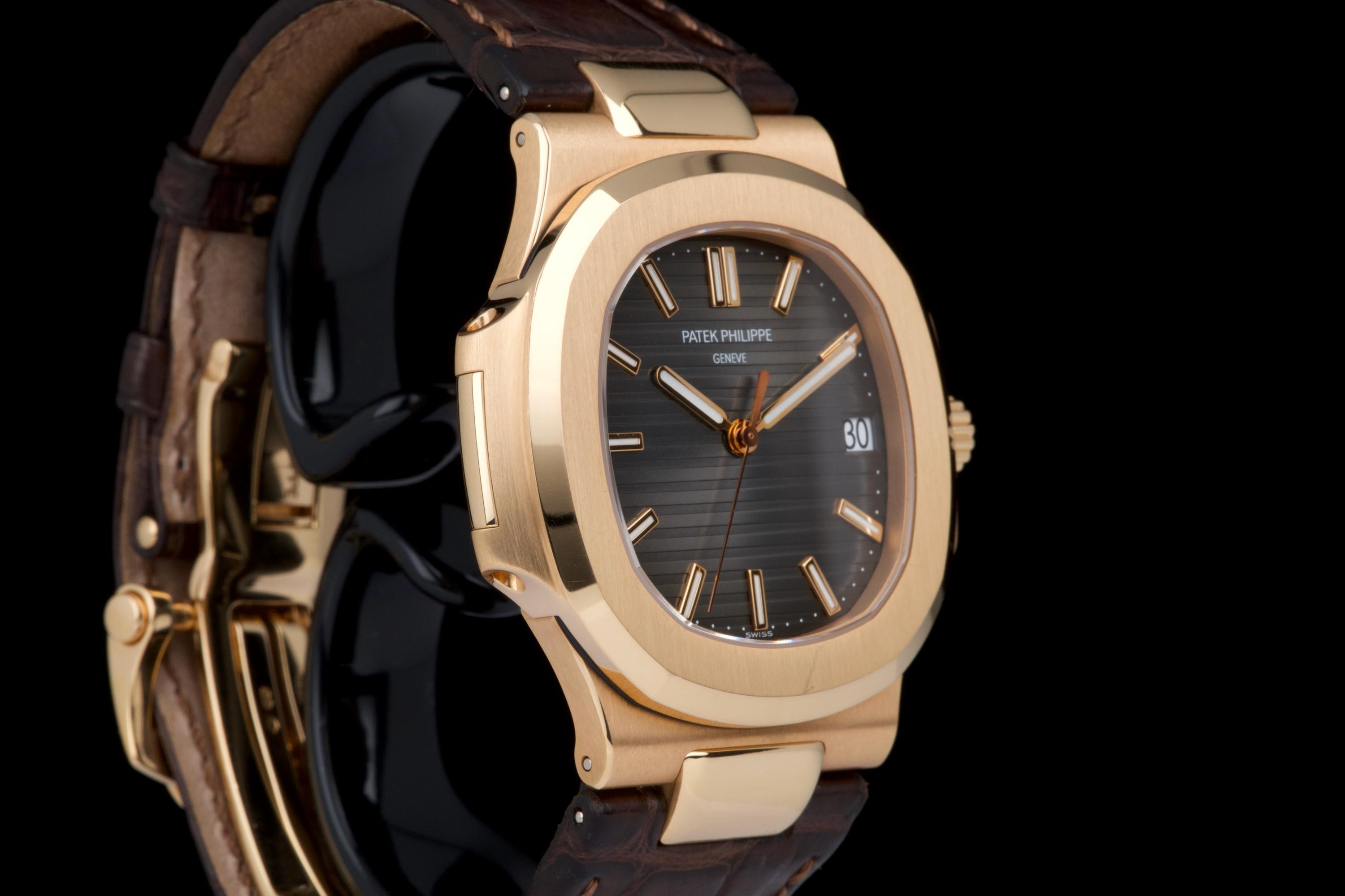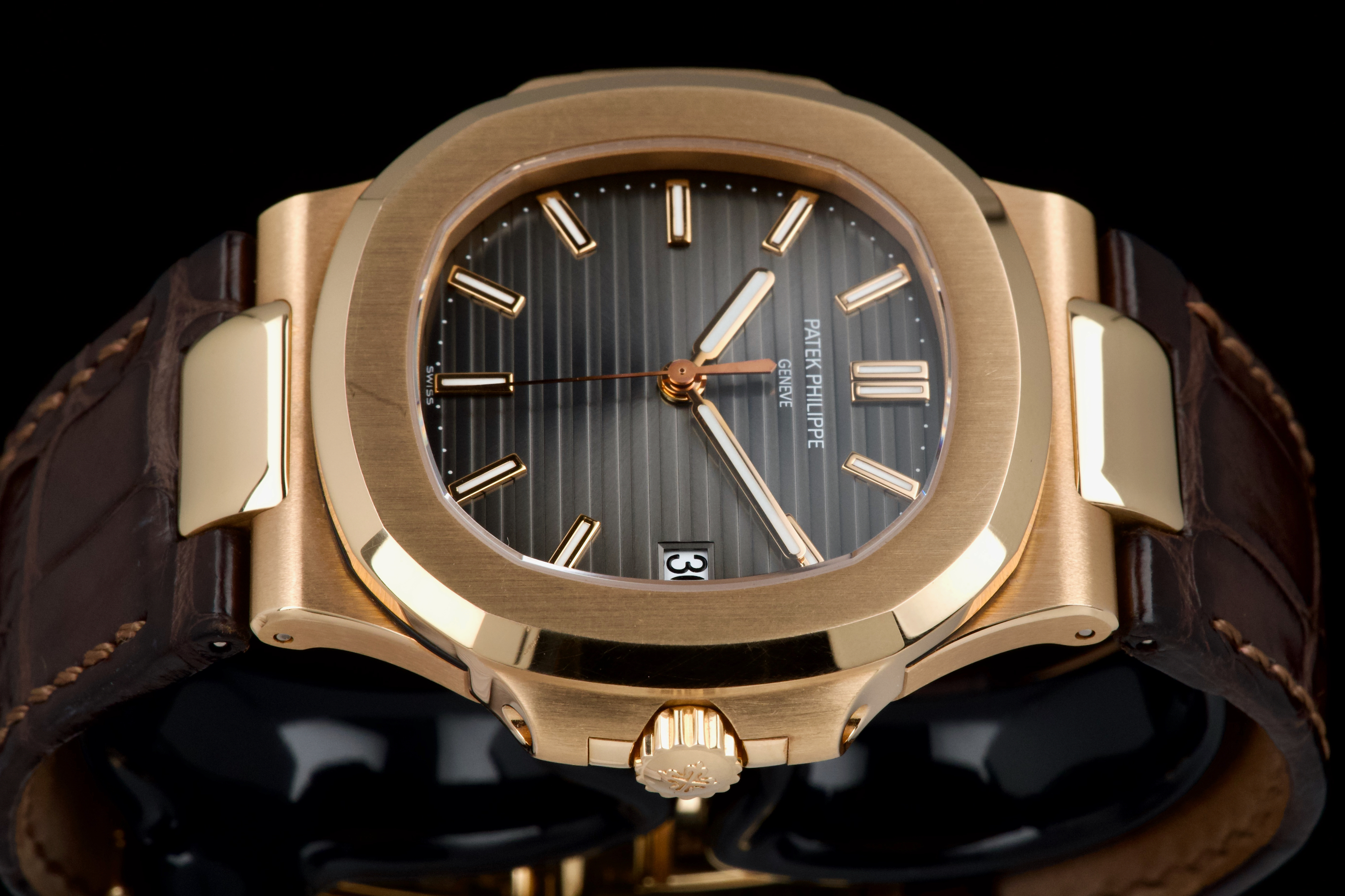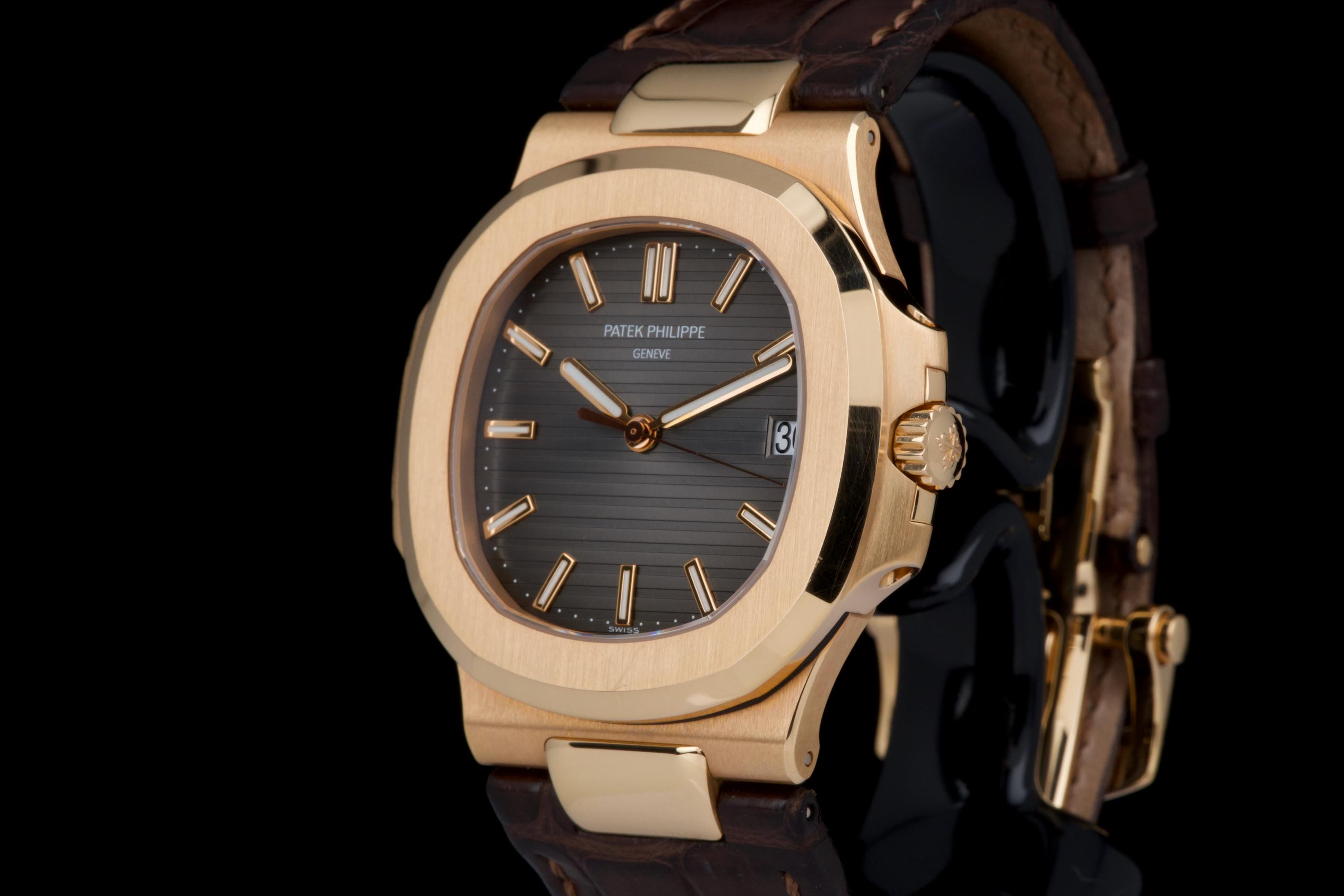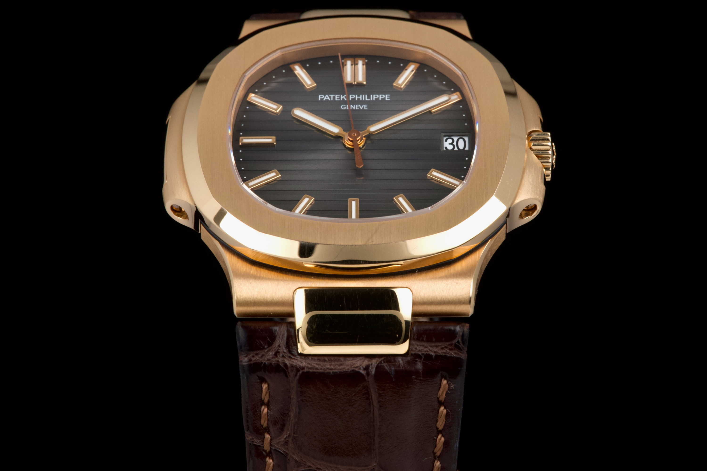 The present Patek Philippe Nautilus reference 5711R, dating to 2008, is an elegant and highly desirable example of the iconic model executed in 18K rose gold, offered with its original papers. Renowned for its timeless Gérald Genta design and refined proportions, the 5711R remains one of the most coveted modern Nautilus configurations. The rose-gold case appears to be unpolished and is preserved in excellent overall condition for its age, retaining crisp lines and strong definition throughout. The original brown luminova dial is likewise in outstanding condition, displaying rich depth and perfect clarity, with matching hands that create a harmonious and coherent aesthetic. The watch is fitted with its original brown Patek Philippe crocodile leather strap, which remains in excellent condition, and is paired with the correct original rose-gold deployant clasp, completing the ensemble with full period coherence. While no service history accompanies the watch, it is functioning correctly at the time of cataloguing. Combining an unpolished case, superb dial, and desirable rose-gold execution, this Nautilus 5711R from 2008 represents a compelling opportunity to acquire one of Patek Philippe’s most iconic modern sports watches in highly attractive and original condition