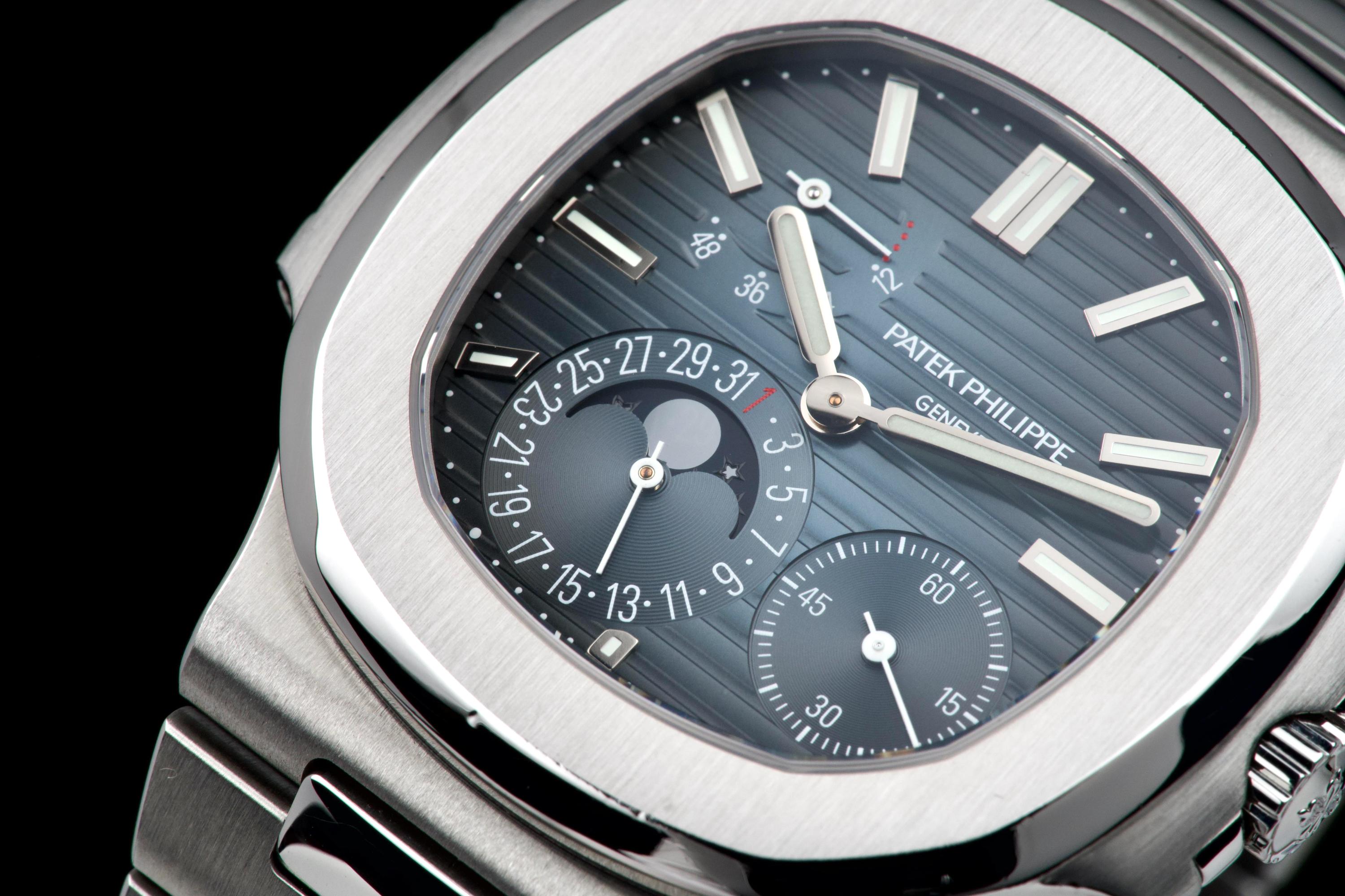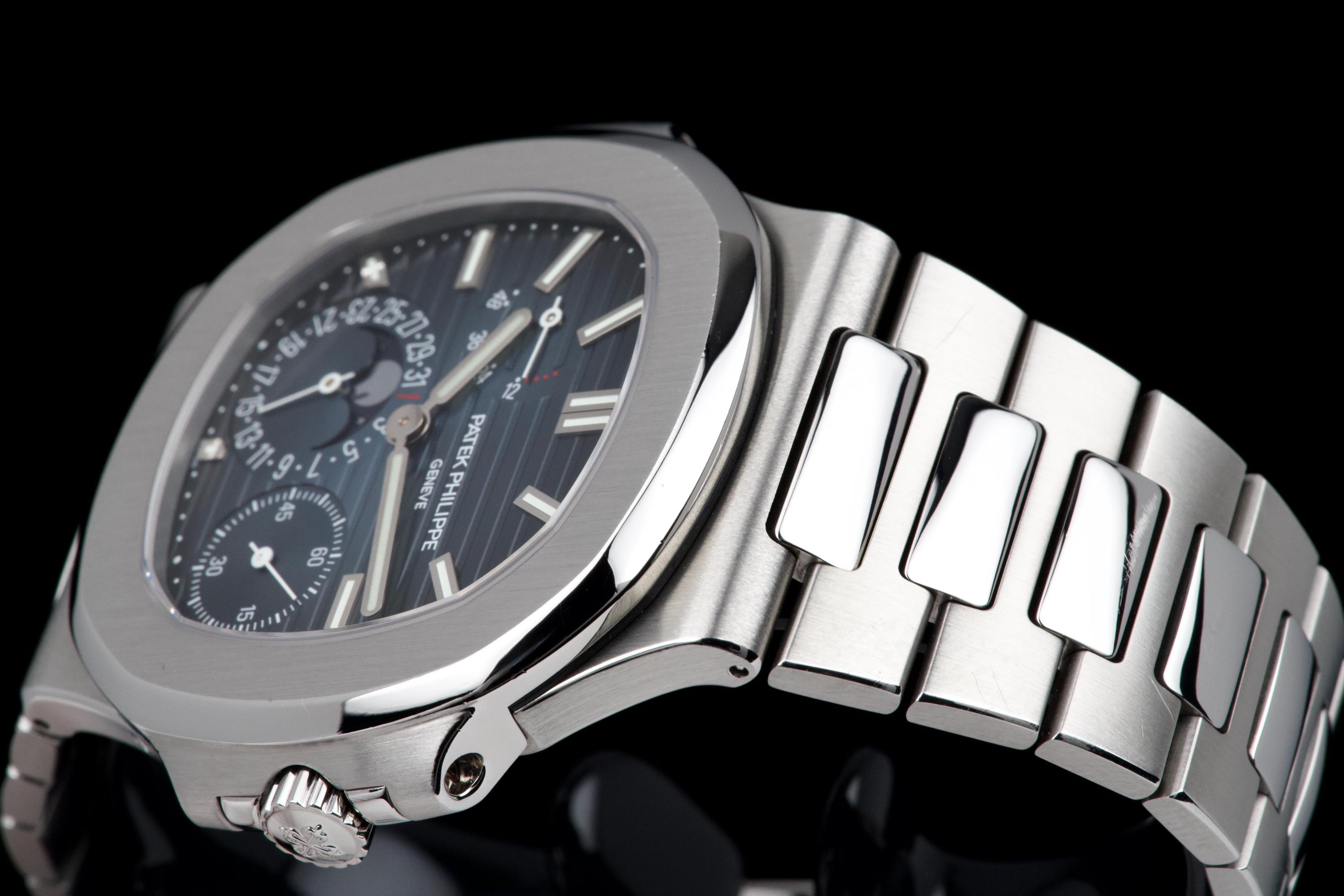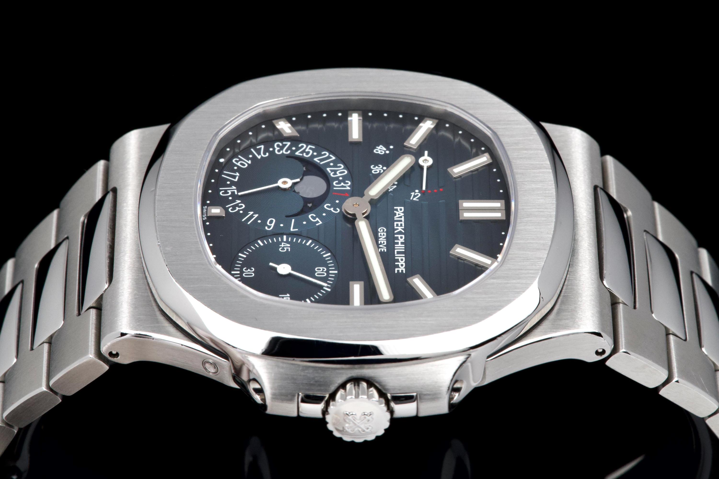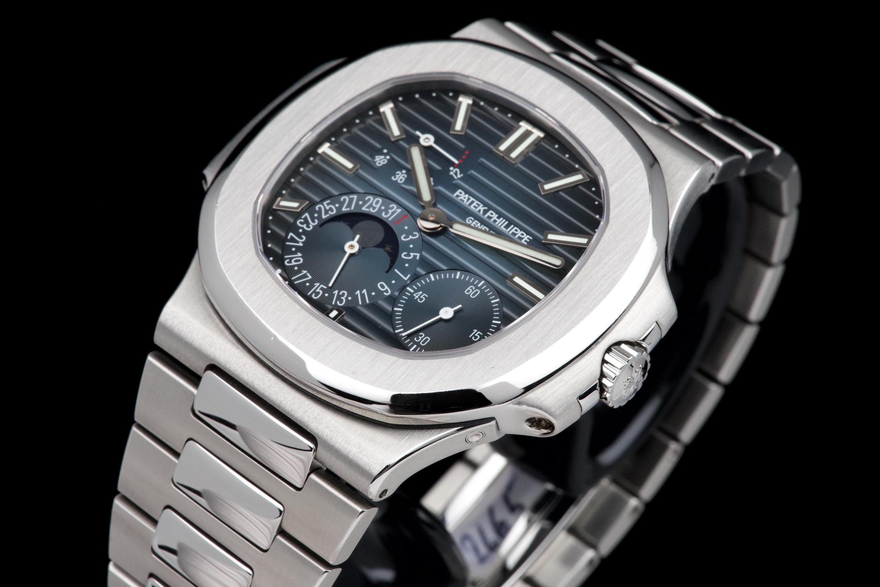 The present Patek Philippe Nautilus reference 5712/1A-001, dating to 2007, is an early example of the celebrated reference and part of the production bearing the prestigious Geneva Seal. Offered with its original box and papers, this watch was originally sold at the Patek Philippe Salons in Geneva in 2007, adding desirable point-of-sale provenance. The stainless-steel case is preserved in very good overall condition, having been polished in the past and now showing light wear consistent with careful use. The signature blue dial is flawless, displaying the refined horizontal embossing and rich tone that have made the 5712 one of the most coveted Nautilus references. The hands match perfectly, maintaining a harmonious and balanced aesthetic. The integrated stainless-steel bracelet shows light stretch, entirely consistent with a watch approaching twenty years of age, yet remains in very good overall condition. Inside, the automatic calibre 240 PS IRM C LU—bearing the Geneva Seal—is performing strongly, with measured amplitude of approximately 300 degrees and accuracy of +3 seconds per day. The watch has also been pressure-tested and is confirmed water-resistant to 3 bar at the time of cataloguing. Combining early Geneva Seal production, strong mechanical performance, full-set completeness, and Geneva Salon provenance, this Nautilus 5712 represents a compelling opportunity to acquire one of Patek Philippe’s most iconic modern complications in attractive and honest condition.