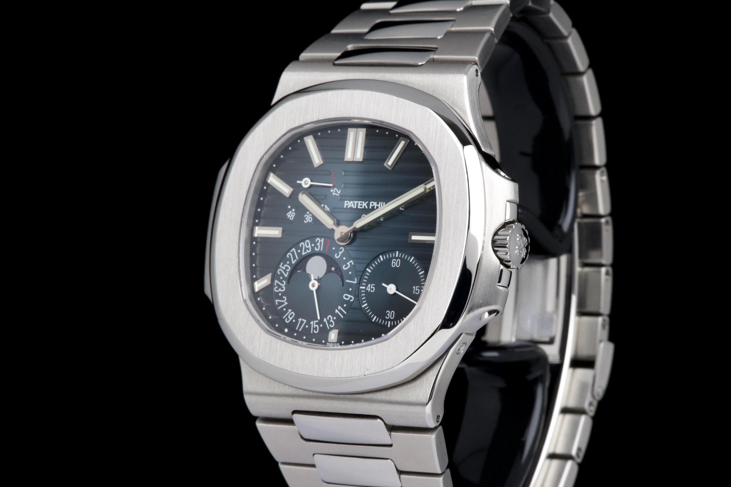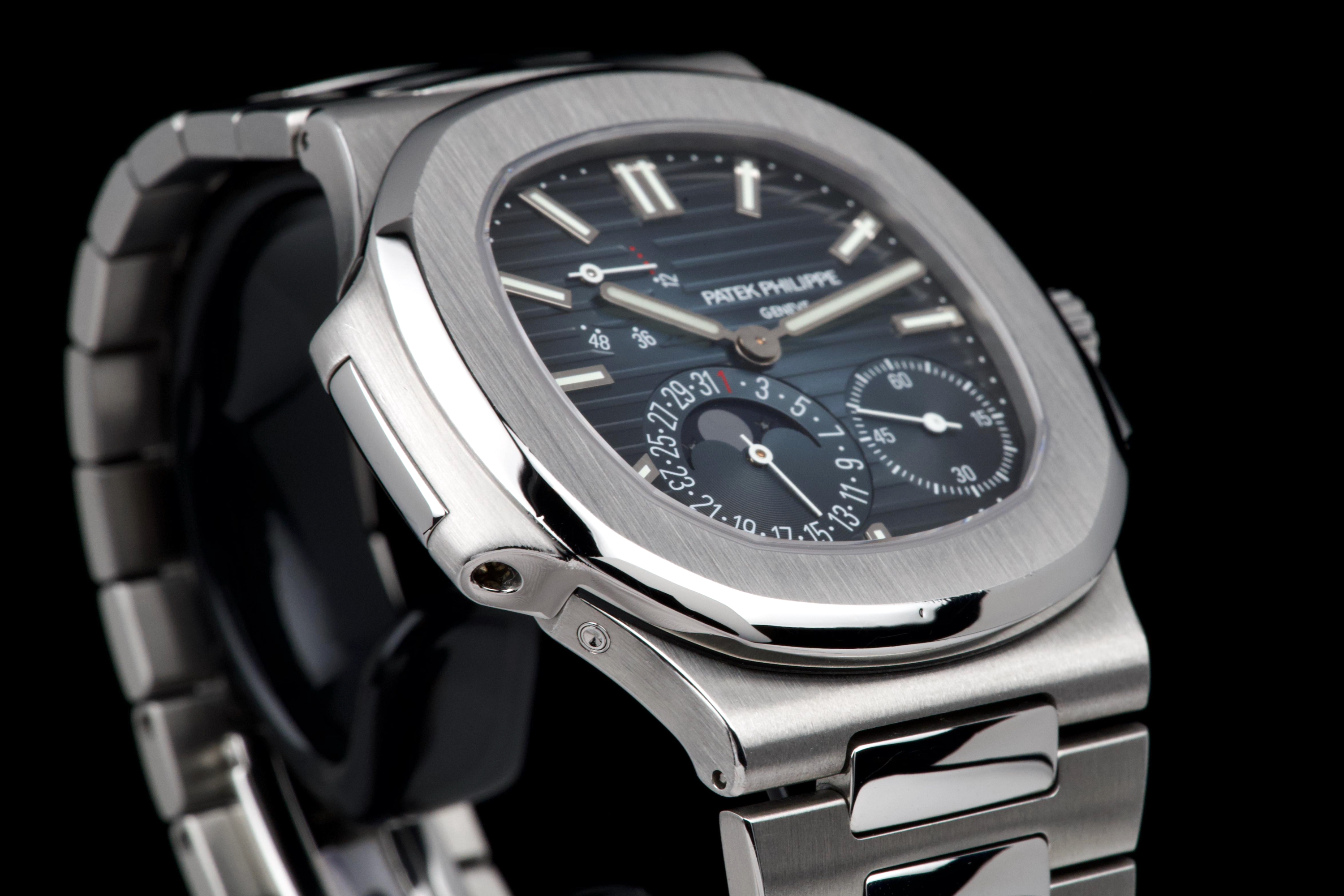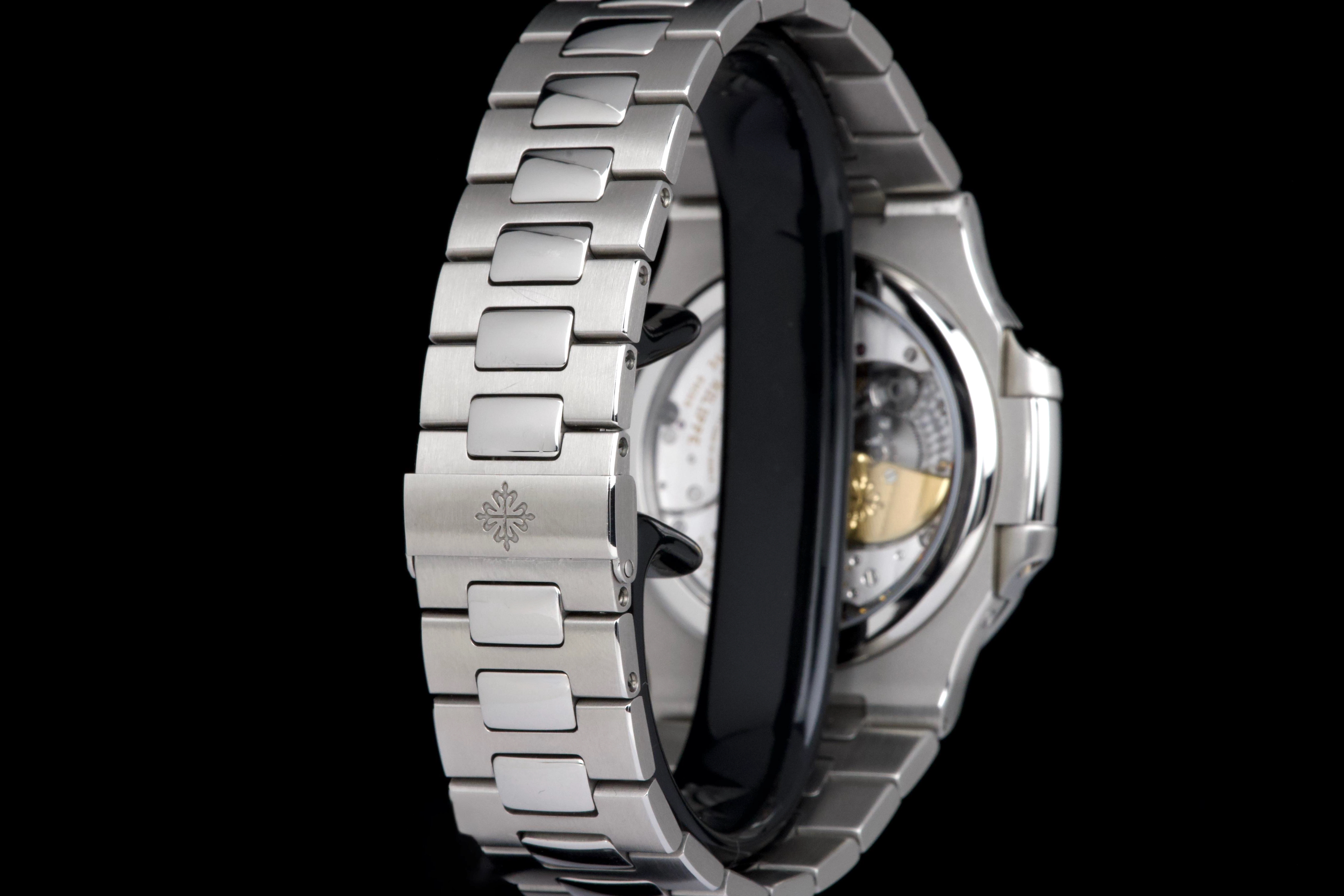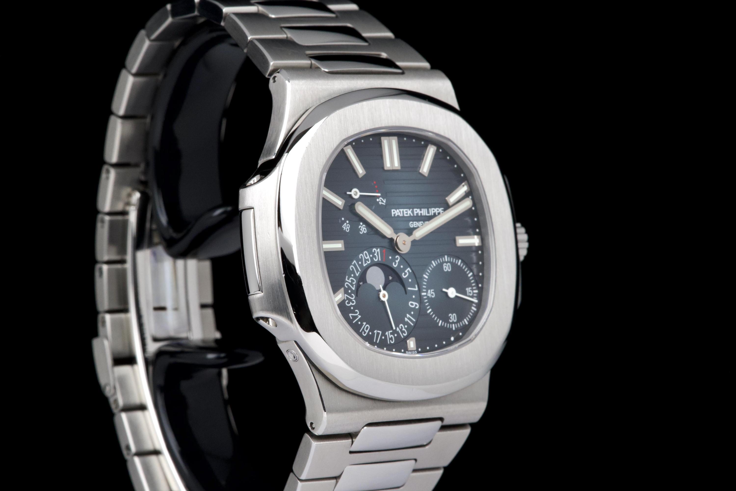 The present Patek Philippe Nautilus reference 5712/1A-001, dating to 2007, is an early example of the celebrated reference and part of the production bearing the prestigious Geneva Seal. Offered with its original box and papers, this watch was originally sold at the Patek Philippe Salons in Geneva in 2007, adding desirable point-of-sale provenance. The stainless-steel case is preserved in very good overall condition, having been polished in the past and now showing light wear consistent with careful use. The signature blue dial is flawless, displaying the refined horizontal embossing and rich tone that have made the 5712 one of the most coveted Nautilus references. The hands match perfectly, maintaining a harmonious and balanced aesthetic. The integrated stainless-steel bracelet shows light stretch, entirely consistent with a watch approaching twenty years of age, yet remains in very good overall condition. Inside, the automatic calibre 240 PS IRM C LU—bearing the Geneva Seal—is performing strongly, with measured amplitude of approximately 300 degrees and accuracy of +3 seconds per day. The watch has also been pressure-tested and is confirmed water-resistant to 3 bar at the time of cataloguing. Combining early Geneva Seal production, strong mechanical performance, full-set completeness, and Geneva Salon provenance, this Nautilus 5712 represents a compelling opportunity to acquire one of Patek Philippe’s most iconic modern complications in attractive and honest condition.