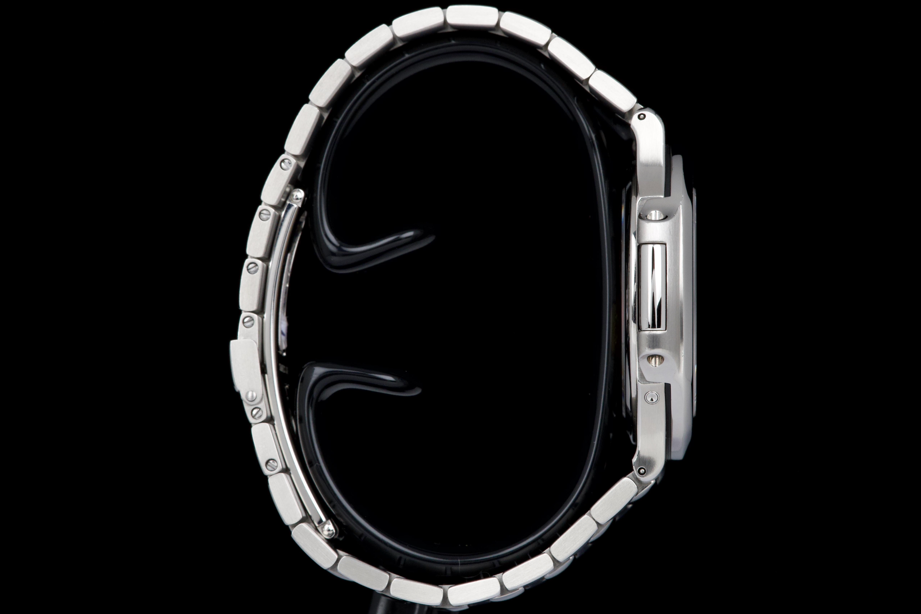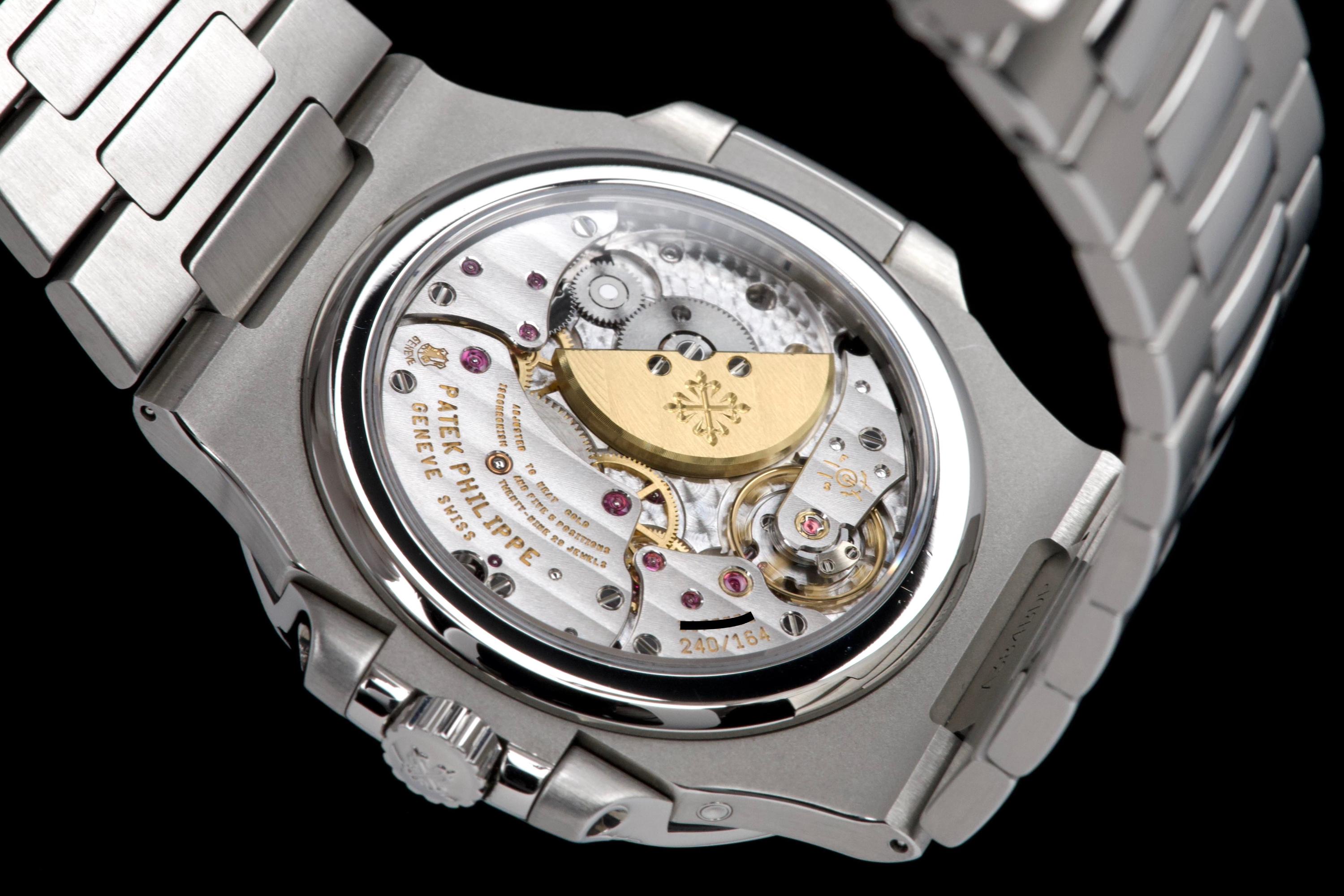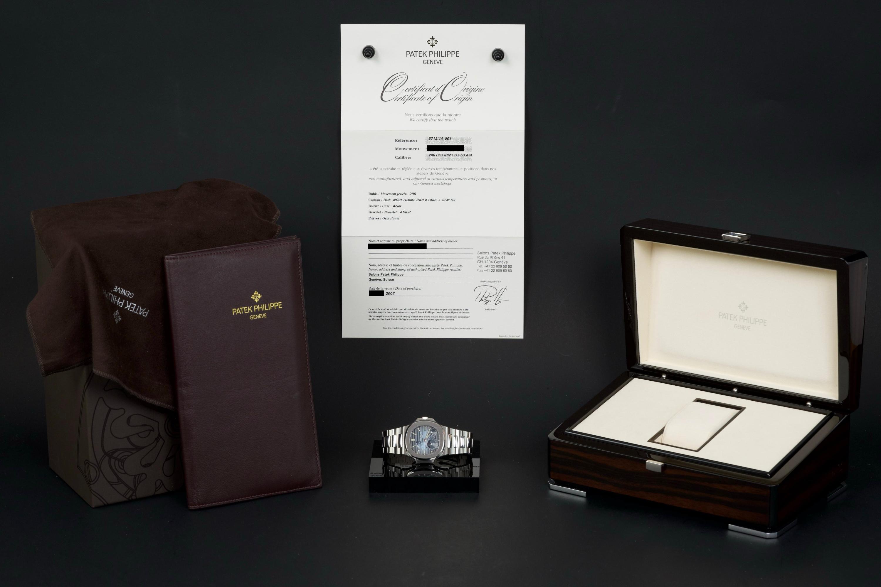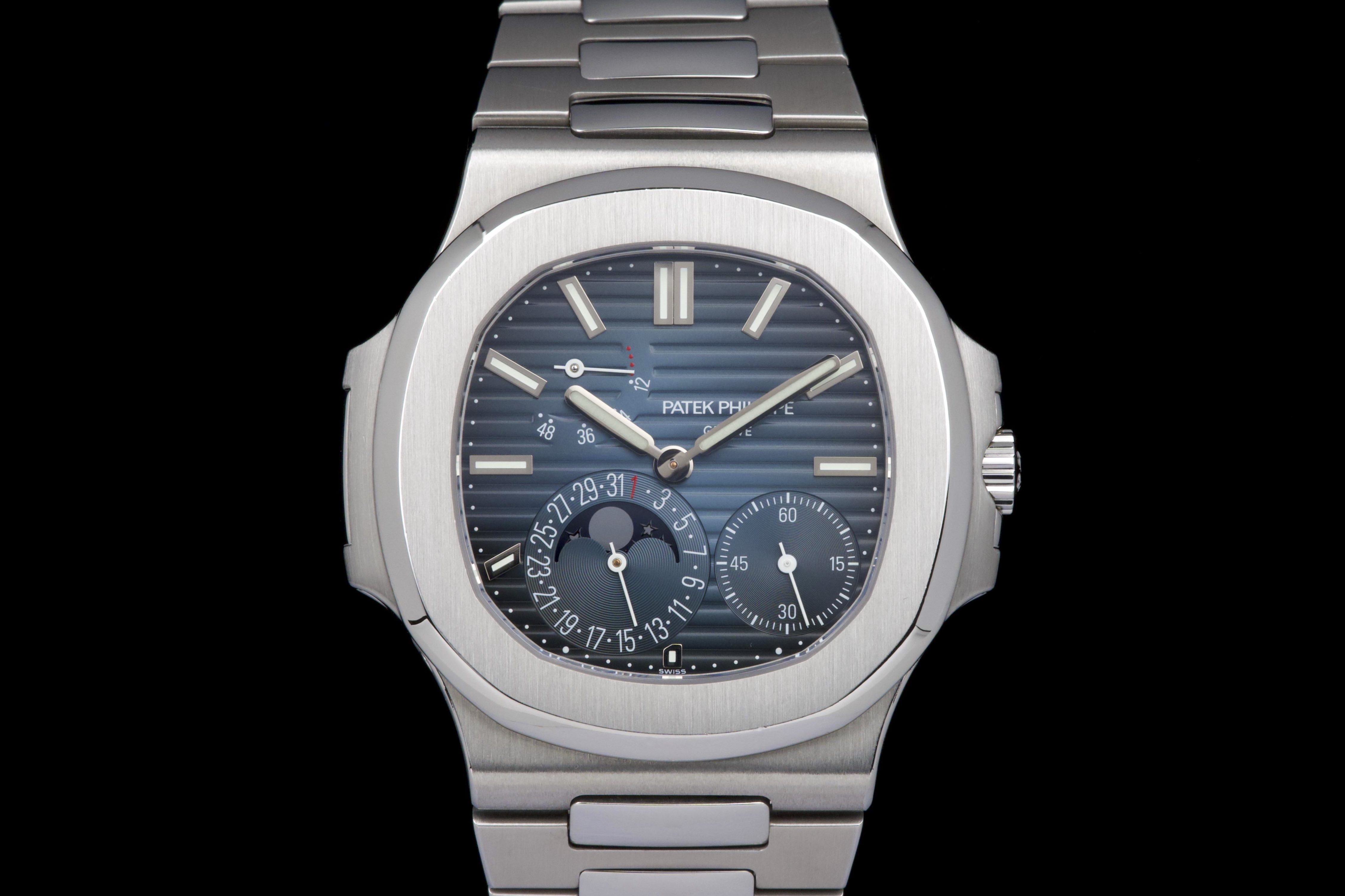 The present Patek Philippe Nautilus reference 5712/1A-001, dating to 2007, is an early example of the celebrated reference and part of the production bearing the prestigious Geneva Seal. Offered with its original box and papers, this watch was originally sold at the Patek Philippe Salons in Geneva in 2007, adding desirable point-of-sale provenance. The stainless-steel case is preserved in very good overall condition, having been polished in the past and now showing light wear consistent with careful use. The signature blue dial is flawless, displaying the refined horizontal embossing and rich tone that have made the 5712 one of the most coveted Nautilus references. The hands match perfectly, maintaining a harmonious and balanced aesthetic. The integrated stainless-steel bracelet shows light stretch, entirely consistent with a watch approaching twenty years of age, yet remains in very good overall condition. Inside, the automatic calibre 240 PS IRM C LU—bearing the Geneva Seal—is performing strongly, with measured amplitude of approximately 300 degrees and accuracy of +3 seconds per day. The watch has also been pressure-tested and is confirmed water-resistant to 3 bar at the time of cataloguing. Combining early Geneva Seal production, strong mechanical performance, full-set completeness, and Geneva Salon provenance, this Nautilus 5712 represents a compelling opportunity to acquire one of Patek Philippe’s most iconic modern complications in attractive and honest condition.