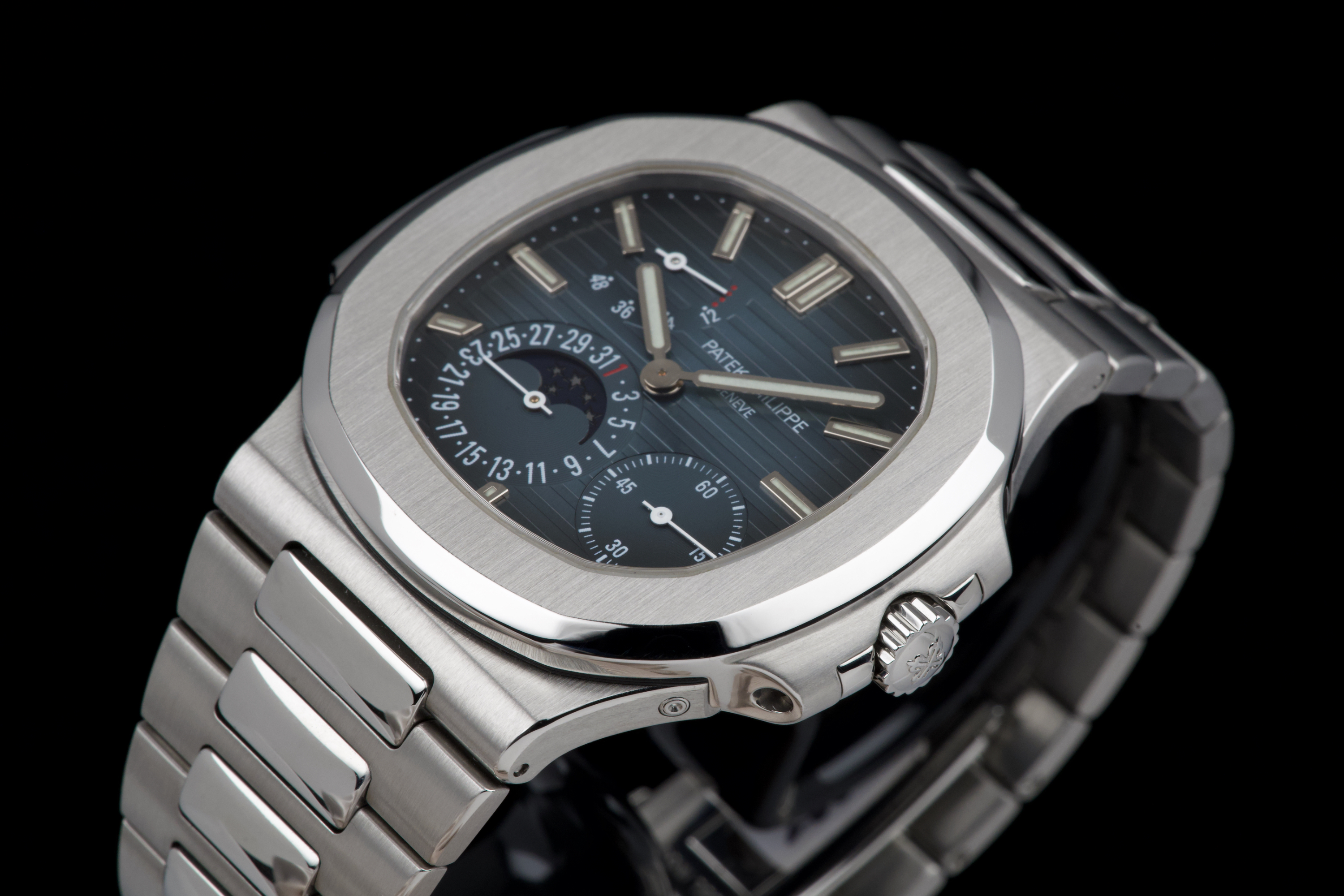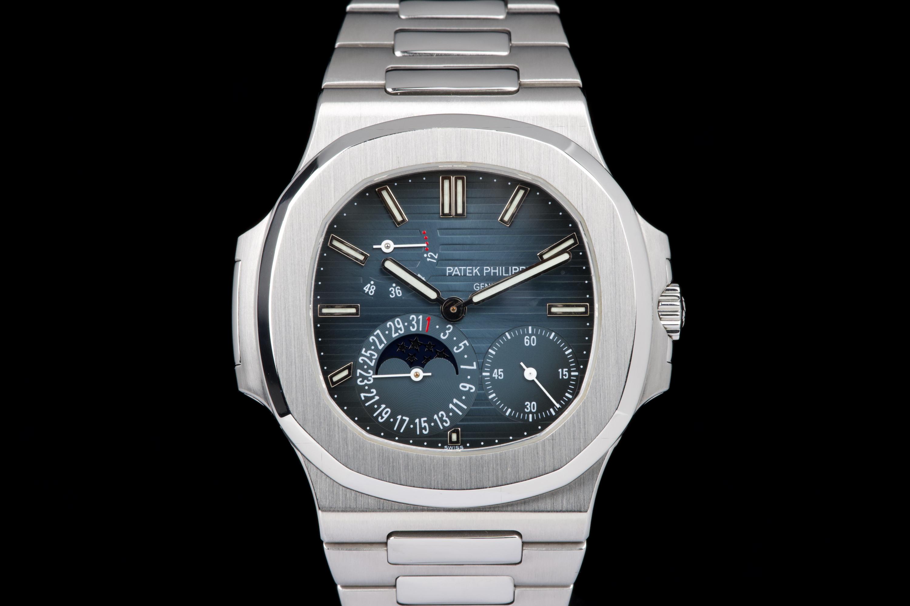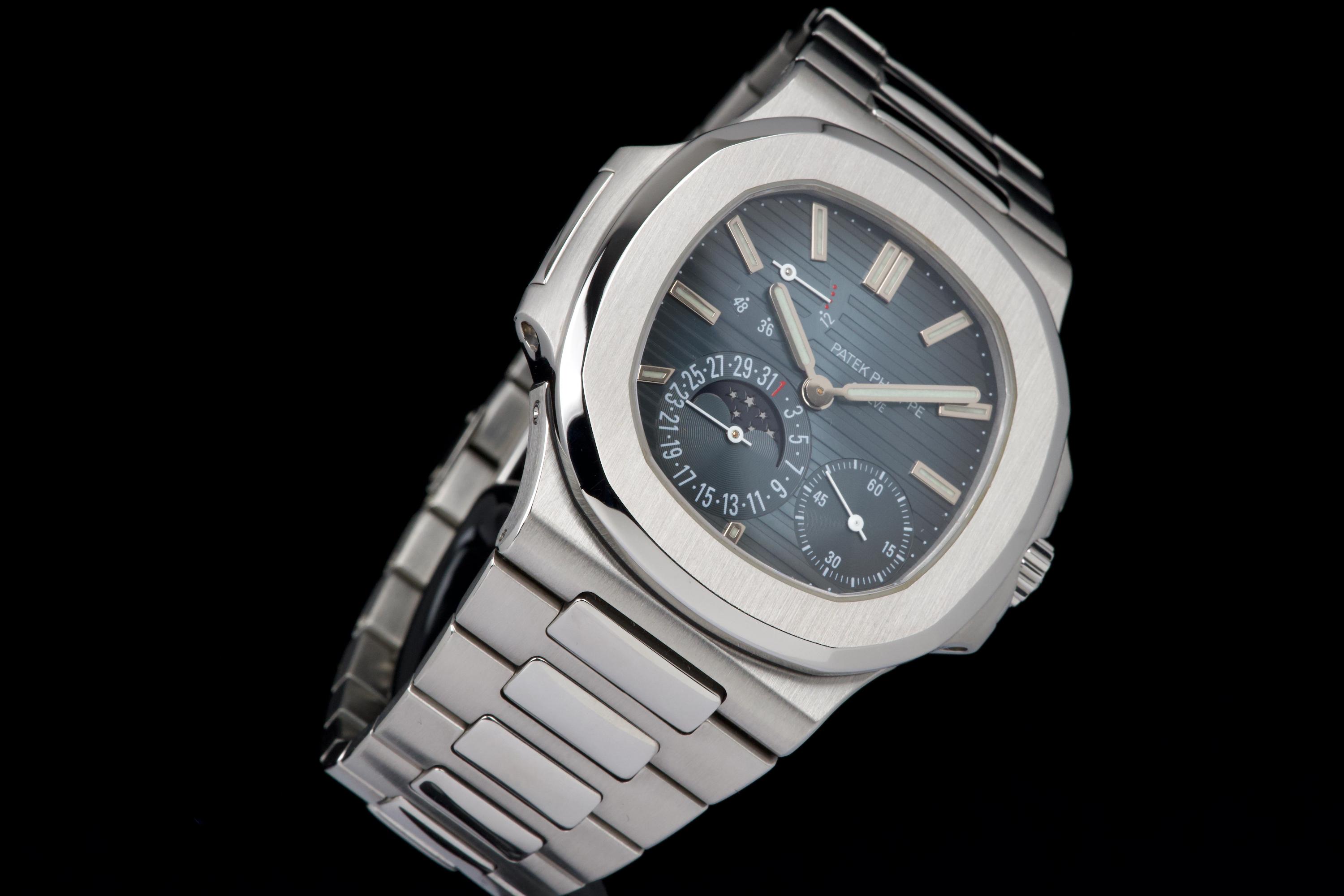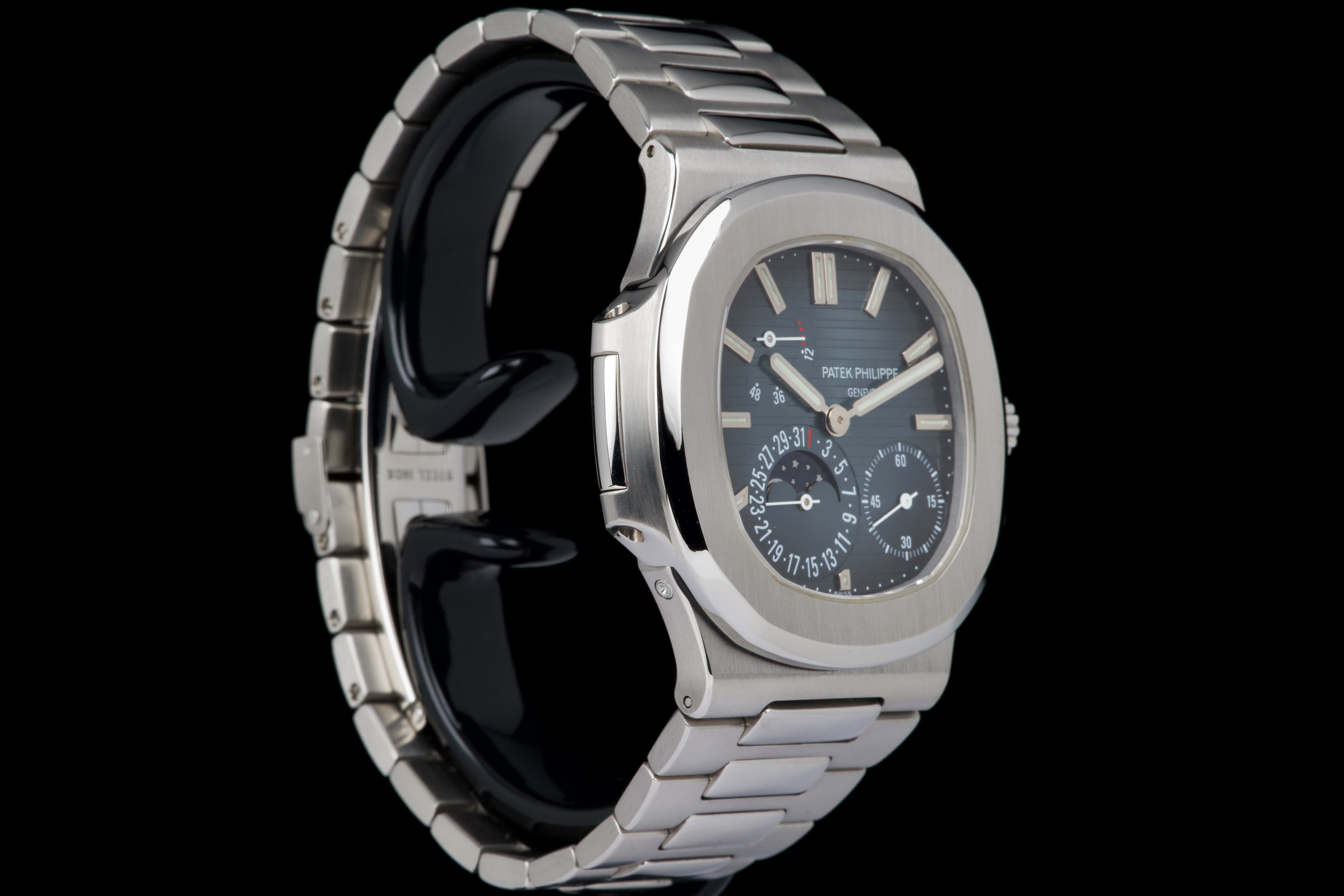 An early and highly collectible example of the Patek Philippe Nautilus 5712/1A, featuring the desirable MK1 dial with the single dot under the “48” of the power reserve indicator — a detail found only on the earliest production pieces. The watch has been recently polished and is presented in very good overall condition, with a strong case, excellent dial (showing only two discreet marks near the 9 o’clock index), and a bracelet with minimal stretch. Powered by the automatic Patek Philippe caliber 240 PS IRM C LU, displaying power reserve, date, and moonphase. Sold new in 2006 and accompanied by its complete full set, including original invoice, certificate, box, and booklets. A superb and rare early Nautilus 5712 MK1 — elegant, historically significant, and beautifully preserved.