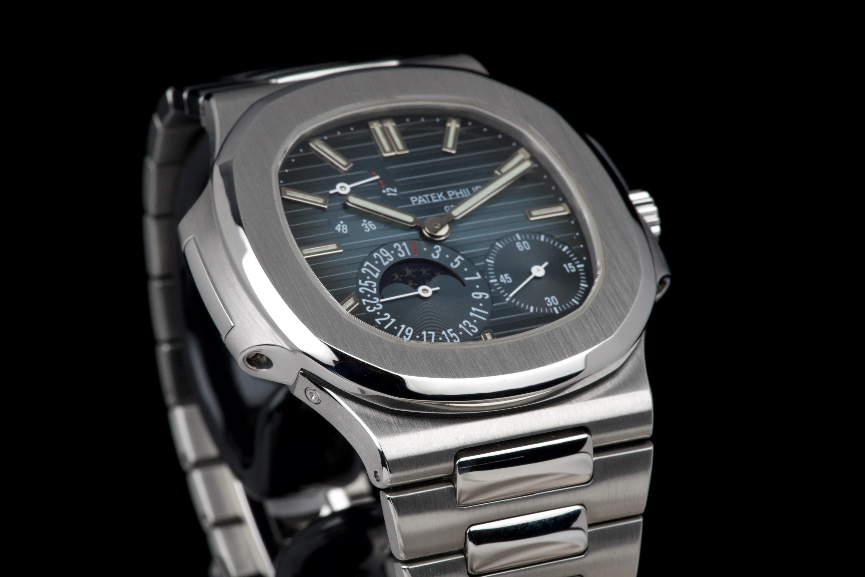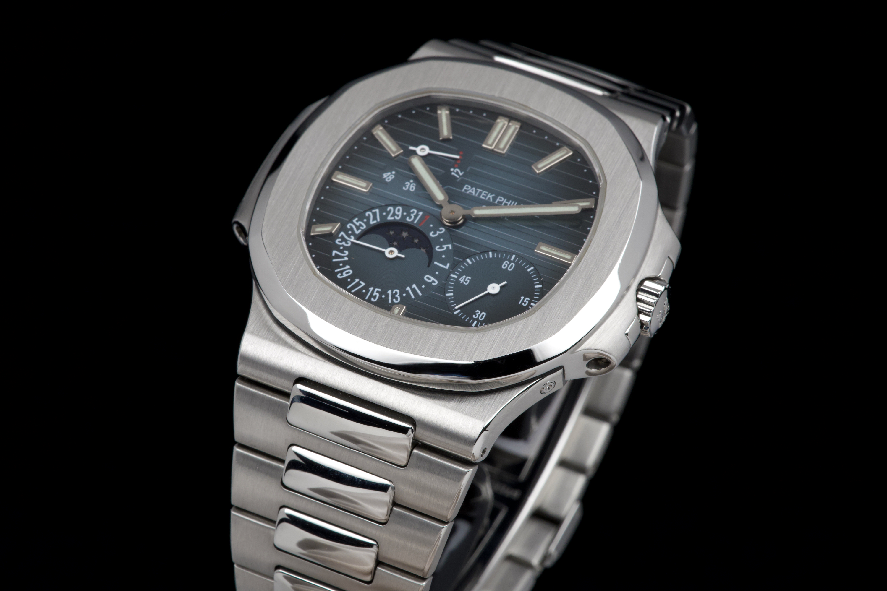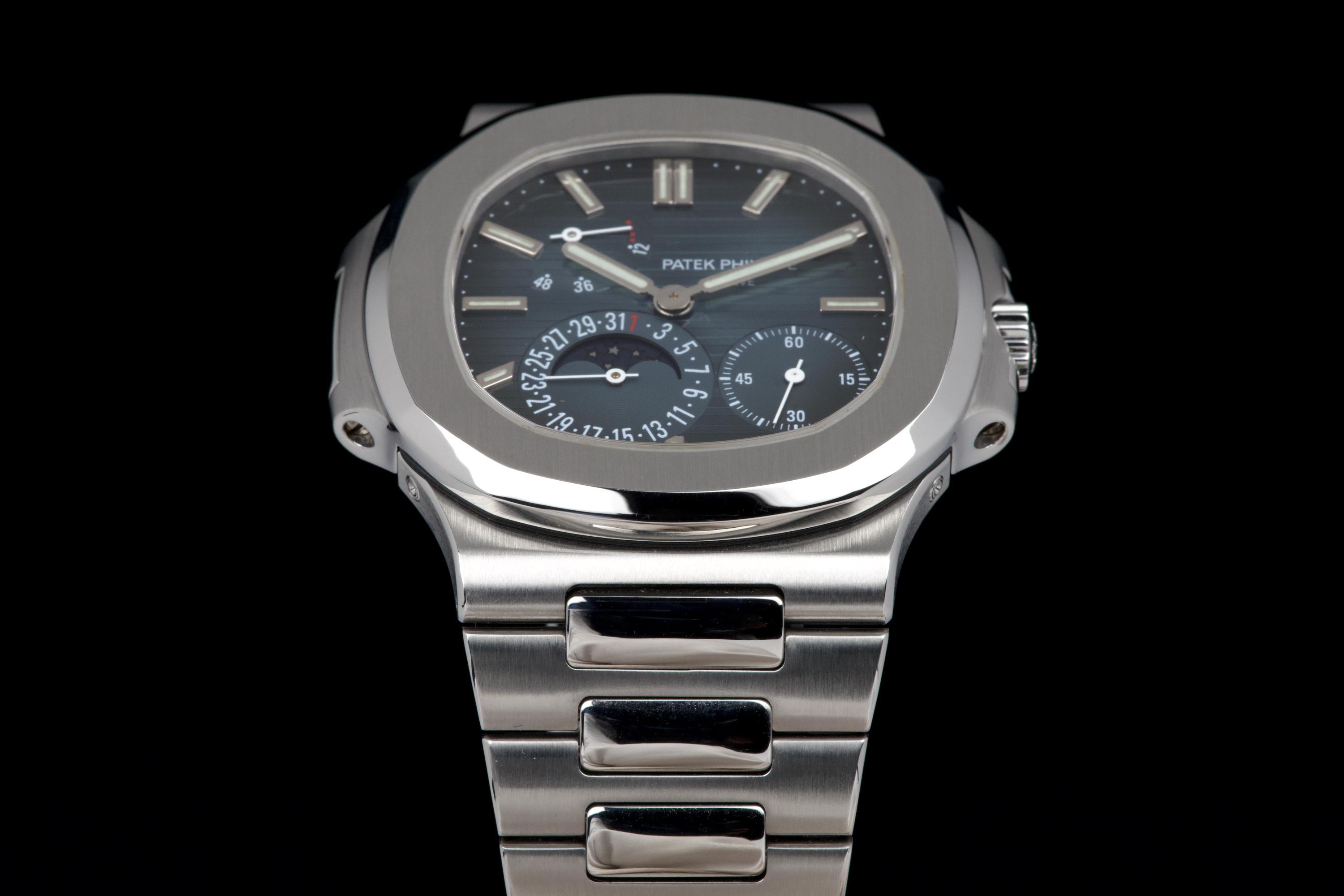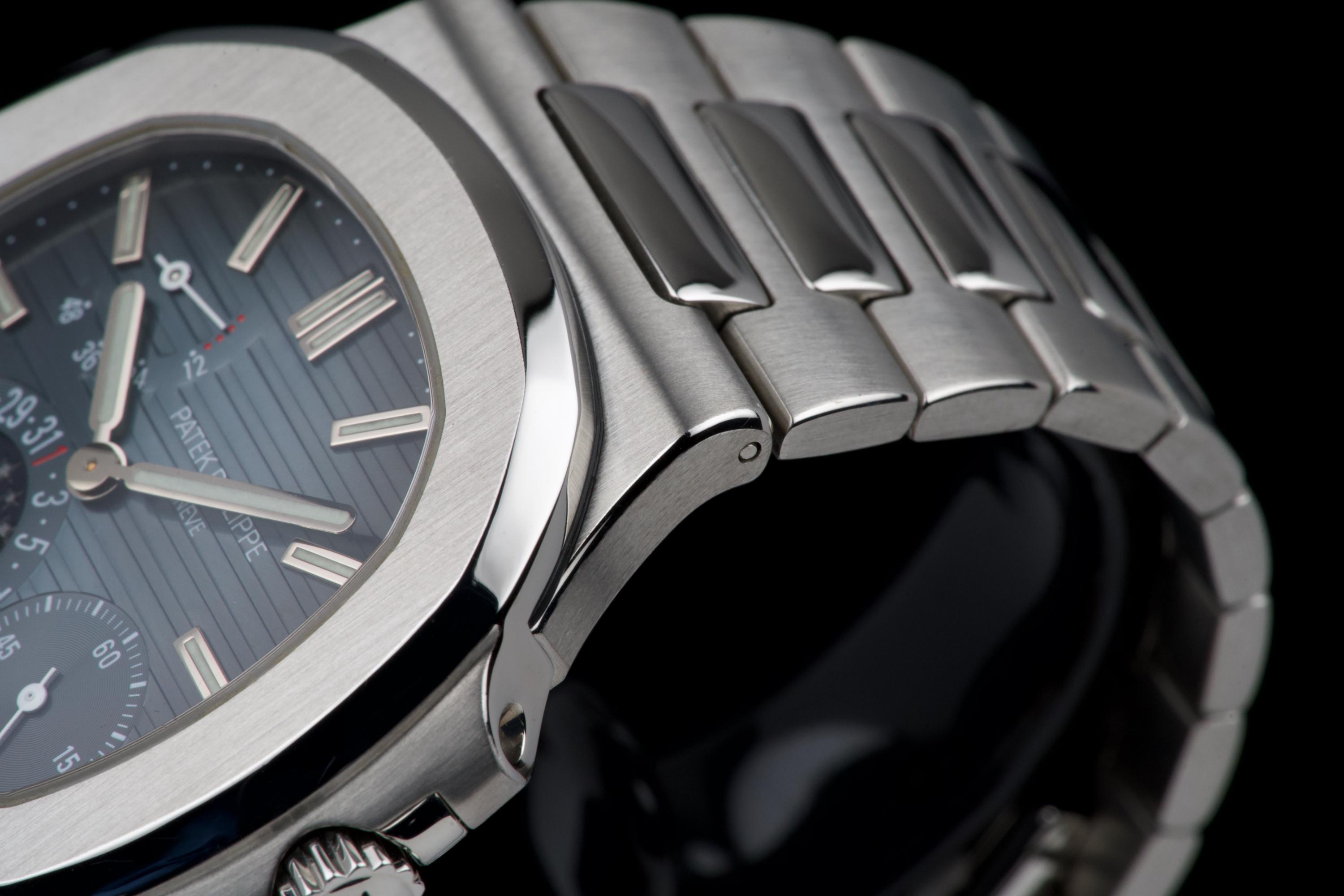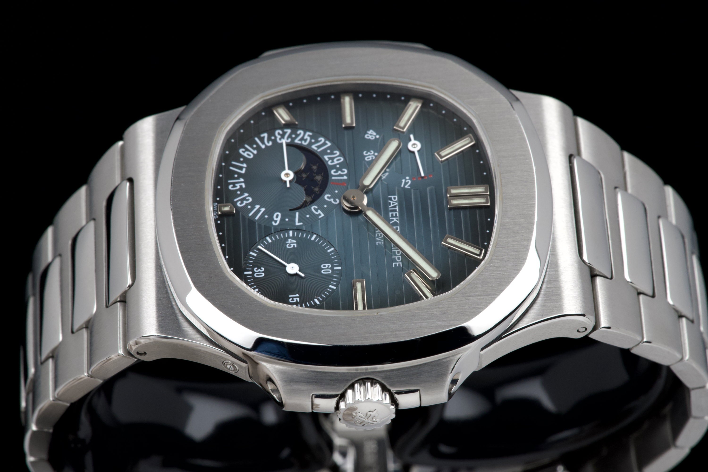 An early and highly collectible example of the Patek Philippe Nautilus 5712/1A, featuring the desirable MK1 dial with the single dot under the “48” of the power reserve indicator — a detail found only on the earliest production pieces. The watch has been recently polished and is presented in very good overall condition, with a strong case, excellent dial (showing only two discreet marks near the 9 o’clock index), and a bracelet with minimal stretch. Powered by the automatic Patek Philippe caliber 240 PS IRM C LU, displaying power reserve, date, and moonphase. Sold new in 2006 and accompanied by its complete full set, including original invoice, certificate, box, and booklets. A superb and rare early Nautilus 5712 MK1 — elegant, historically significant, and beautifully preserved.