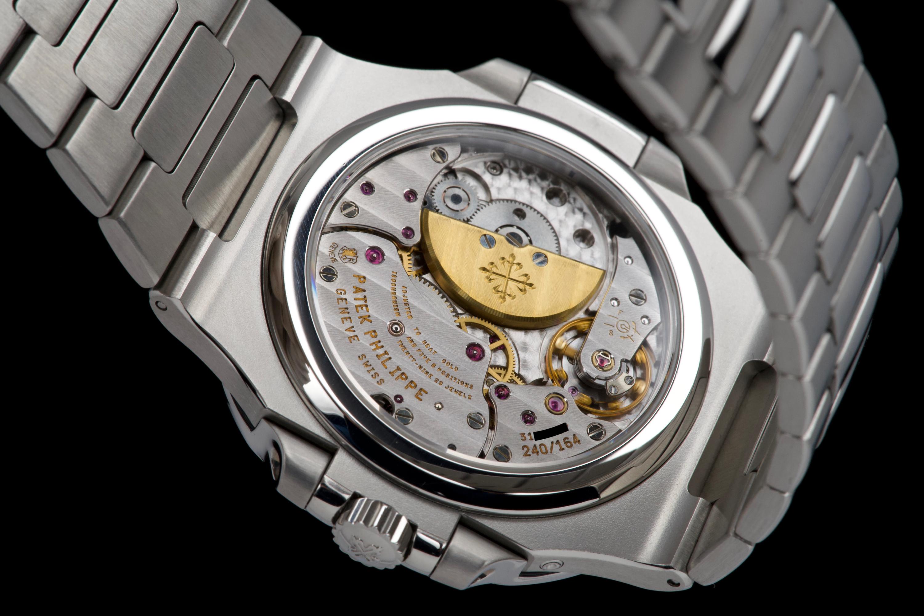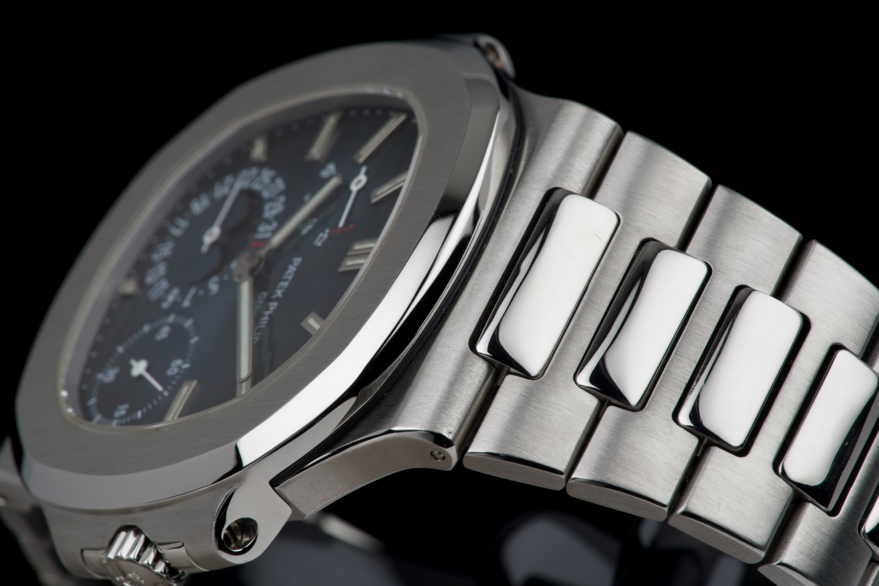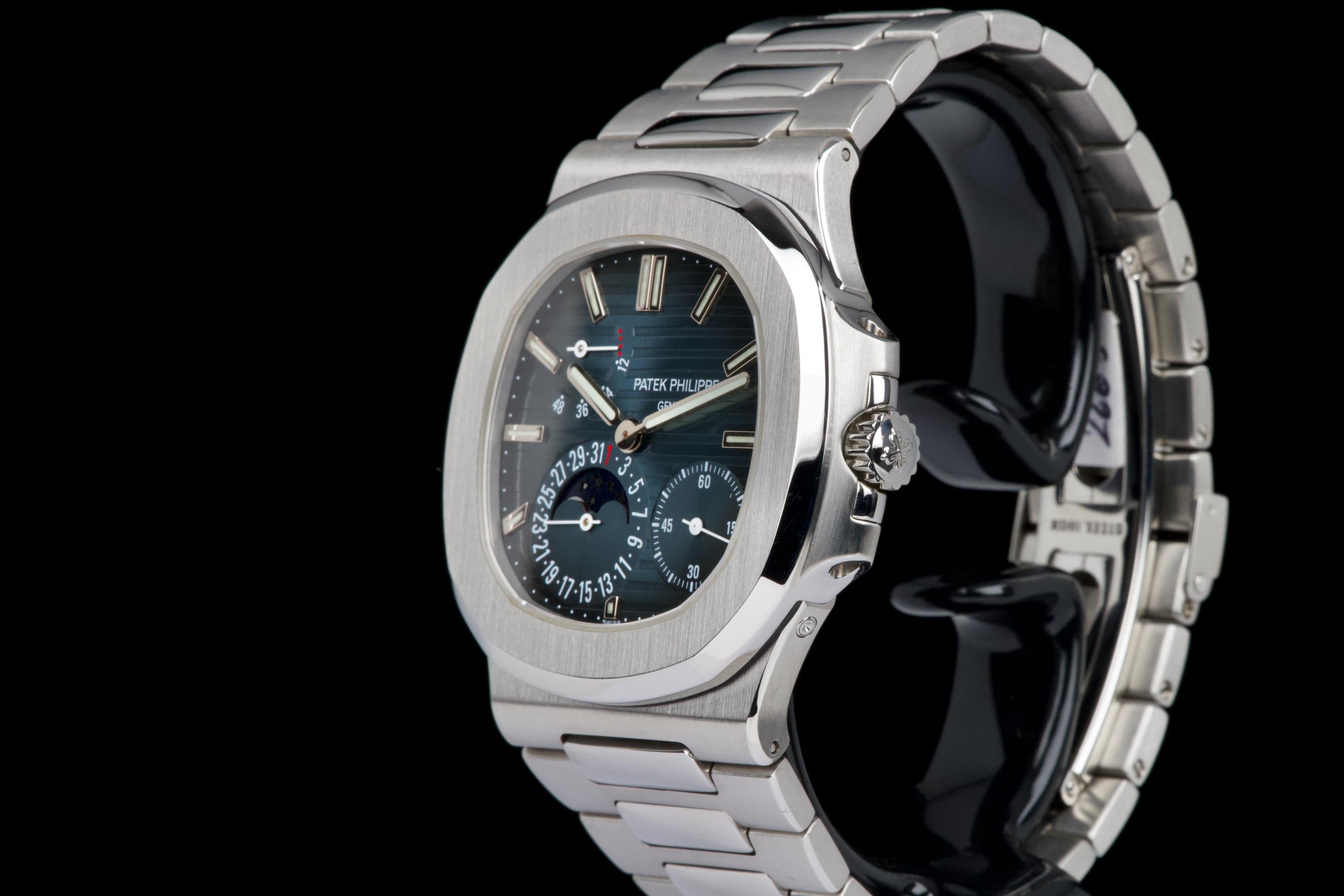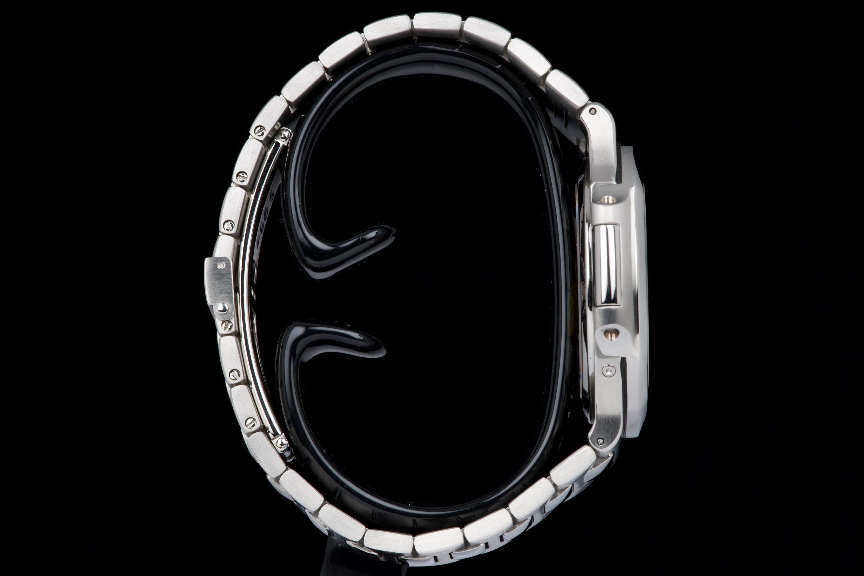 An early and highly collectible example of the Patek Philippe Nautilus 5712/1A, featuring the desirable MK1 dial with the single dot under the “48” of the power reserve indicator — a detail found only on the earliest production pieces. The watch has been recently polished and is presented in very good overall condition, with a strong case, excellent dial (showing only two discreet marks near the 9 o’clock index), and a bracelet with minimal stretch. Powered by the automatic Patek Philippe caliber 240 PS IRM C LU, displaying power reserve, date, and moonphase. Sold new in 2006 and accompanied by its complete full set, including original invoice, certificate, box, and booklets. A superb and rare early Nautilus 5712 MK1 — elegant, historically significant, and beautifully preserved.
