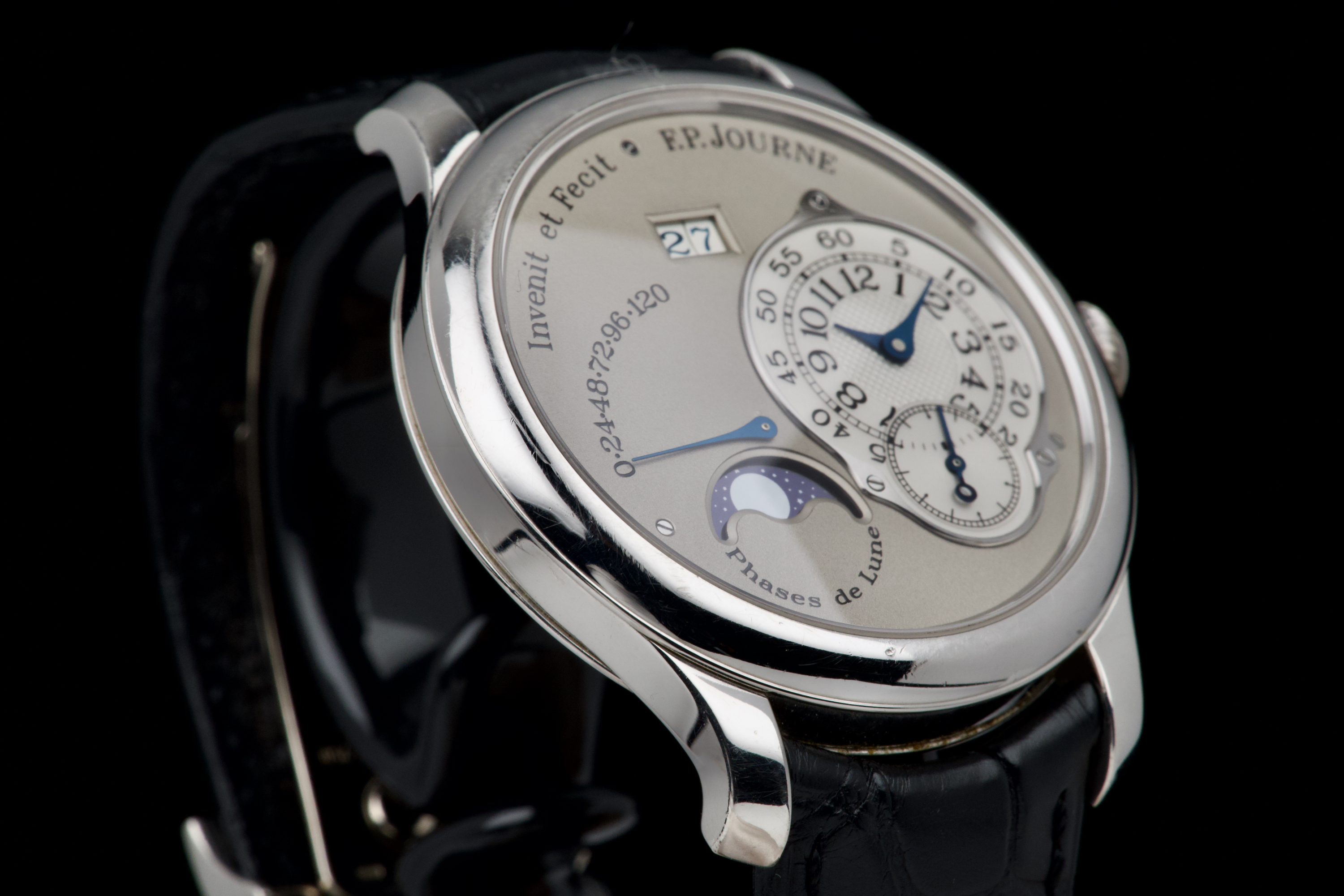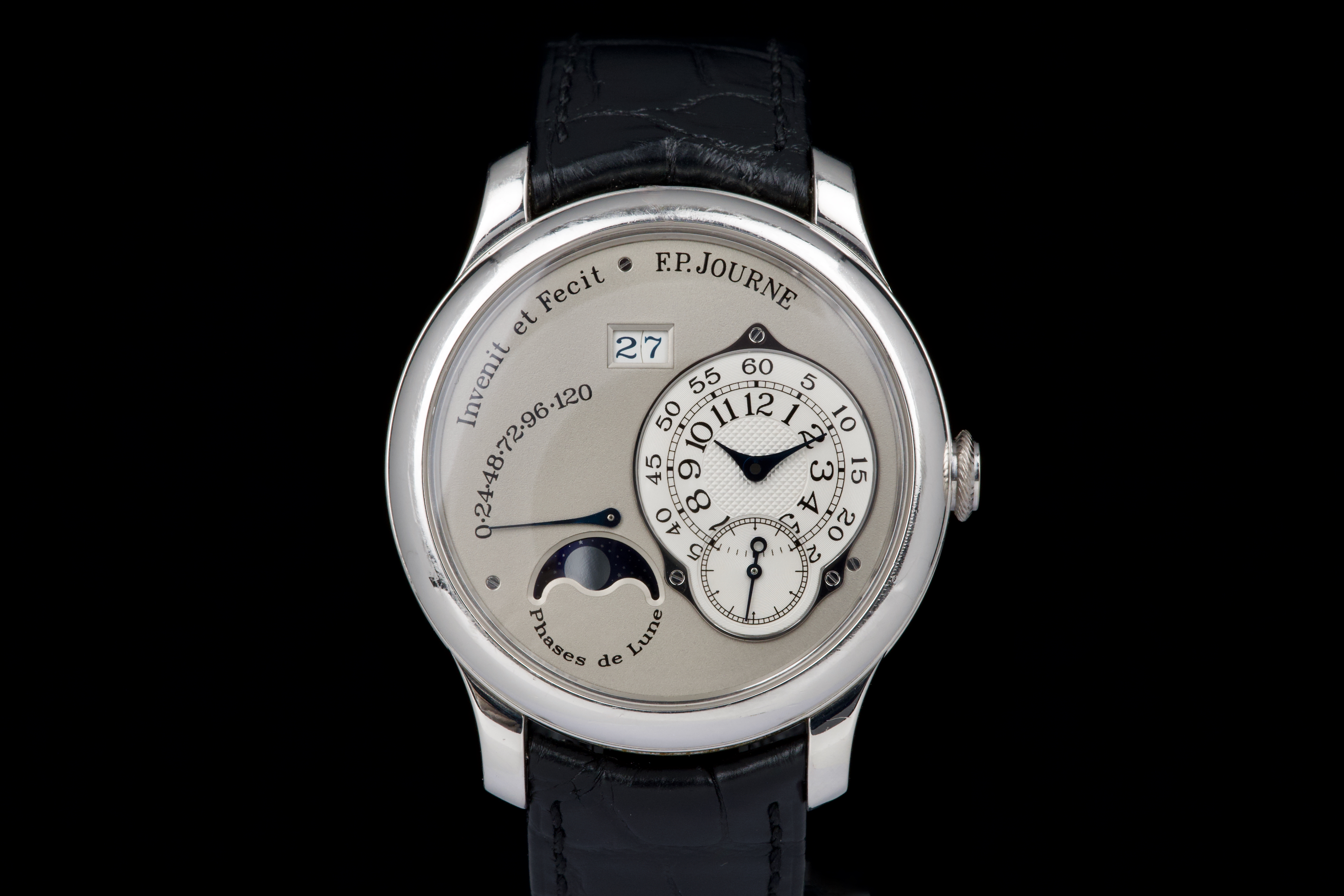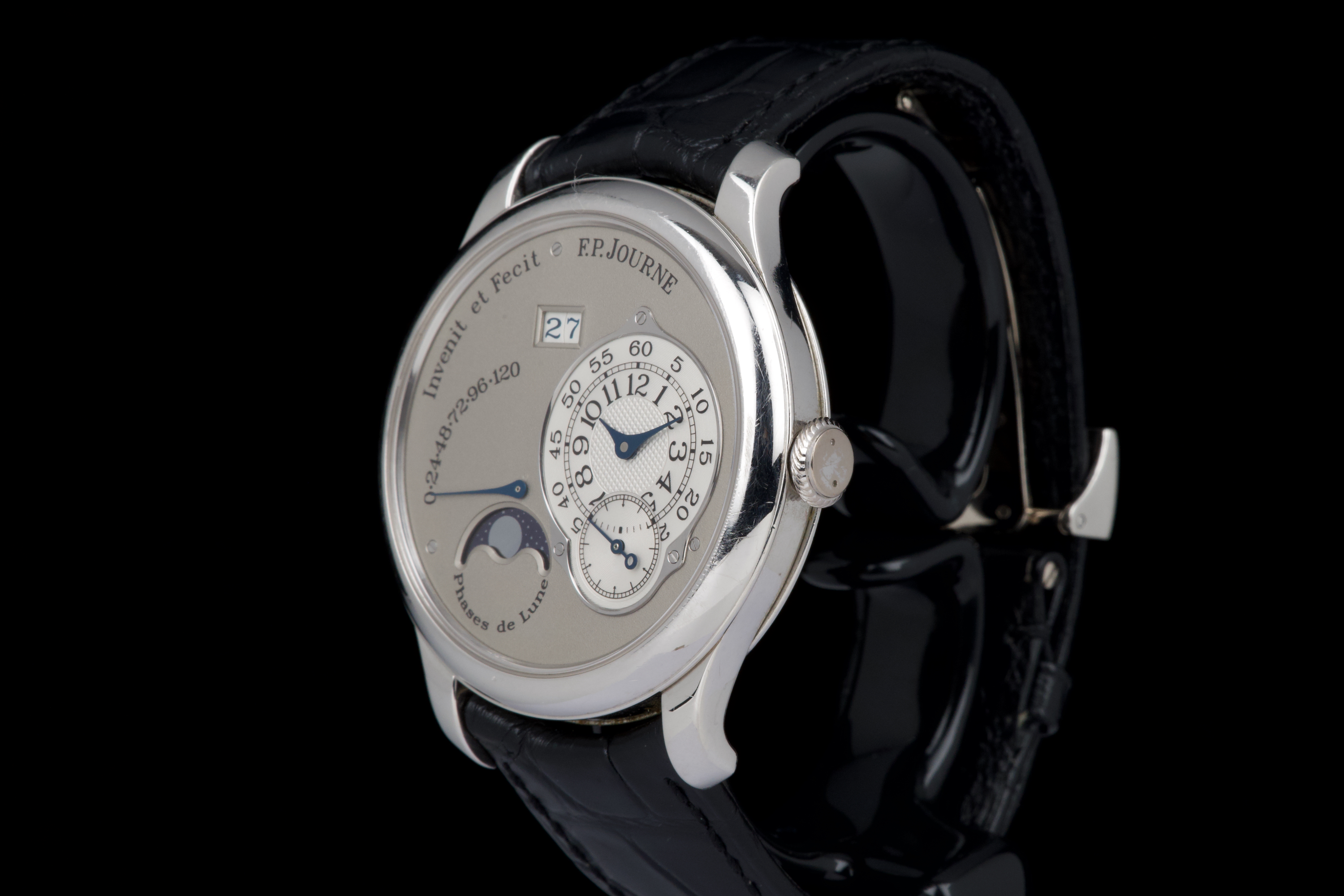 A well-preserved and honest example of the F.P. Journe Octa Lune in platinum with grey dial, sold new in Moscow in 2007. The watch remains unpolished, showing numerous surface scratches from wear, yet no deep dents or damage to the case. The dial is flawless, displaying the elegant and balanced layout typical of the early Octa series. Powered by the automatic F.P. Journe caliber 1300.2, crafted in solid 18K rose gold, and in perfect working order. Complete with its original box and papers. A superb early Octa Lune in platinum — unpolished, fully original, and with beautiful provenance from the Mercury Moscow boutique.