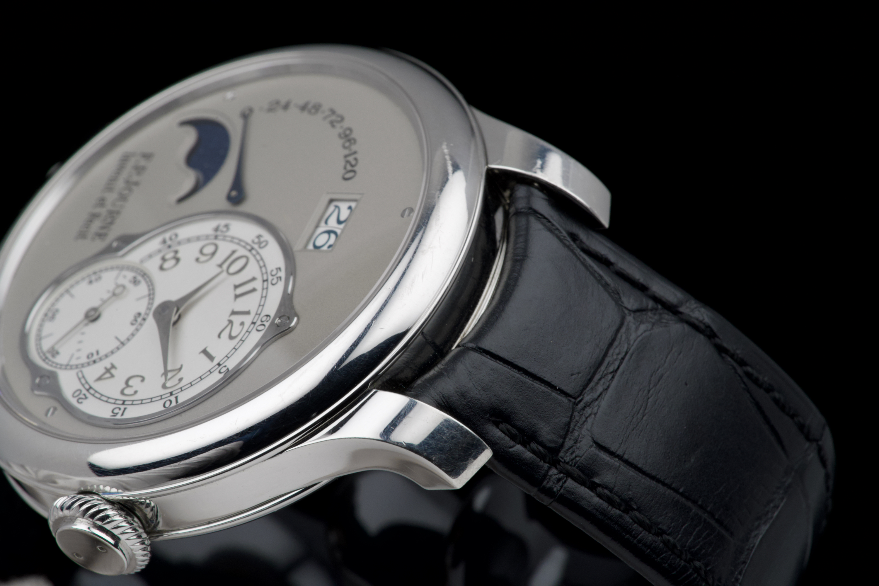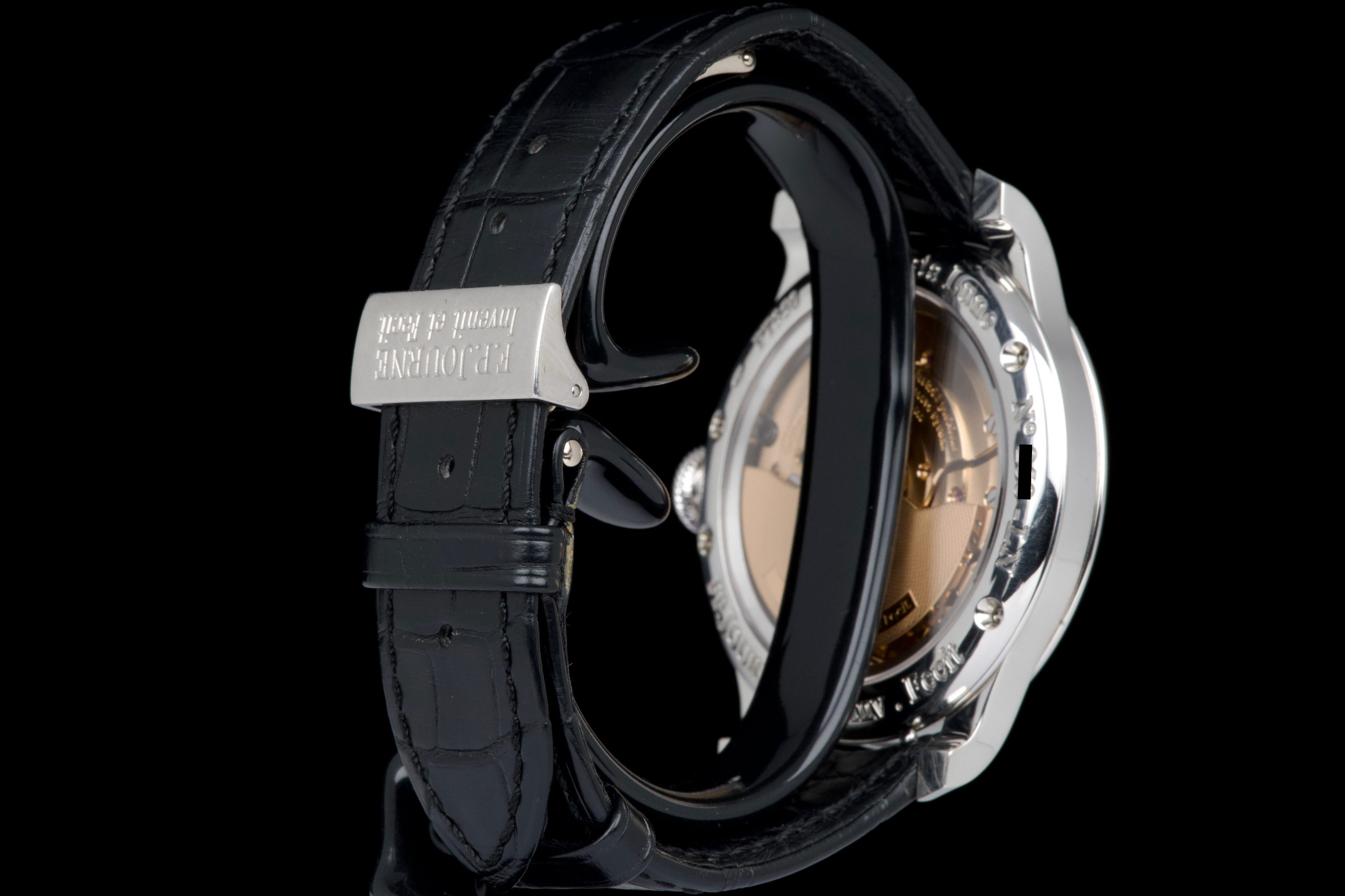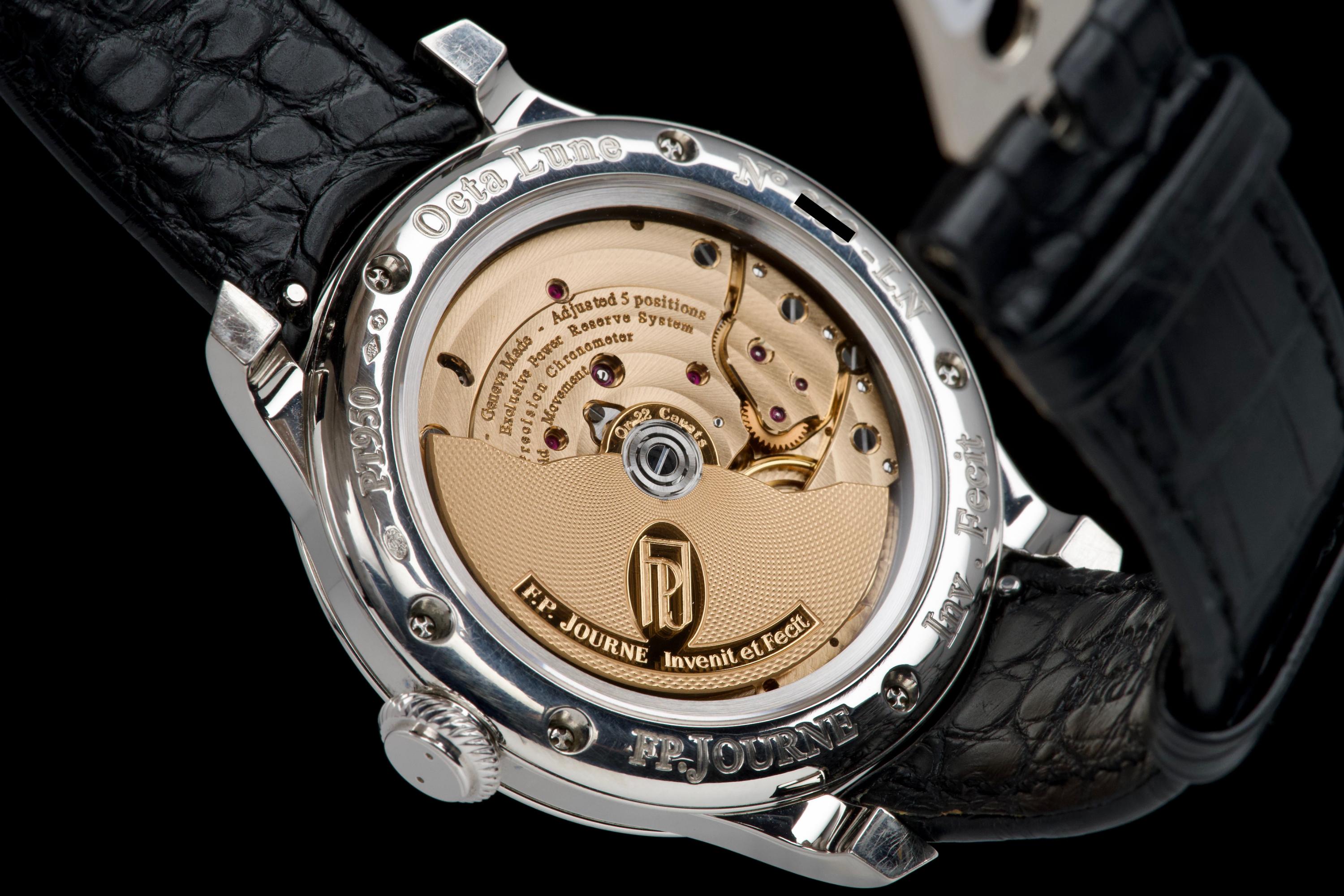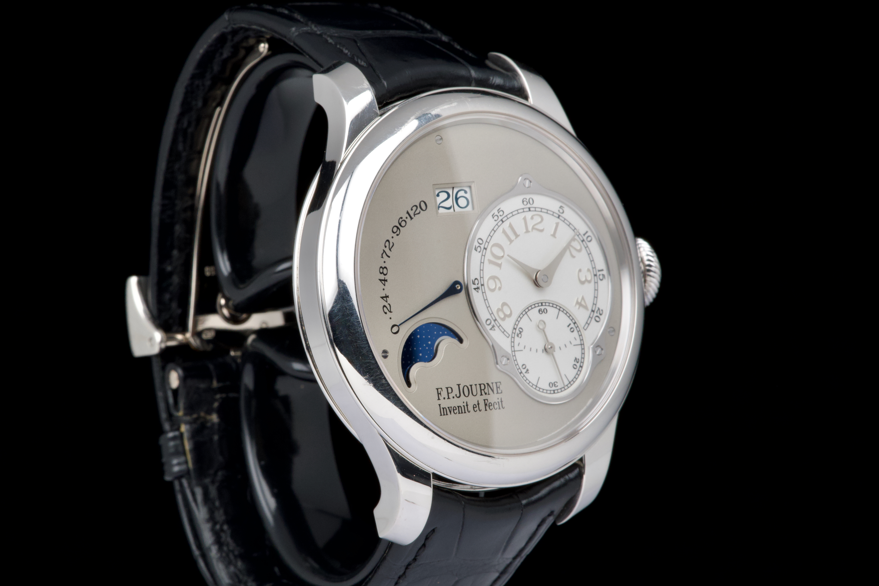 A beautiful example of the F.P. Journe Octa Lune in platinum, coming from its second owner and complete with its full 2021 set. The watch remains unpolished, showing light wear and small marks from use, consistent with careful ownership. The 42 mm platinum case houses the automatic F.P. Journe caliber 1300.3, crafted in solid 18K rose gold and visible through the sapphire caseback. Fitted with a platinum deployant clasp, this Octa Lune combines refined proportions with the perfect balance of practicality and elegance. A superb and honest example of the larger 42 mm Octa Lune — understated, luxurious, and powered by one of F.P. Journe’s most celebrated automatic movements.