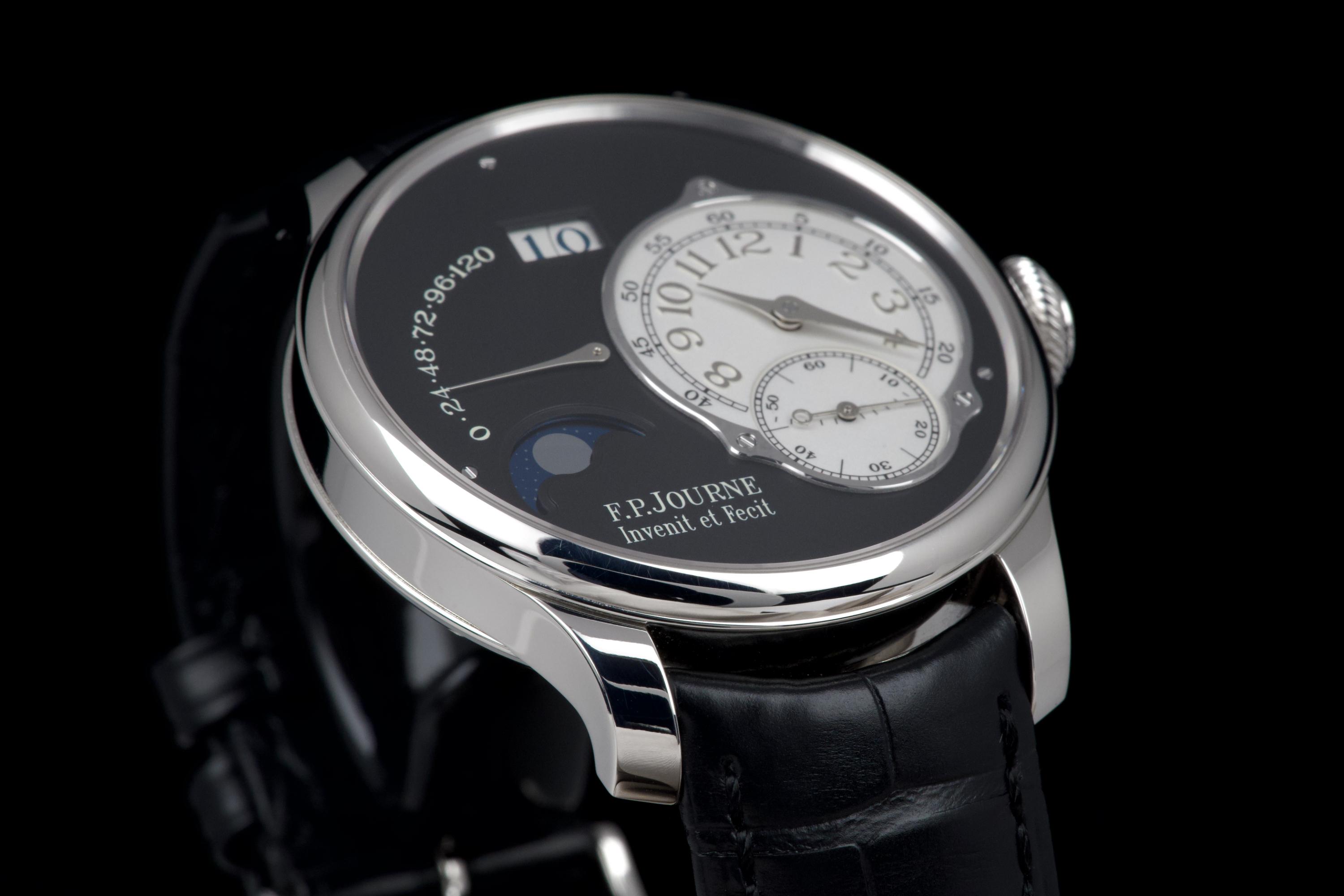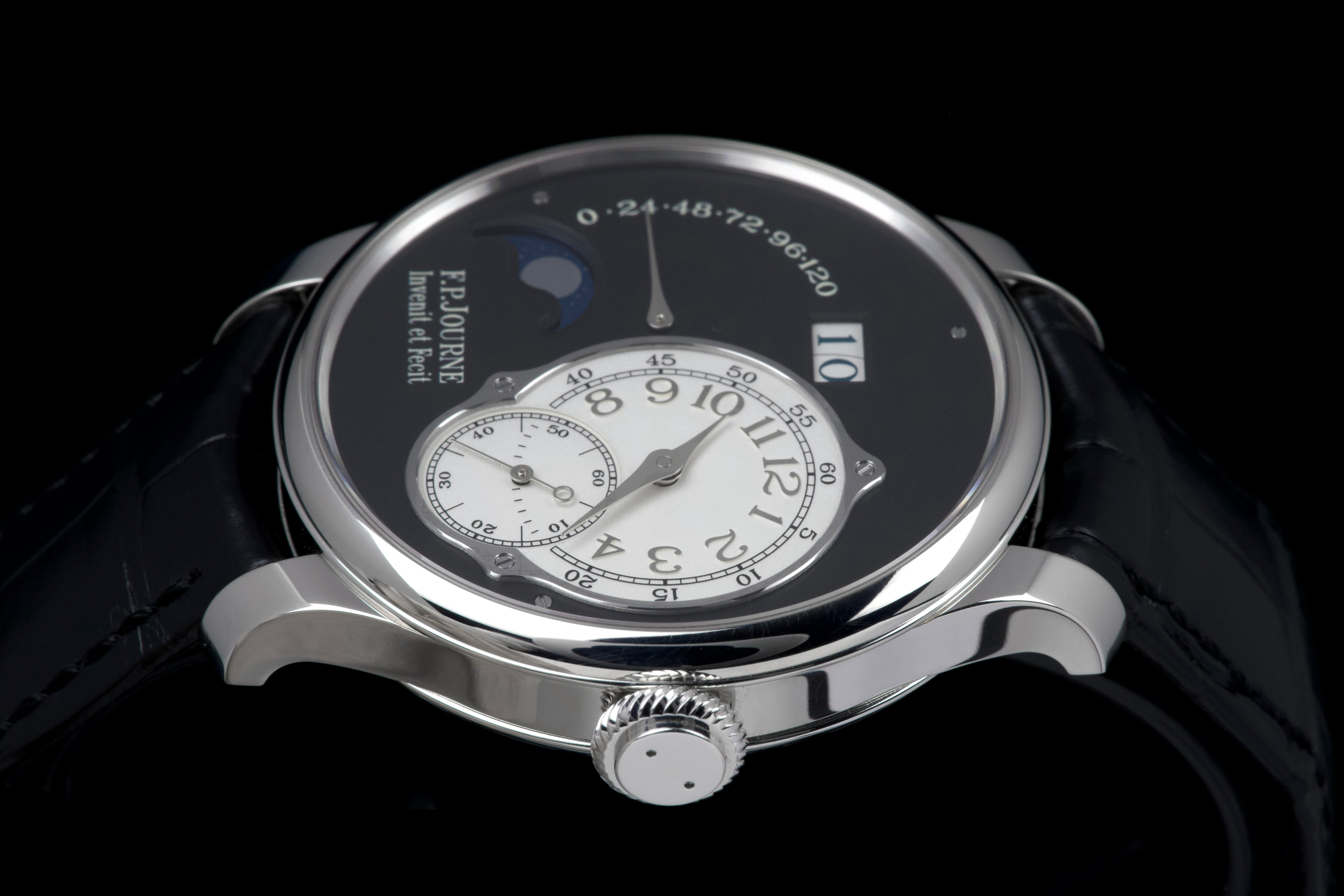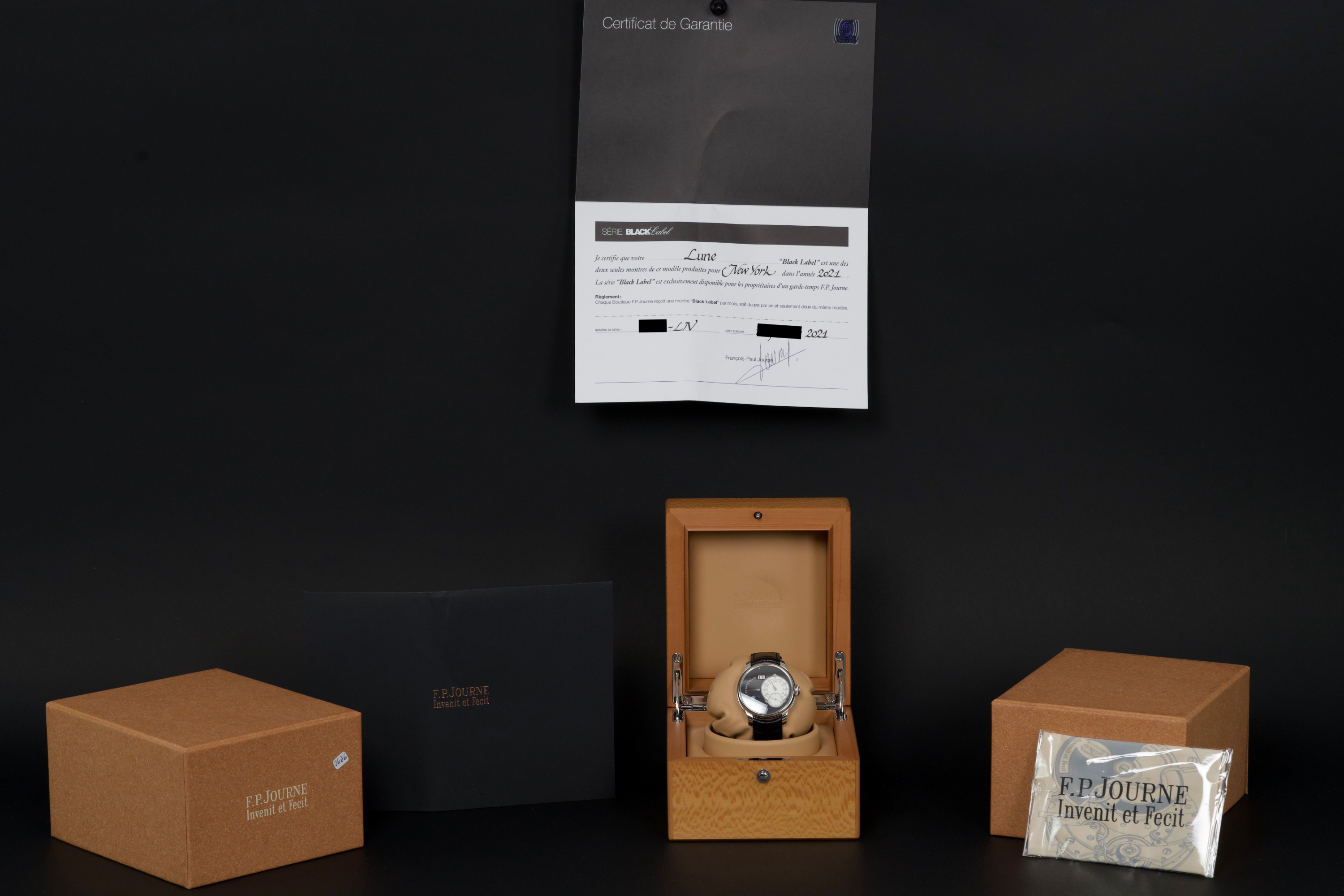 A superb example of the highly exclusive F.P. Journe Octa Lune Black Label, crafted in platinum and available only to existing F.P. Journe owners. The watch remains unpolished and shows extremely light wear from careful use. The deep black lacquer dialcontrasts beautifully with the white gold hands and applied numerals, while the moonphase and power reserve displays preserve perfect legibility and balance. Powered by the automatic F.P. Journe caliber 1300.3 in solid 18K rose gold, visible through the sapphire caseback. Complete with its original box, warranty card, and accessories. A rare opportunity to acquire one of the most coveted variants of the Octa Lune — elegant, exclusive, and beautifully preserved.