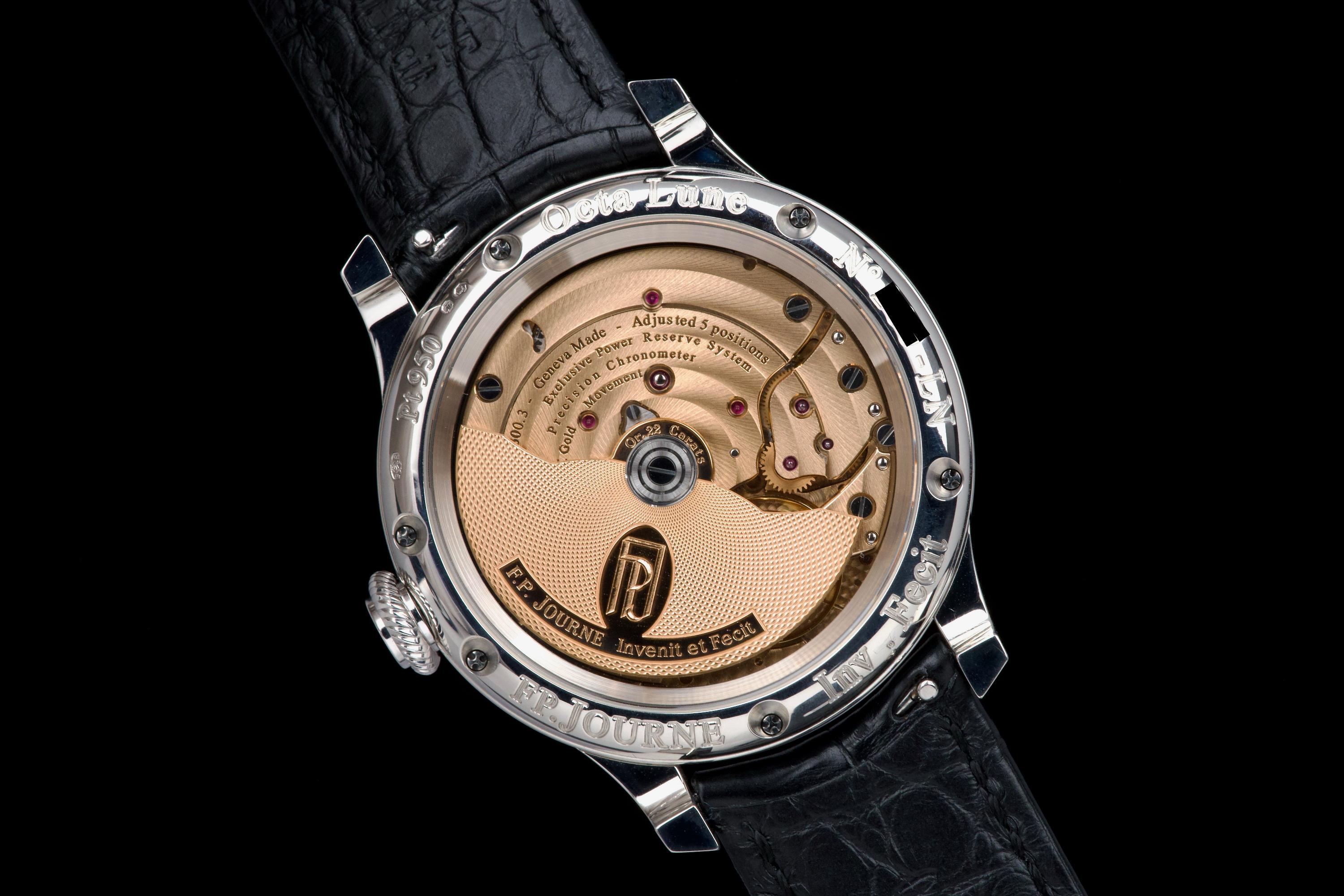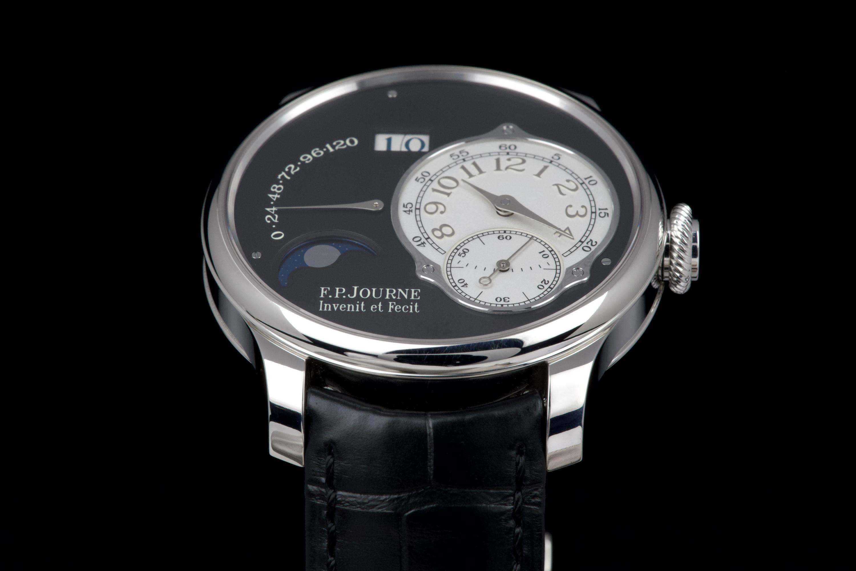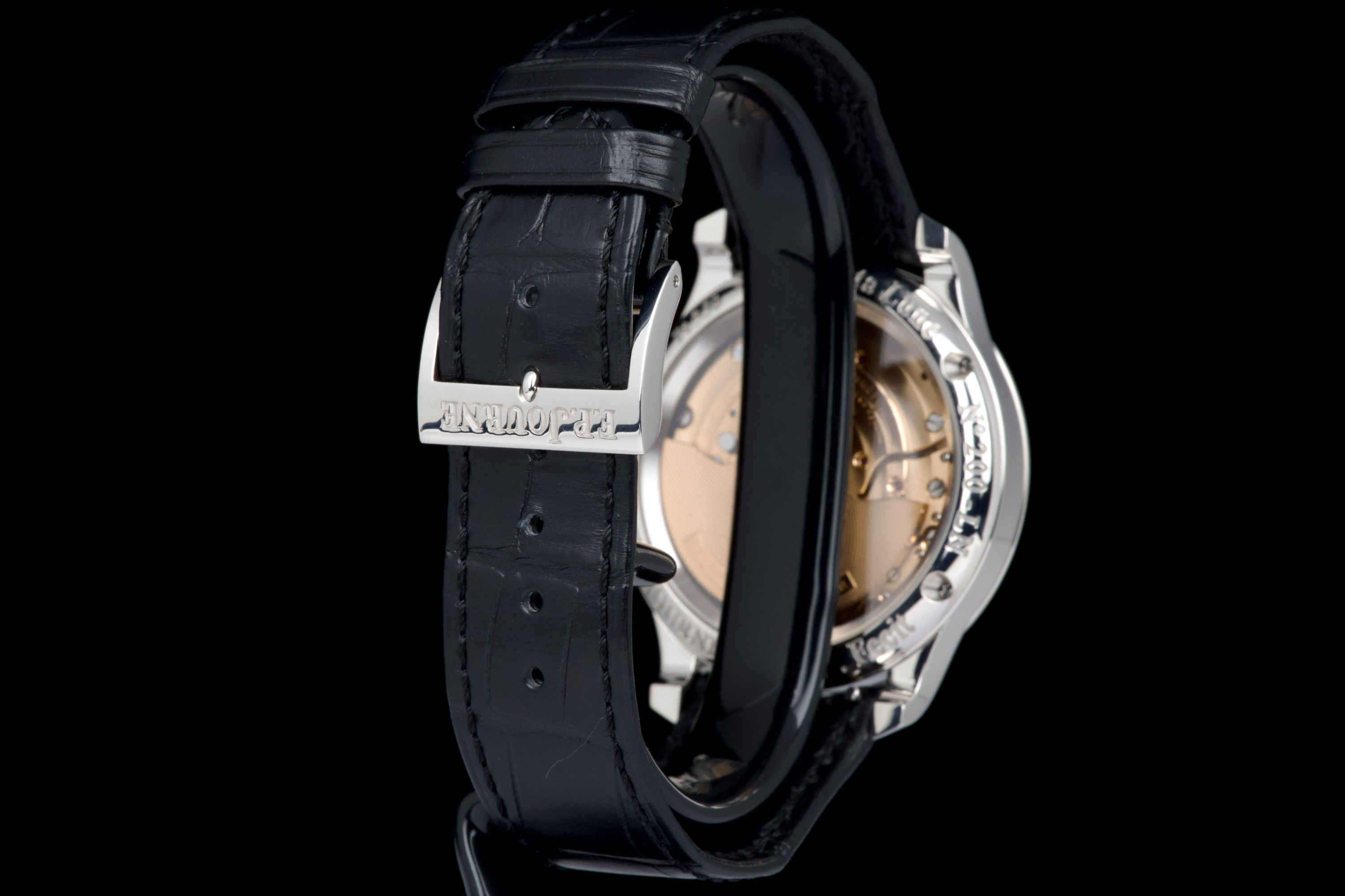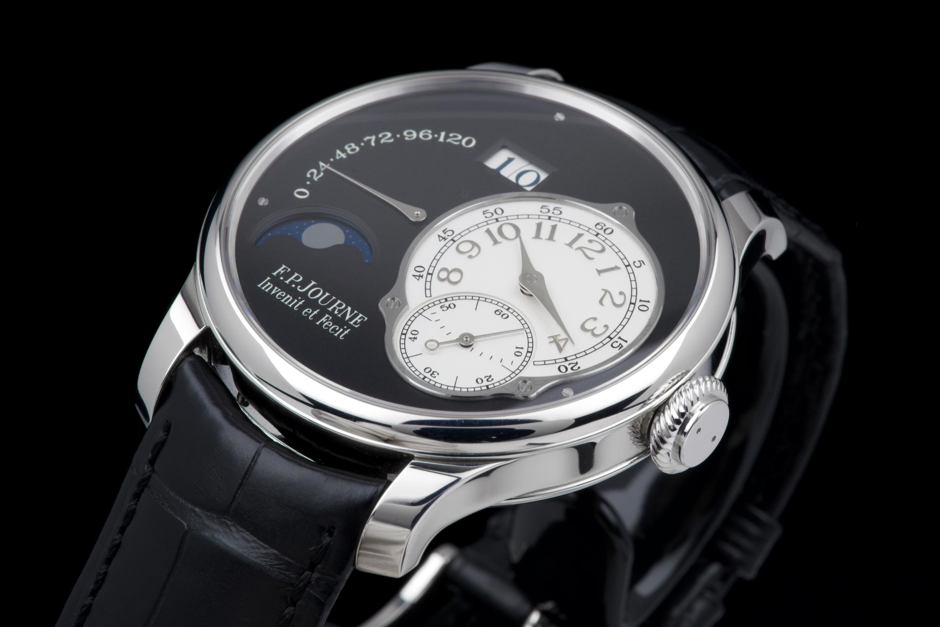 A superb example of the highly exclusive F.P. Journe Octa Lune Black Label, crafted in platinum and available only to existing F.P. Journe owners. The watch remains unpolished and shows extremely light wear from careful use. The deep black lacquer dialcontrasts beautifully with the white gold hands and applied numerals, while the moonphase and power reserve displays preserve perfect legibility and balance. Powered by the automatic F.P. Journe caliber 1300.3 in solid 18K rose gold, visible through the sapphire caseback. Complete with its original box, warranty card, and accessories. A rare opportunity to acquire one of the most coveted variants of the Octa Lune — elegant, exclusive, and beautifully preserved.