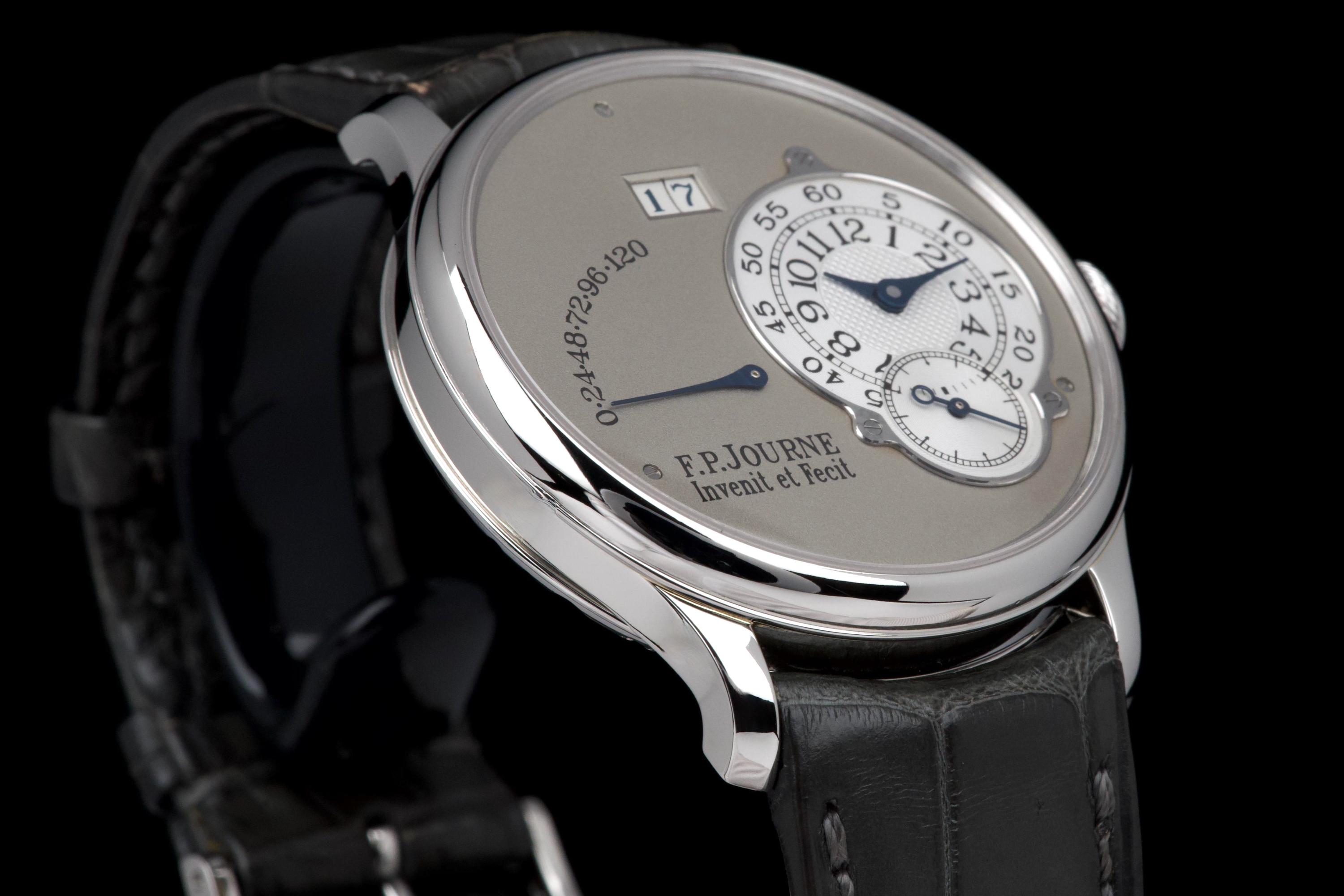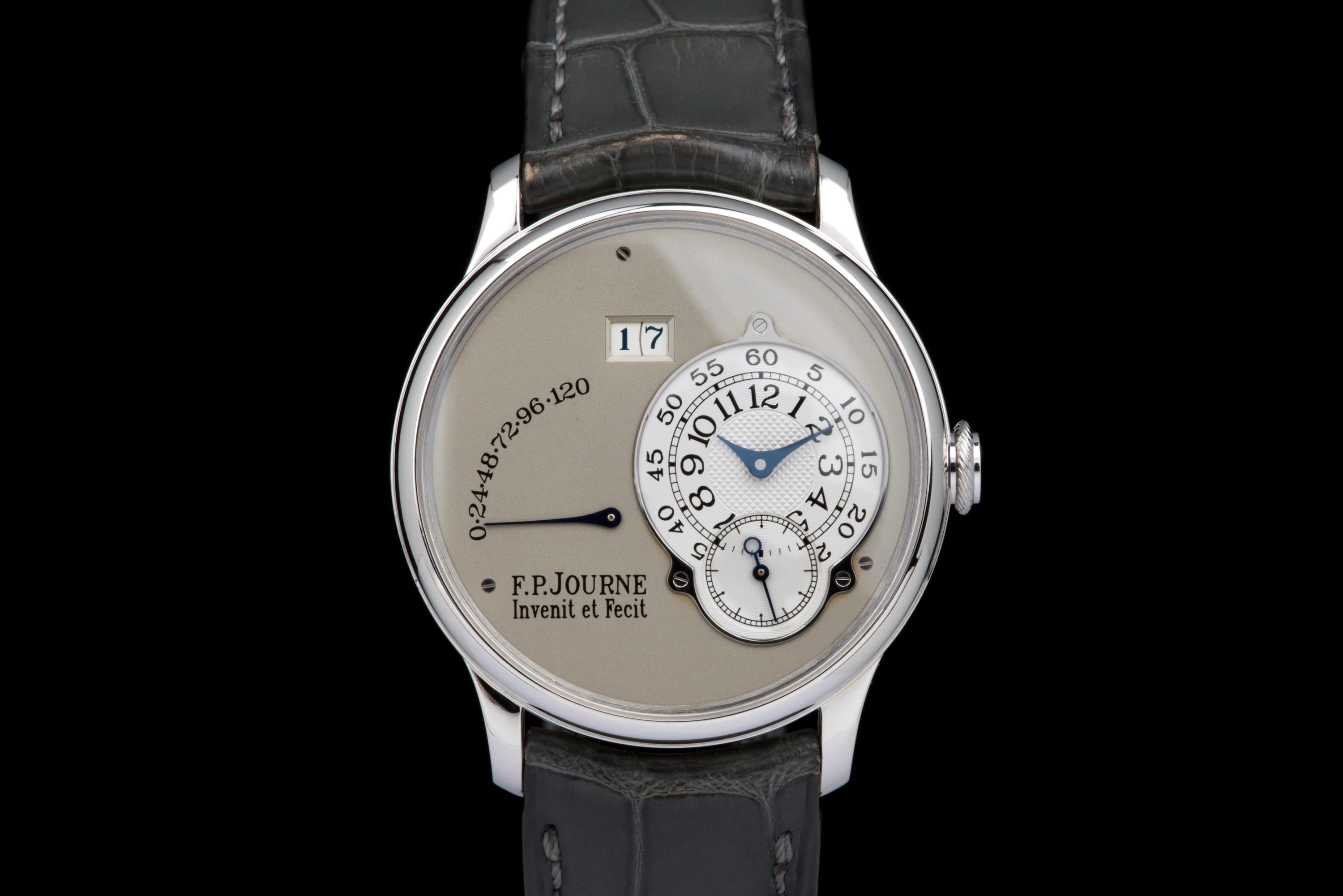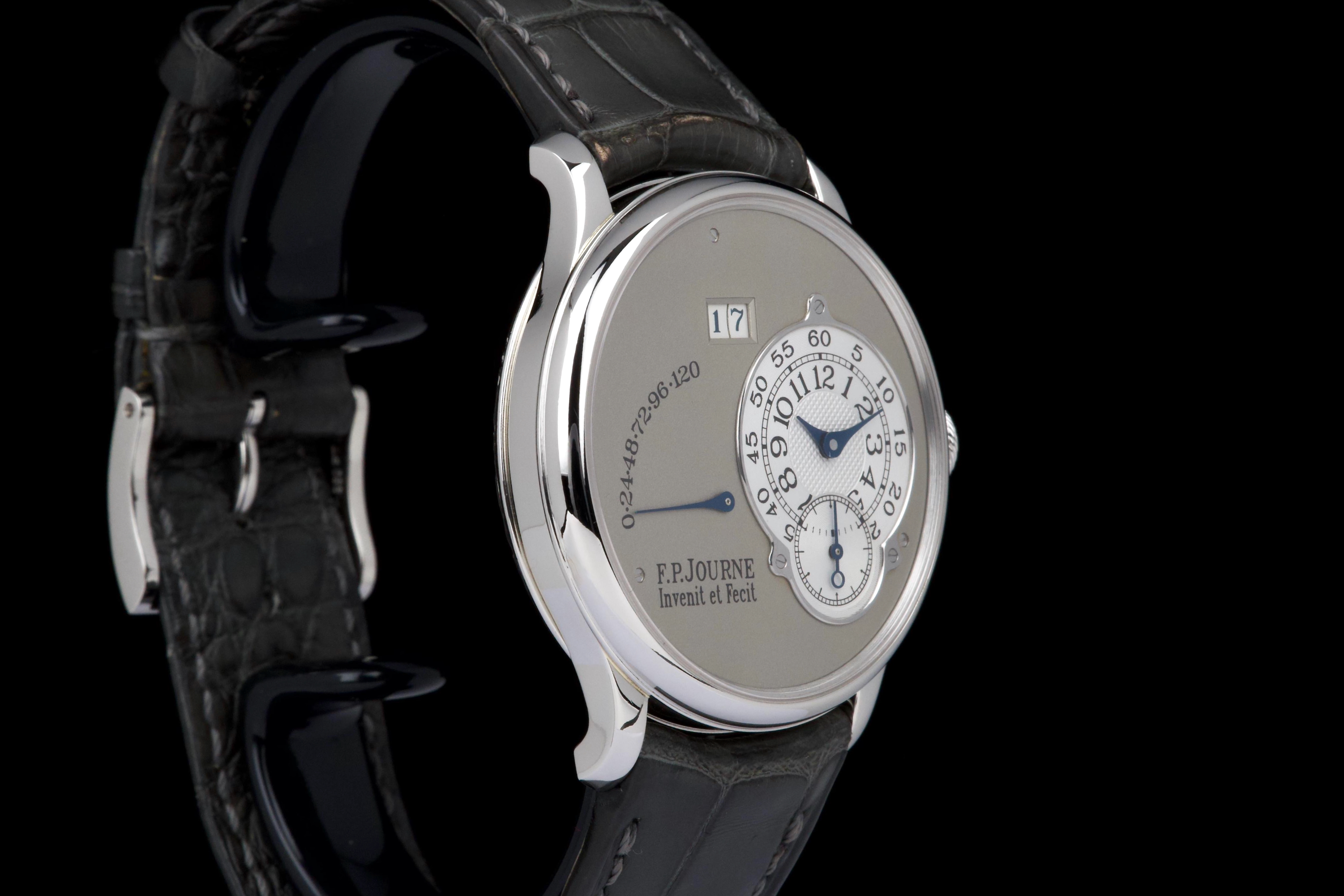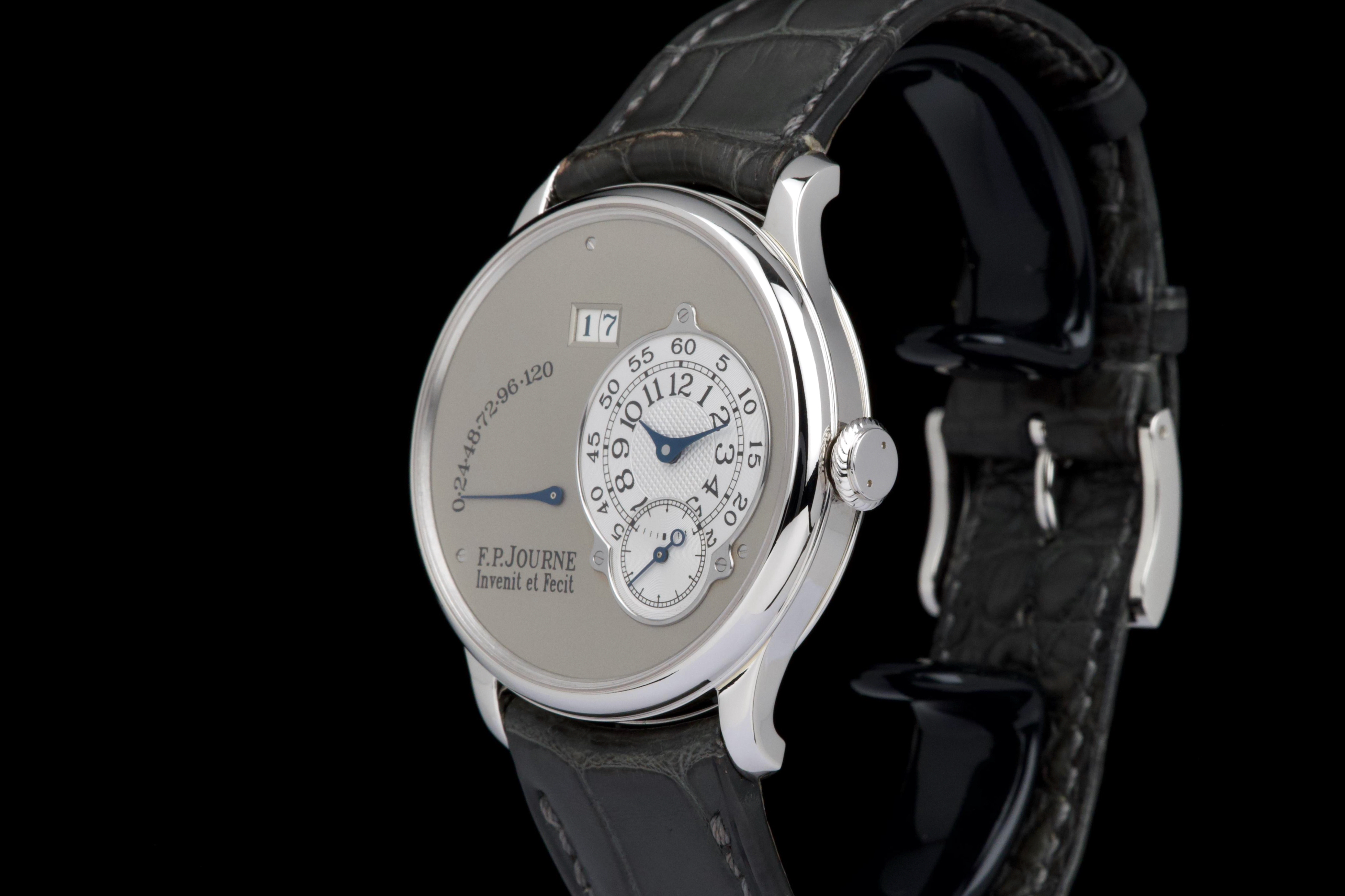 The present F.P. Journe Octa Réserve de Marche, executed in platinum and measuring 38 mm, dates to 2004 and is a superb example of one of François-Paul Journe’s most important early automatic wristwatches. Combining technical innovation with classical aesthetics, the Octa line established Journe as a leading figure of modern independent watchmaking. This example is preserved in excellent overall condition and benefits from a full service performed by F.P. Journe Paris in 2022, including movement servicing and polishing, with accompanying service documentation. The platinum case presents beautifully with crisp lines and refined surfaces consistent with careful ownership since servicing. The dial is particularly attractive, featuring a white-gold base with silver guilloché decoration, displaying the refined textures and depth characteristic of early Journe production. The movement, visible through the caseback, is crafted in 18K rose gold, a signature hallmark of early F.P. Journe calibres and a detail highly prized by collectors for both its aesthetic and historical significance. The watch is fitted with a grey alligator leather strap in approximately 70% condition, paired with its original platinum ardillon buckle, maintaining full material coherence. It is accompanied by its original box, as well as an Authenticity Certificate confirming production in 2004 and original delivery in St. Barthélemy, adding notable provenance. Elegant, historically important, and freshly serviced by the manufacture, this Octa Réserve de Marche represents a compelling opportunity to acquire an early platinum F.P. Journe in outstanding condition, combining mechanical innovation, precious materials, and strong documentation.