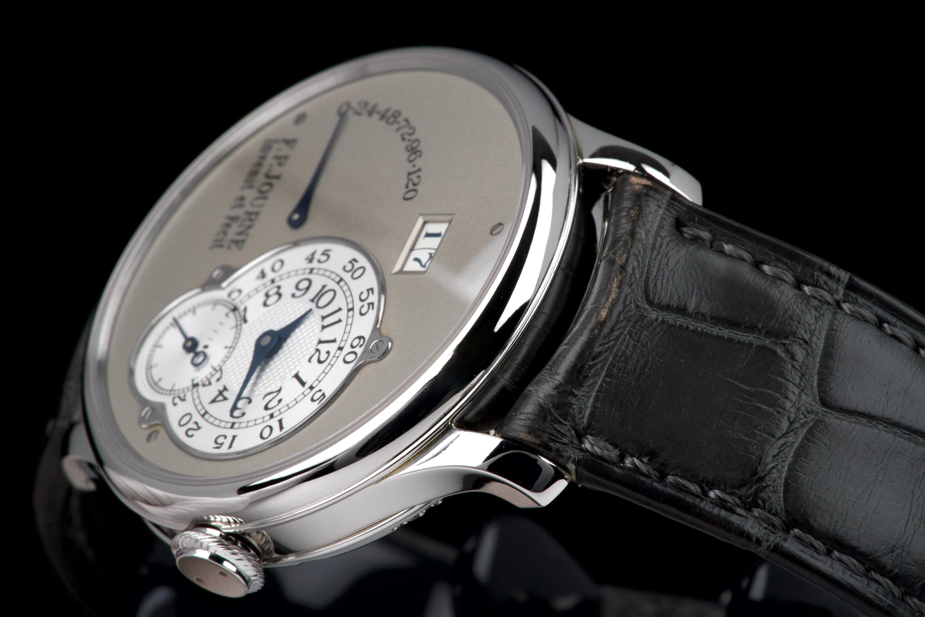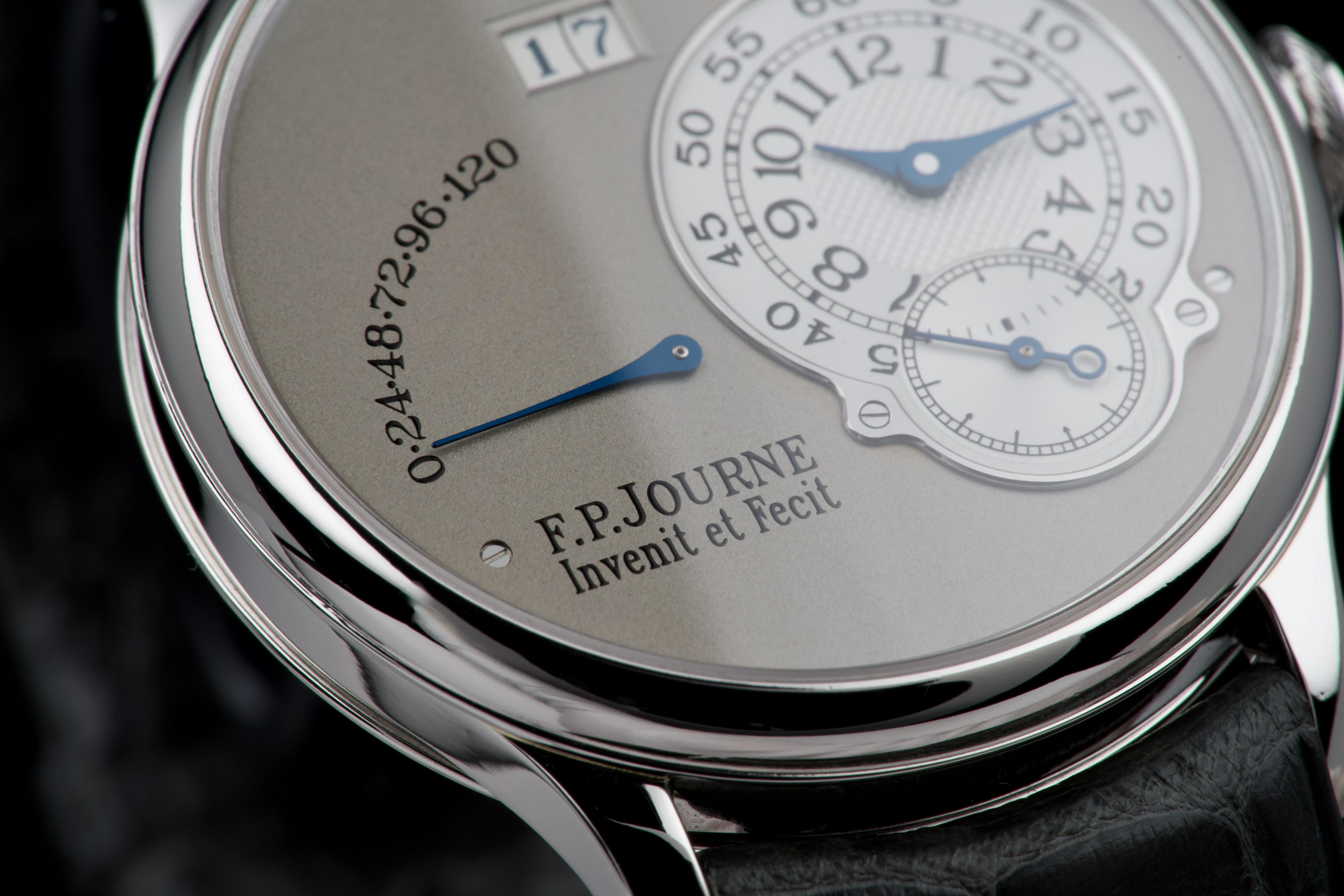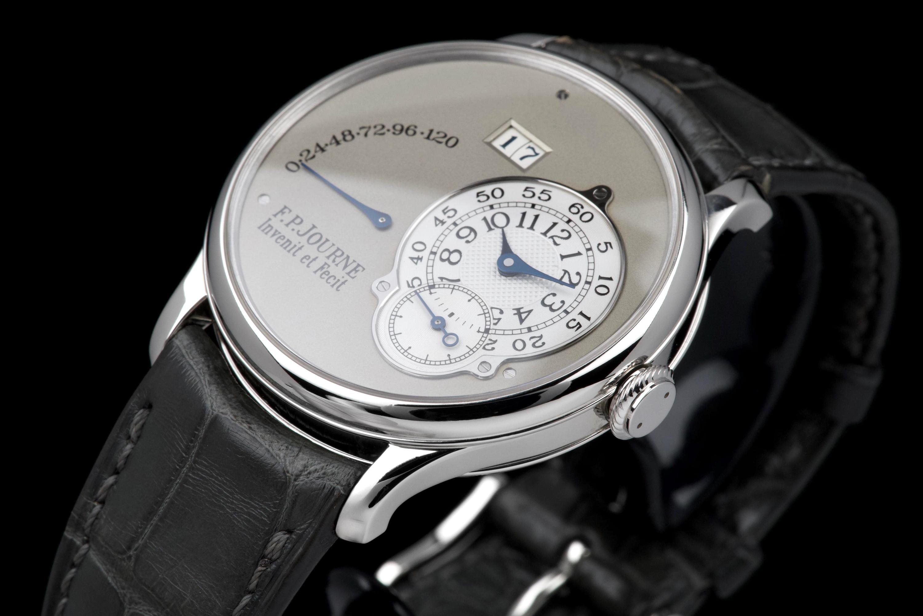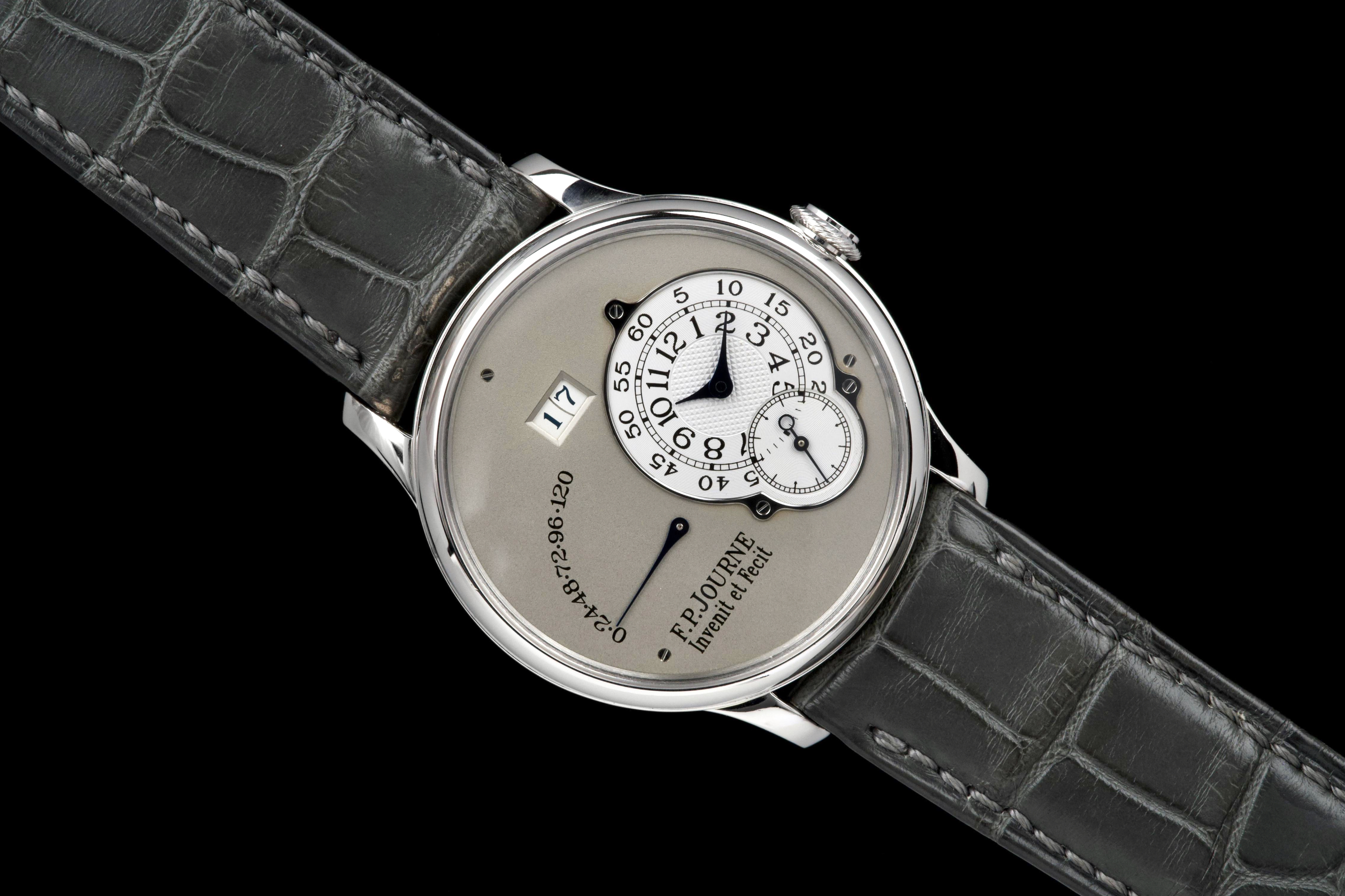 The present F.P. Journe Octa Réserve de Marche, executed in platinum and measuring 38 mm, dates to 2004 and is a superb example of one of François-Paul Journe’s most important early automatic wristwatches. Combining technical innovation with classical aesthetics, the Octa line established Journe as a leading figure of modern independent watchmaking. This example is preserved in excellent overall condition and benefits from a full service performed by F.P. Journe Paris in 2022, including movement servicing and polishing, with accompanying service documentation. The platinum case presents beautifully with crisp lines and refined surfaces consistent with careful ownership since servicing. The dial is particularly attractive, featuring a white-gold base with silver guilloché decoration, displaying the refined textures and depth characteristic of early Journe production. The movement, visible through the caseback, is crafted in 18K rose gold, a signature hallmark of early F.P. Journe calibres and a detail highly prized by collectors for both its aesthetic and historical significance. The watch is fitted with a grey alligator leather strap in approximately 70% condition, paired with its original platinum ardillon buckle, maintaining full material coherence. It is accompanied by its original box, as well as an Authenticity Certificate confirming production in 2004 and original delivery in St. Barthélemy, adding notable provenance. Elegant, historically important, and freshly serviced by the manufacture, this Octa Réserve de Marche represents a compelling opportunity to acquire an early platinum F.P. Journe in outstanding condition, combining mechanical innovation, precious materials, and strong documentation.