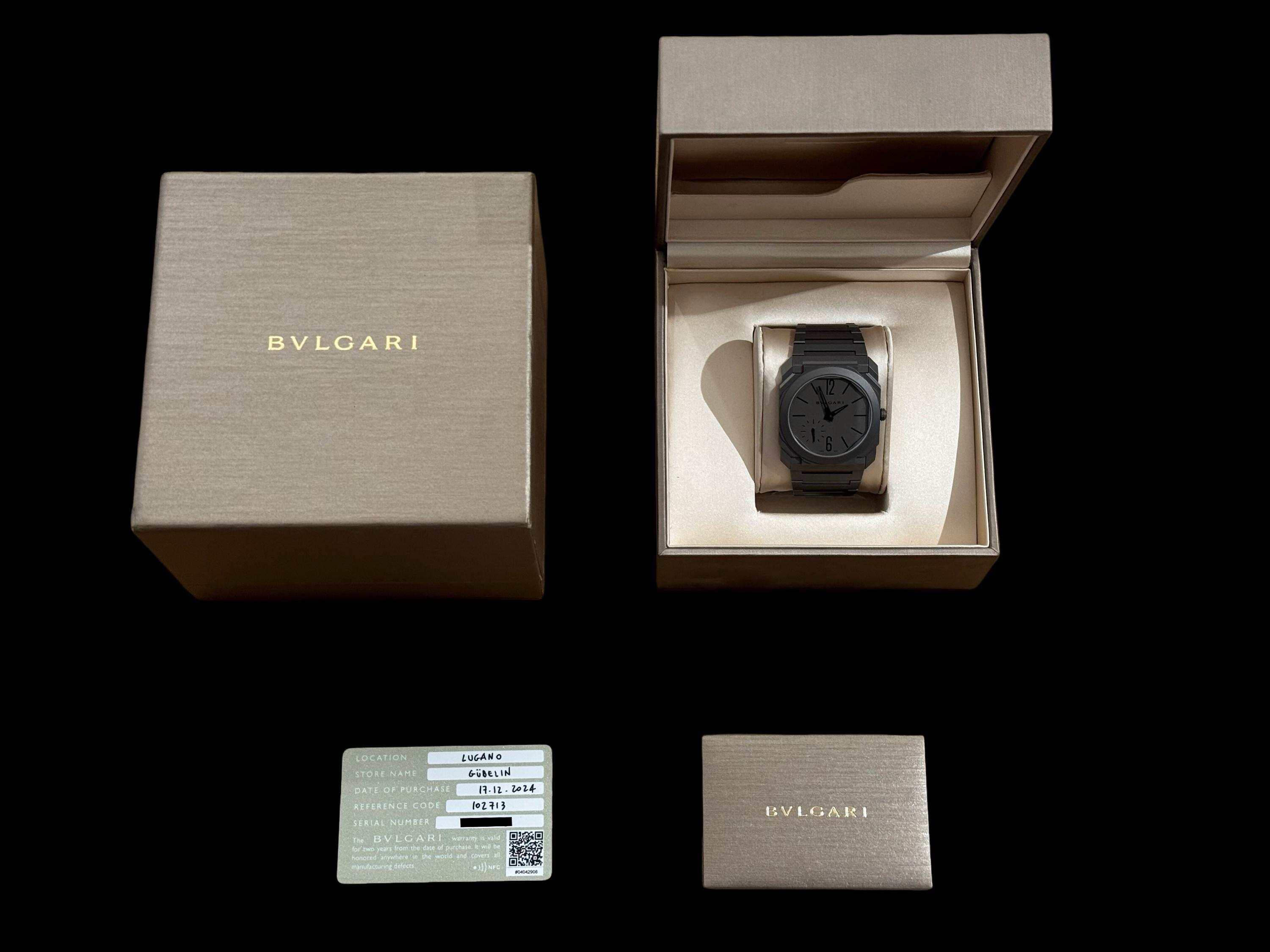 An ultra-thin and contemporary Bulgari Octo Finissimo in titanium, presented in perfect condition. The watch is fitted with the original titanium bracelet, complete with all links, combining lightness and comfort with striking architectural design. Powered by the in-house automatic caliber BVL 138 with micro-rotor, visible through the sapphire caseback, offering a 60-hour power reserve within an exceptionally slim case. Complete with its original box, warranty card dated december 2024, and accessories. A superb opportunity to acquire one of Bulgari’s most celebrated modern creations, blending cutting-edge design, technical achievement, and everyday wearability.