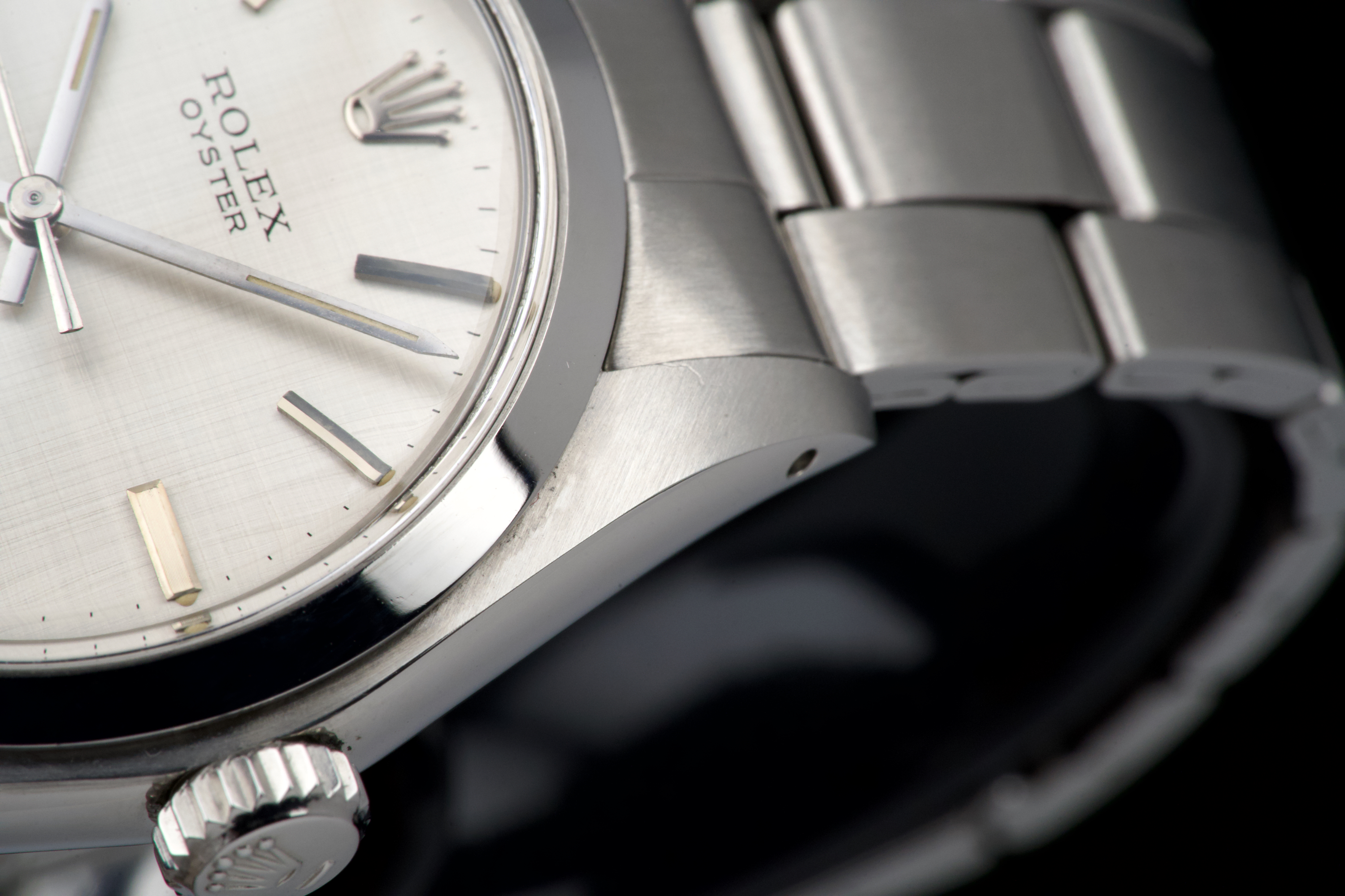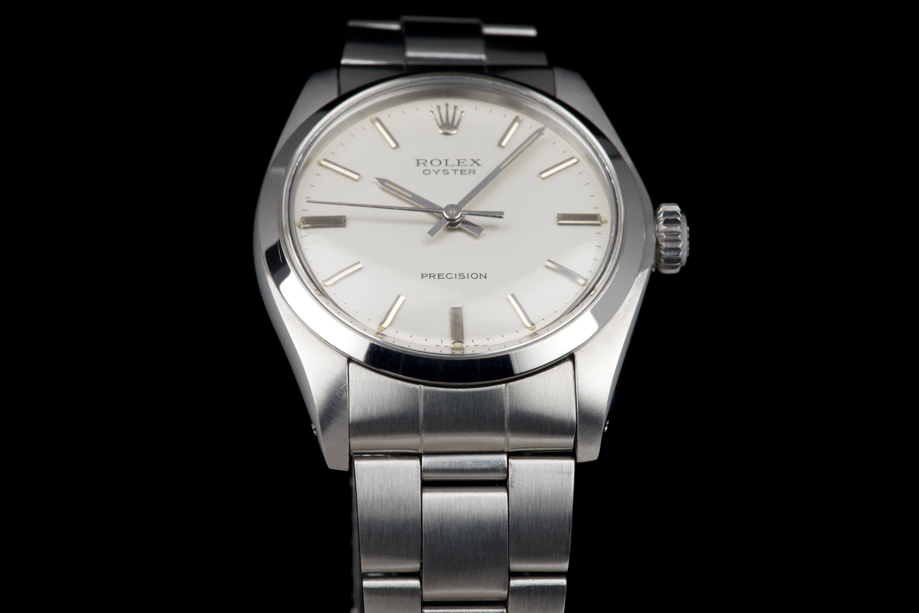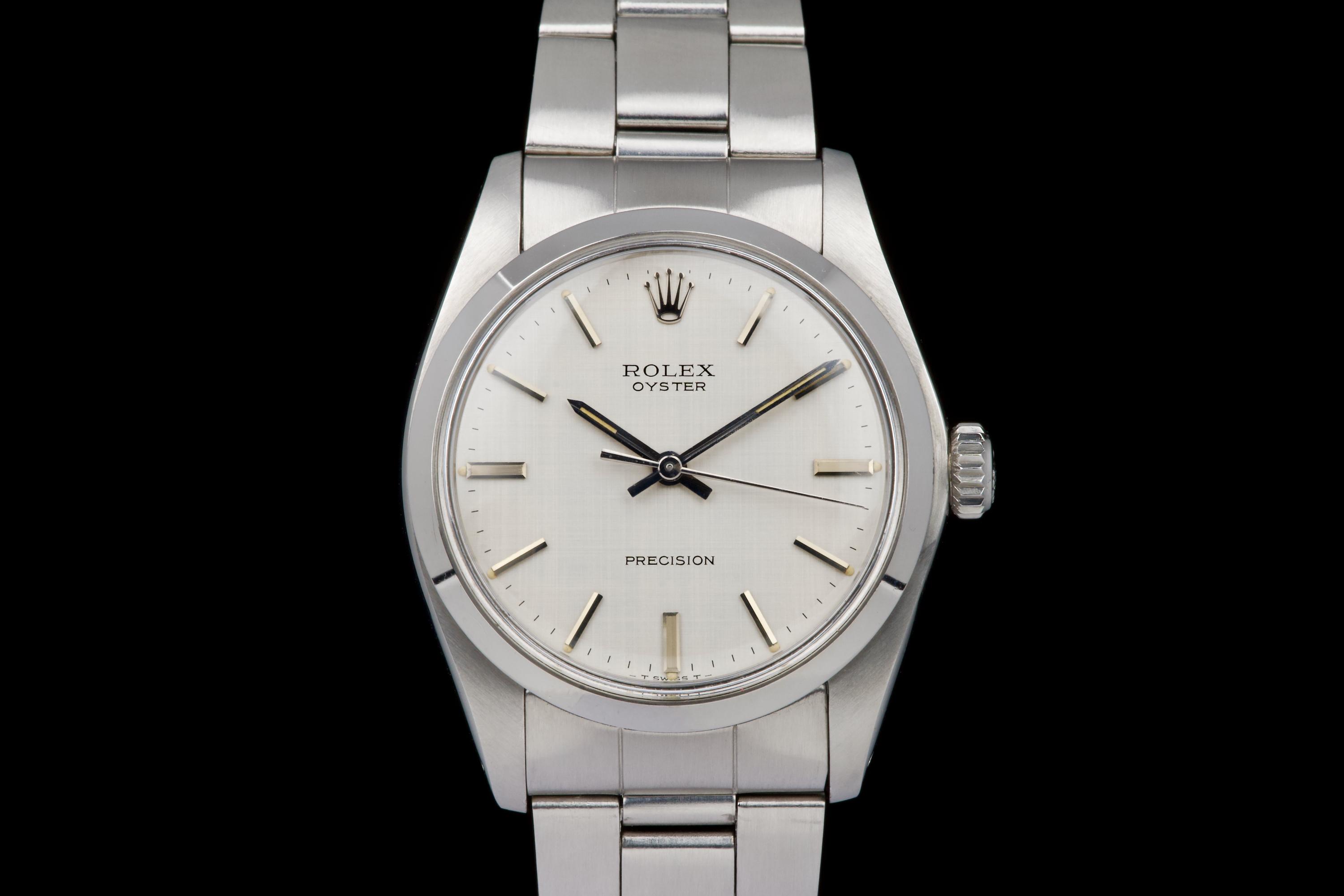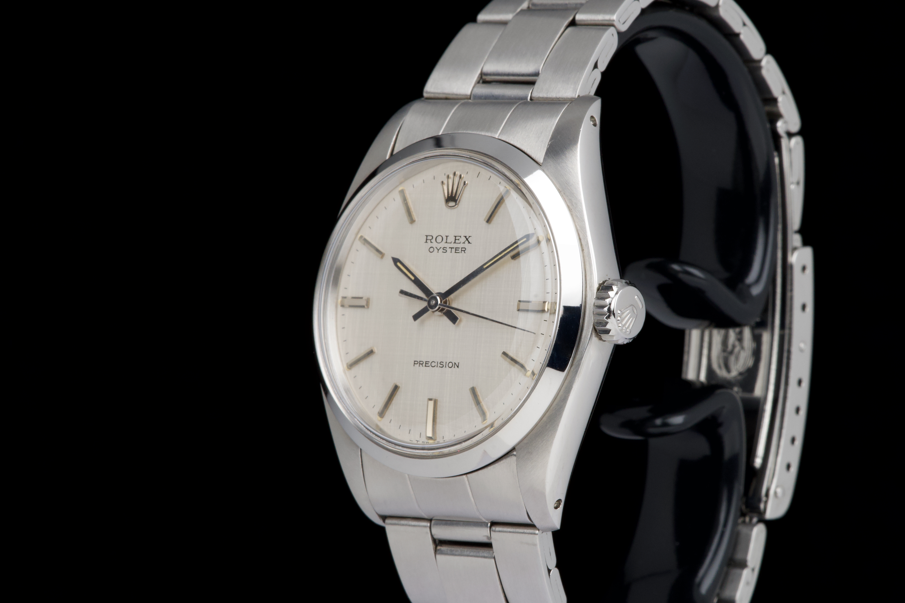 A beautifully preserved example of the 34mm Oyster Precision 6426, featuring the highly desirable silver linen tritium dial, perfectly original and in flawless condition, with matching tritium hands. Sold new in Kobe, Japan in 1975, this piece remains in outstanding and fully original condition. The 36mm stainless steel case has been polished in the past but remains thick, sharp, and symmetrical, with crisp and well-defined serial and reference numbers between the lugs (serial 3389XXX). The watch is powered by a manual-winding movement, freshly serviced by our watchmaker. It comes on its original folded 7835 Oyster bracelet with 357 endlinks, showing almost no stretch — impressive for a bracelet of this era. The clasp is undated, which is completely normal for this production period. Delivered with its original box and papers, this 6426 is a superb and honest vintage Rolex, combining rarity, condition, and timeless elegance.