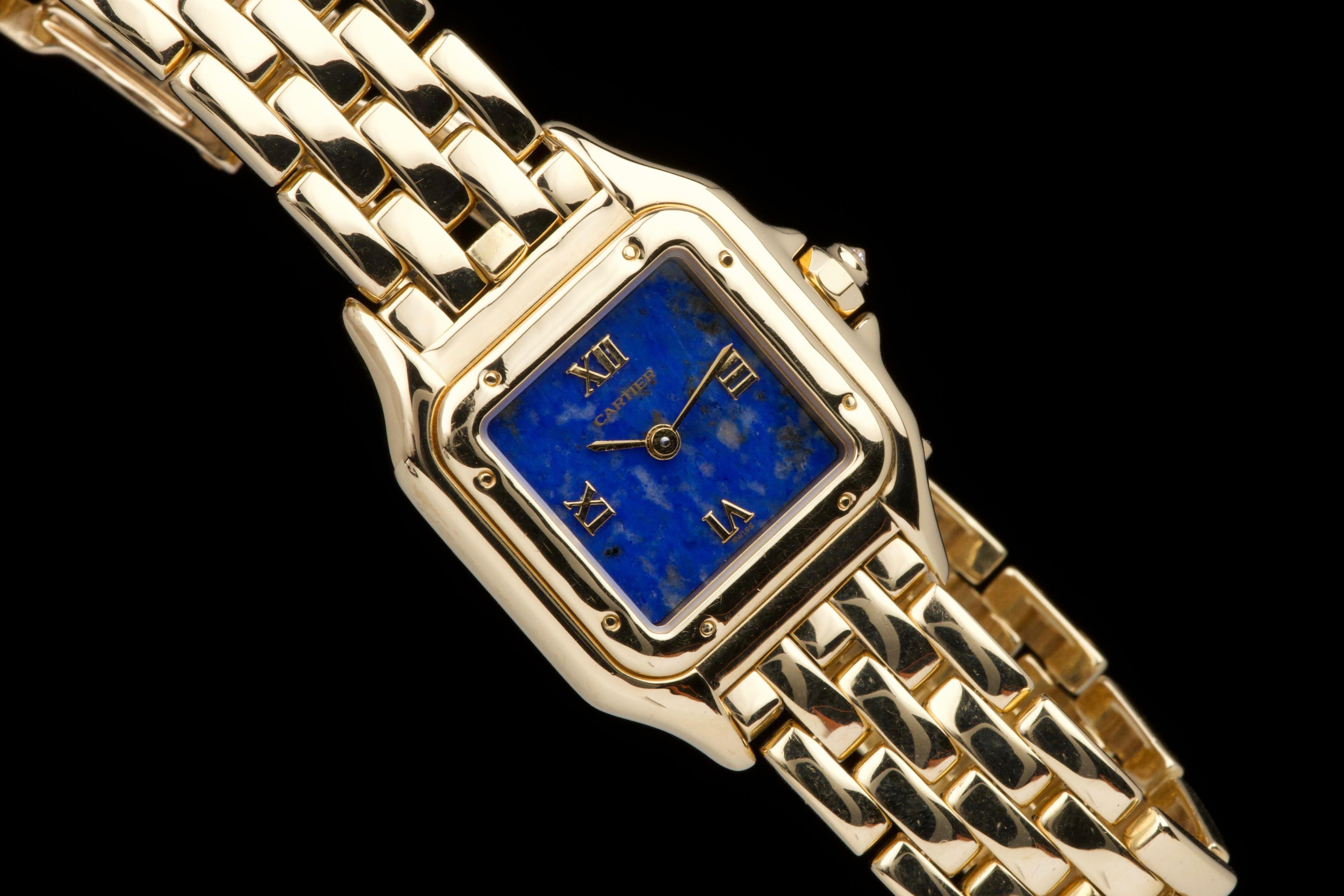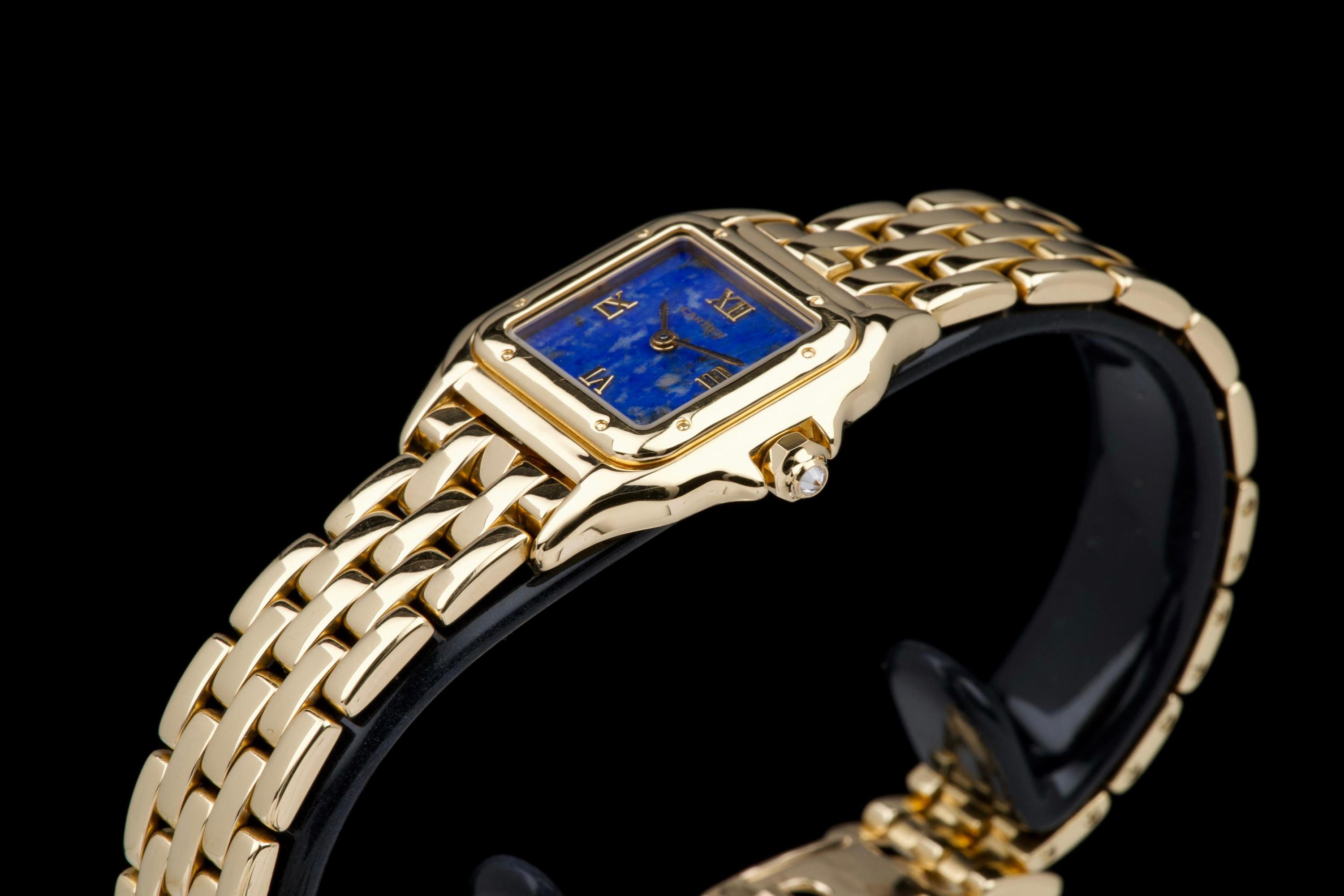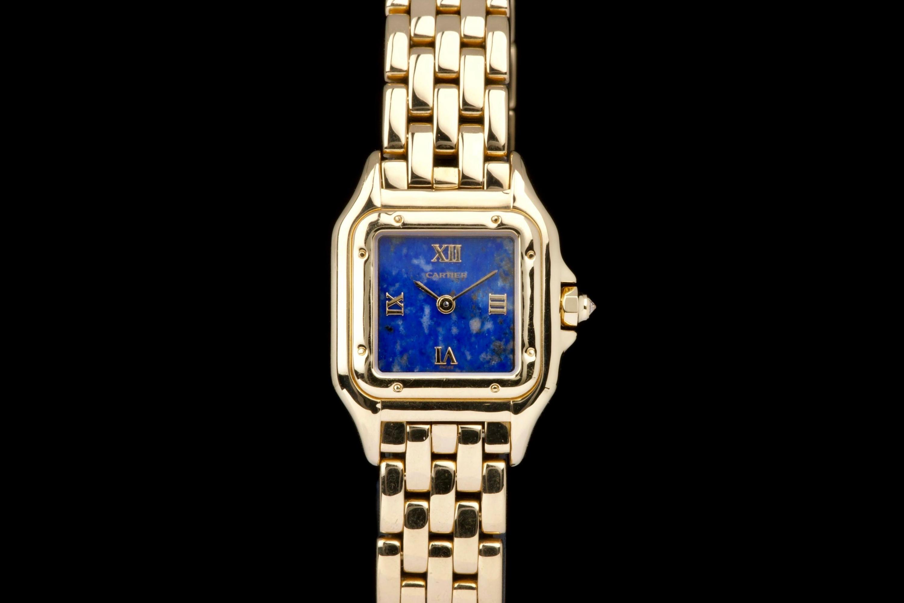 This pre-owned Cartier Panthère reference W25035B9 from the 1990's is crafted in yellow gold and distinguished by a striking blue lapis lazuli dial, a rare and highly desirable configuration within the Panthère collection. The use of a genuine stone dial ensures that no two examples are exactly alike, and the present dial displays vivid color and natural variation that enhances its visual depth and character. Cartier has intentionally preserved a sense of balance and restraint, punctuating the dial with Roman numerals at the quarter hours, a discreet Cartier signature, and two centrally mounted sword-shaped hands. The square case, measuring 21 mm, houses a quartz movement and is paired with the emblematic multi-link Panthère bracelet, designed to drape fluidly on the wrist and evoke the movement of a panther’s tail. The watch has been polished in the past and is fitted with a butterfly clasp. Elegant yet bold, this rare Panthère with lapis dial represents an appealing opportunity for collectors drawn to distinctive materials and timeless Cartier design.