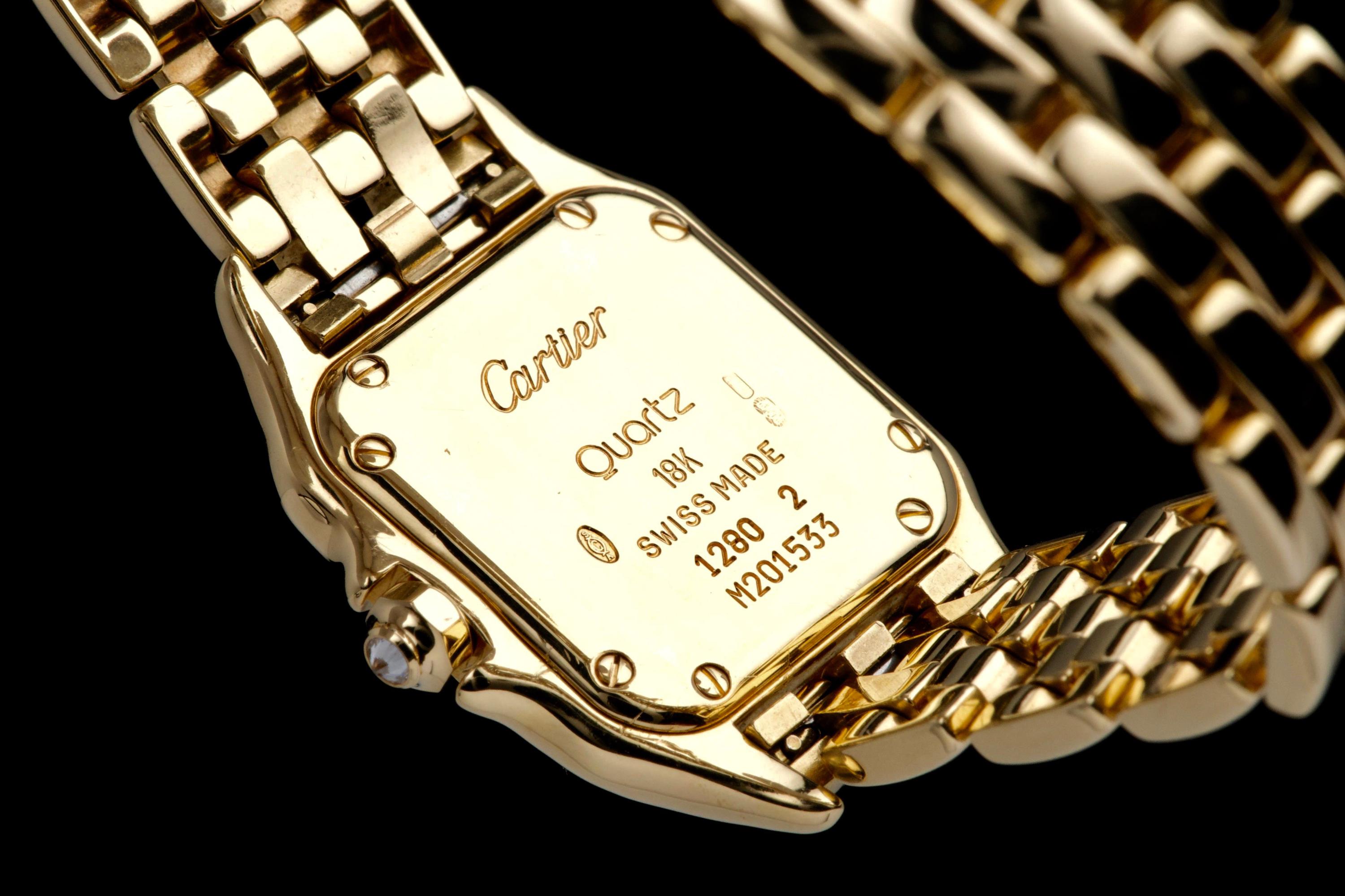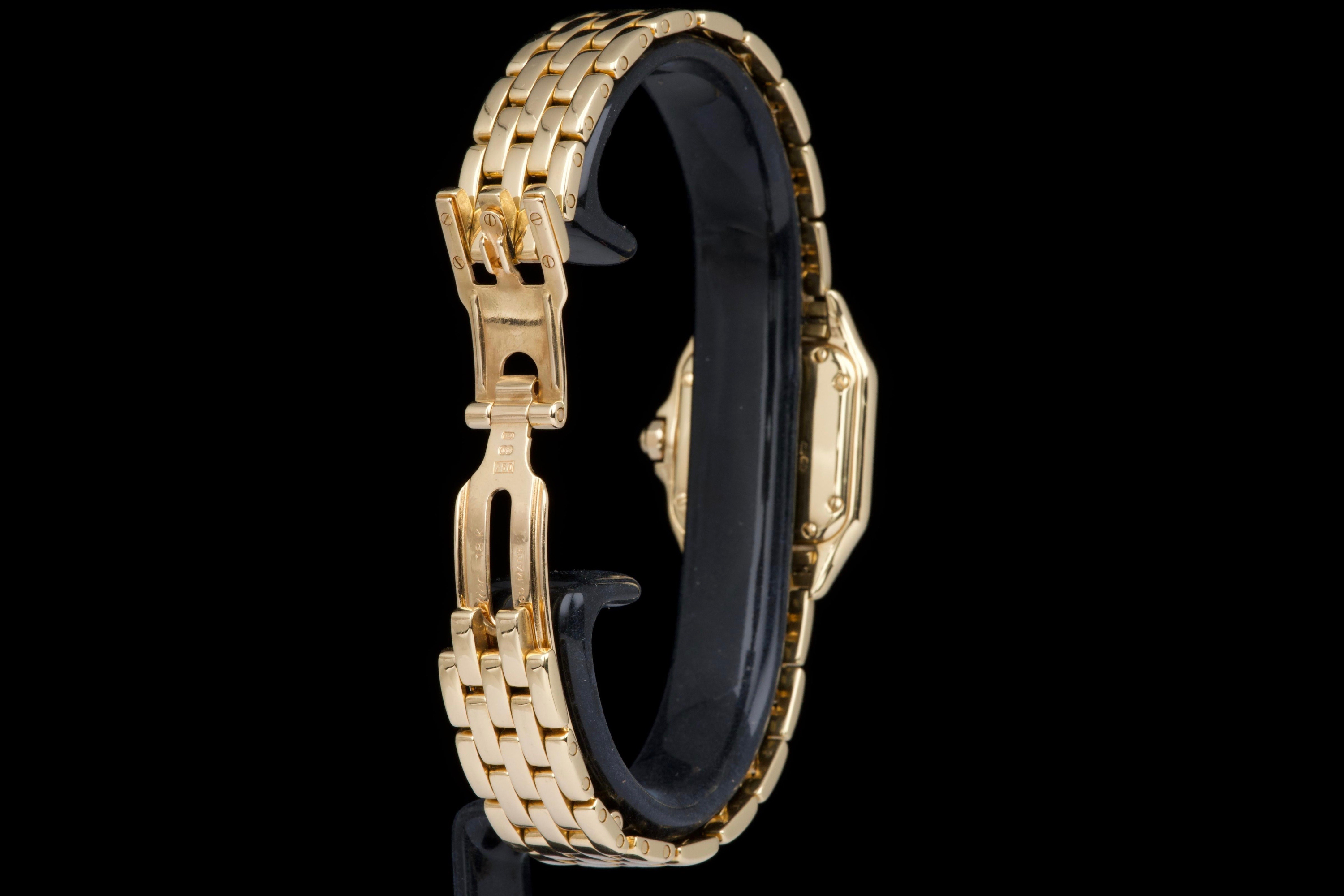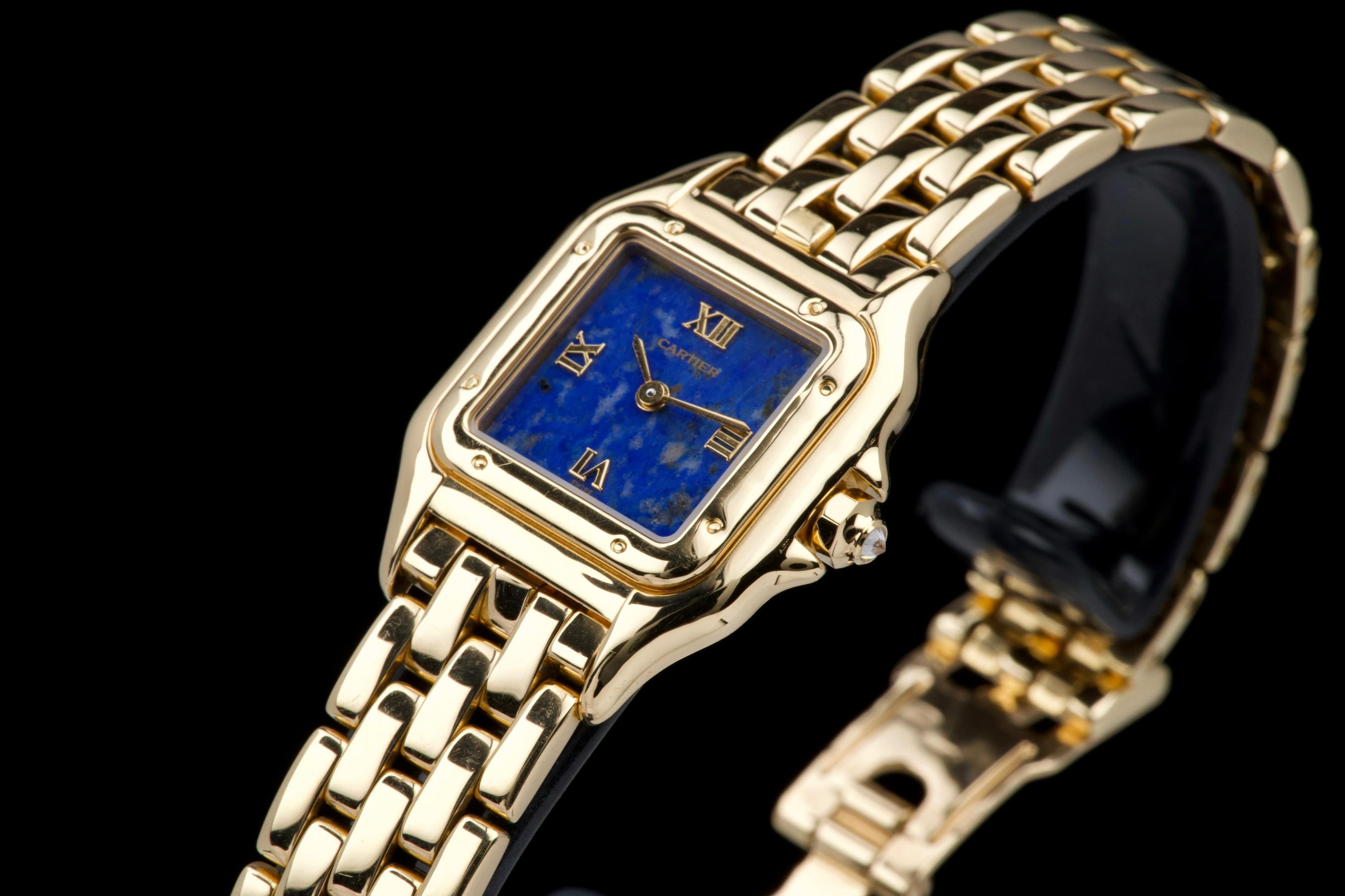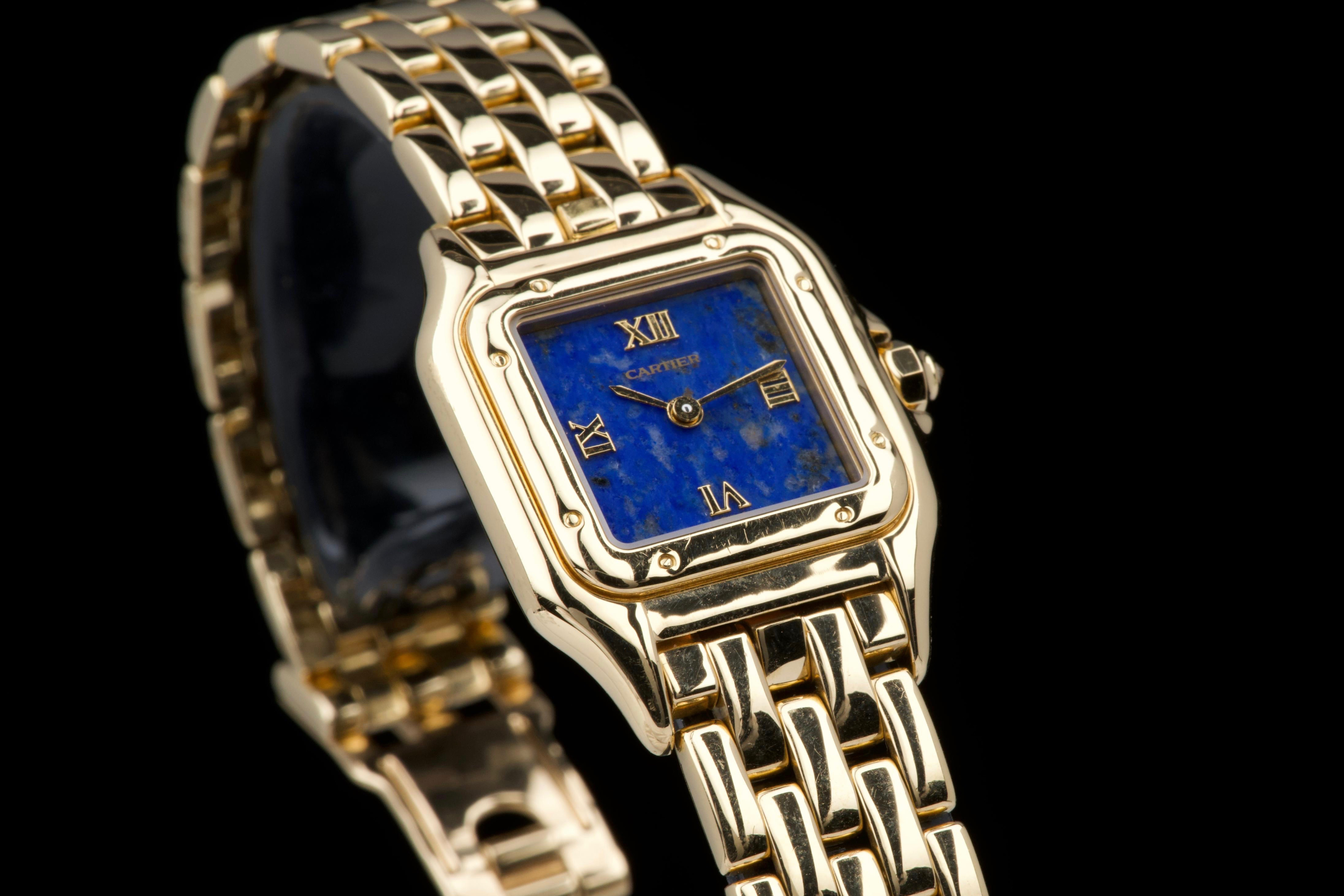 This pre-owned Cartier Panthère reference W25035B9 from the 1990's is crafted in yellow gold and distinguished by a striking blue lapis lazuli dial, a rare and highly desirable configuration within the Panthère collection. The use of a genuine stone dial ensures that no two examples are exactly alike, and the present dial displays vivid color and natural variation that enhances its visual depth and character. Cartier has intentionally preserved a sense of balance and restraint, punctuating the dial with Roman numerals at the quarter hours, a discreet Cartier signature, and two centrally mounted sword-shaped hands. The square case, measuring 21 mm, houses a quartz movement and is paired with the emblematic multi-link Panthère bracelet, designed to drape fluidly on the wrist and evoke the movement of a panther’s tail. The watch has been polished in the past and is fitted with a butterfly clasp. Elegant yet bold, this rare Panthère with lapis dial represents an appealing opportunity for collectors drawn to distinctive materials and timeless Cartier design.
