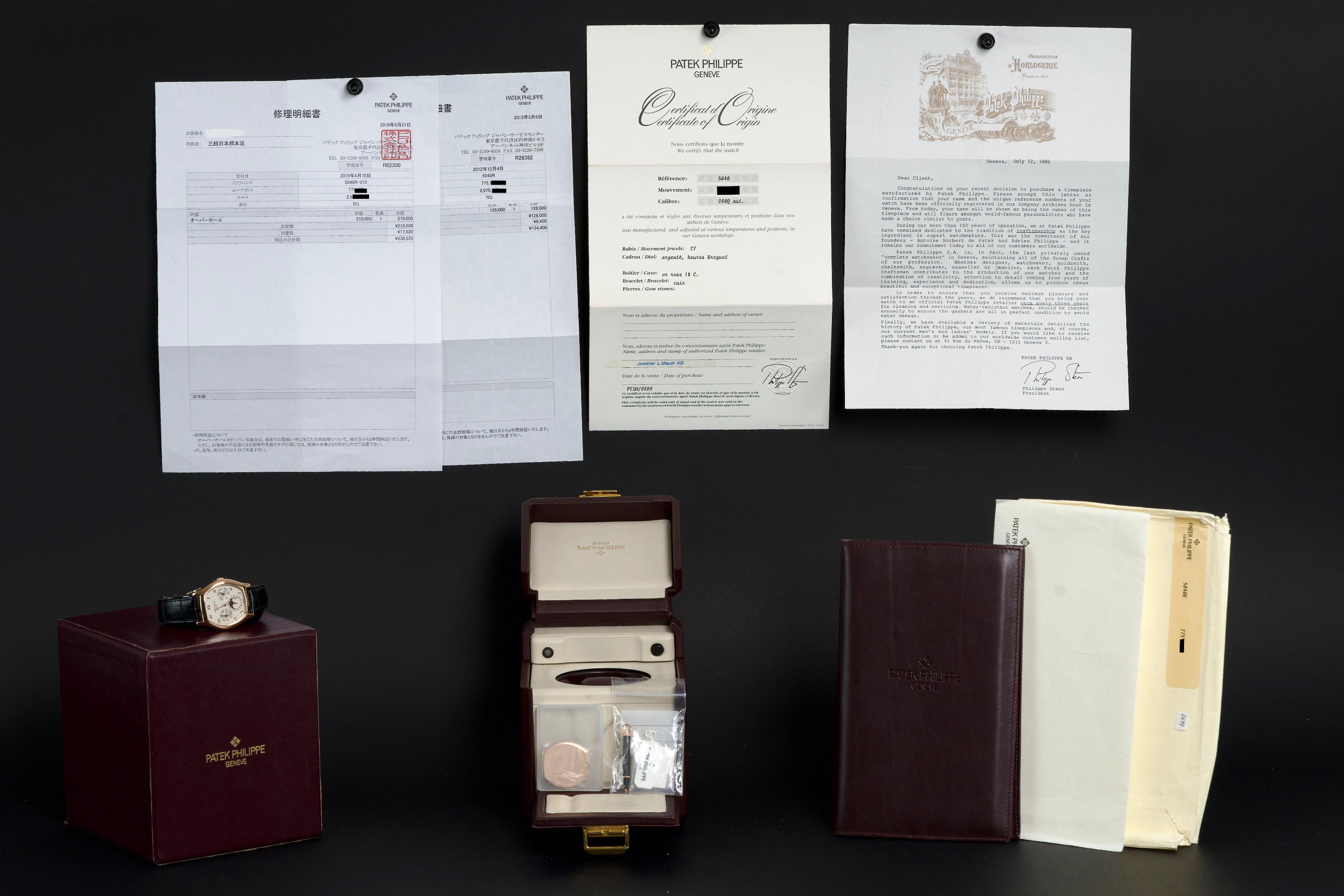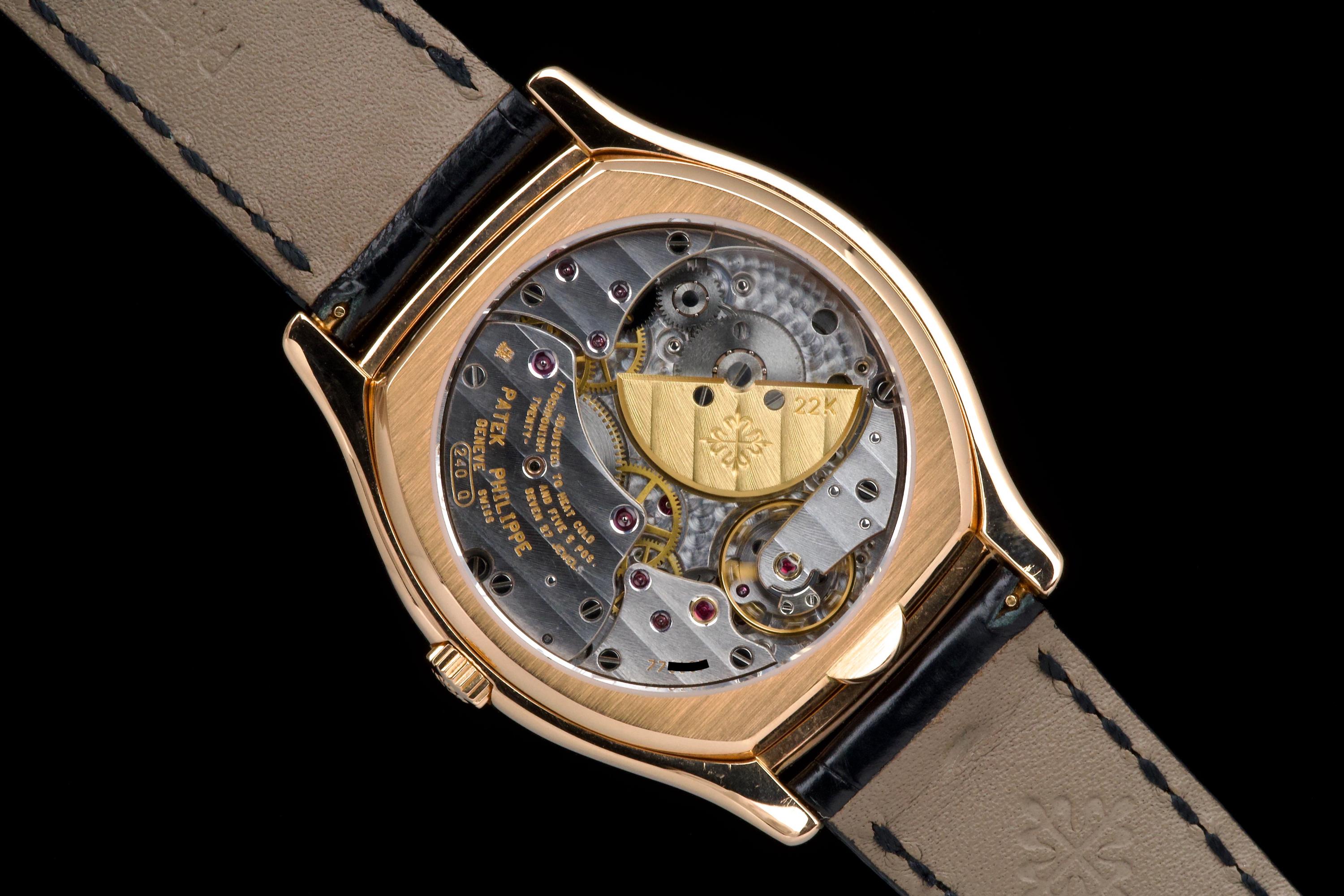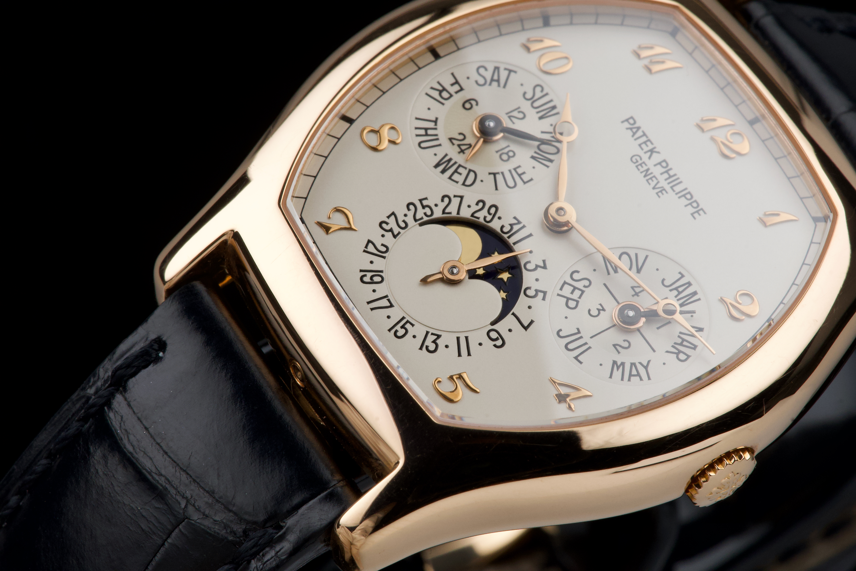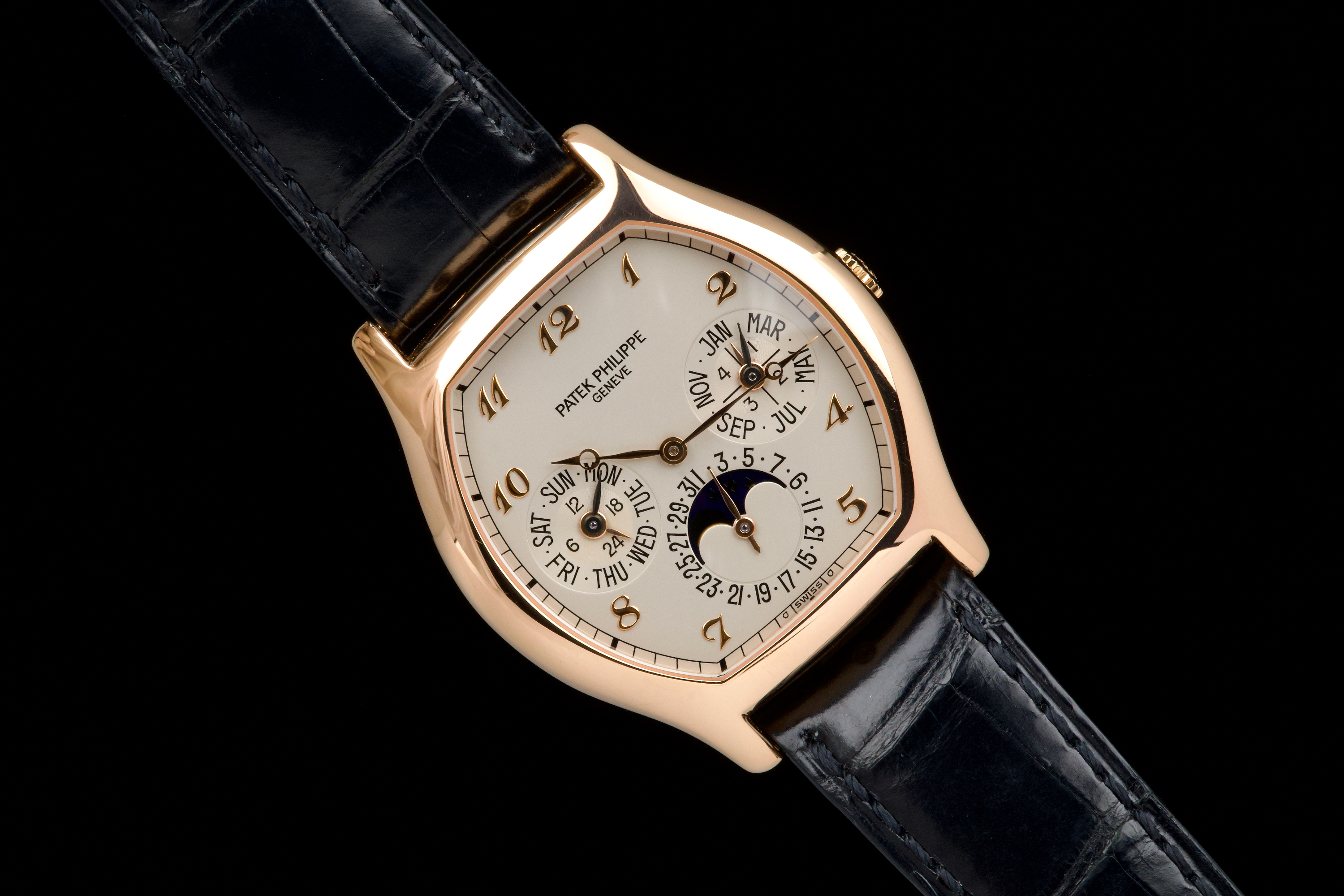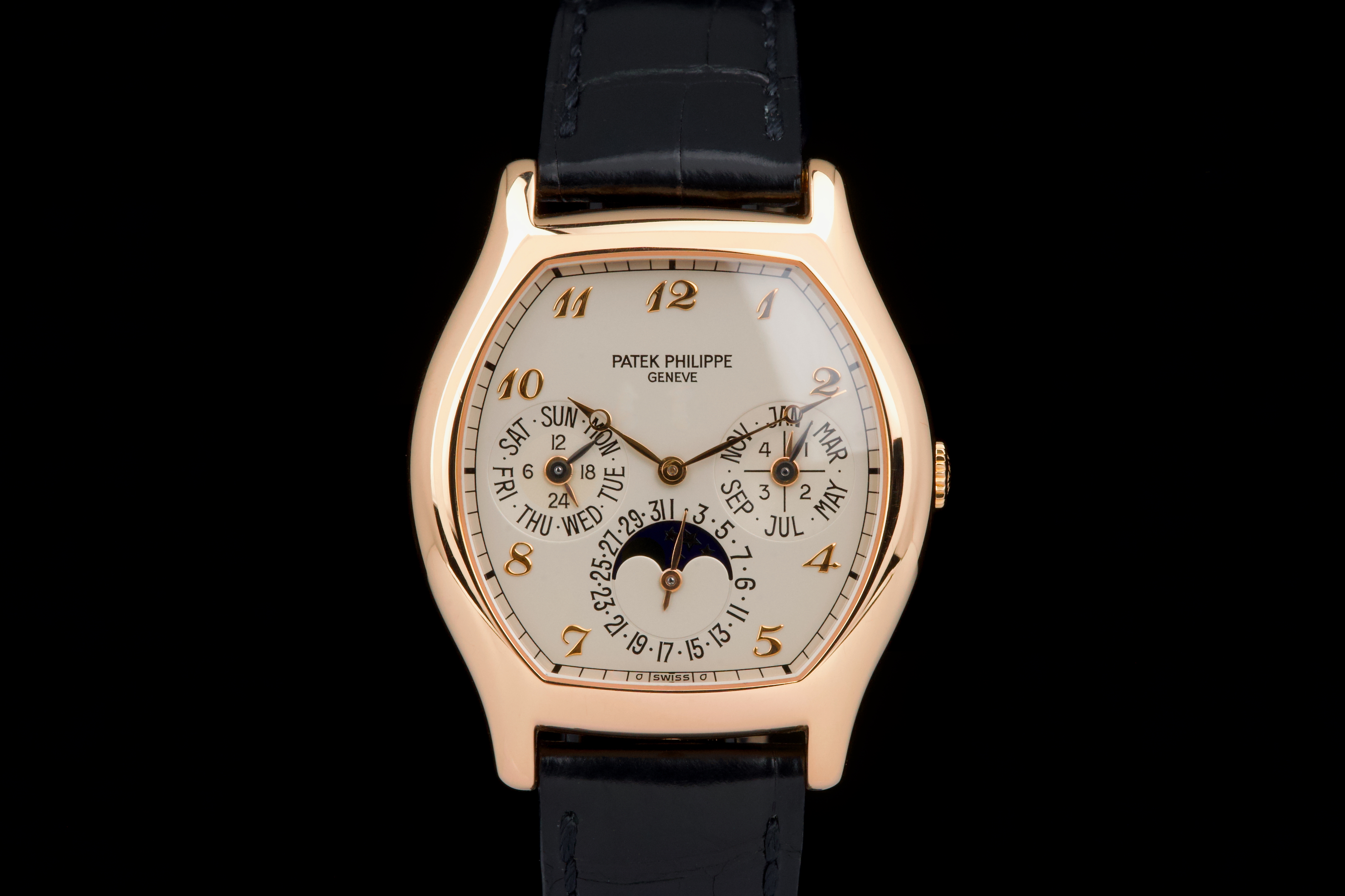 An exceptional and beautifully preserved example of the Patek Philippe Perpetual Calendar reference 5040R in 18k rose gold, sold new in Germany in 1995 and accompanied by an outstanding and historically rich full set. The watch appears to be completely unpolished, with the hallmarks on the left case flank remaining as crisp and deep as the day they left the atelier — a clear indication that no polishing has ever softened the edges or compromised the original geometry. The rose-gold tonneau case retains its perfect definition and elegant proportions. This 5040R comes with a complete full set, including the original box, rotating stand, second solid caseback, stylus, and all documents. Importantly, the watch is accompanied by two Patek Philippe Japan service papers, dated 2012 and 2019, confirming that the watch has been impeccably maintained over the years. Adding to its provenance, the set includes a signed congratulatory letter from Henri Stern, addressed to the original buyer — a rare and meaningful historical detail. The black Patek Philippe crocodile strap is in excellent condition, fitted with a Patek Philippe rose-gold buckle. The iconic silver dial with applied Breguet numerals is flawless, and the hands match perfectly, completing the elegant aesthetic of this perpetual calendar. Considering its rarity, condition, and completeness, the 5040R represents remarkable value in the world of Patek Philippe perpetual calendars — especially when compared to the more traditional 3940R, which today commands roughly double the price. A truly exceptional and collector-grade example of the 5040R — unpolished, fully documented, perfectly maintained, and accompanied by an extraordinary provenance.